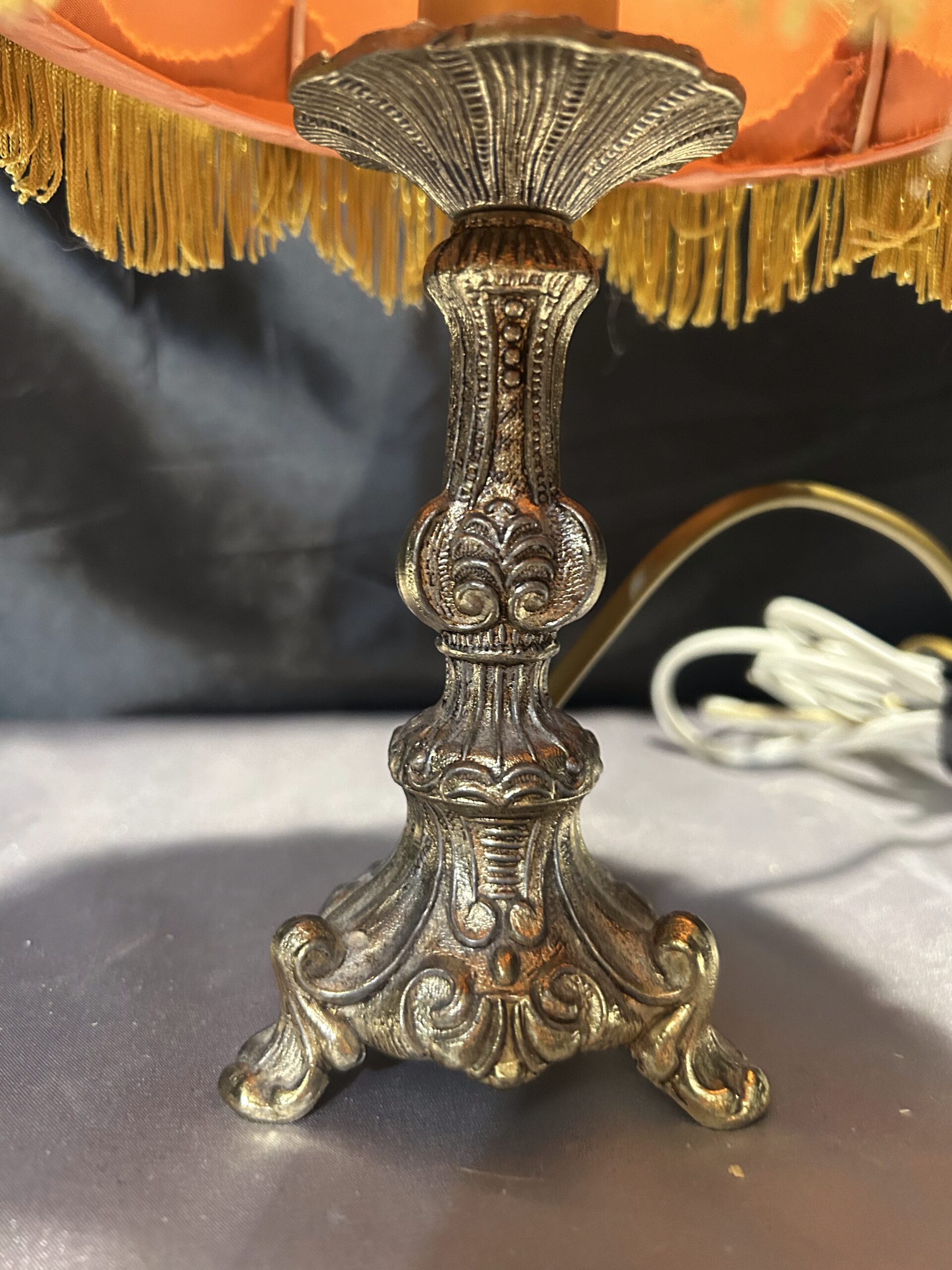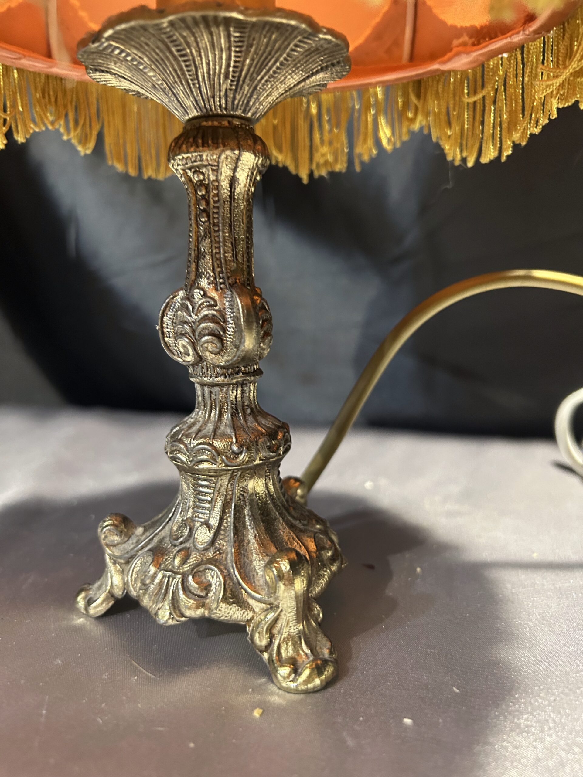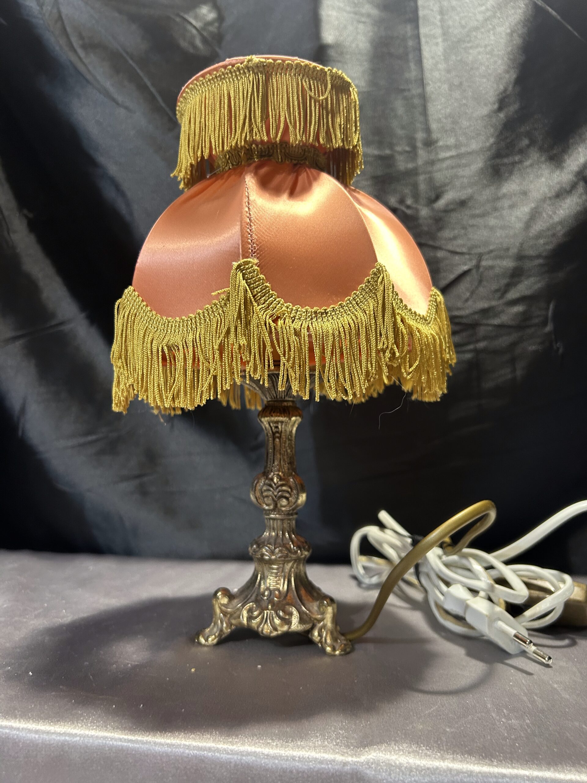 Elegancka lampa stojąca wykonana z mosiądzu, z subtelnymi zdobieniami i abażurem w łososiowym kolorze, ozdobionym złotymi frędzlami. Wyposażona w włącznik na kablu, jest zarówno praktyczna, jak i dekoracyjna. Doskonała na szafkę, komodę czy parapet, dodając wnętrzu ciepła i klasycznego stylu.