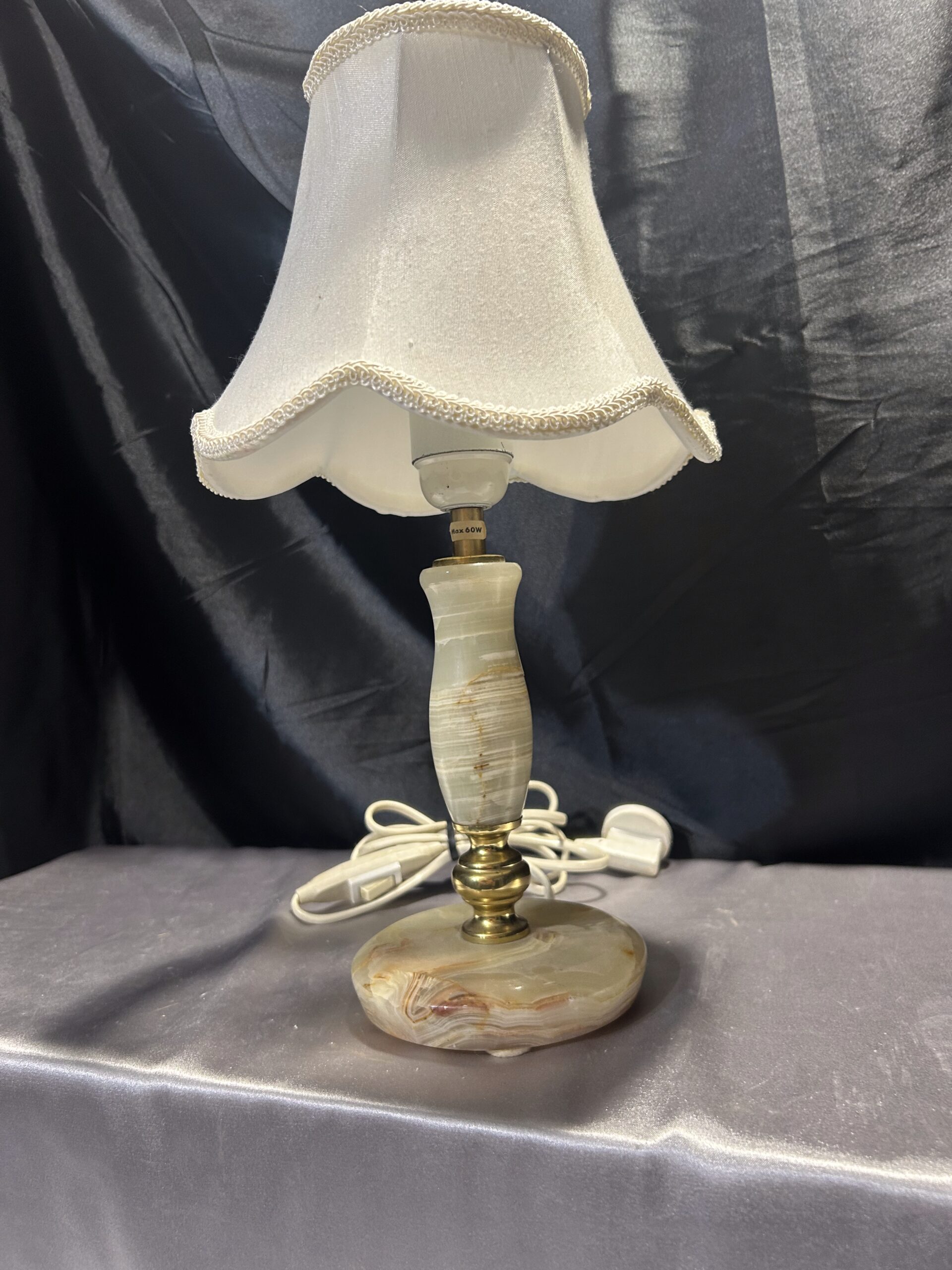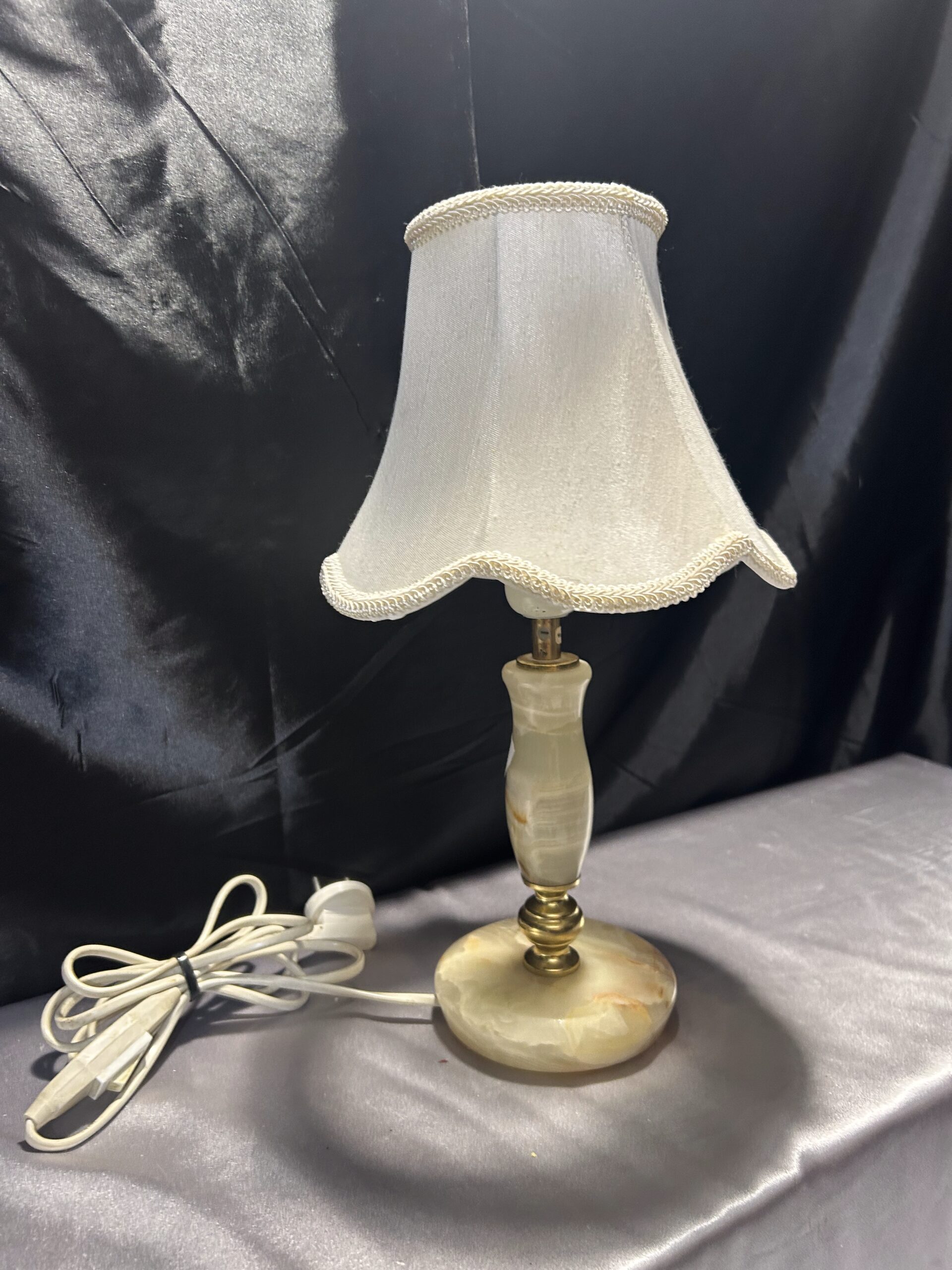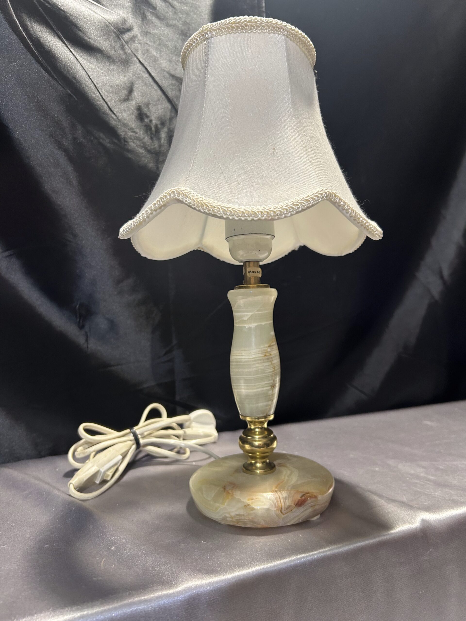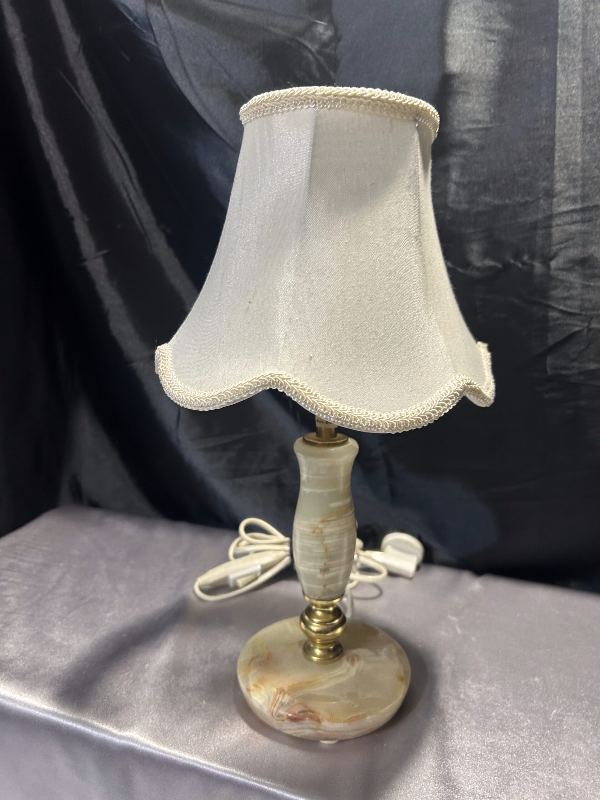 Stylowa lampa stojąca wykonana z połączenia onyksu i mosiądzu, uzupełniona klasycznym abażurem. Dzięki swoim proporcjom i wyrafinowanemu designowi, doskonale nadaje się na komodę, szafkę nocną lub parapet. Włącznik na kablu zapewnia wygodę użytkowania.