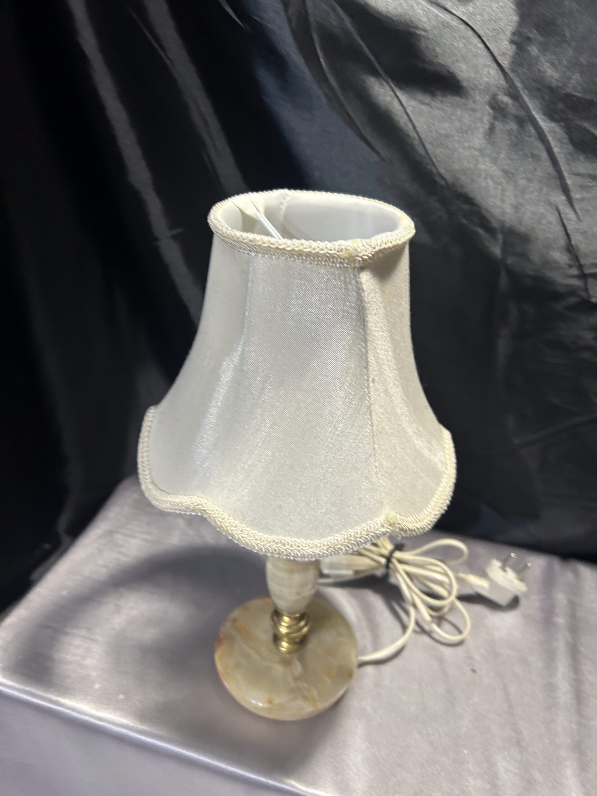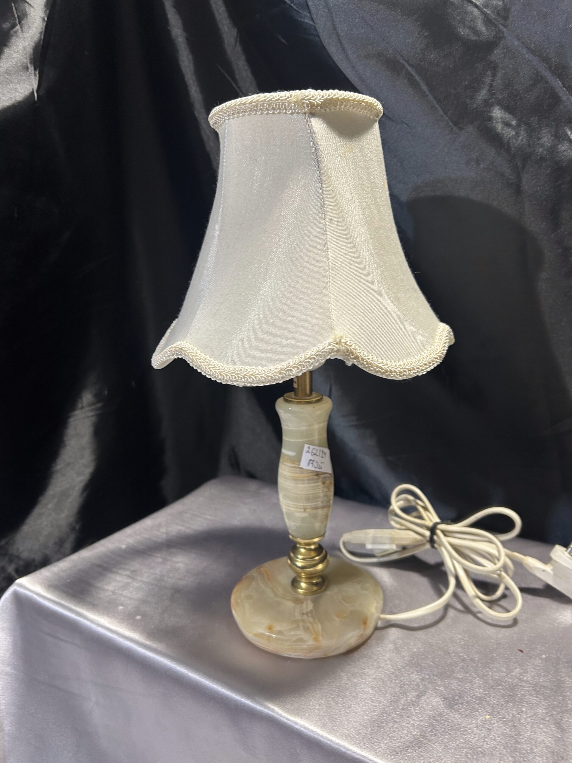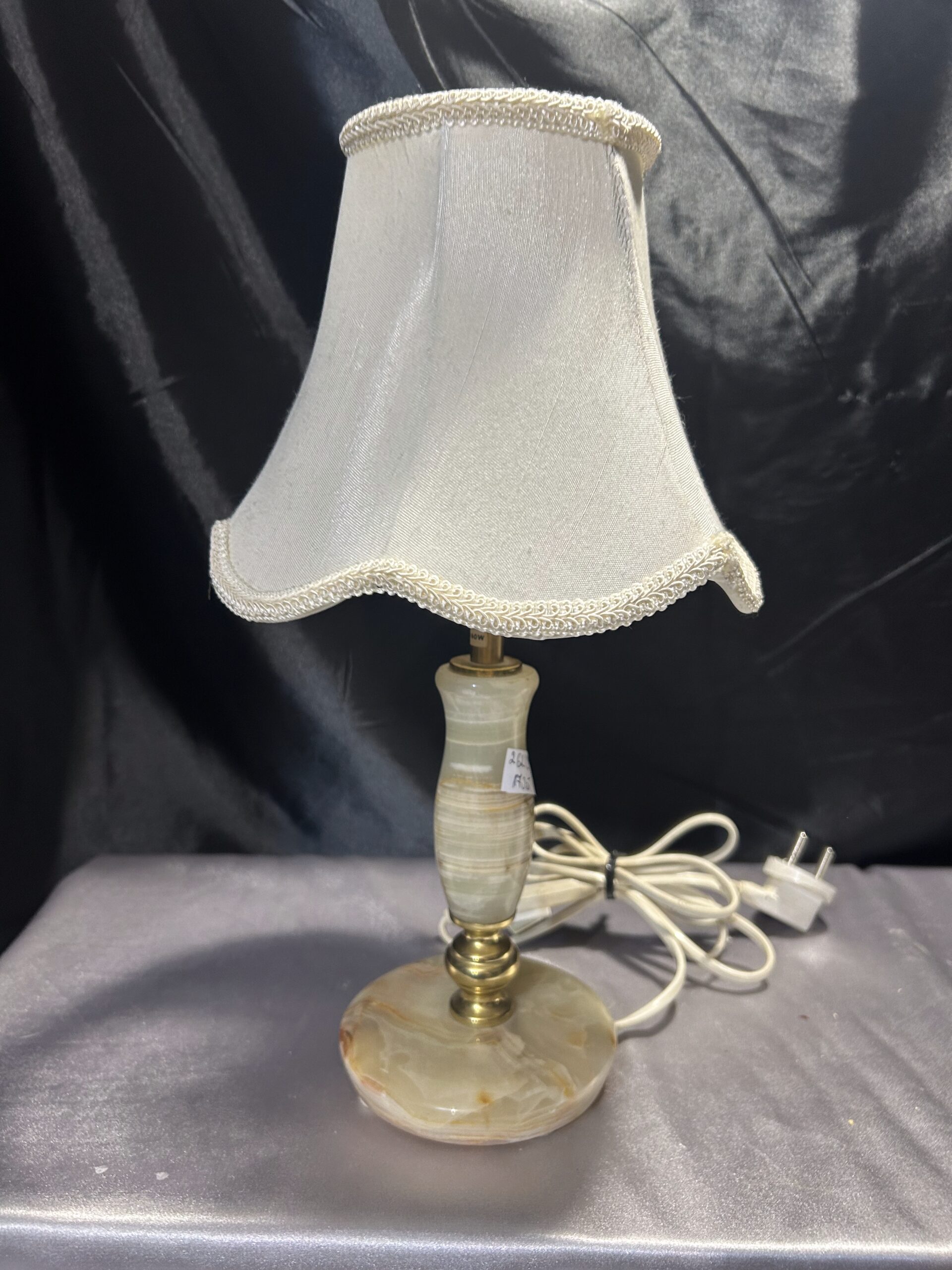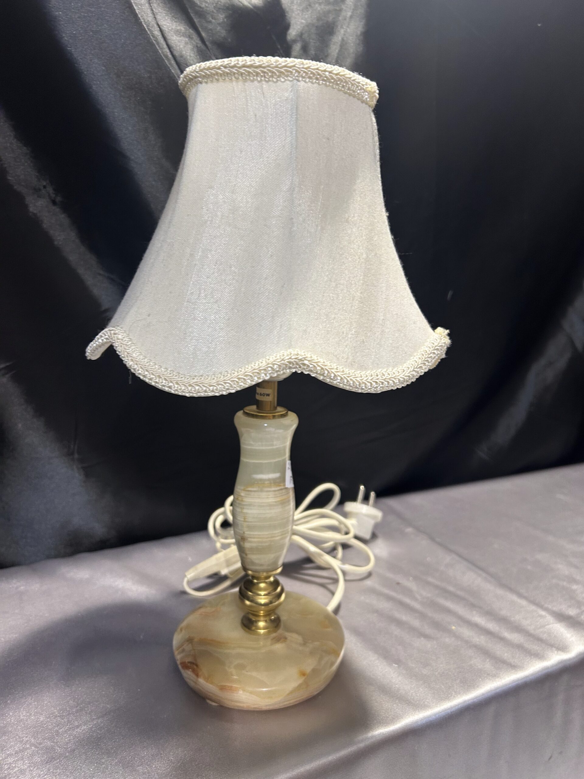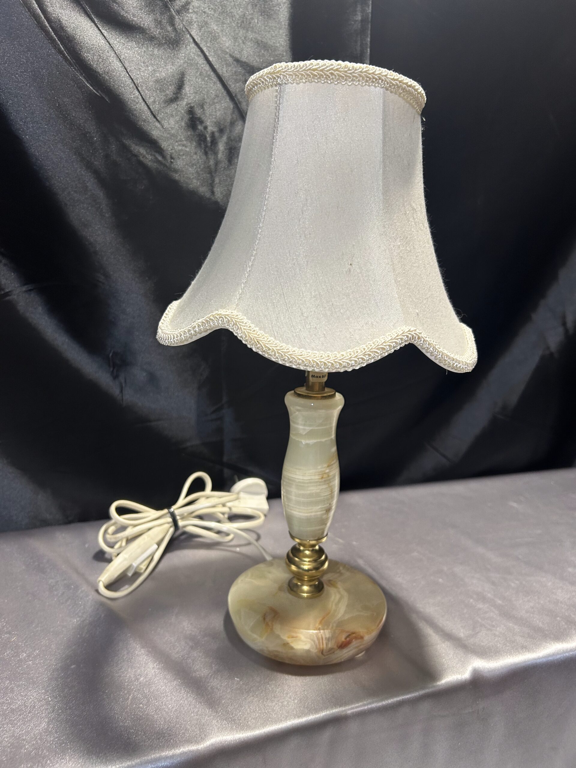 Stylowa lampa stojąca wykonana z połączenia onyksu i mosiądzu, uzupełniona klasycznym abażurem. Dzięki swoim proporcjom i wyrafinowanemu designowi, doskonale nadaje się na komodę, szafkę nocną lub parapet. Włącznik na kablu zapewnia wygodę użytkowania.