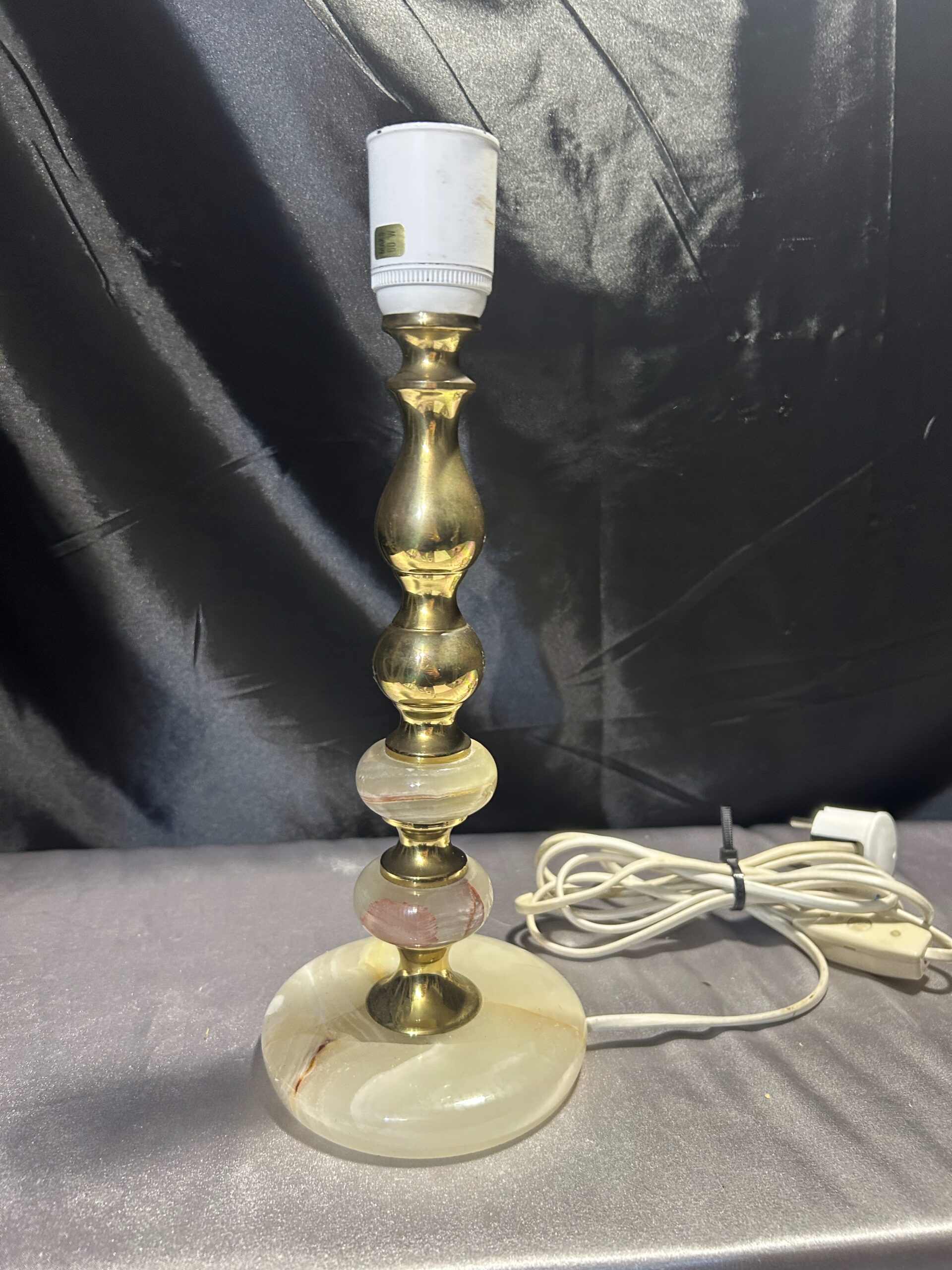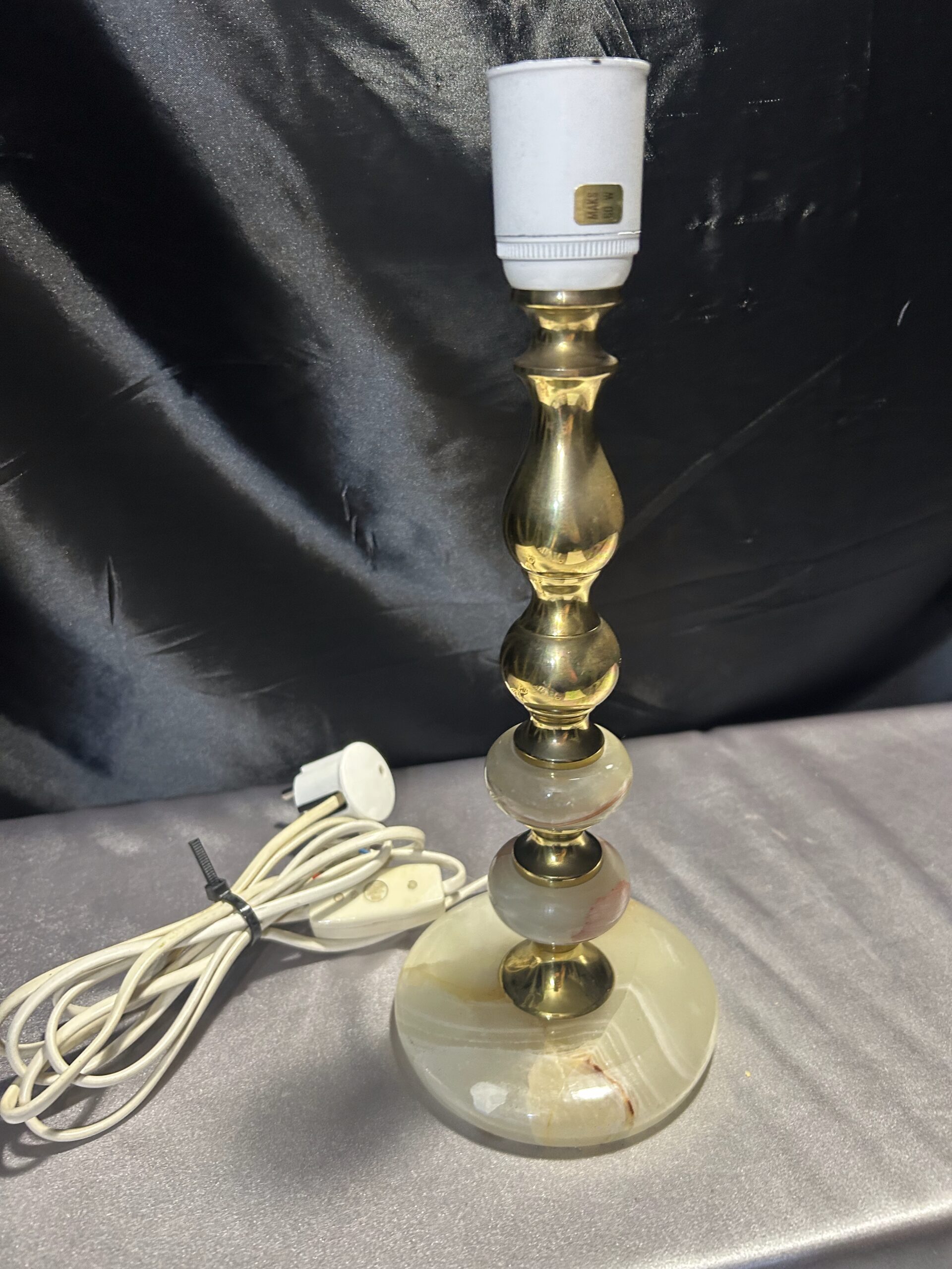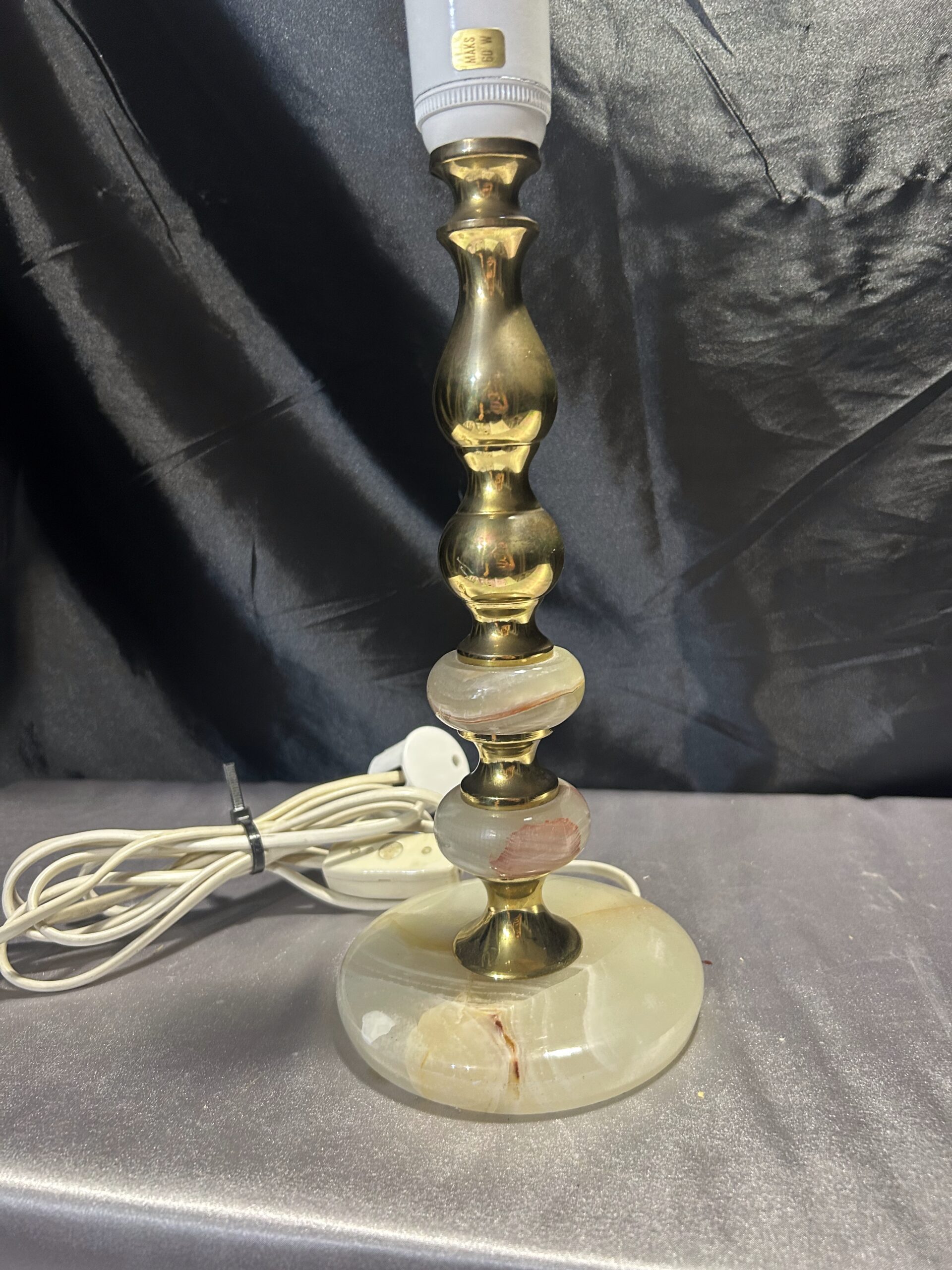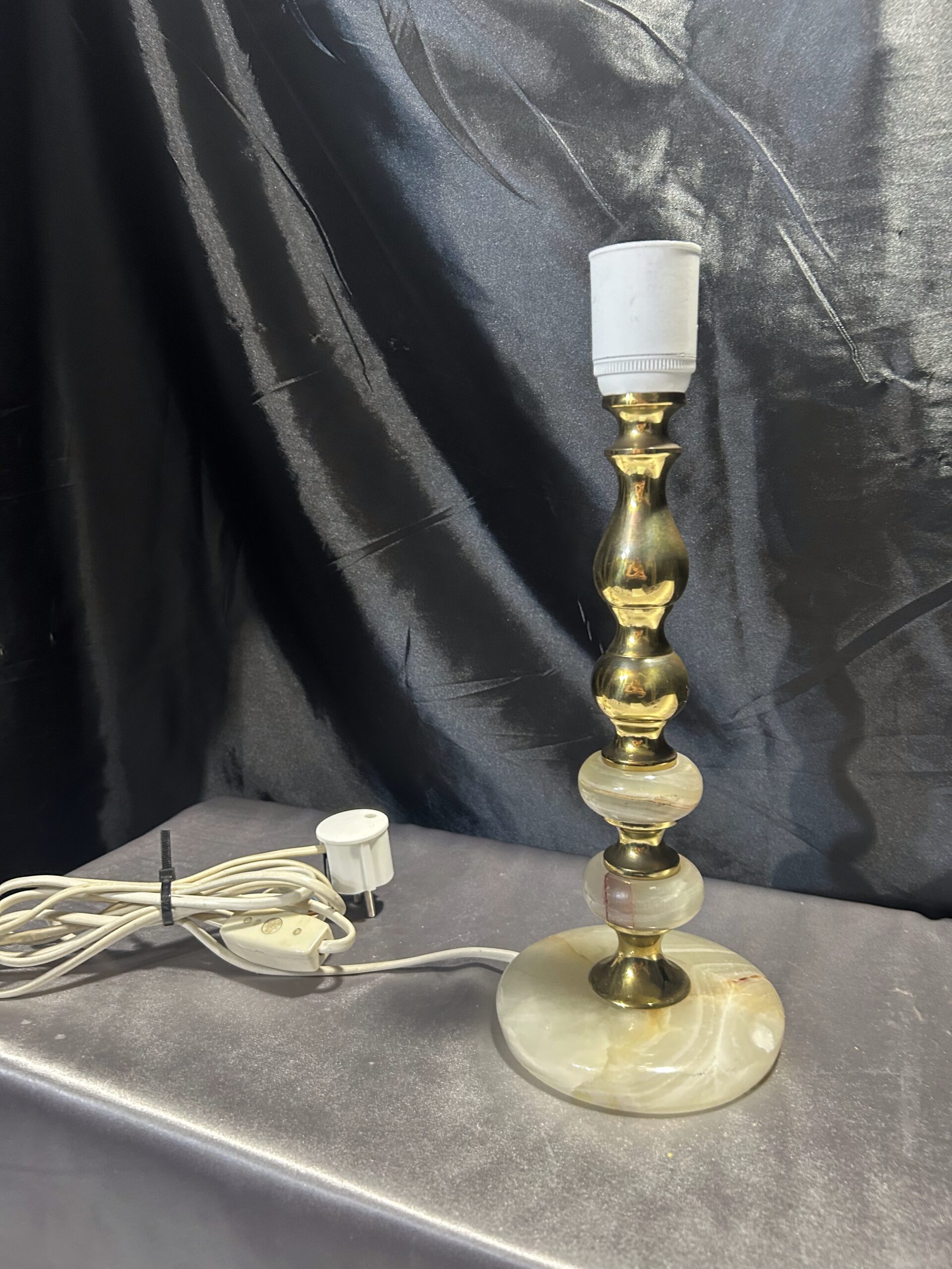 Piękna lampa stojąca wykonana z onyksu i mosiądzu, z eleganckim toczonym wzorem i subtelnymi zdobieniami. Wyposażona w włącznik na kablu, jest praktycznym i stylowym dodatkiem na komodę, szafkę czy parapet.