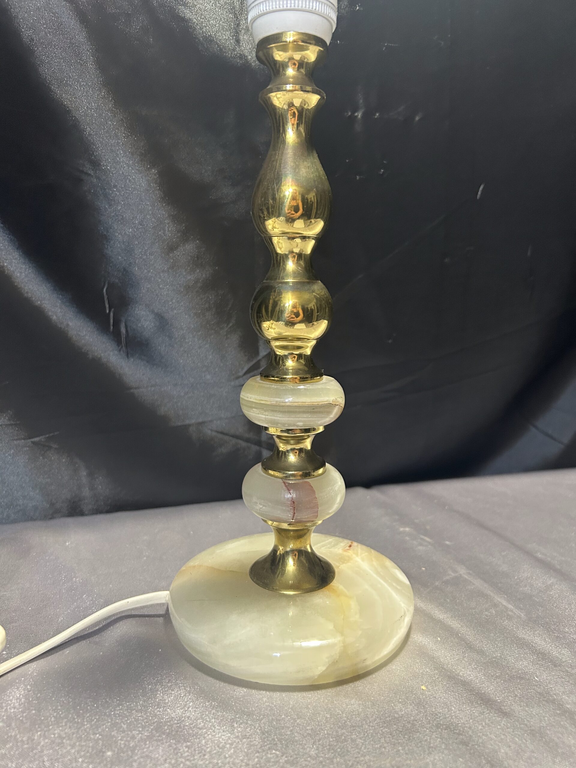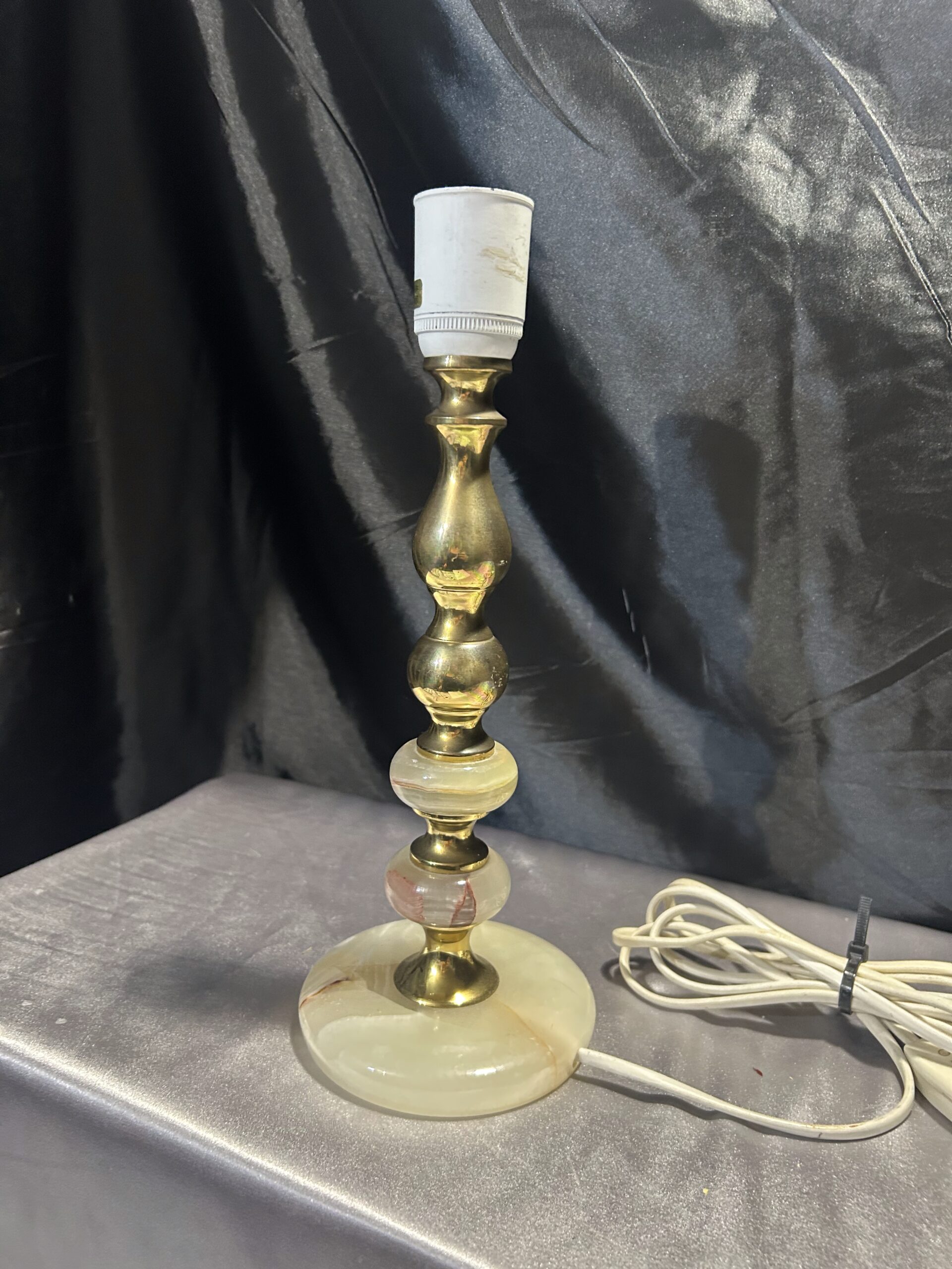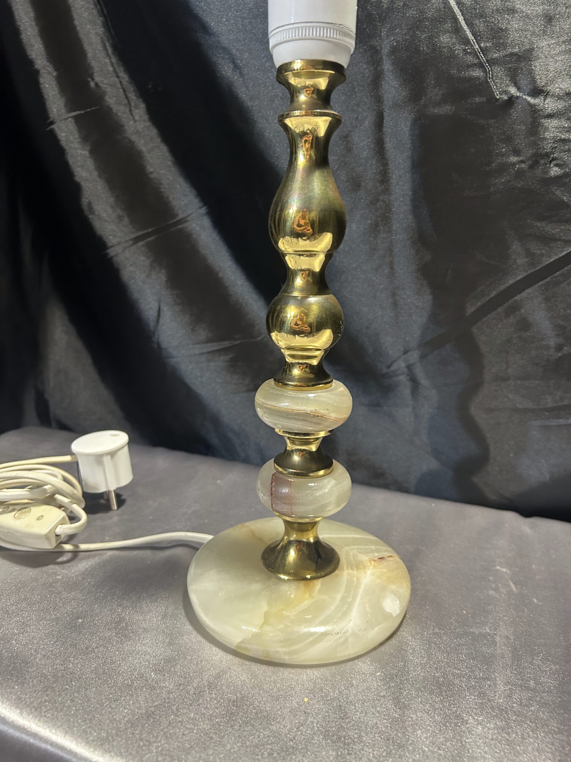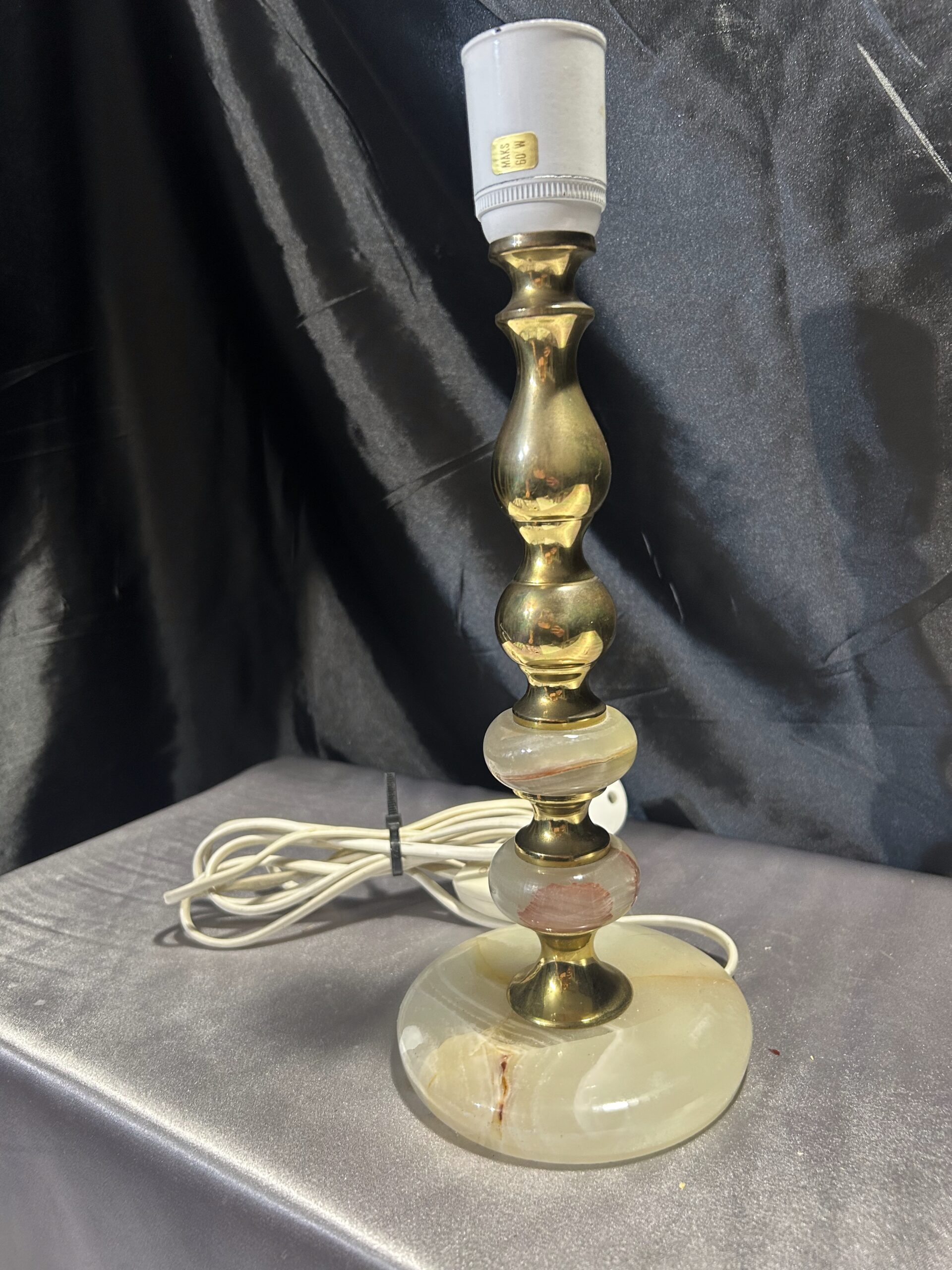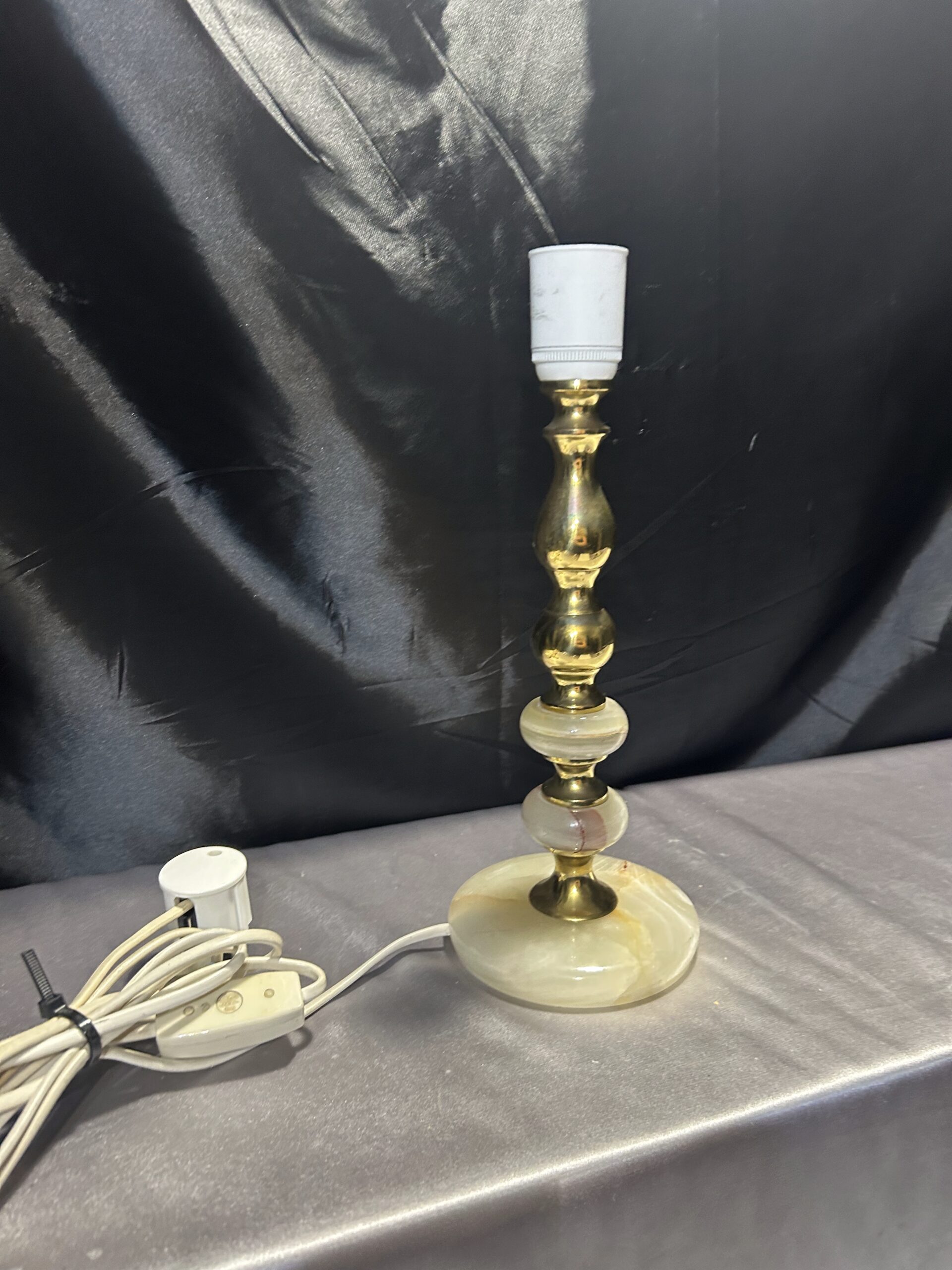 Piękna lampa stojąca wykonana z onyksu i mosiądzu, z eleganckim toczonym wzorem i subtelnymi zdobieniami. Wyposażona w włącznik na kablu, jest praktycznym i stylowym dodatkiem na komodę, szafkę czy parapet.