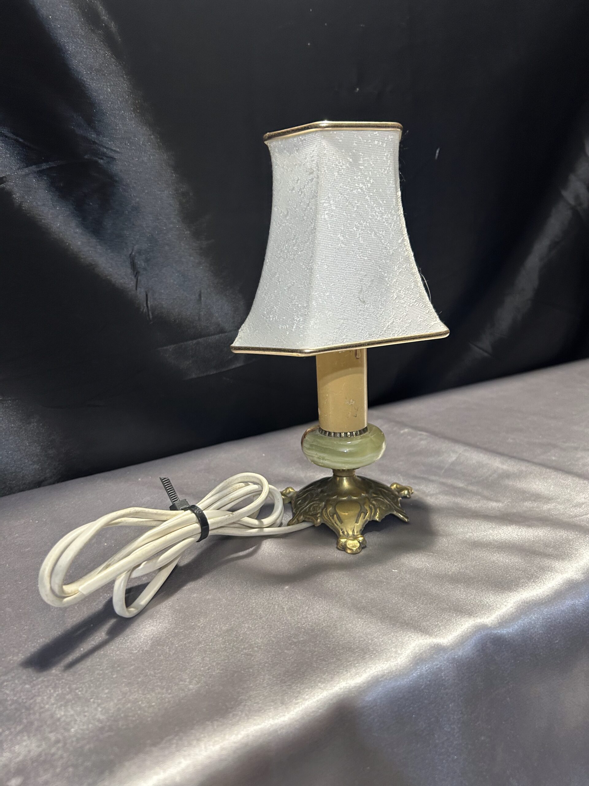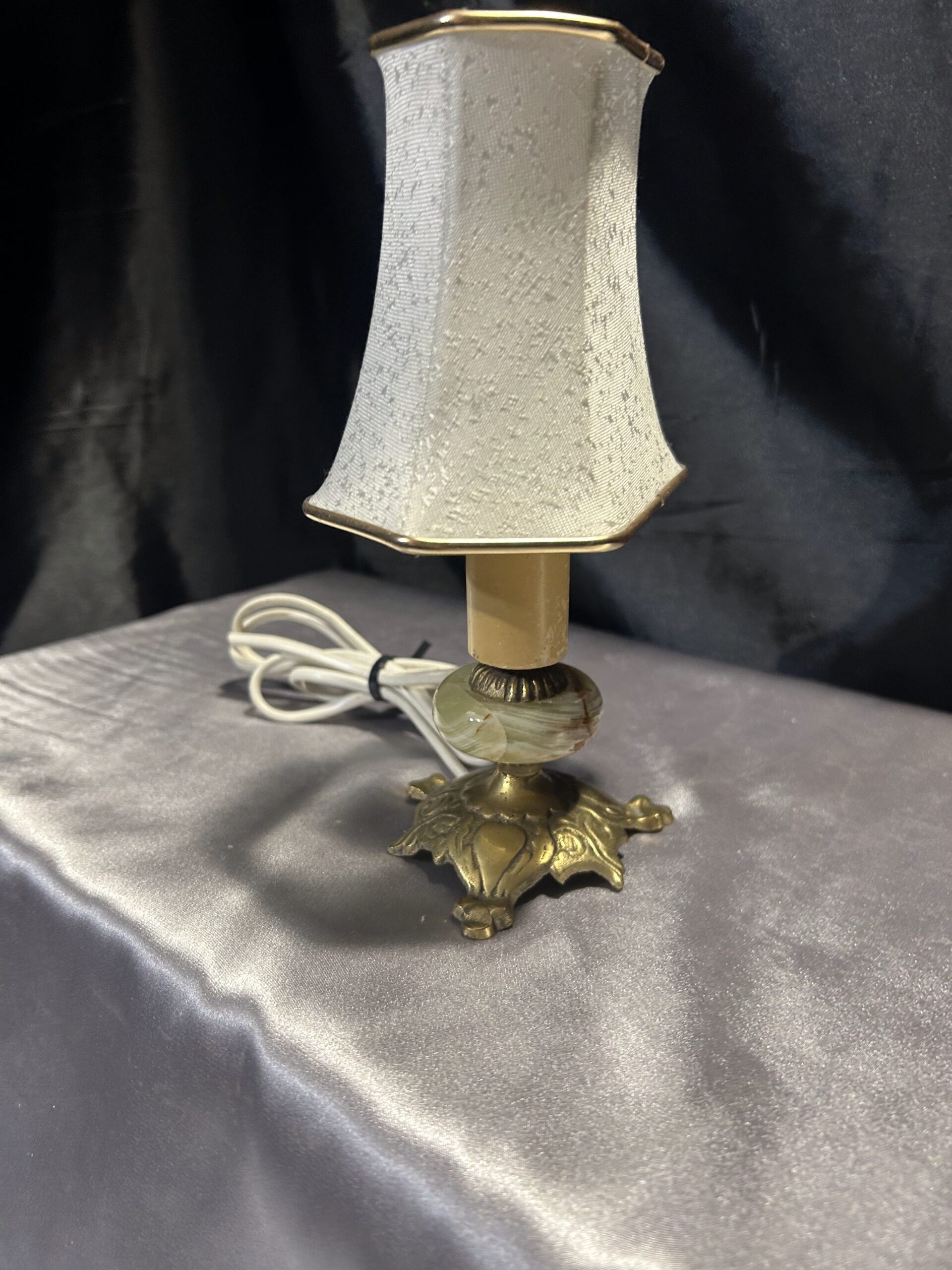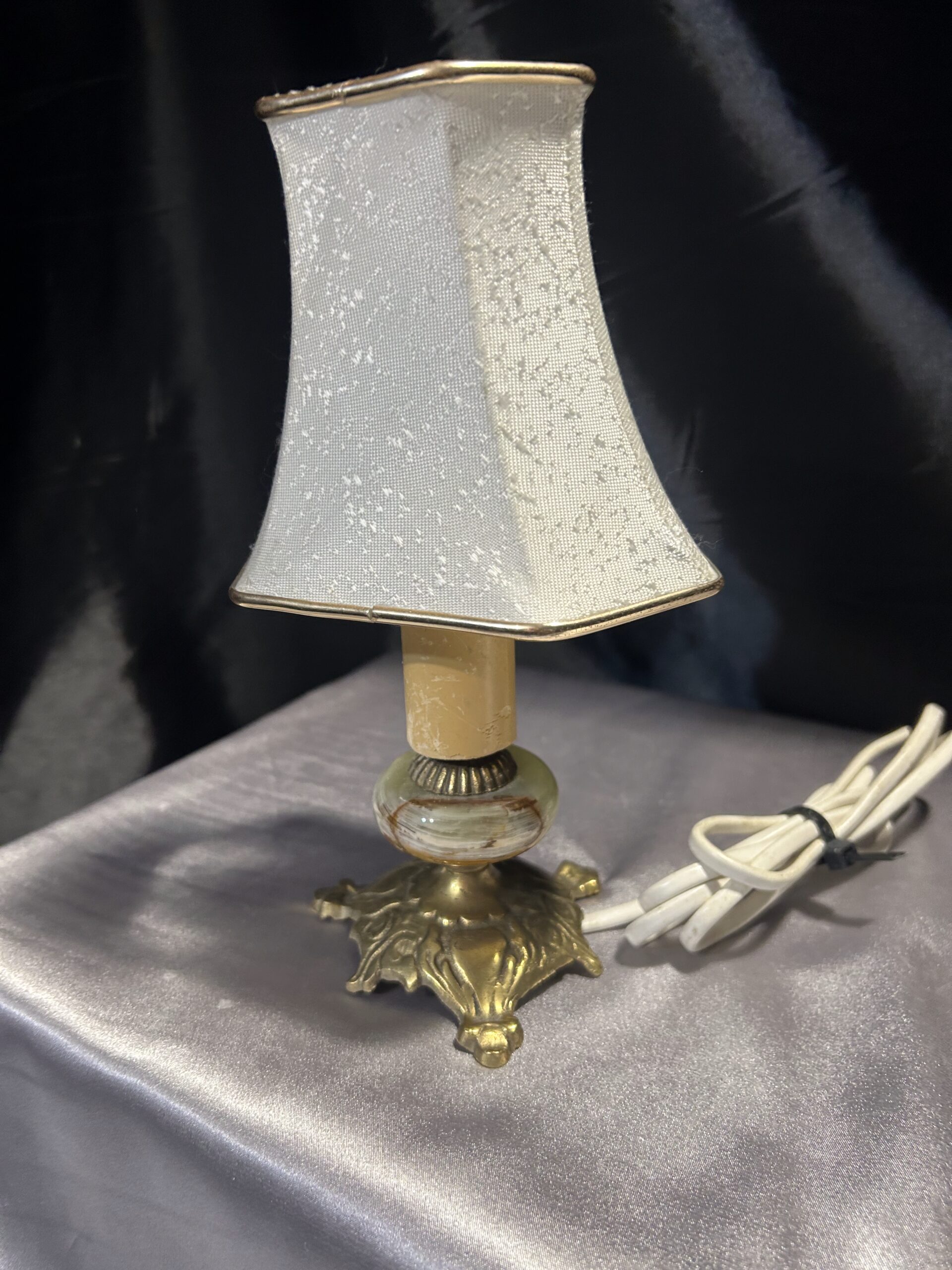 Subtelna lampa stojąca wykonana z onyksu i mosiądzu, ozdobiona eleganckim abażurem w kremowym kolorze, z delikatną złotą obramówką idealnie współgrającą z mosiężnymi elementami. Lampa bez wtyczki, gotowa do adaptacji według potrzeb. Idealna na komodę, szafkę czy parapet.