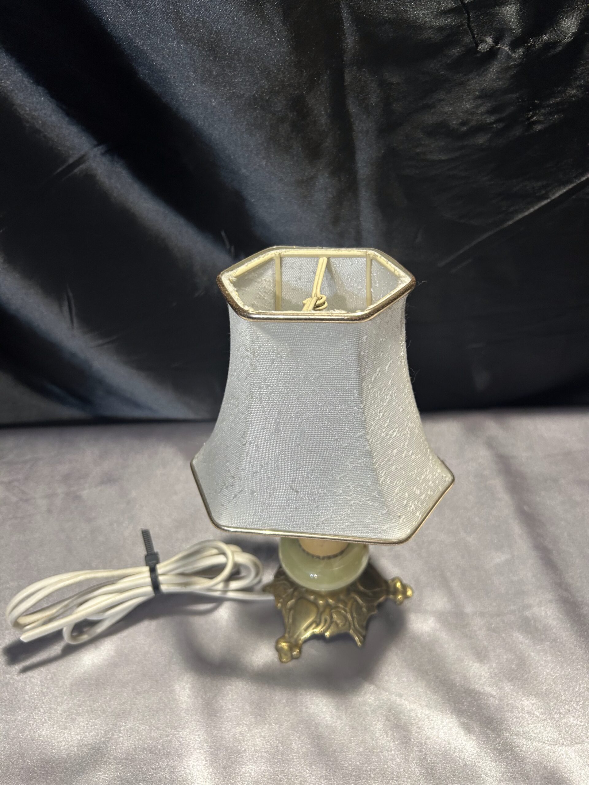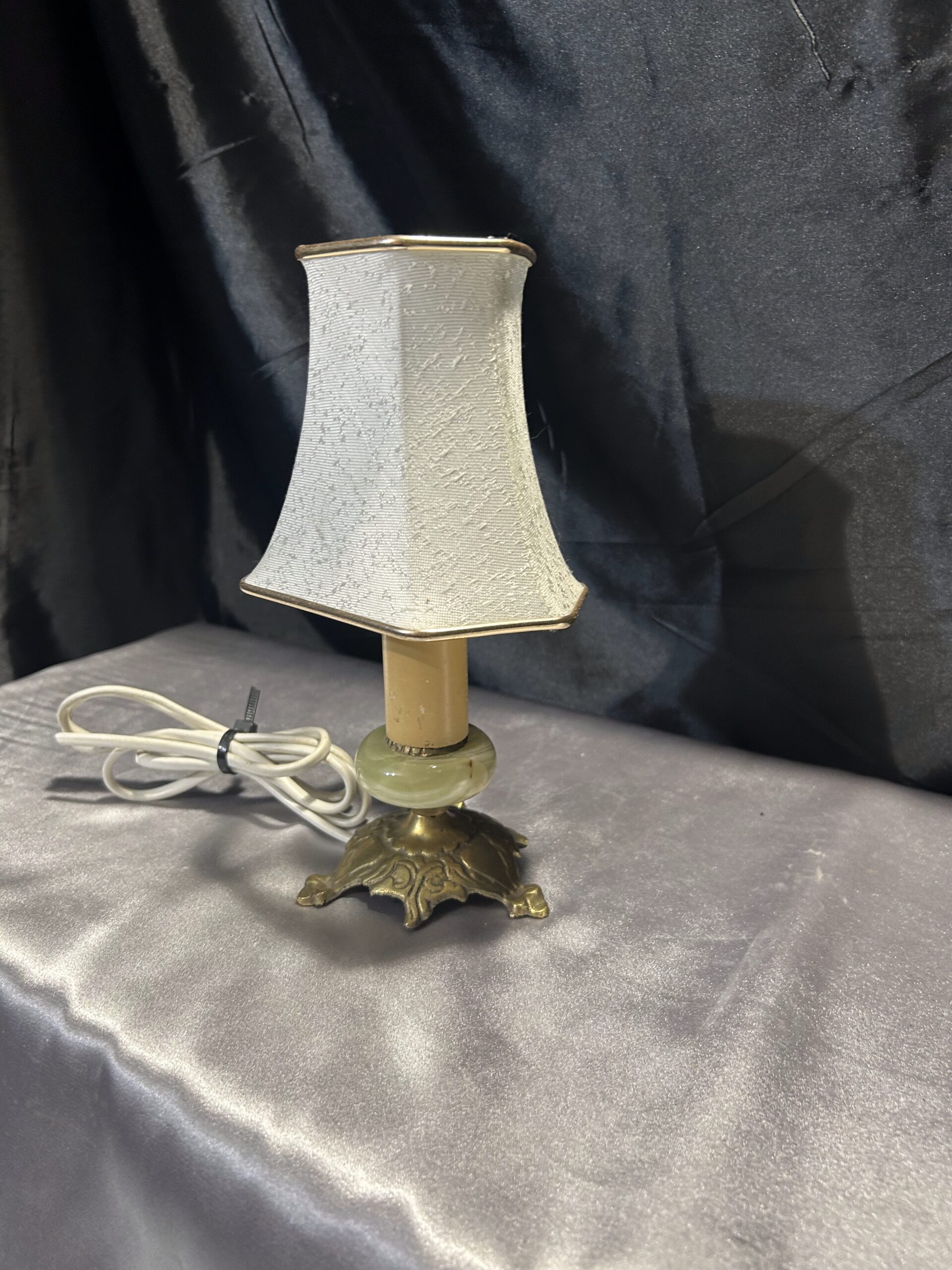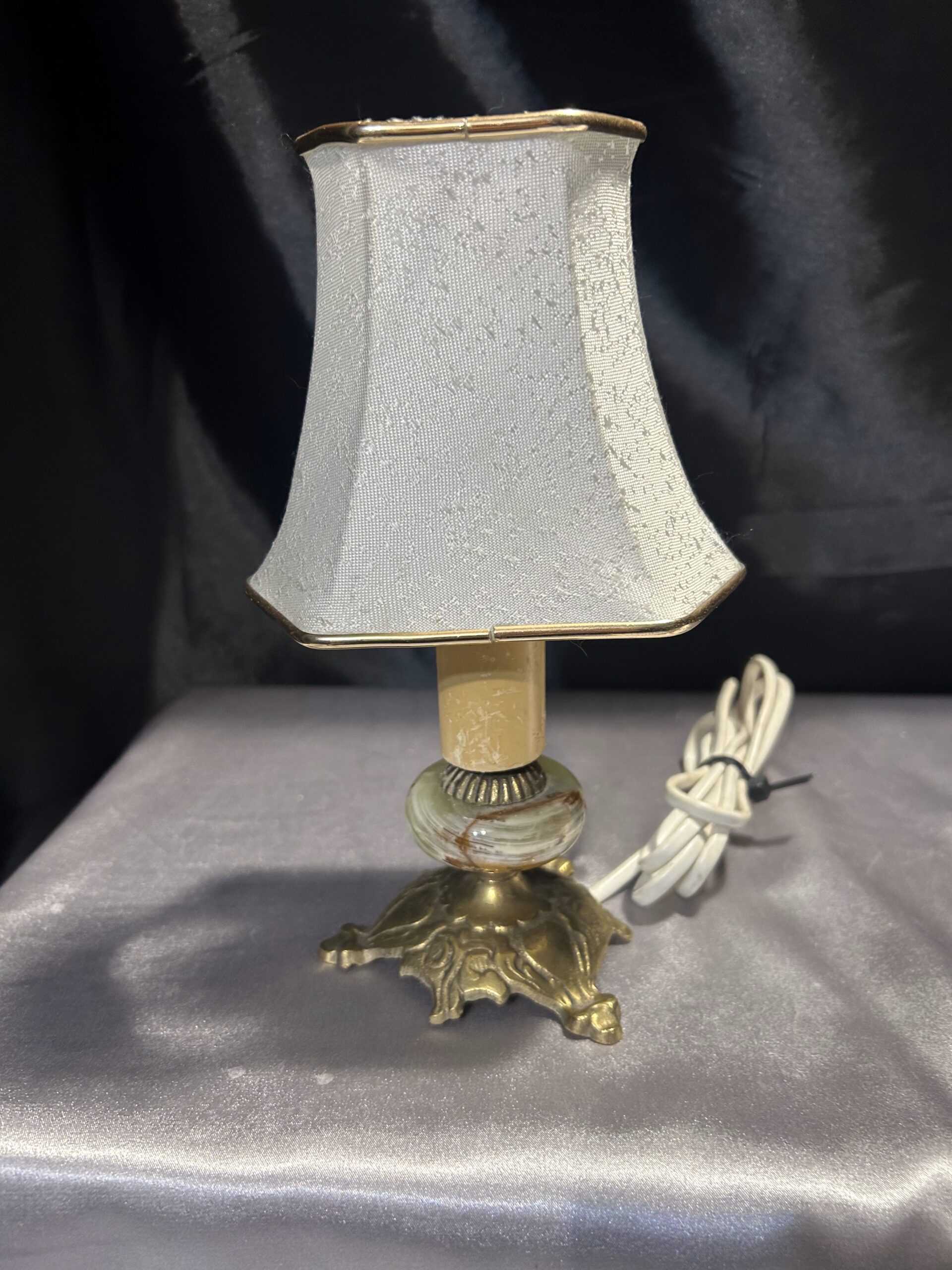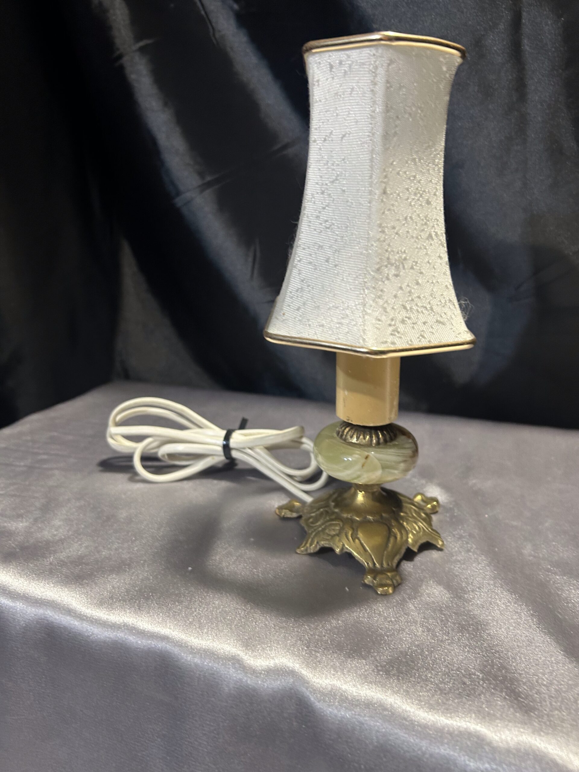 Subtelna lampa stojąca wykonana z onyksu i mosiądzu, ozdobiona eleganckim abażurem w kremowym kolorze, z delikatną złotą obramówką idealnie współgrającą z mosiężnymi elementami. Lampa bez wtyczki, gotowa do adaptacji według potrzeb. Idealna na komodę, szafkę czy parapet.
