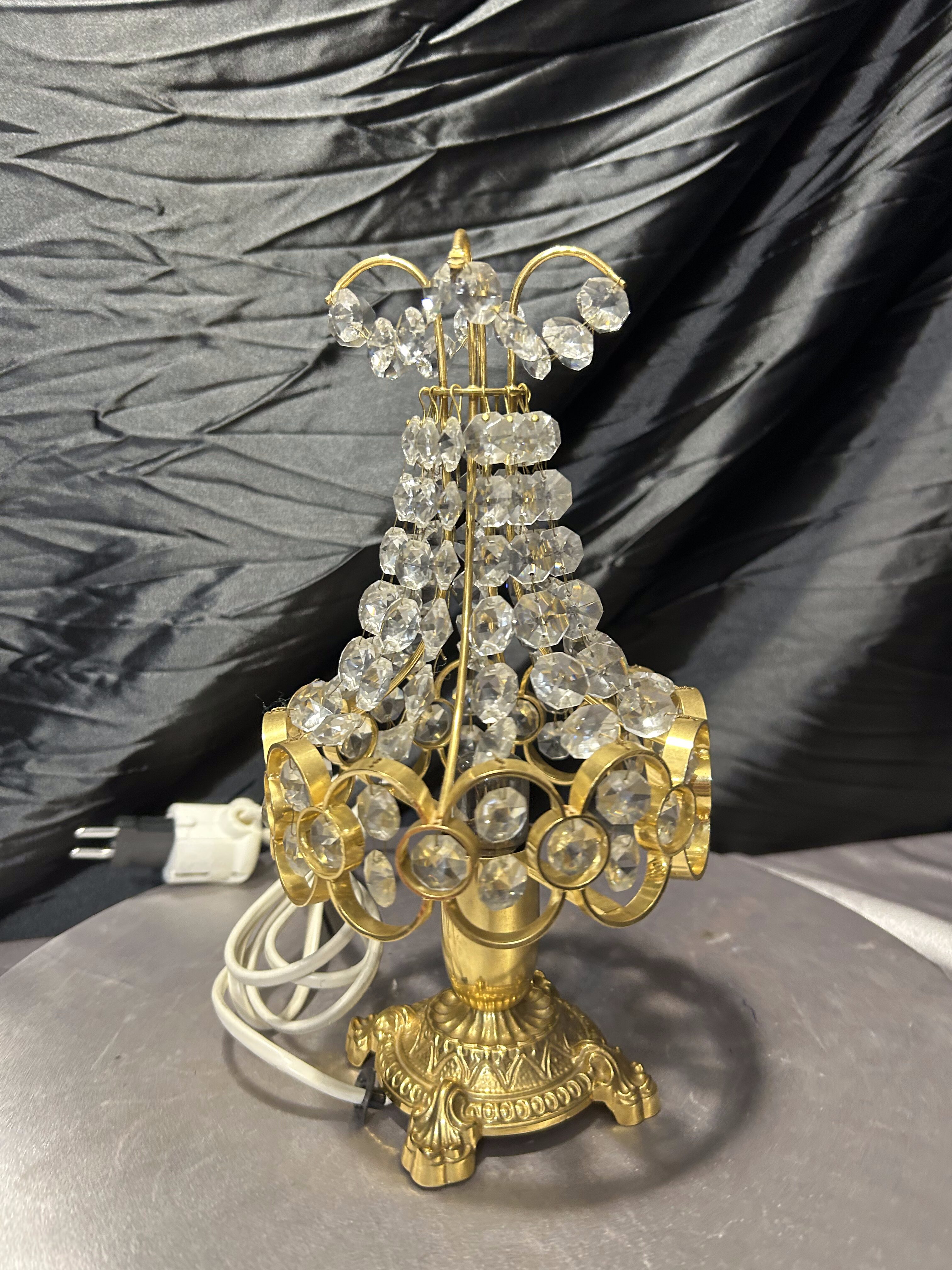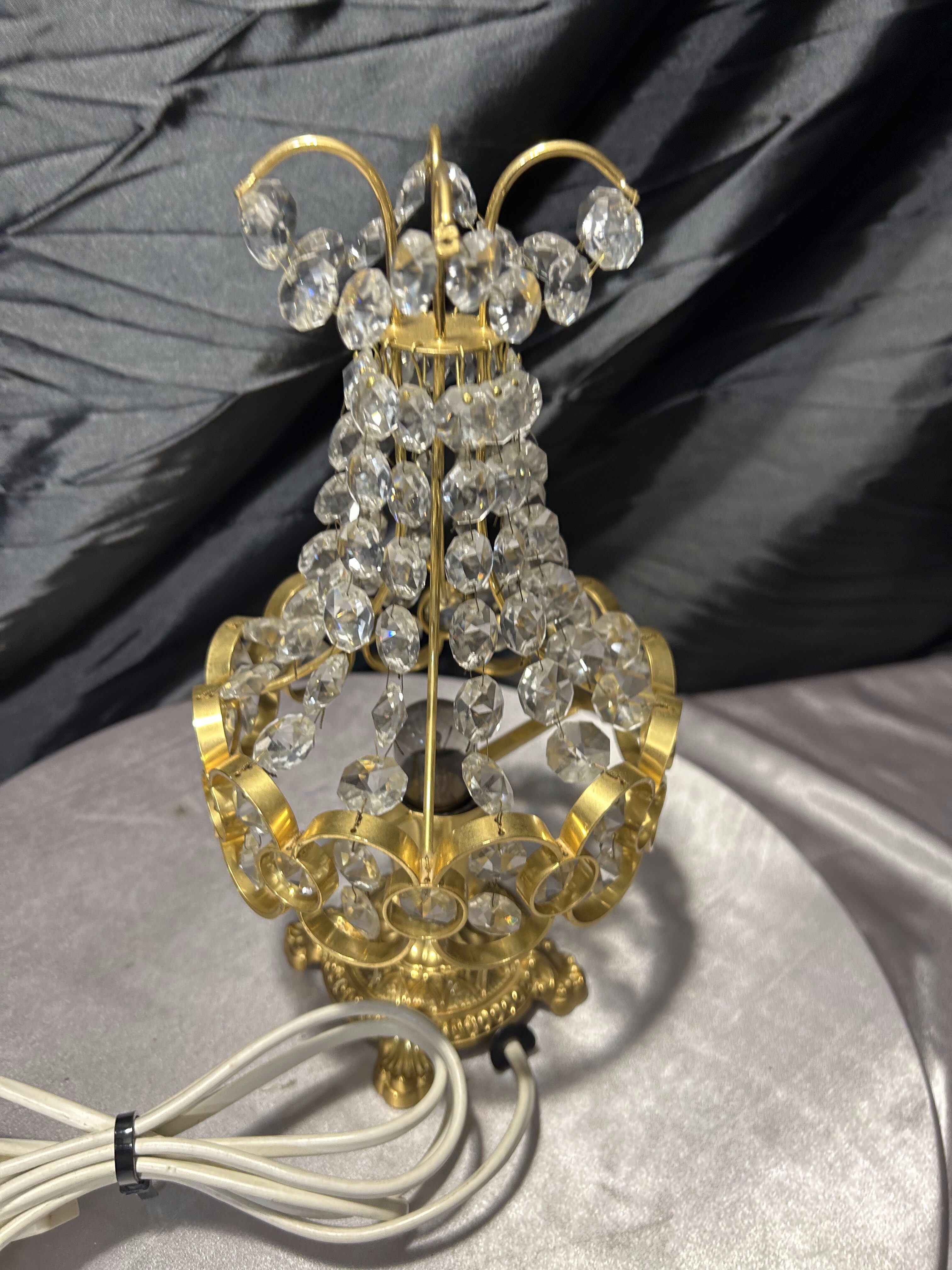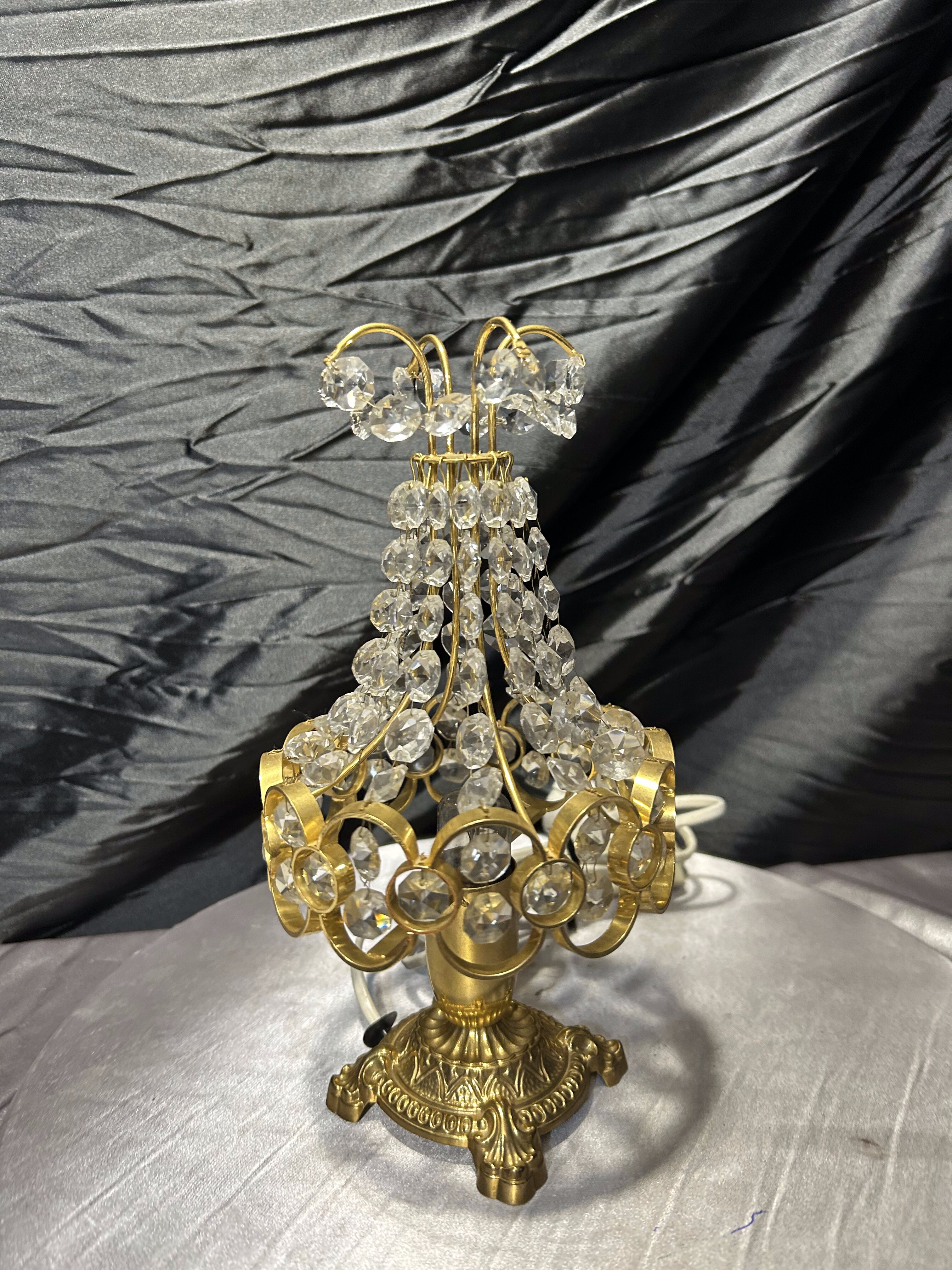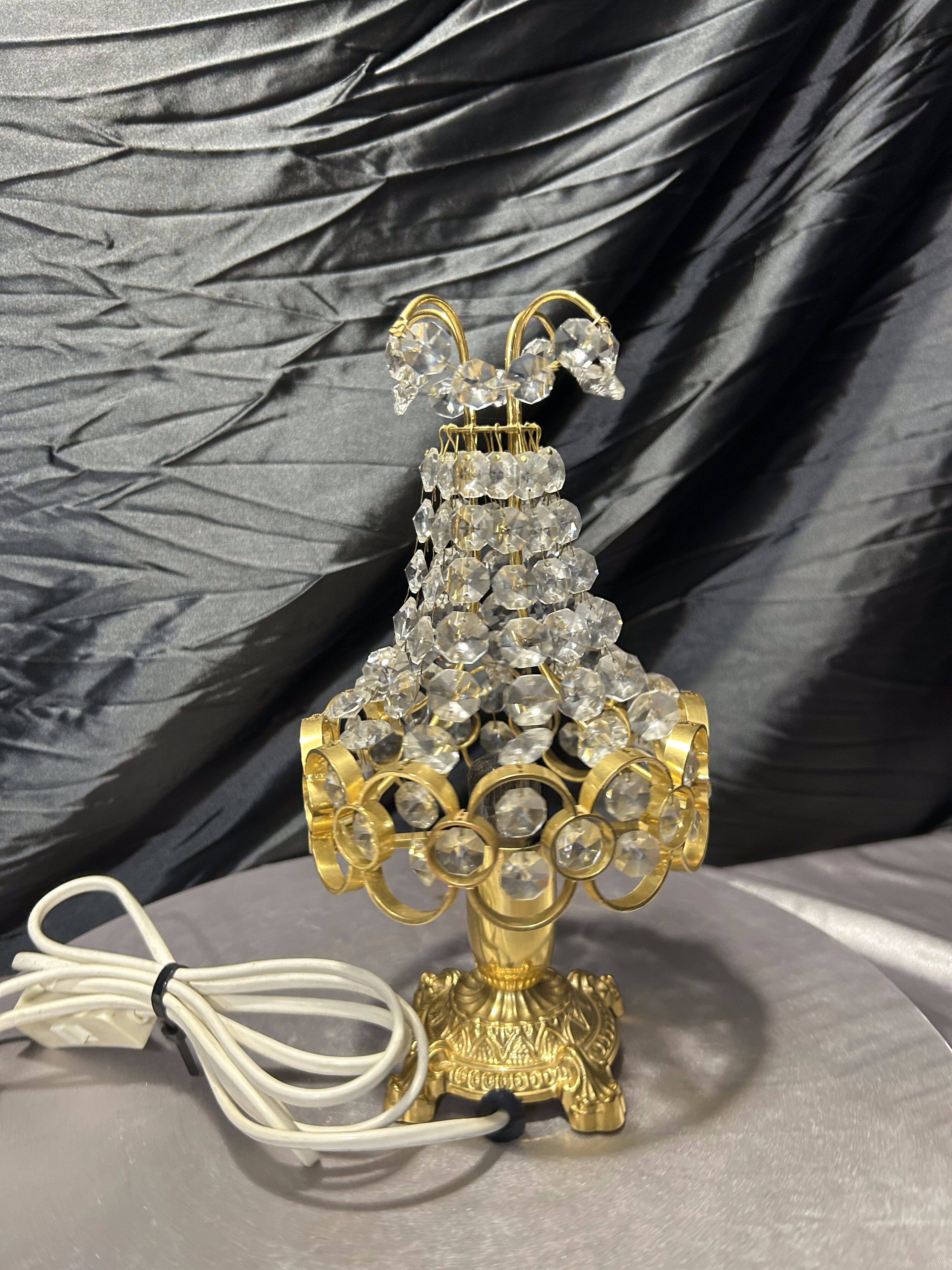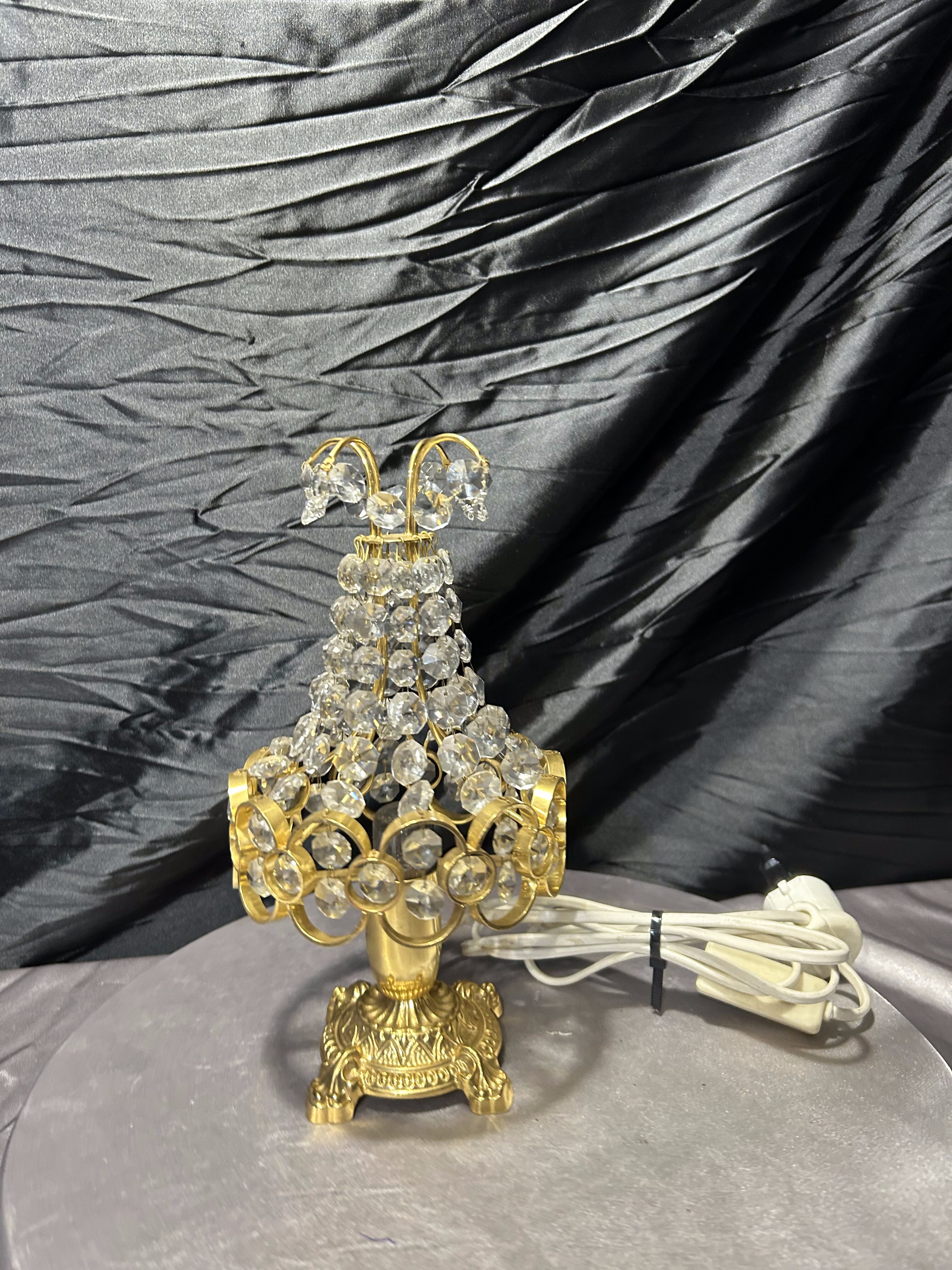 Dekoracyjna lampa stołowa w stylu glamour, wykonana z mosiądzu i zdobiona szlifowanymi kryształkami. Forma nawiązuje do klasycznych miniaturowych żyrandoli, co nadaje jej wyjątkowo elegancki i reprezentacyjny charakter.