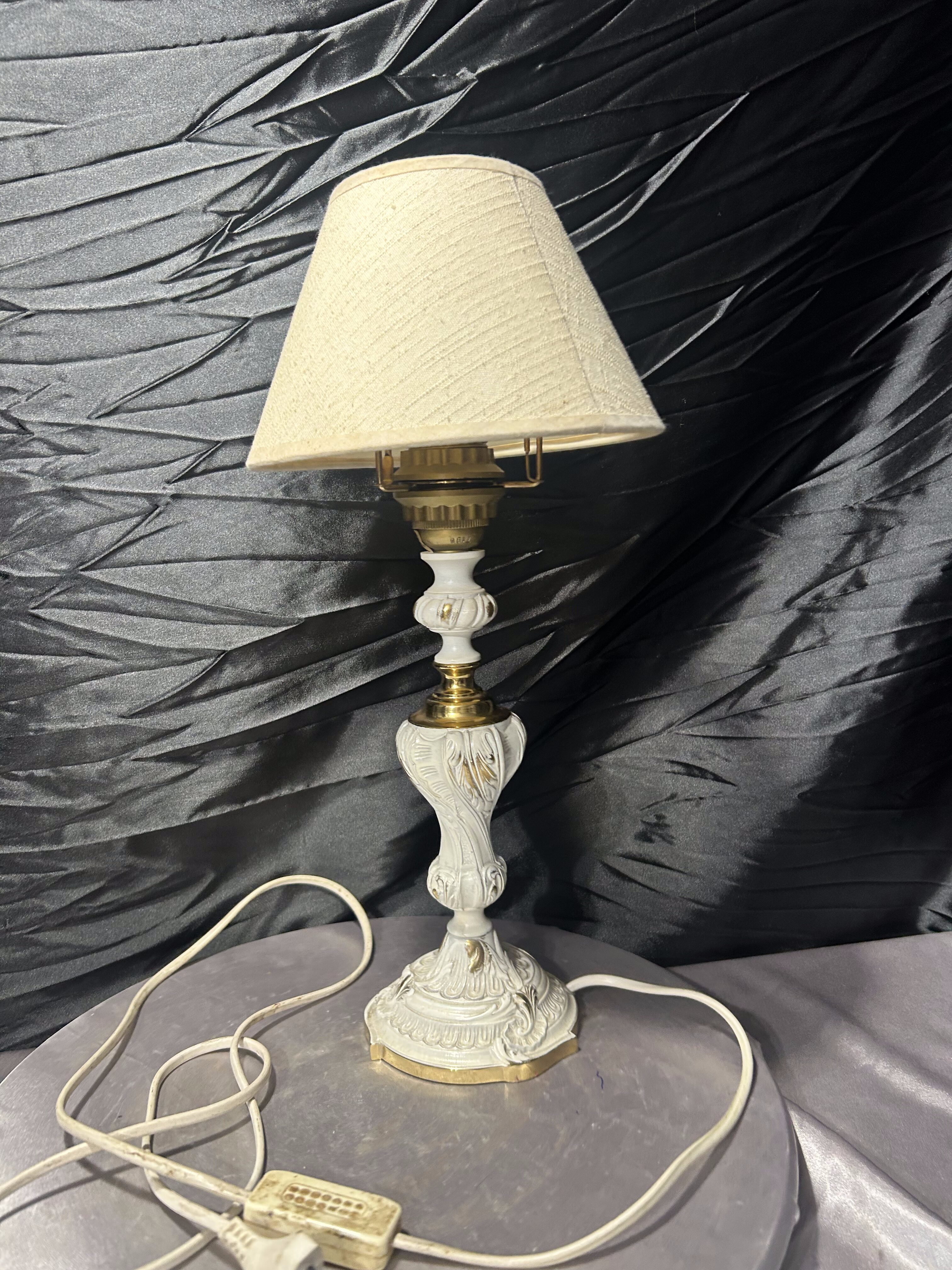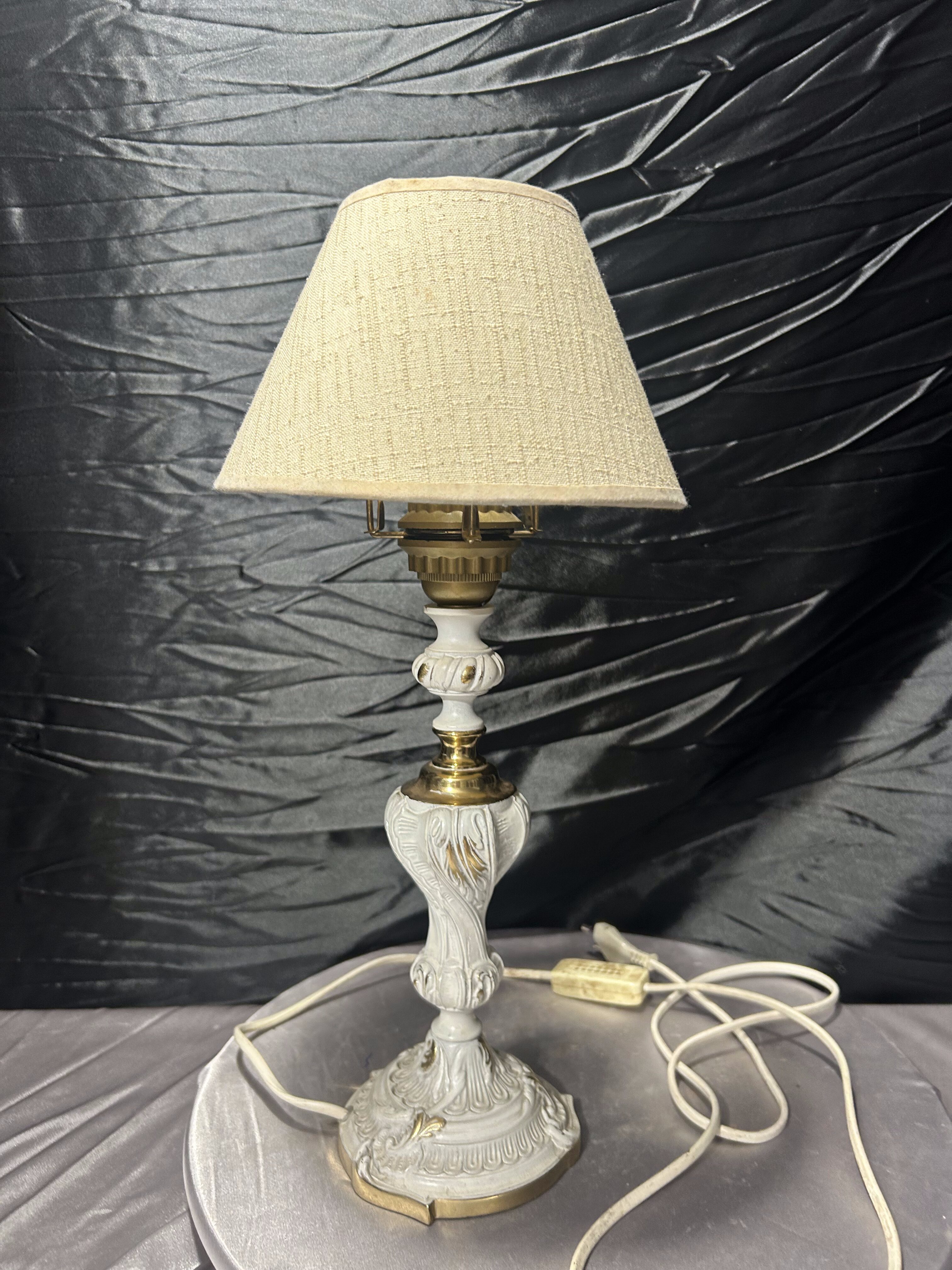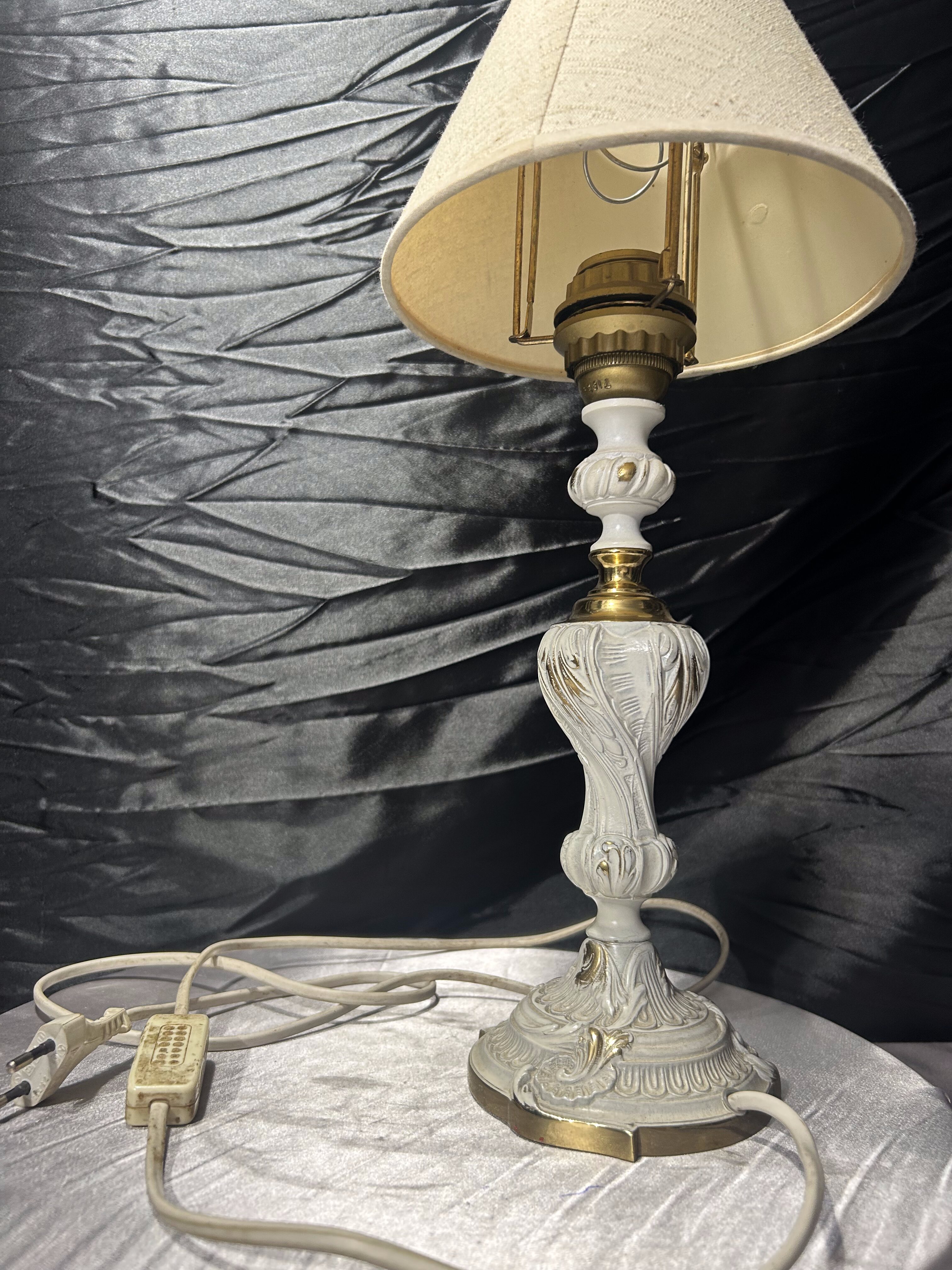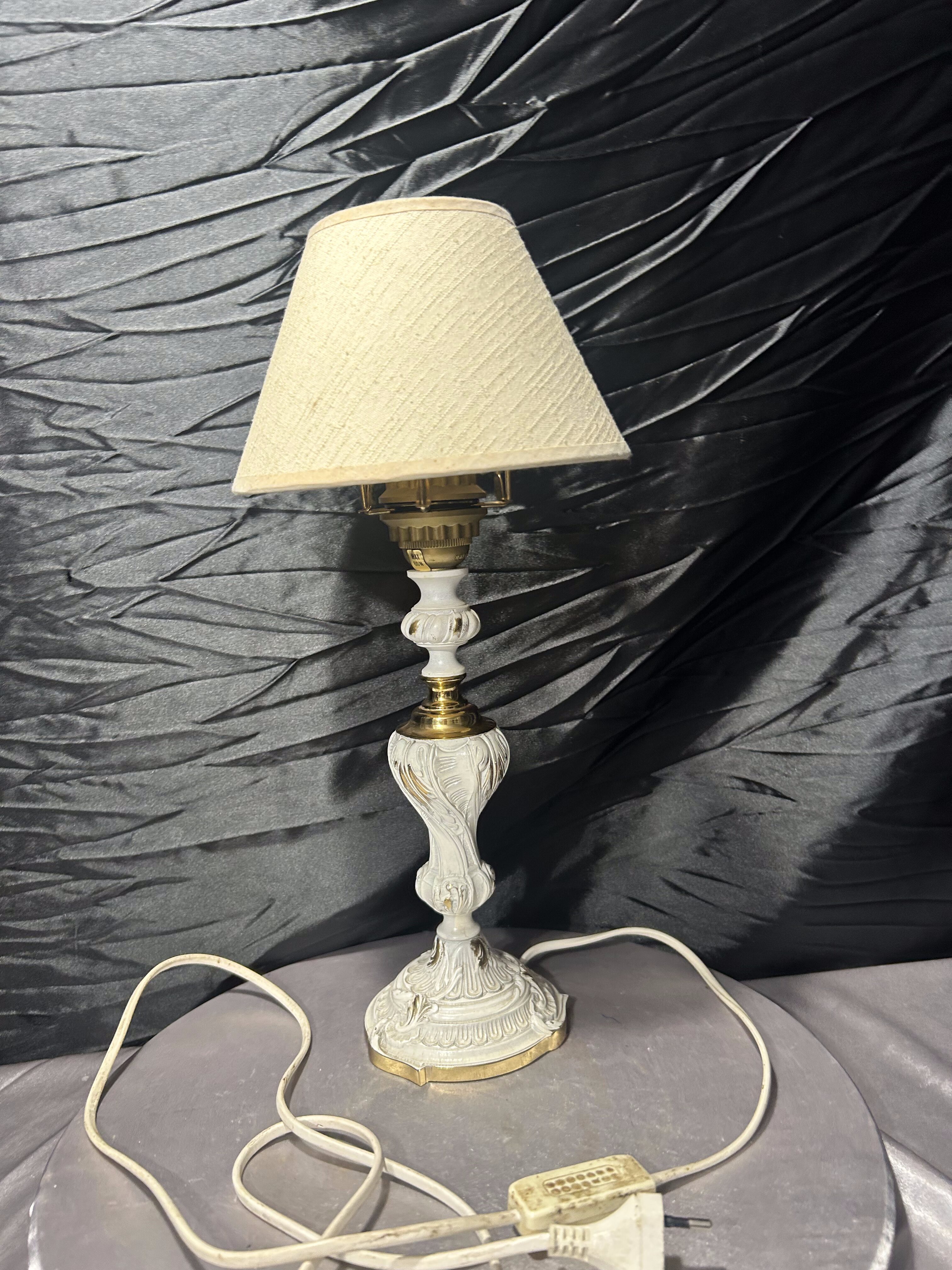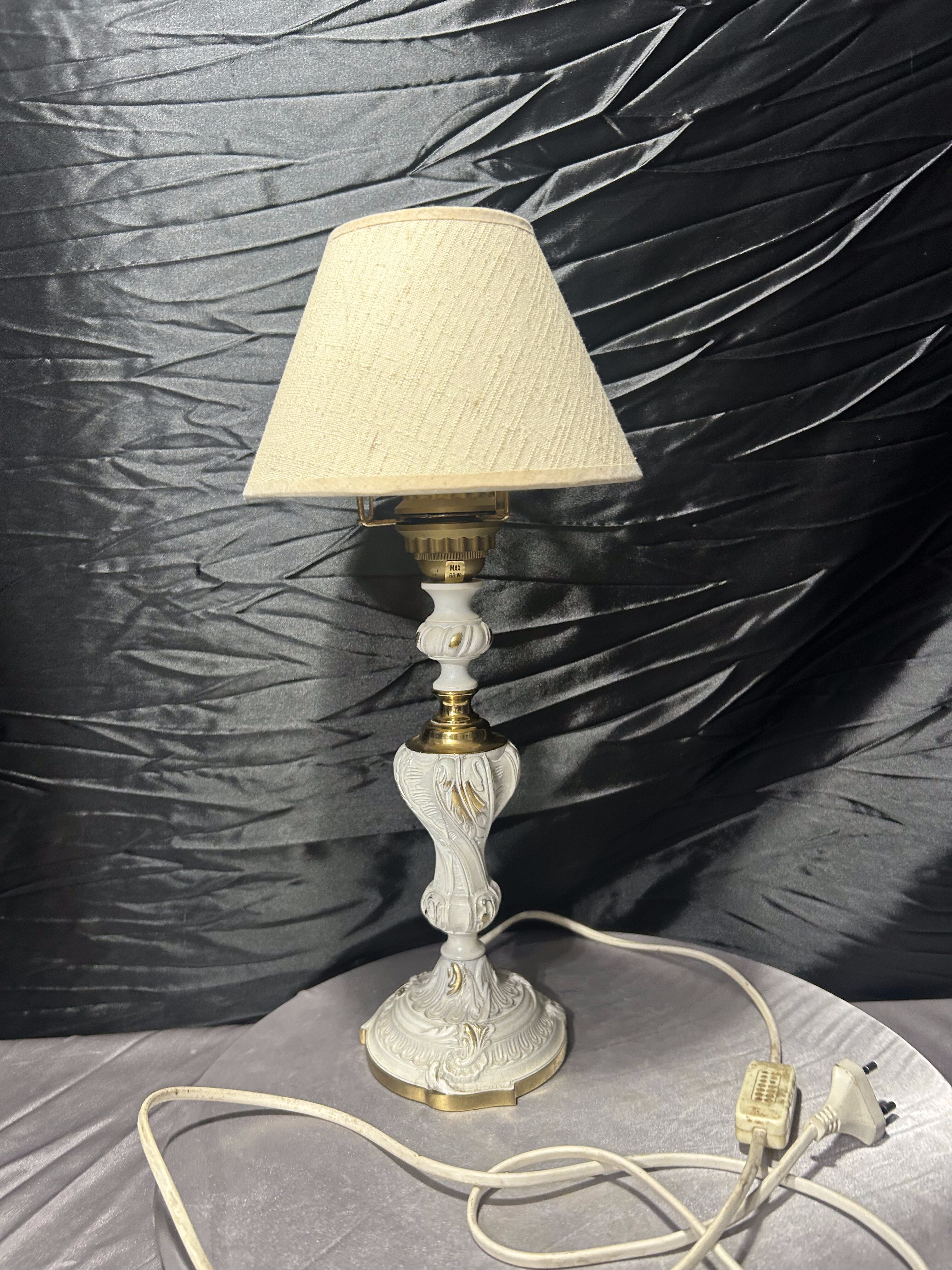 - Lampa stołowa stylizowana – biało-złota – styl klasyczny z patyną
