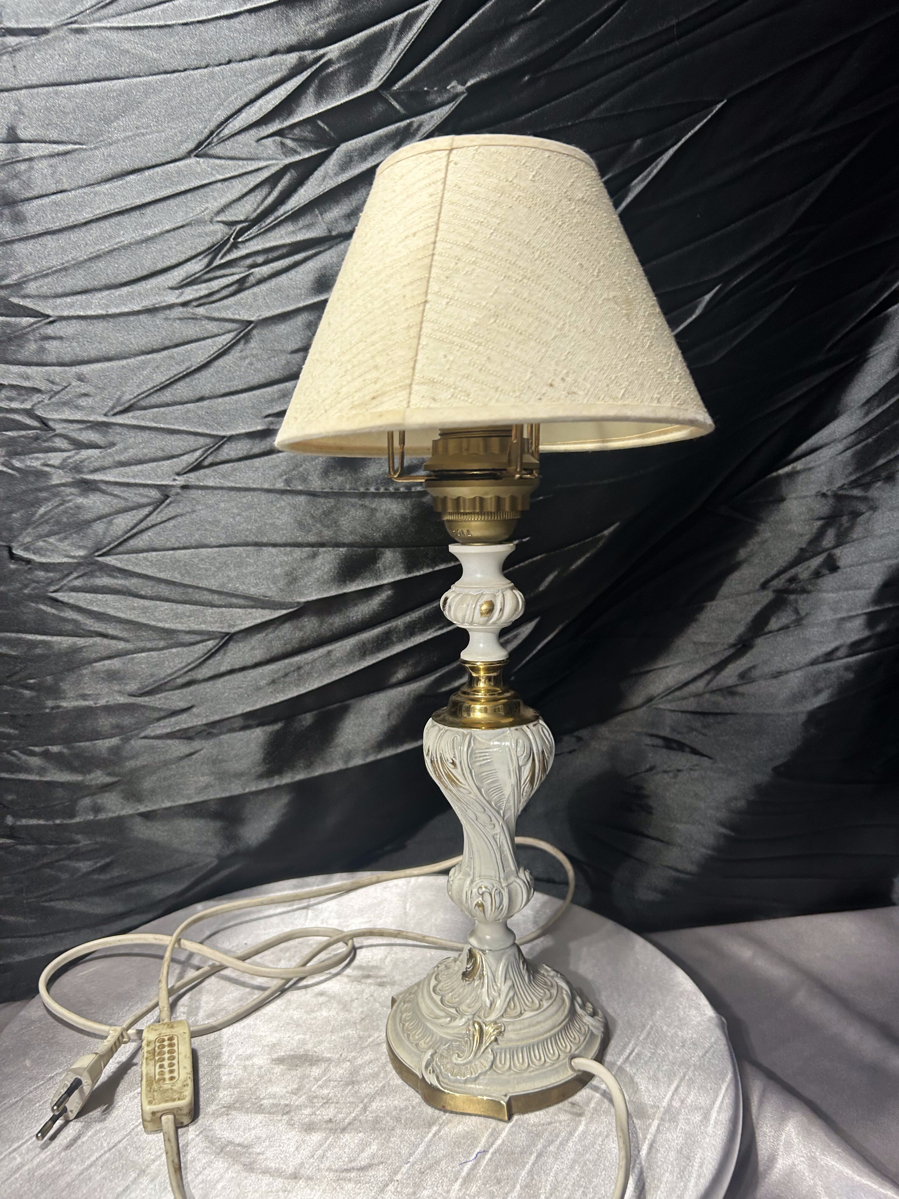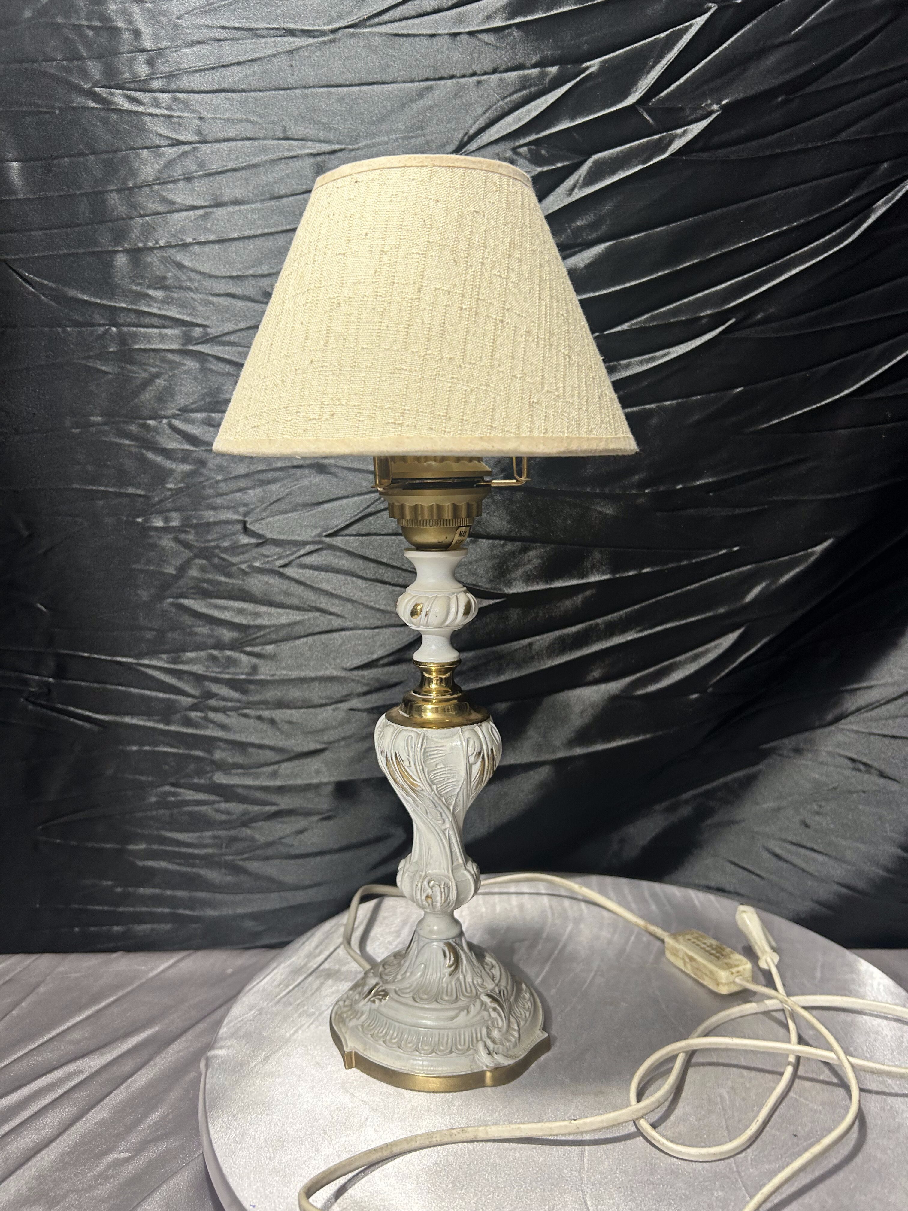 Dekoracyjna lampa stołowa wykonana z mosiądzu, pomalowana na biało i celowo przetarta, aby uzyskać efekt postarzenia. Smukła, klasyczna forma z wyraźnymi zdobieniami nadaje jej elegancki, nieco pałacowy charakter. Lampa stylizowana na starą, doskonale wpisuje się w estetykę wnętrz vintage, shabby chic oraz klasycznych aranżacji. W komplecie abażur w jasnym odcieniu, który miękko rozprasza światło.
