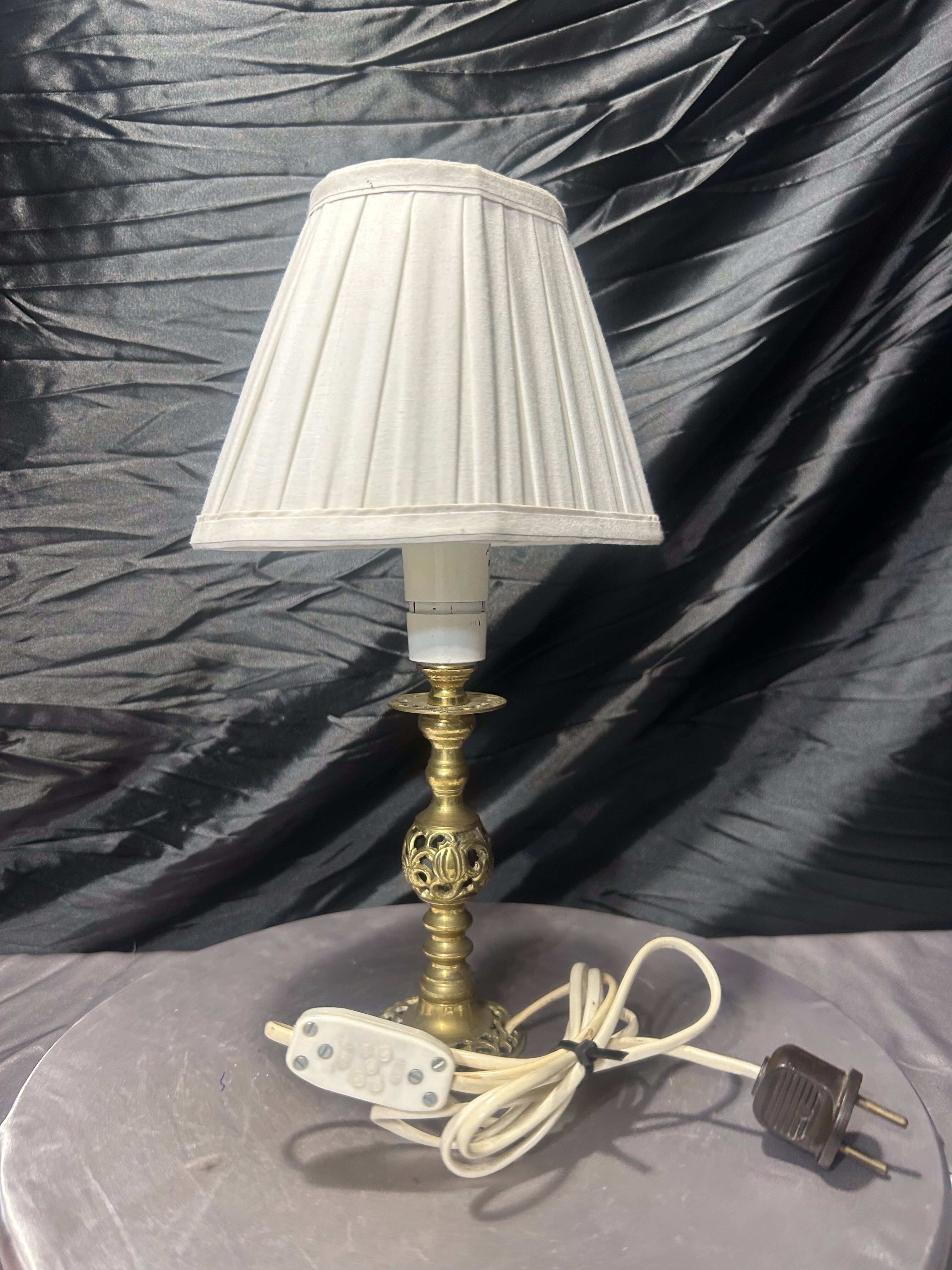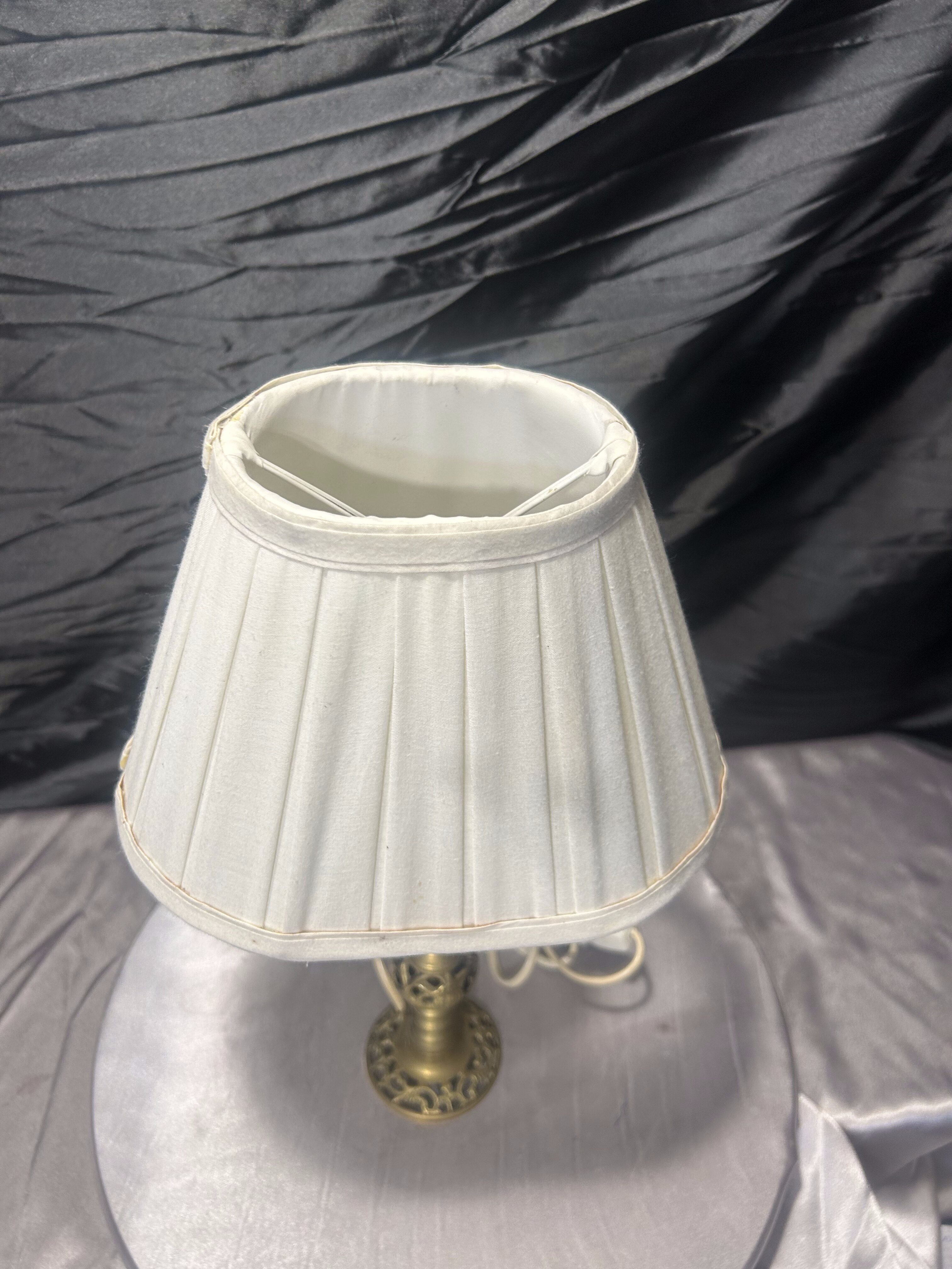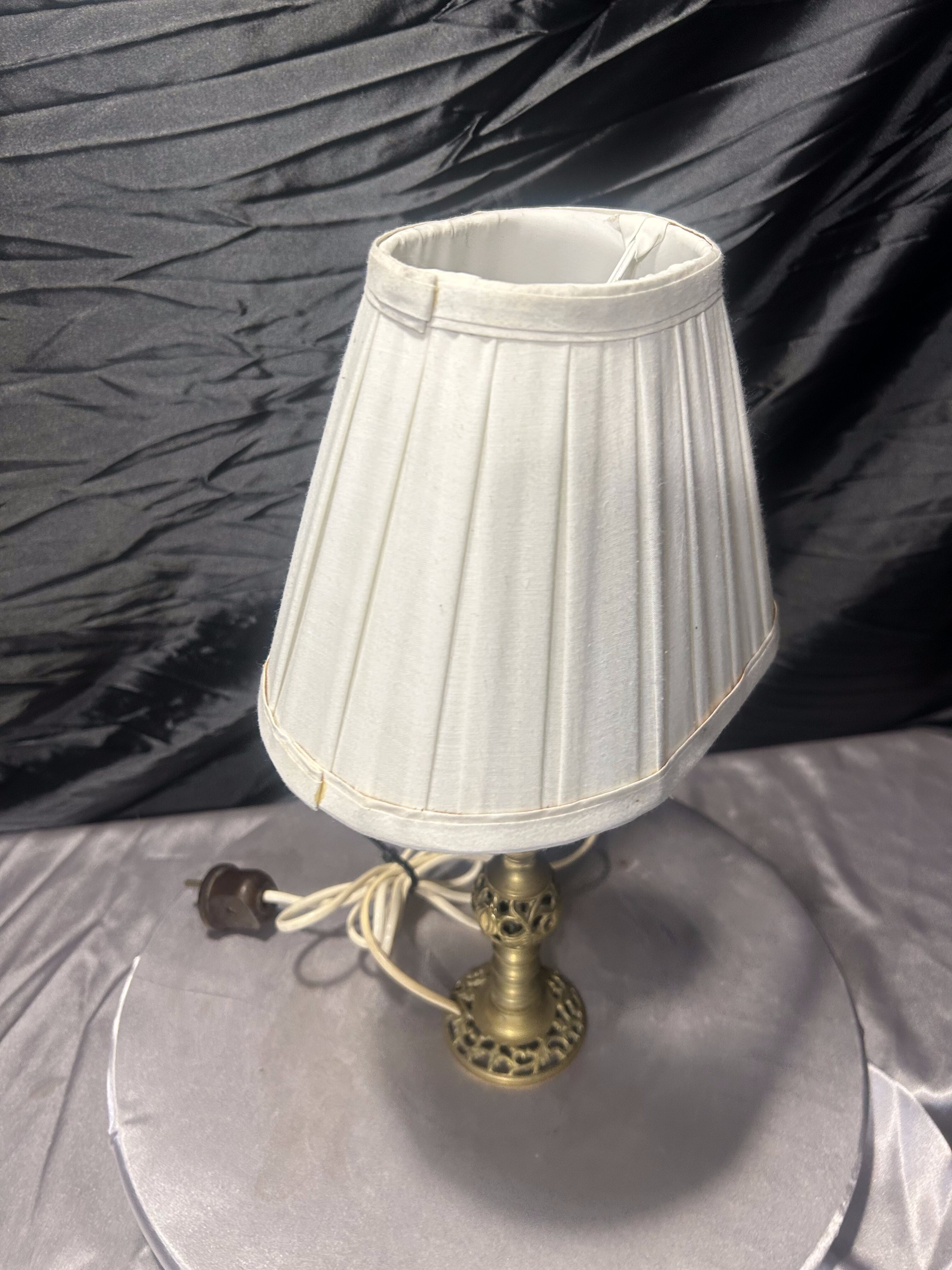 Elegancka lampa stołowa wykonana z mosiądzu, z dekoracyjną, ażurową podstawą o klasycznym charakterze. Smukła forma i starannie wyprofilowane detale nadają całości lekkości i ponadczasowej elegancji. Lampa wyposażona jest w jasny abażur o delikatnie jajowatym, nieregularnym kształcie, który subtelnie rozprasza światło i podkreśla dekoracyjny charakter przedmiotu.