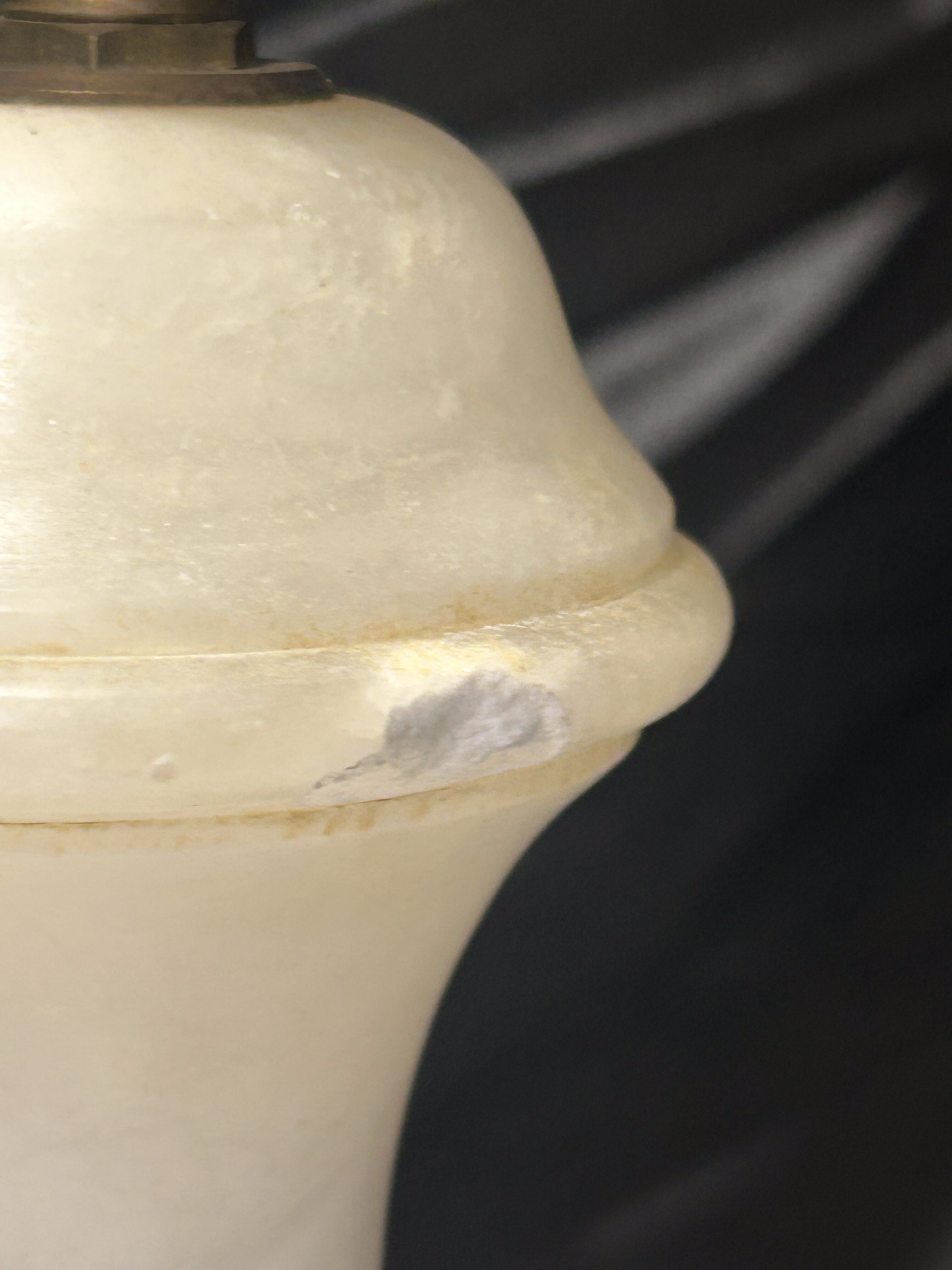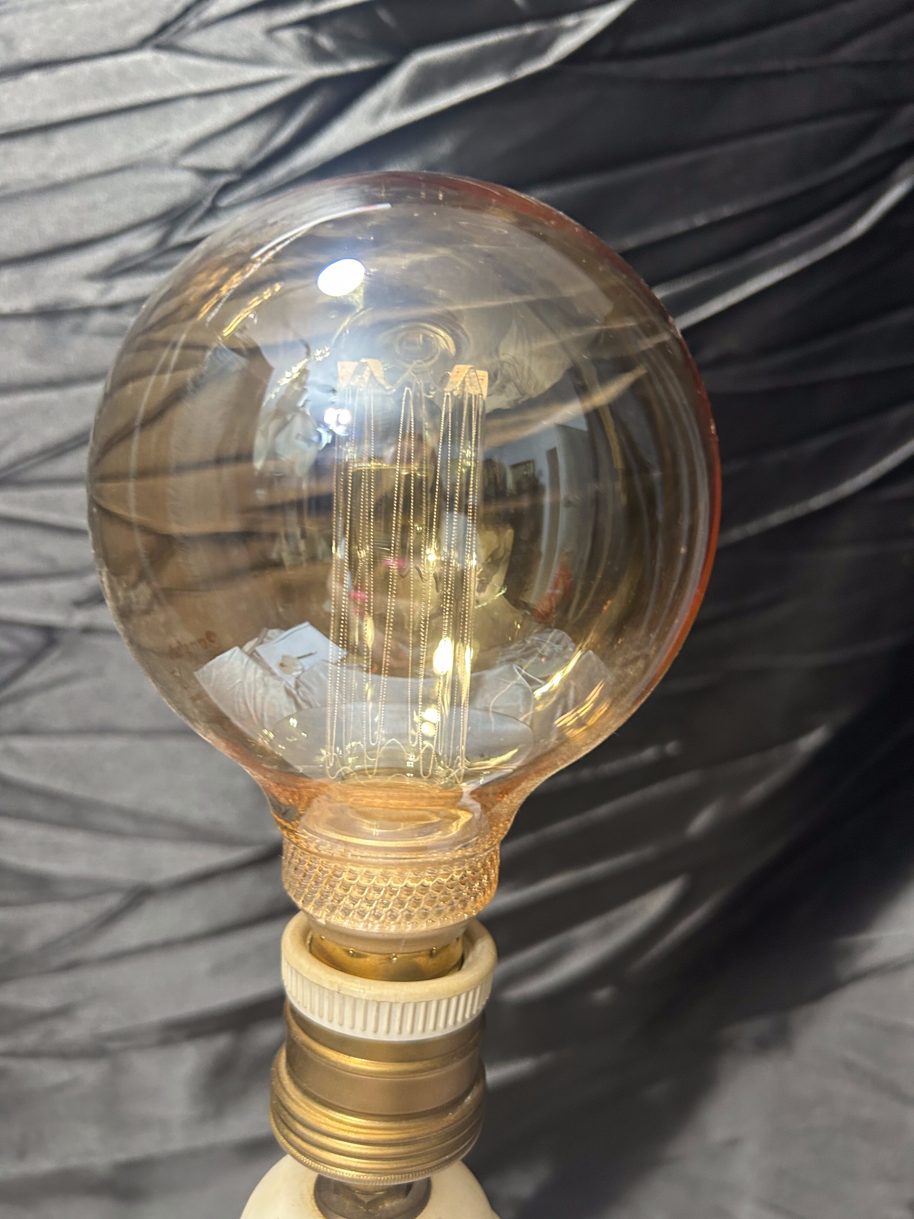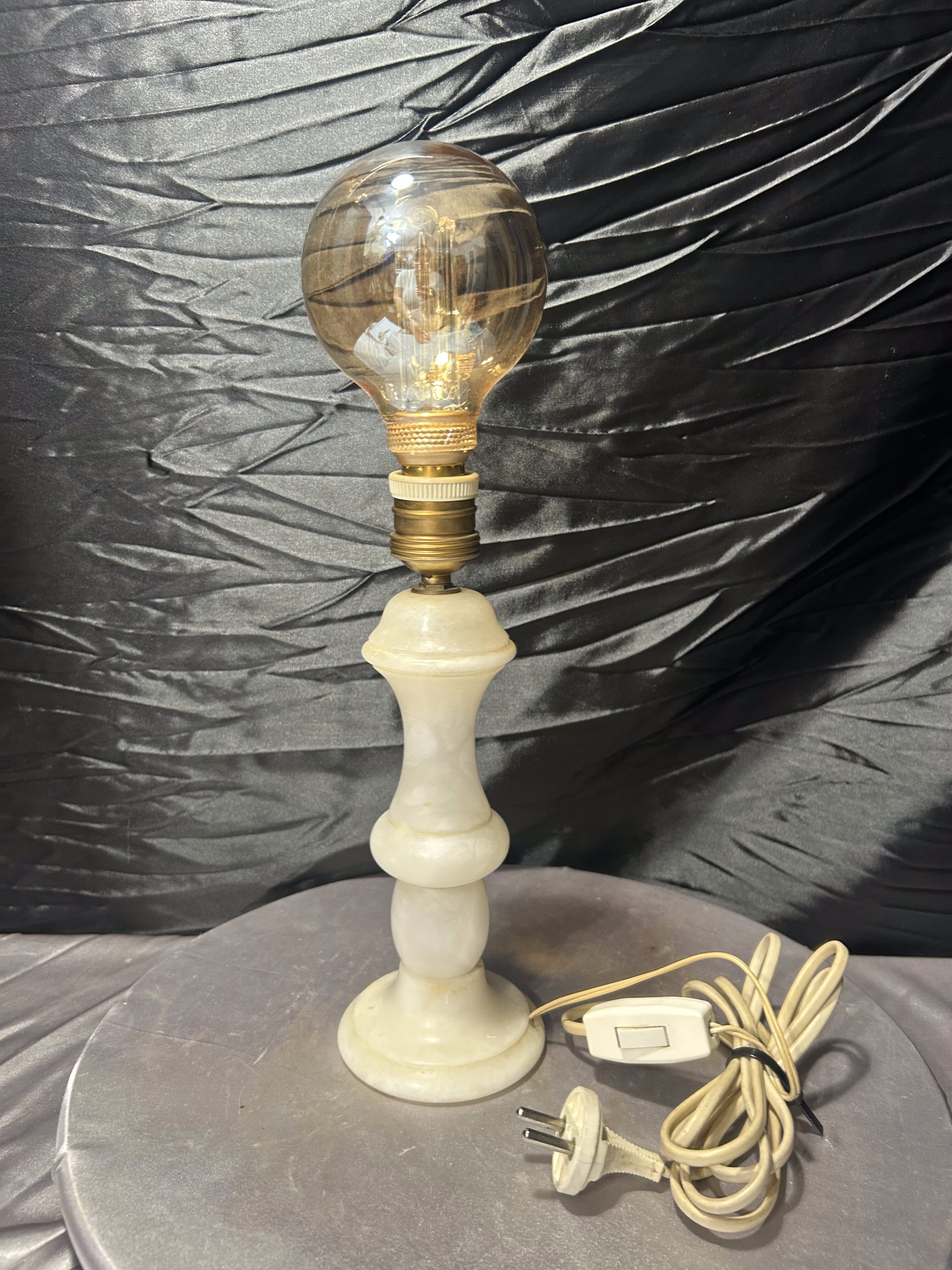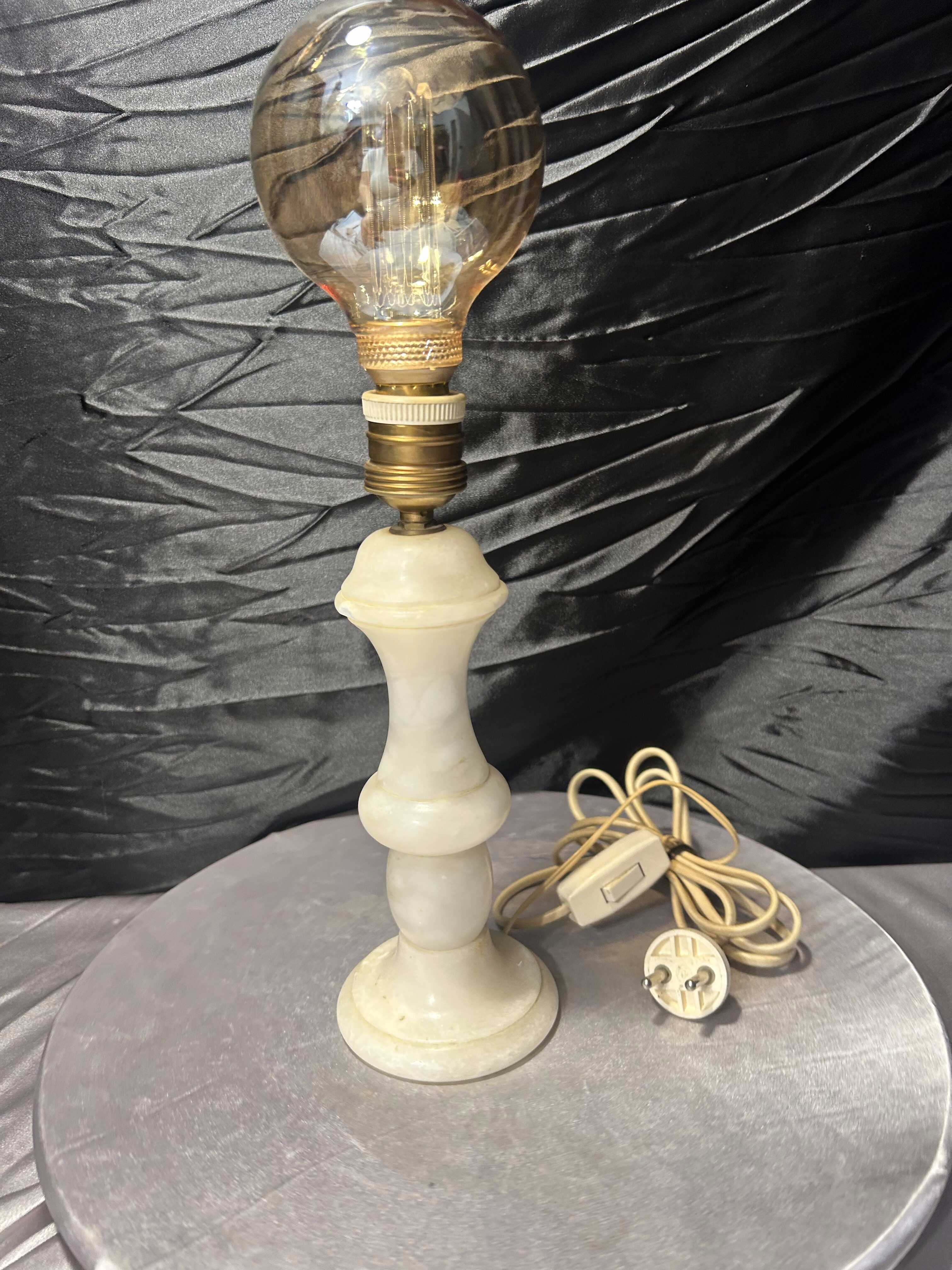 Lampa będzie doskonałym uzupełnieniem wnętrz urządzonych w stylu klasycznym, vintage lub glamour. Naturalny alabaster i dekoracyjna żarówka tworzą elegancki duet, który dobrze prezentuje się na komodzie, stoliku nocnym lub konsoli. Drobne uszkodzenie zostało uwzględnione w cenie.