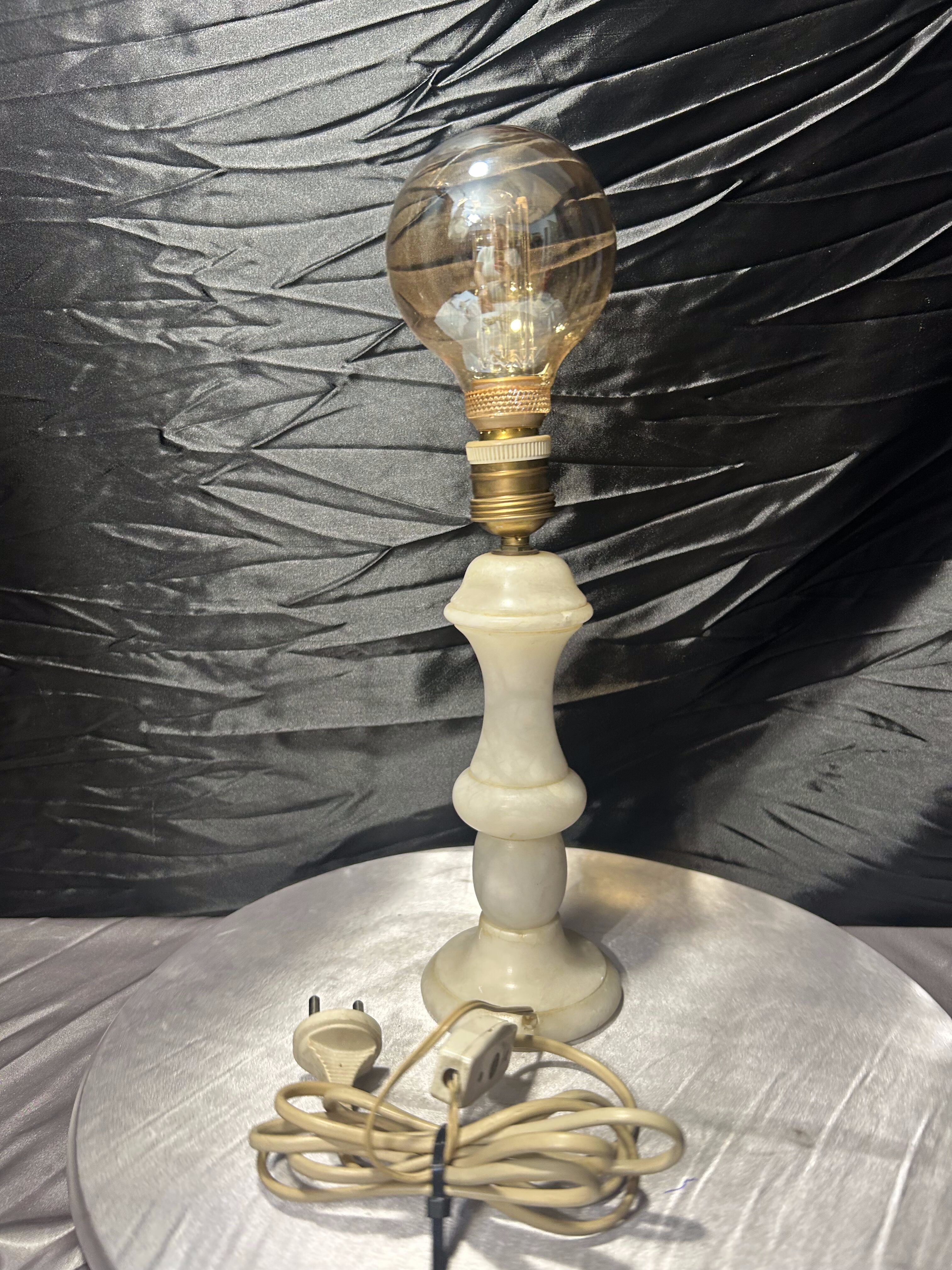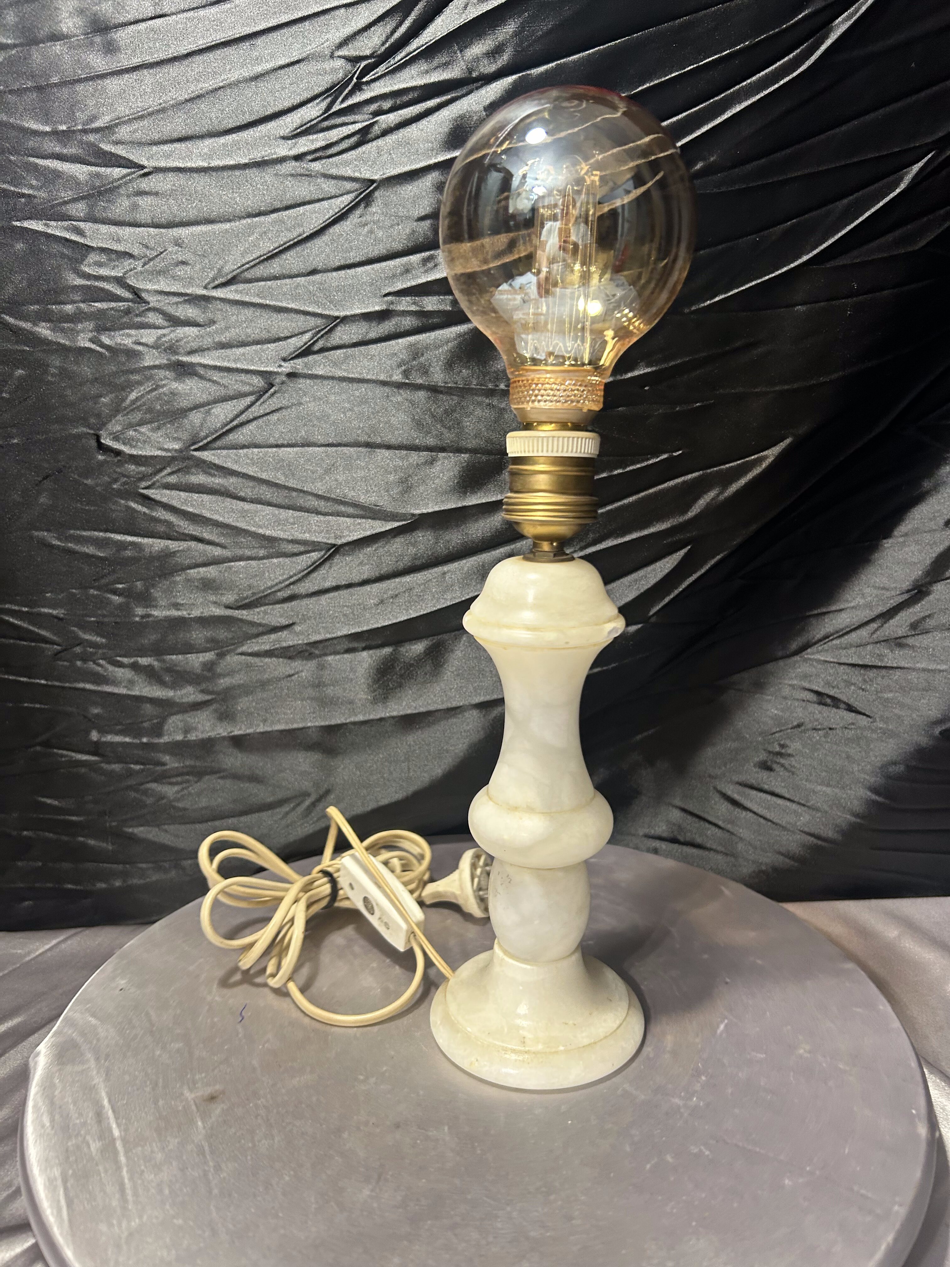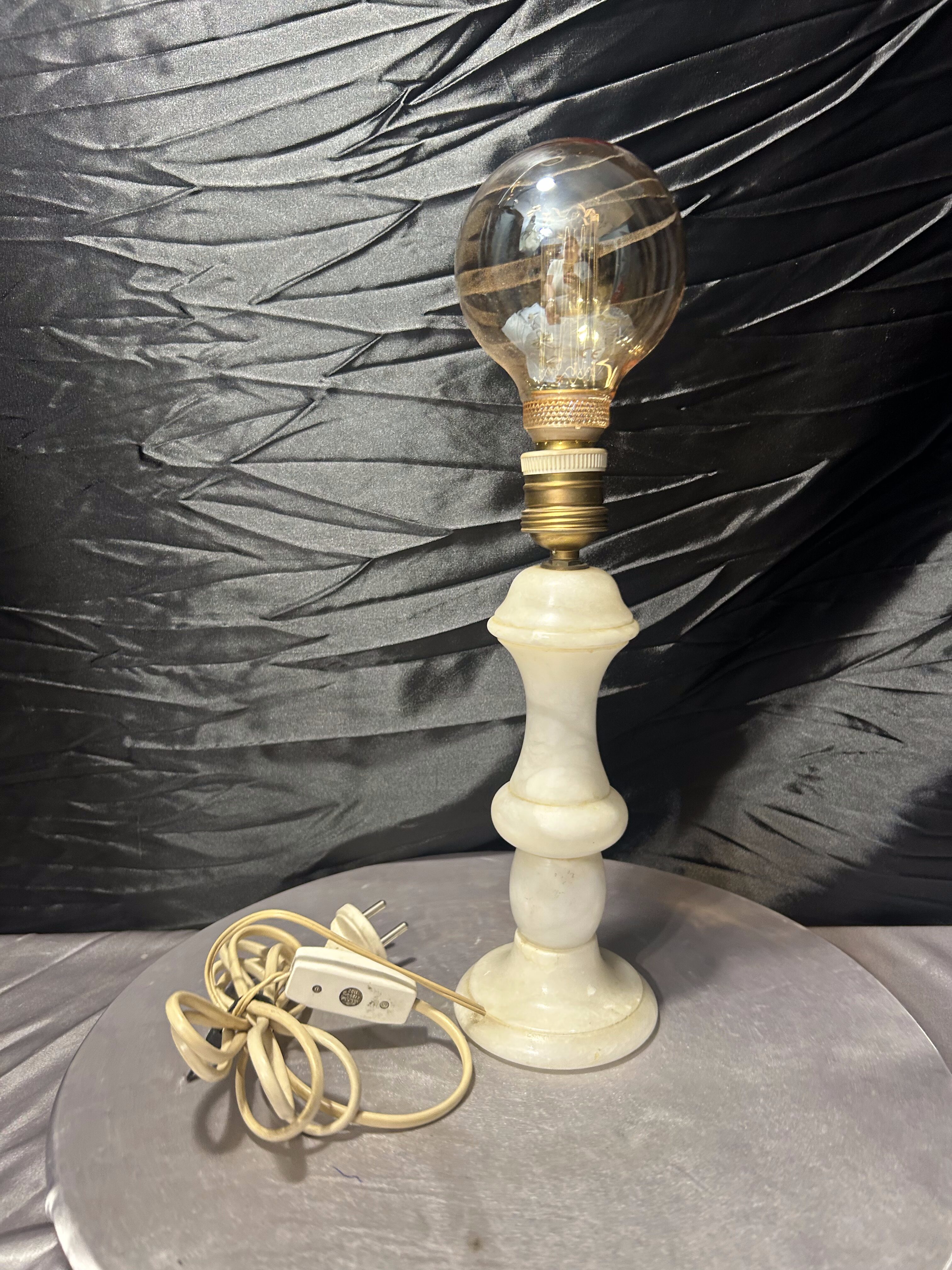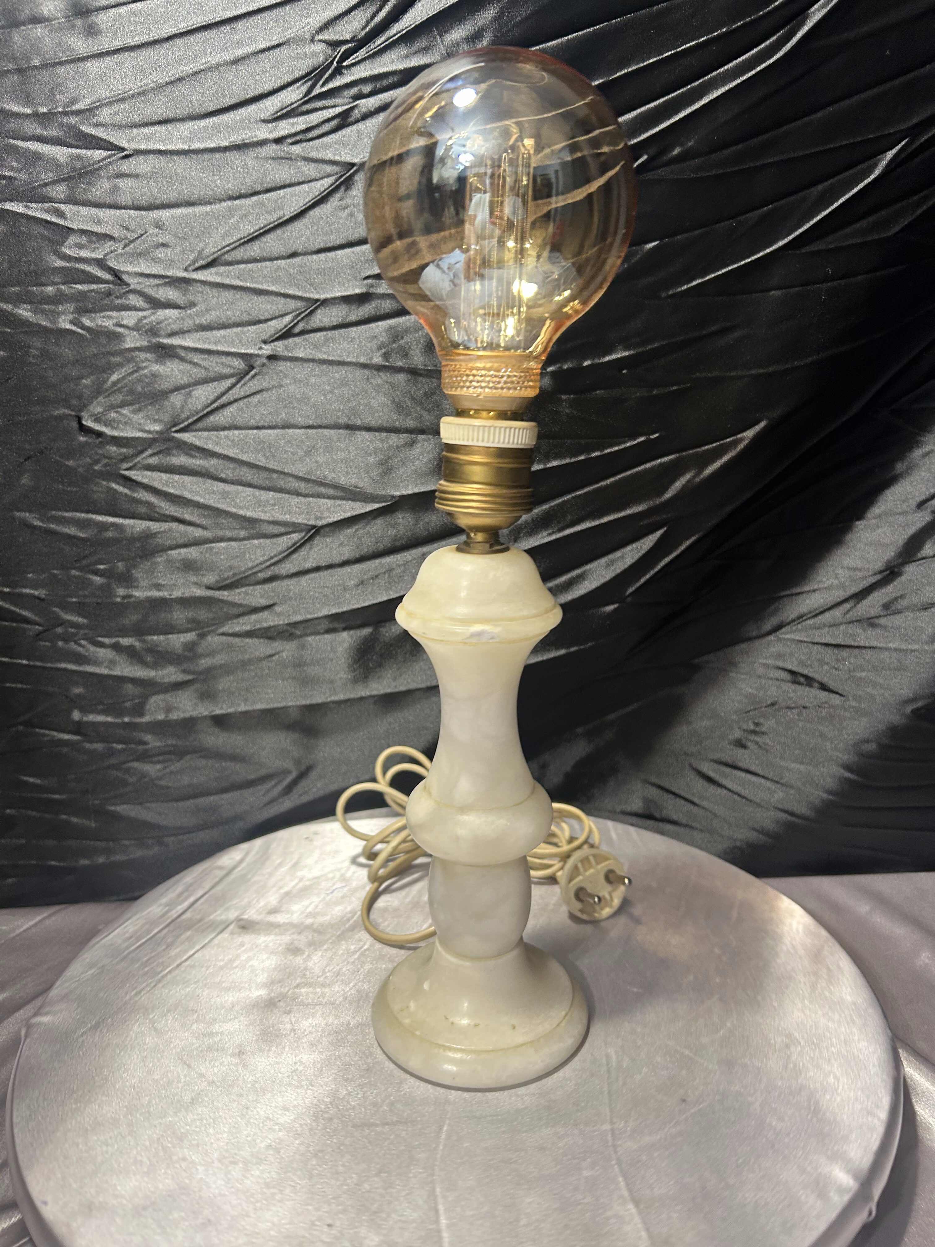 Dekoracyjna lampa stołowa wykonana z naturalnego alabastru, o smukłej, klasycznej formie. Jasny kamień o subtelnym użyleniu pięknie rozprasza światło, nadając wnętrzu ciepły i elegancki charakter. Lampa wyposażona jest w dużą, ozdobną żarówkę, która dodatkowo podkreśla jej dekoracyjny styl. Całość prezentuje się estetycznie i stabilnie, idealnie sprawdzi się jako oświetlenie nastrojowe.