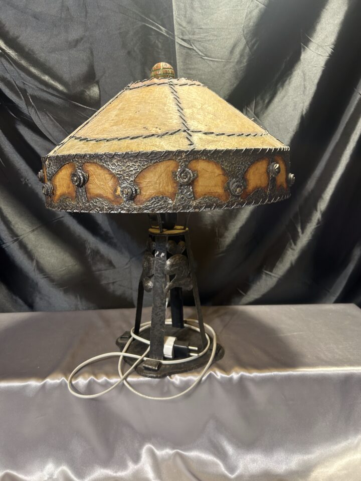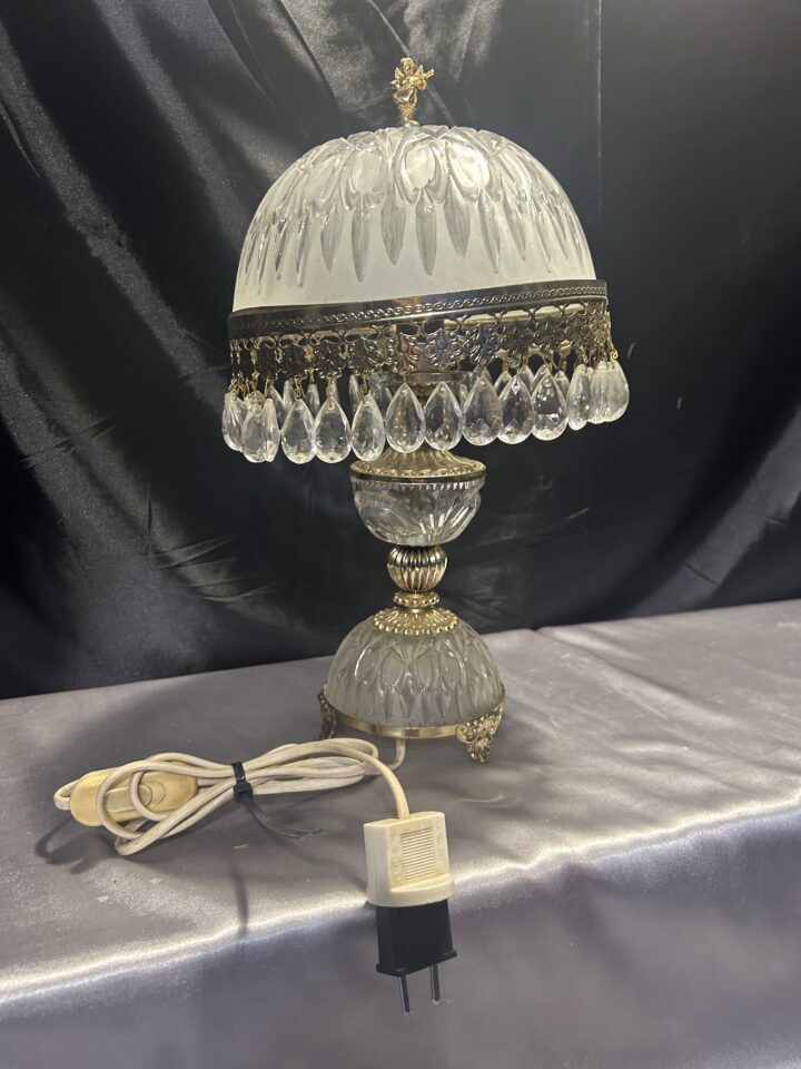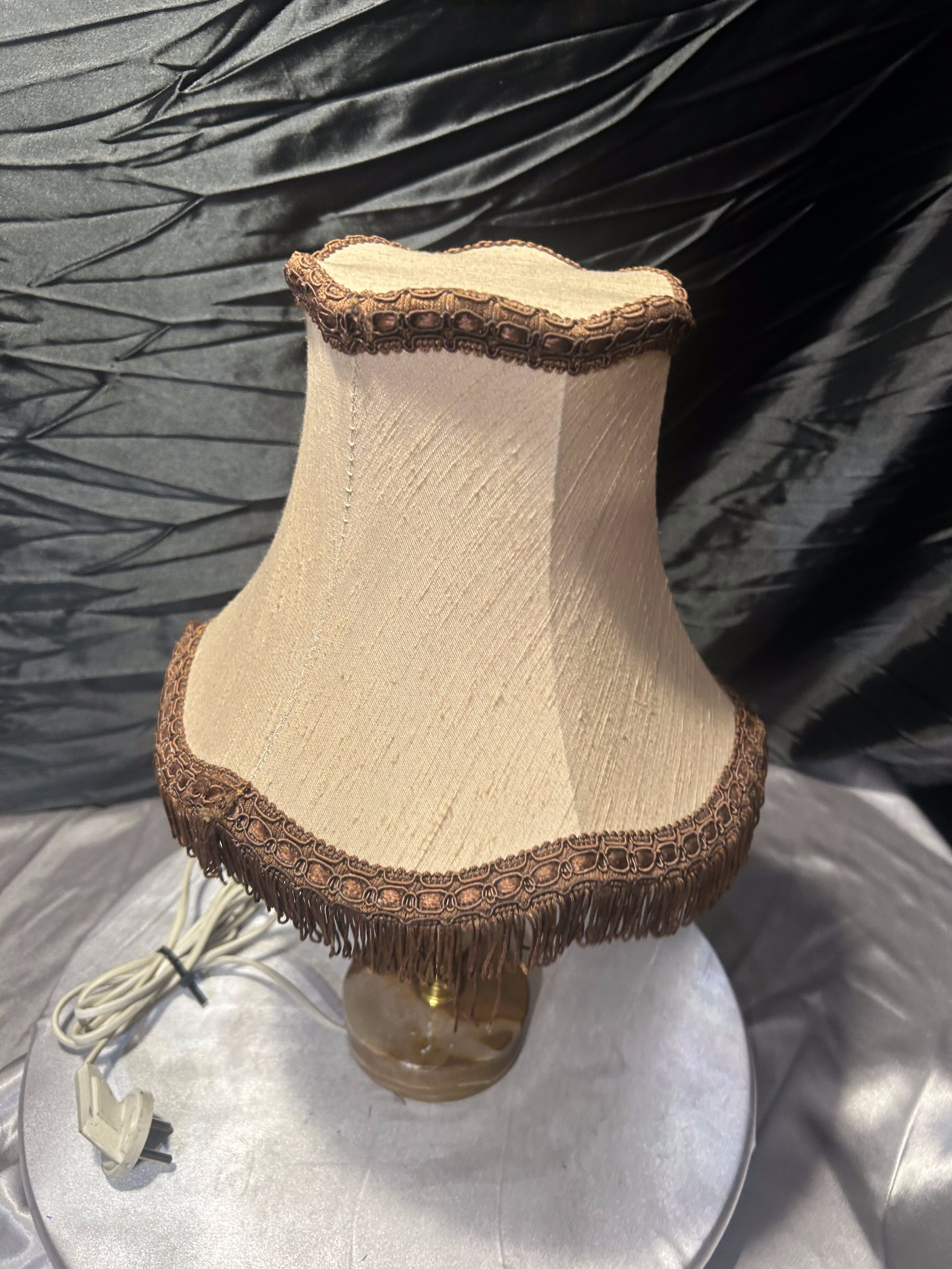 Lampa wyposażona jest w stylowy abażur z dekoracyjną lamówką oraz ozdobnymi frędzlami, które podkreślają jej elegancki, vintage’owy charakter. Tego typu lampy były popularnym elementem wystroju wnętrz w drugiej połowie XX wieku i do dziś świetnie odnajdują się w klasycznych oraz eklektycznych aranżacjach.