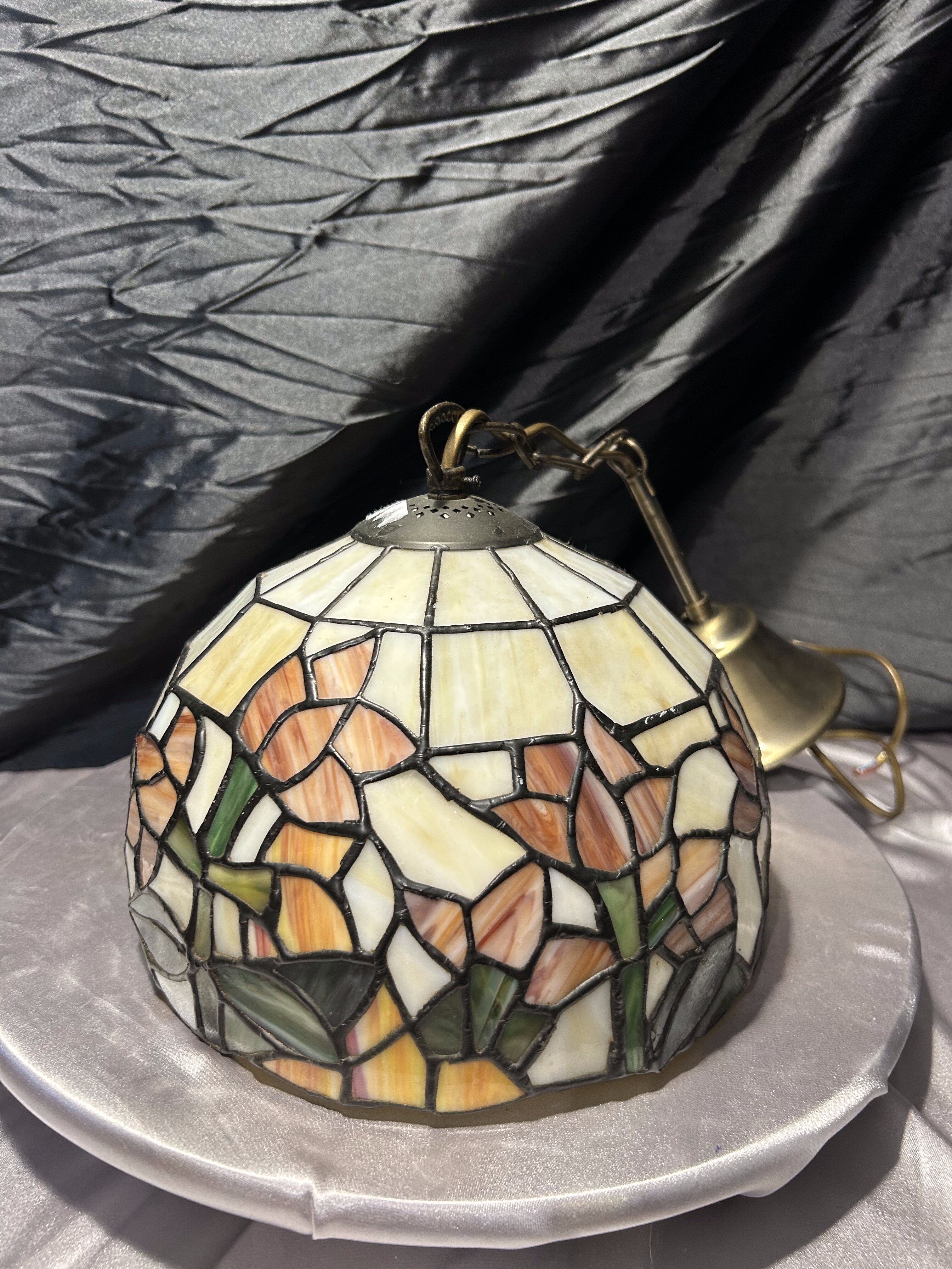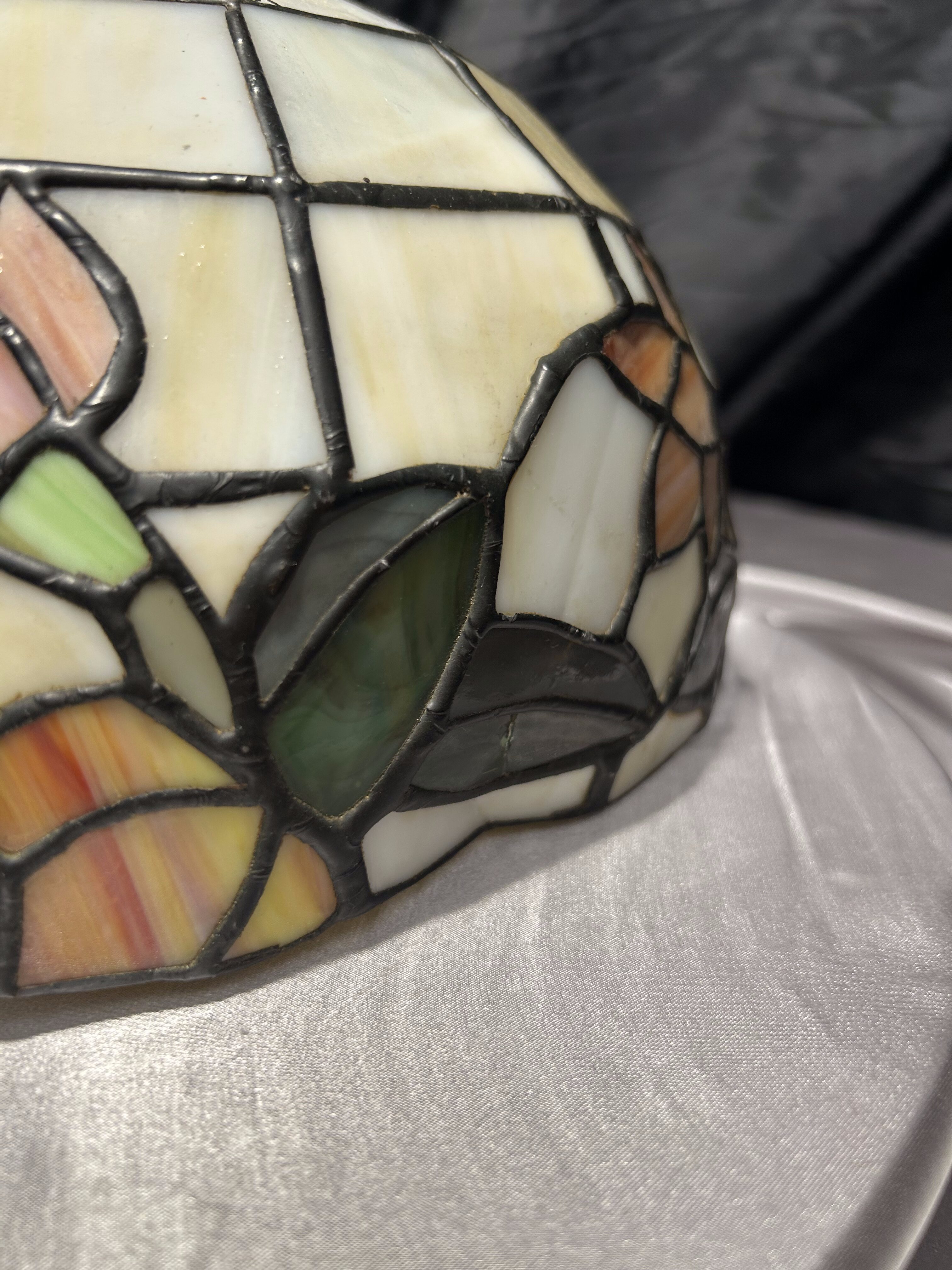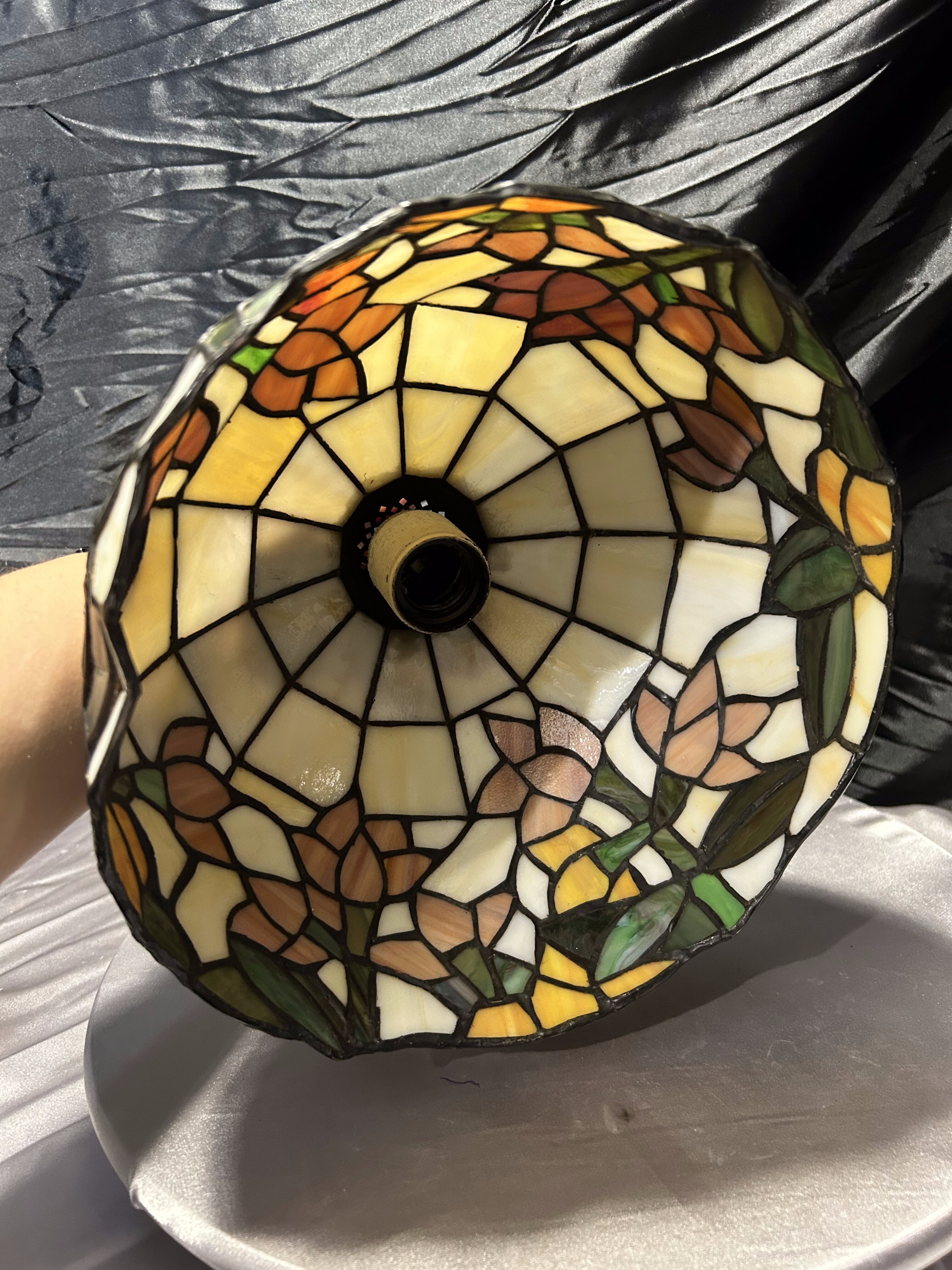 Piękna szklana lampa witrażowa w stylu Tiffany, wykonana z barwionych, ręcznie łączonych elementów tworzących dekoracyjny motyw roślinny. Połączenie odcieni zieleni, pomarańczu i kremu tworzy harmonijną kompozycję, która po zapaleniu światła daje efekt ciepłej, nastrojowej iluminacji – idealnej do salonu, sypialni czy jadalni.