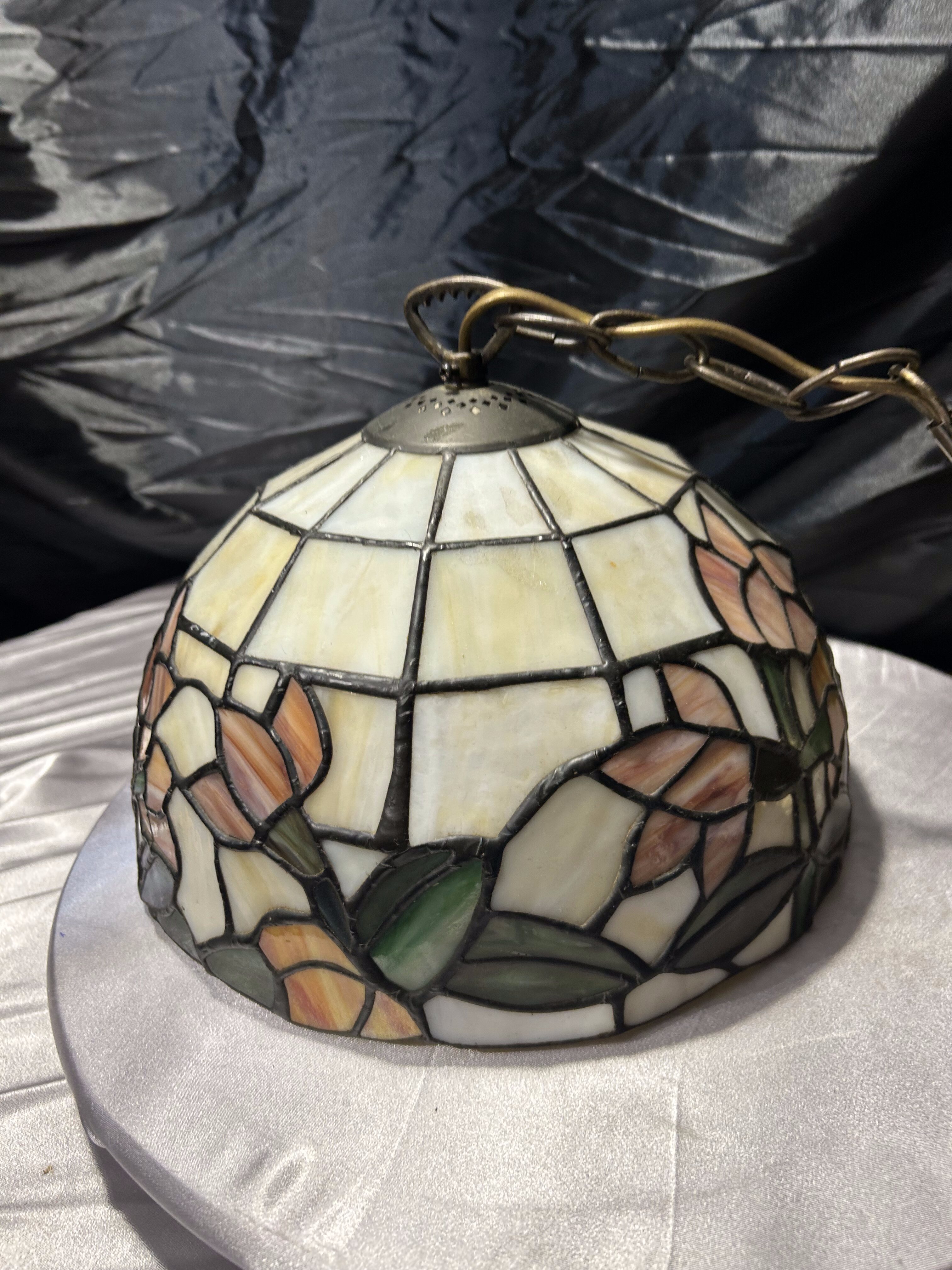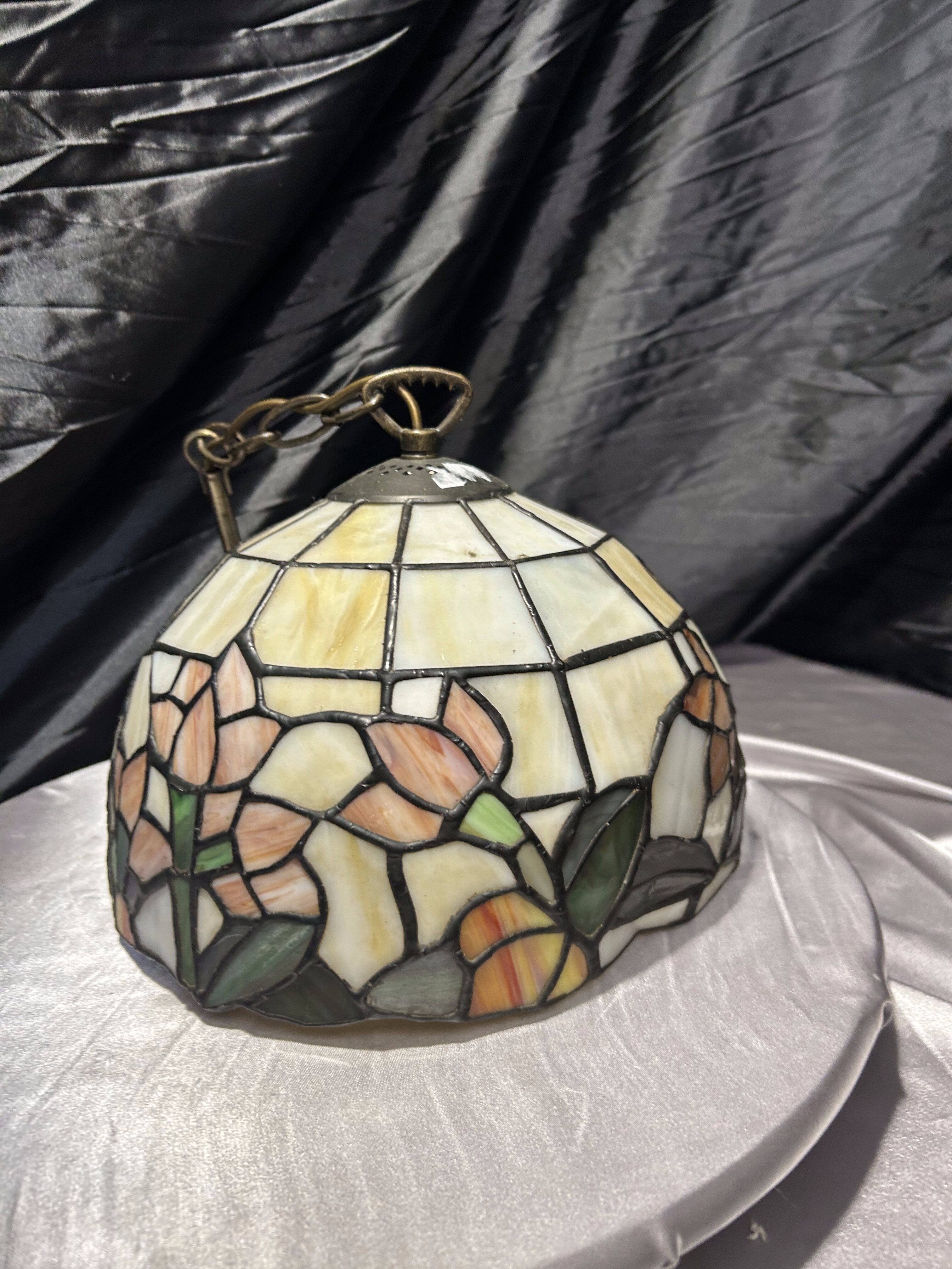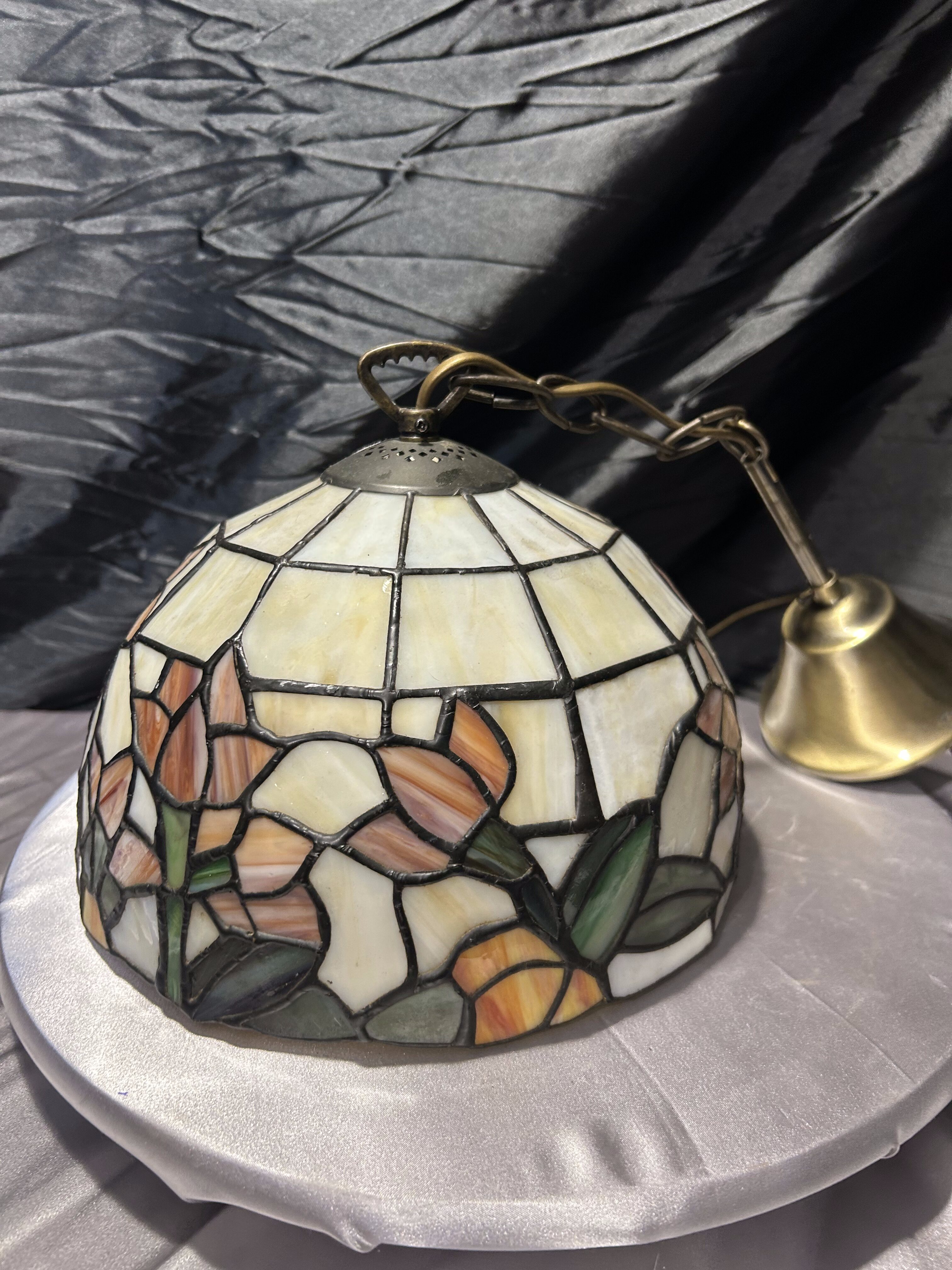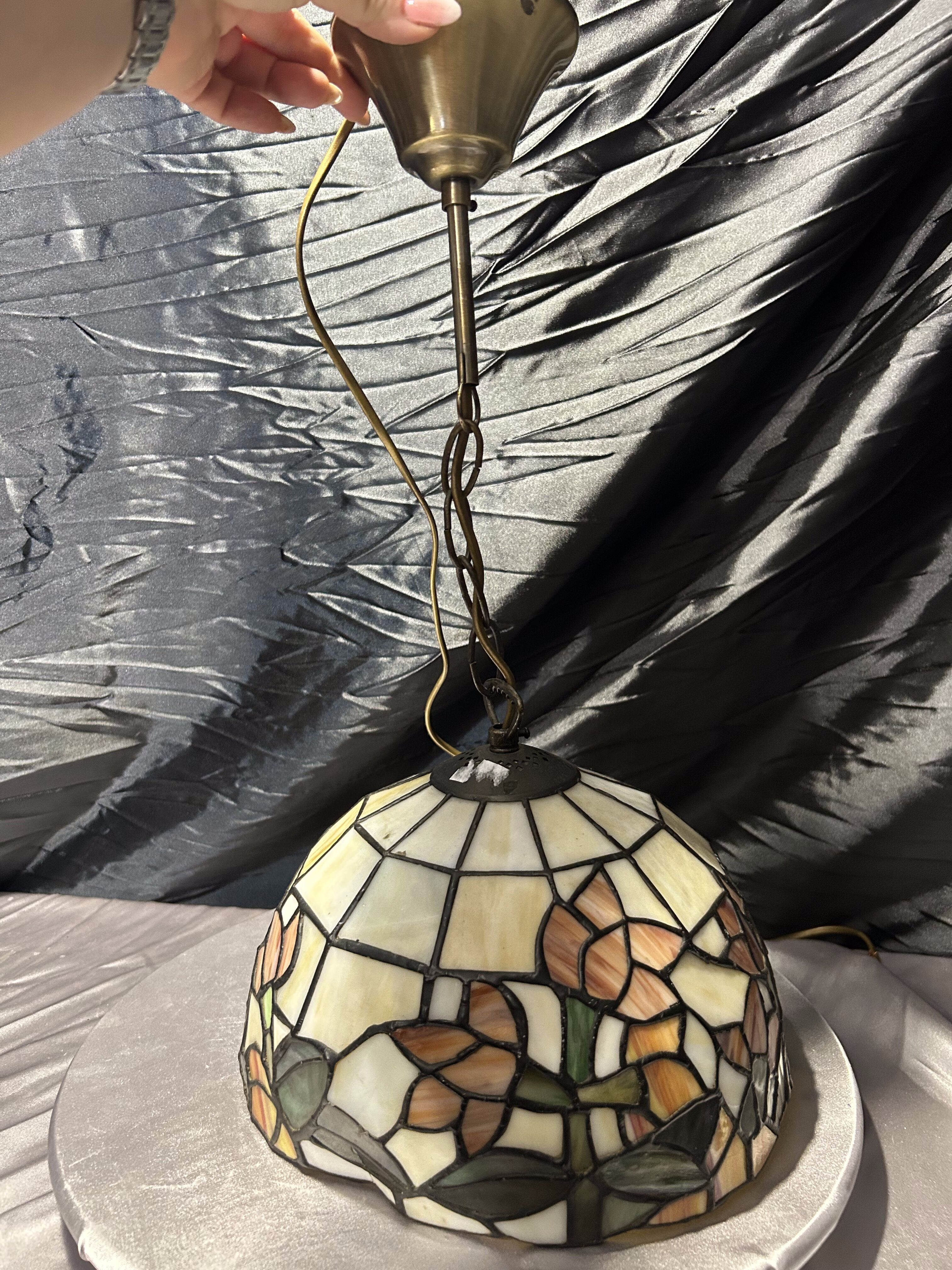 Piękna szklana lampa witrażowa w stylu Tiffany, wykonana z barwionych, ręcznie łączonych elementów tworzących dekoracyjny motyw roślinny. Połączenie odcieni zieleni, pomarańczu i kremu tworzy harmonijną kompozycję, która po zapaleniu światła daje efekt ciepłej, nastrojowej iluminacji – idealnej do salonu, sypialni czy jadalni.