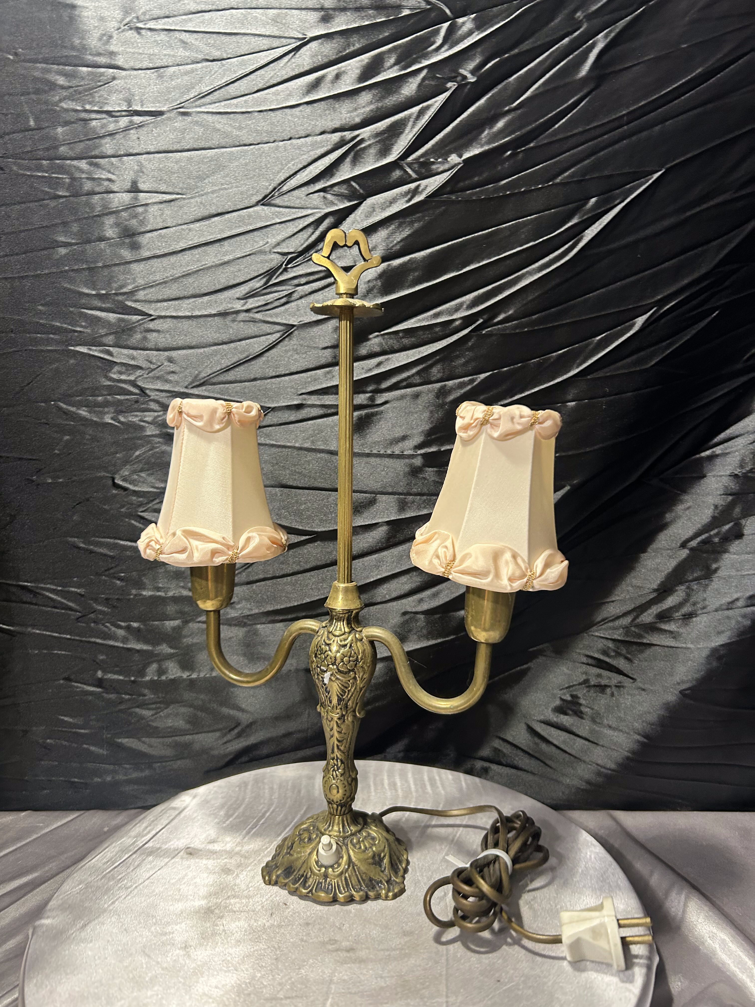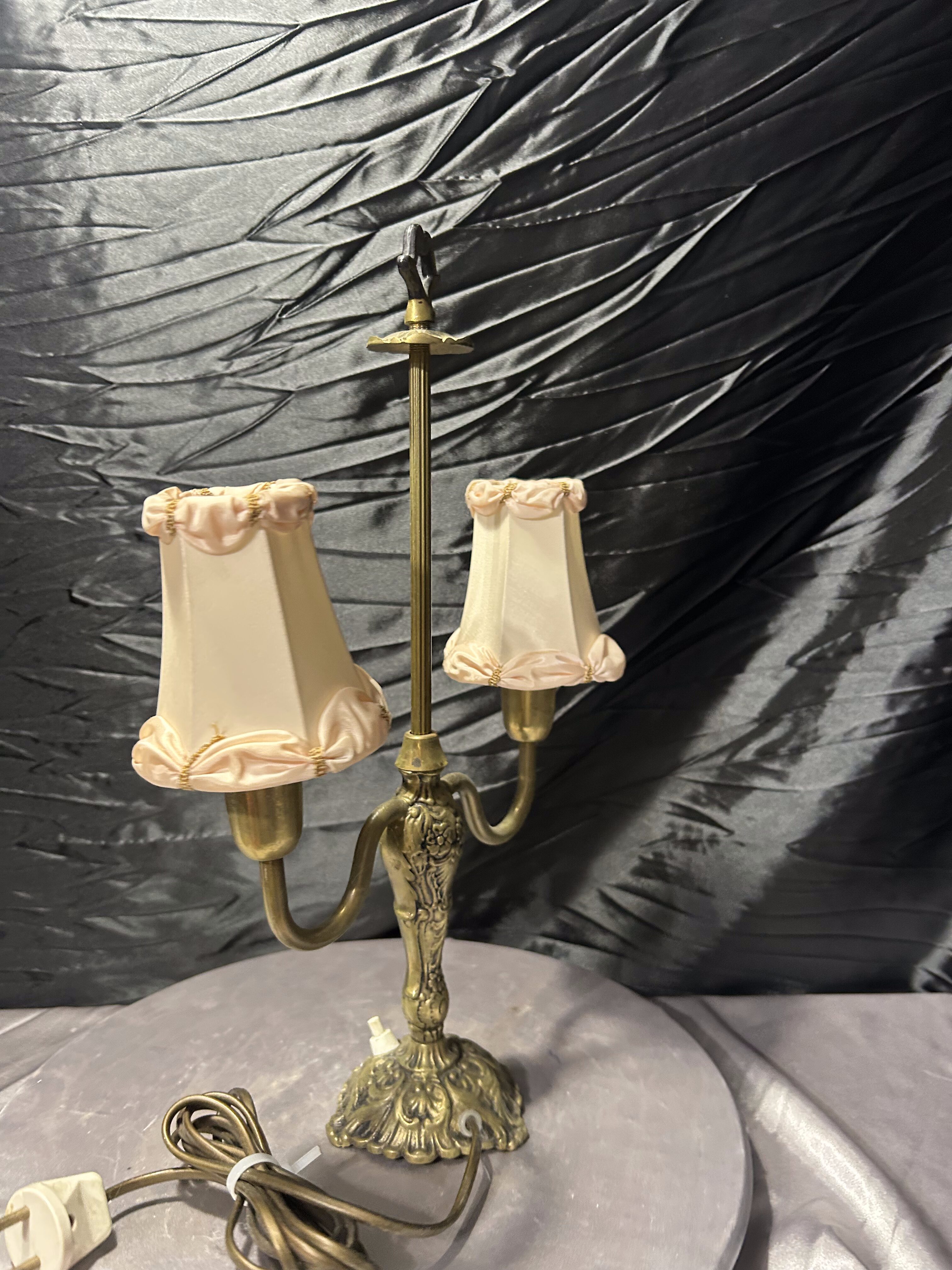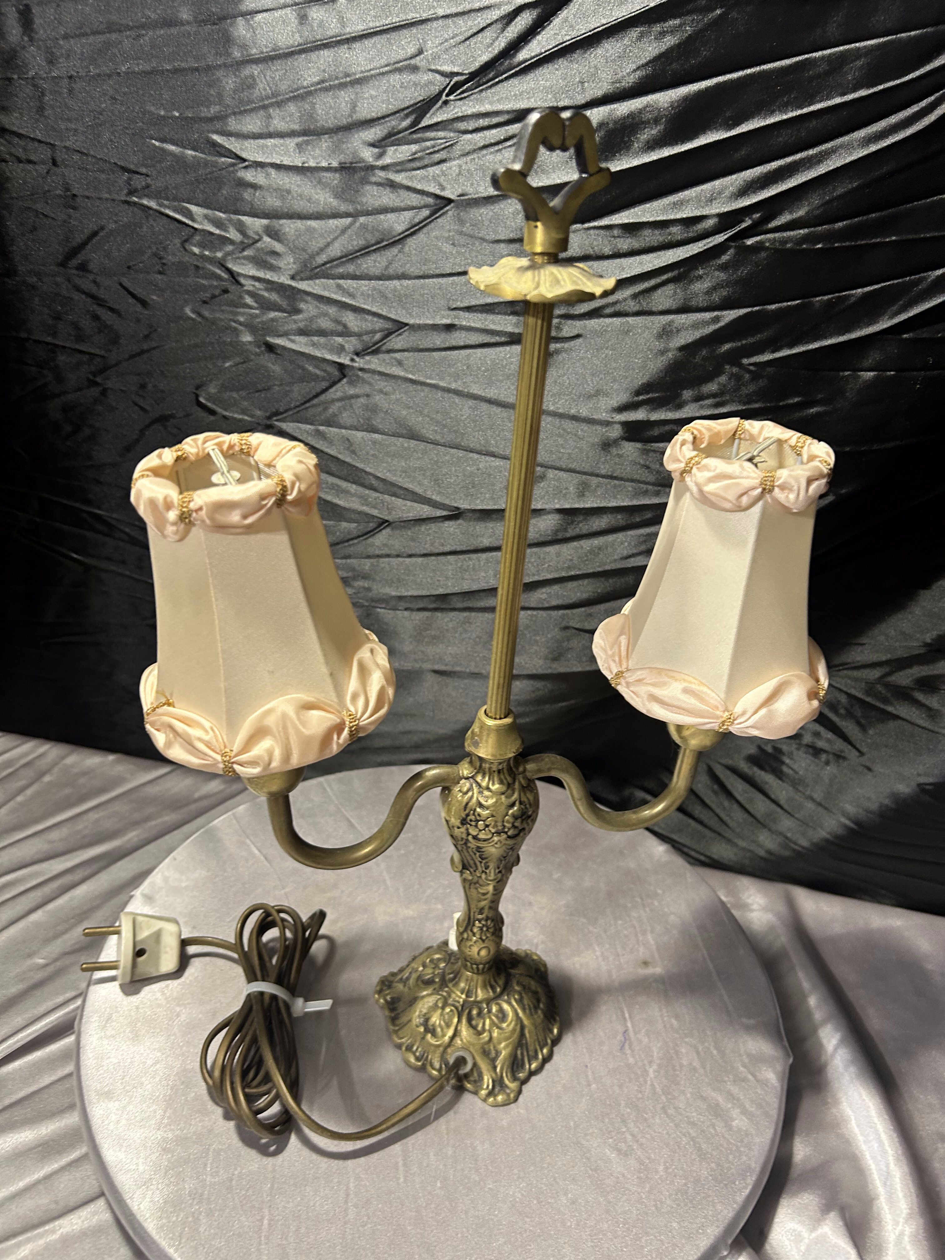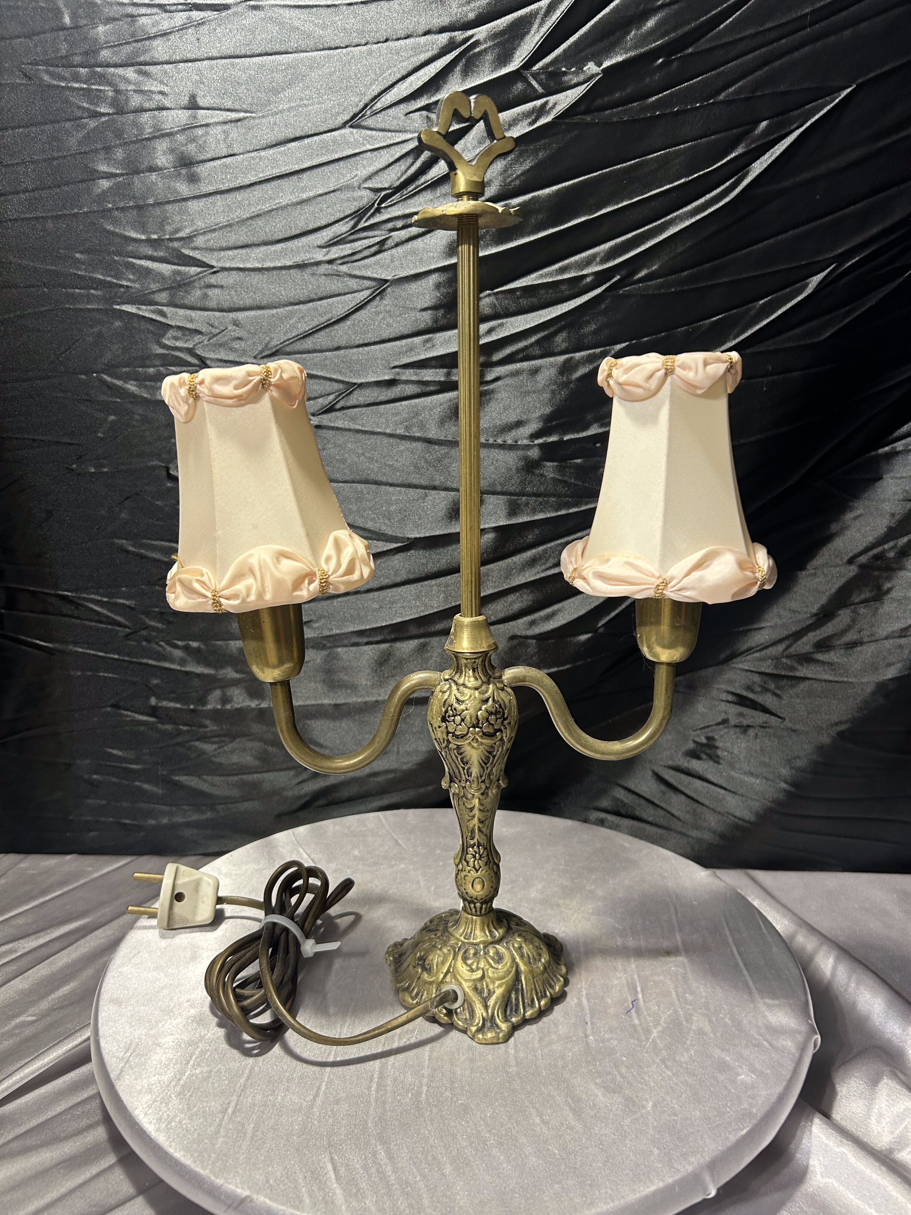 Dekoracyjna lampa wykonana z mosiądzu, o eleganckiej, klasycznej formie. Dwuramienna konstrukcja z miejscem na dwie żarówki, uzupełniona materiałowymi abażurami, nadaje całości lekkości i dekoracyjnego charakteru. Starannie wyprofilowana podstawa oraz ozdobny trzon podkreślają styl inspirowany dawnymi formami oświetlenia.