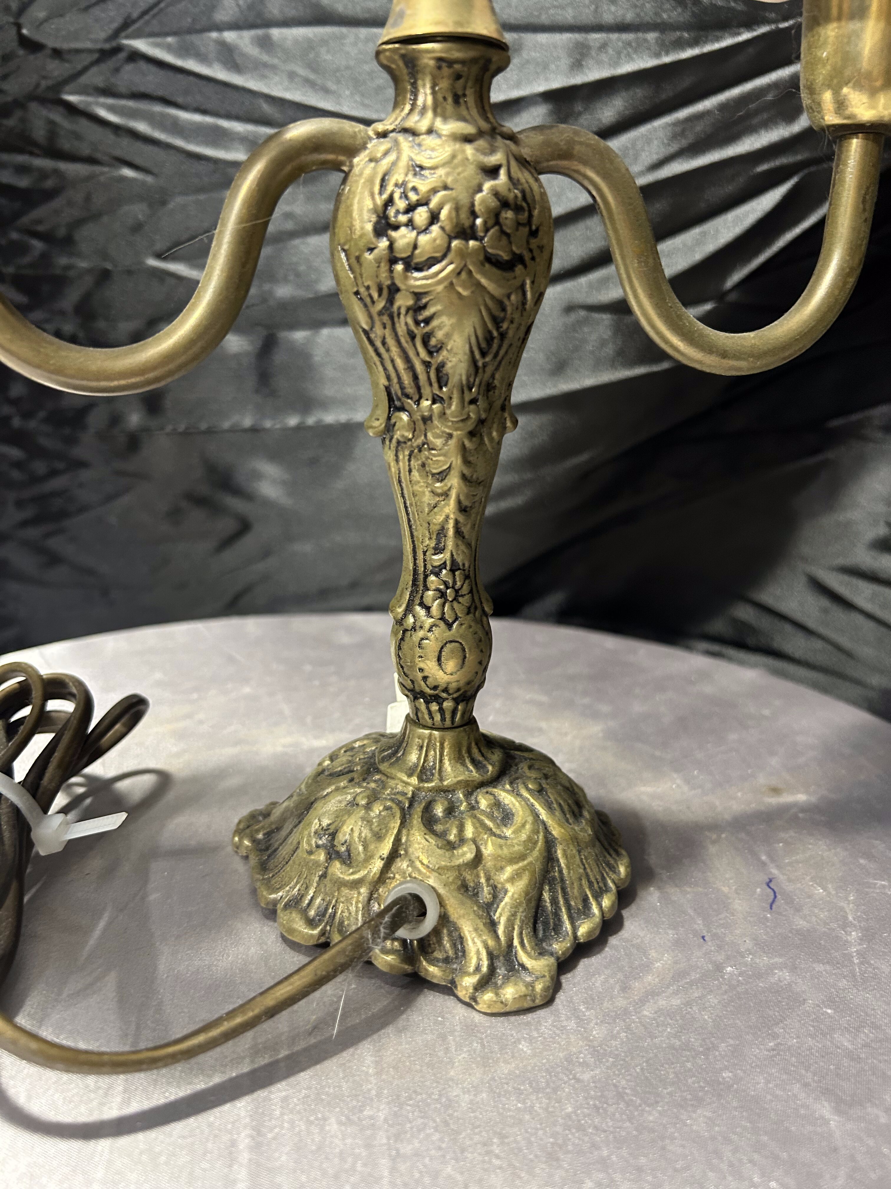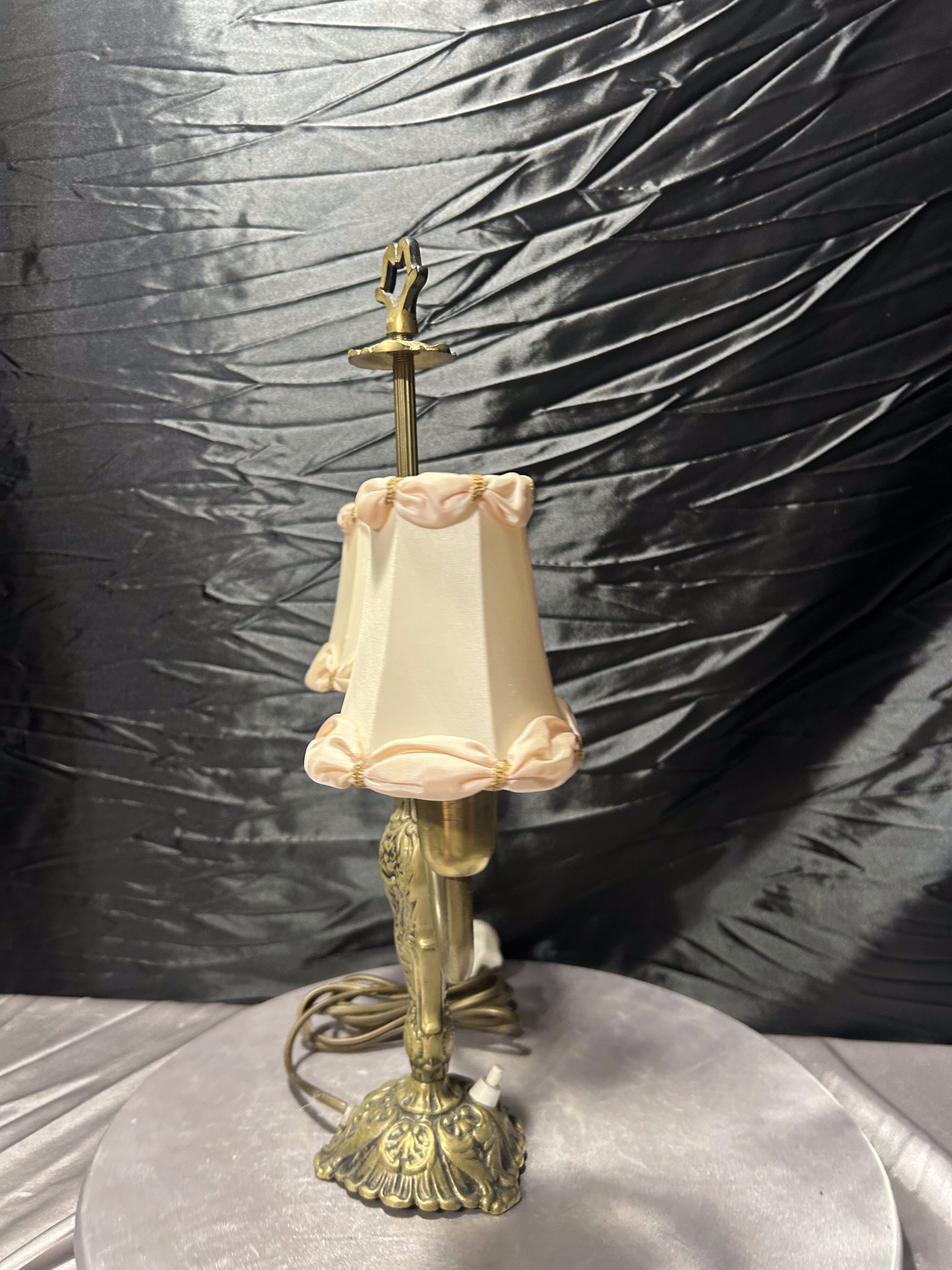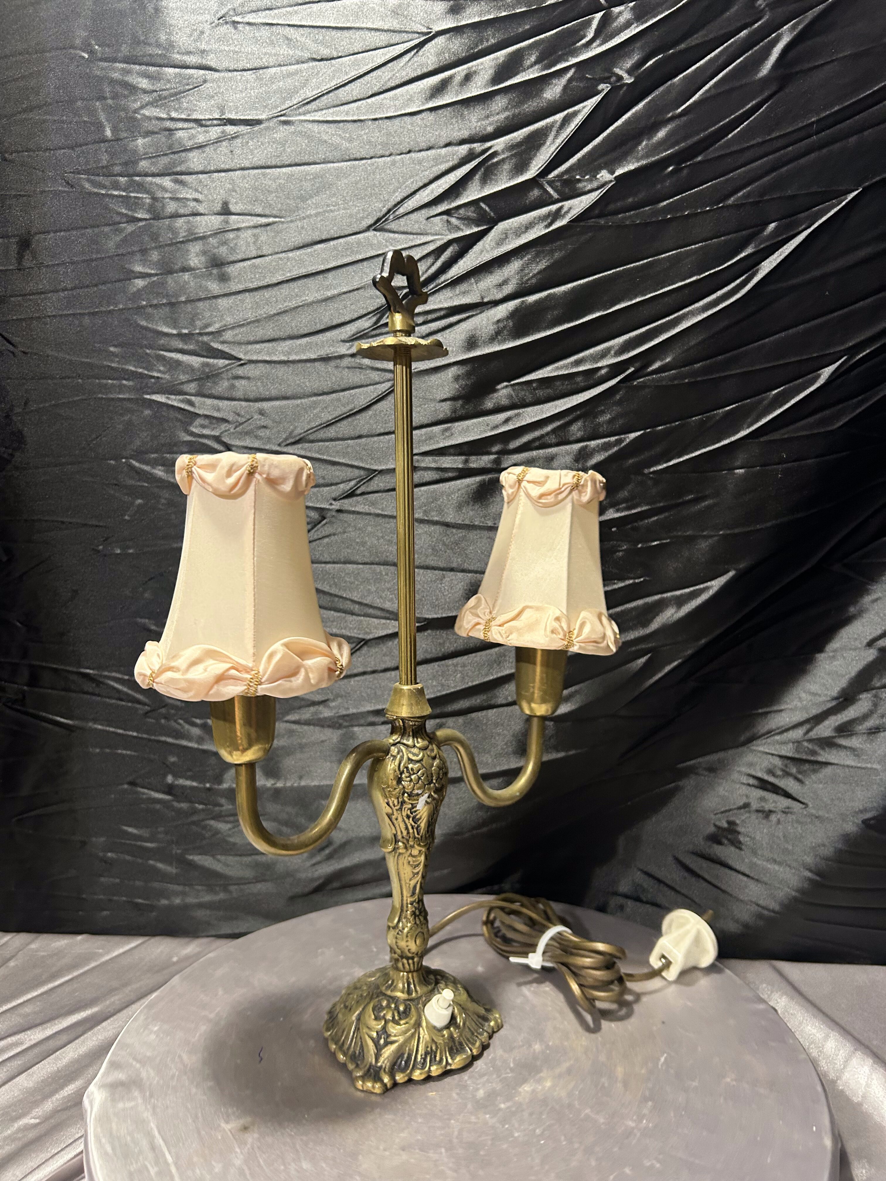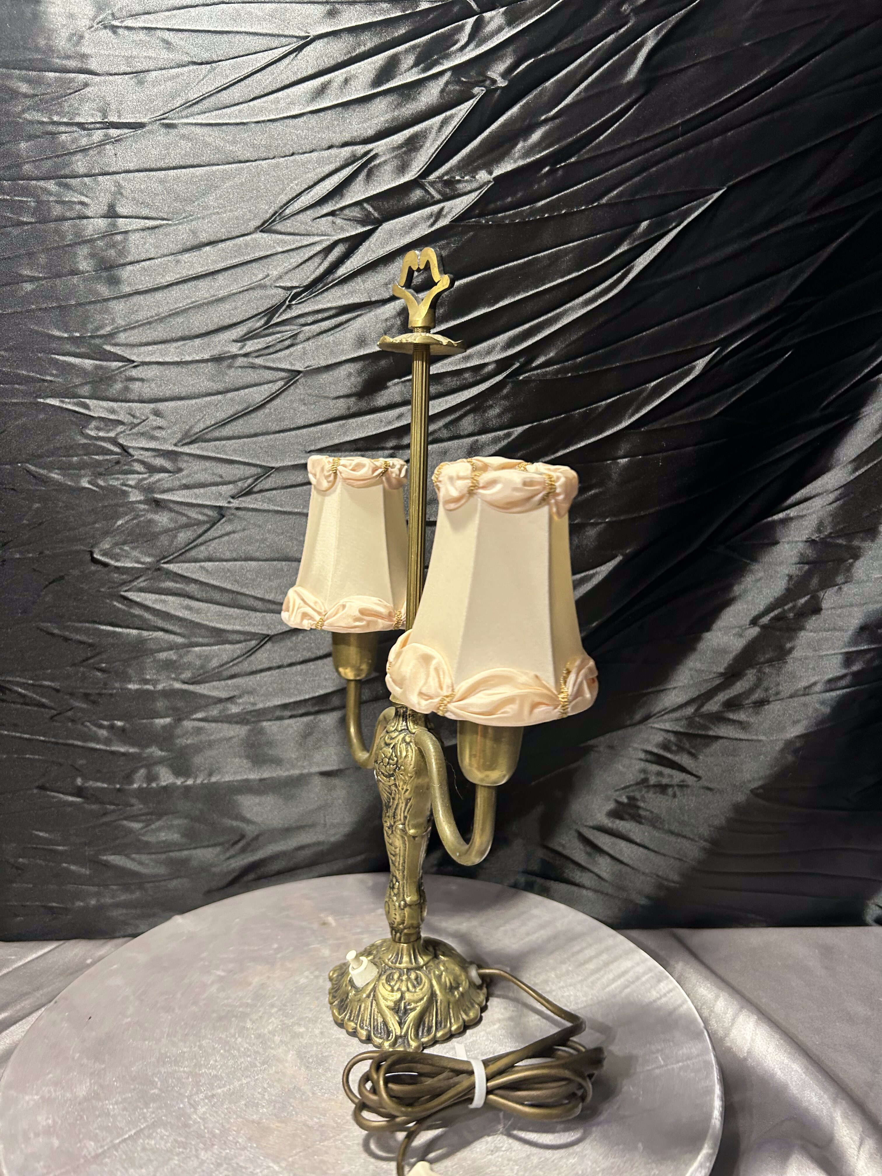 Dekoracyjna lampa wykonana z mosiądzu, o eleganckiej, klasycznej formie. Dwuramienna konstrukcja z miejscem na dwie żarówki, uzupełniona materiałowymi abażurami, nadaje całości lekkości i dekoracyjnego charakteru. Starannie wyprofilowana podstawa oraz ozdobny trzon podkreślają styl inspirowany dawnymi formami oświetlenia.