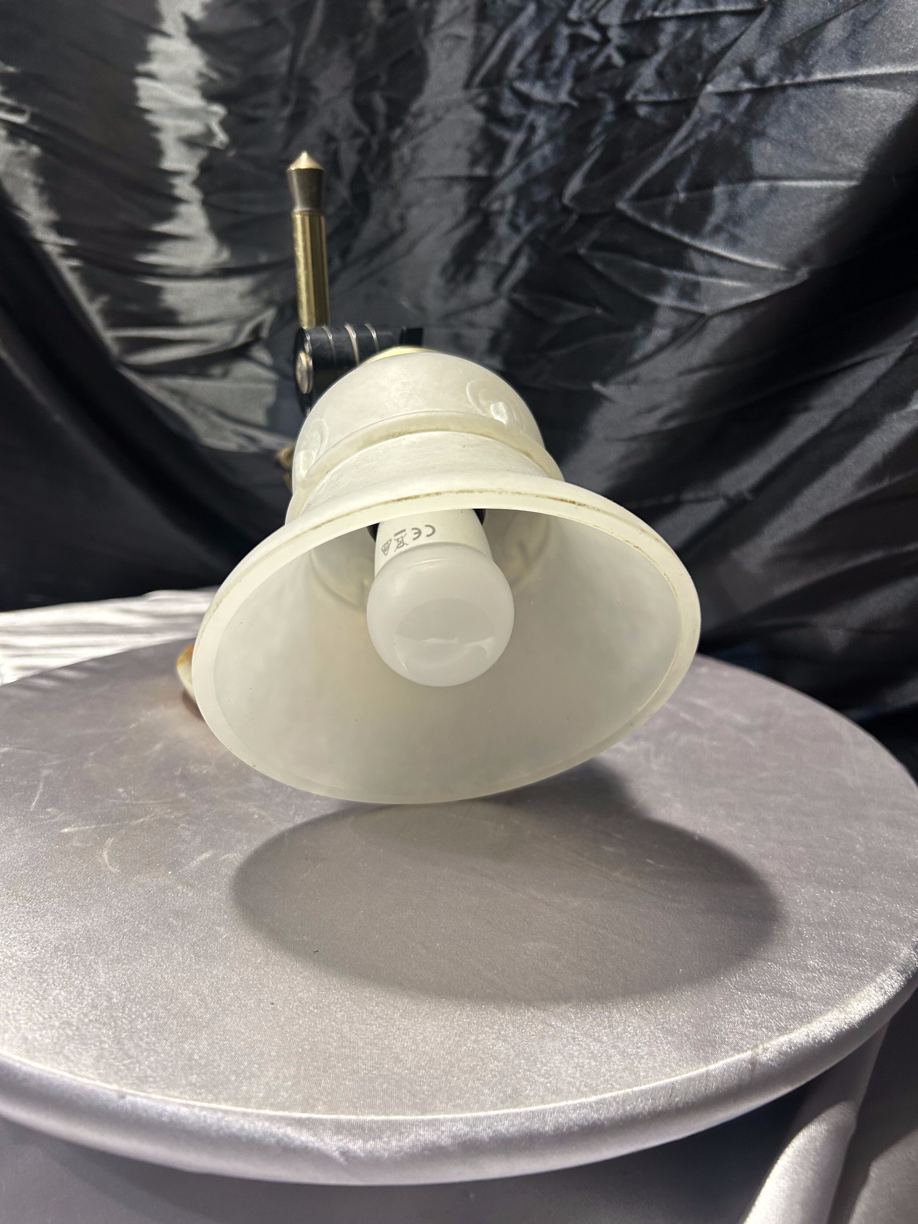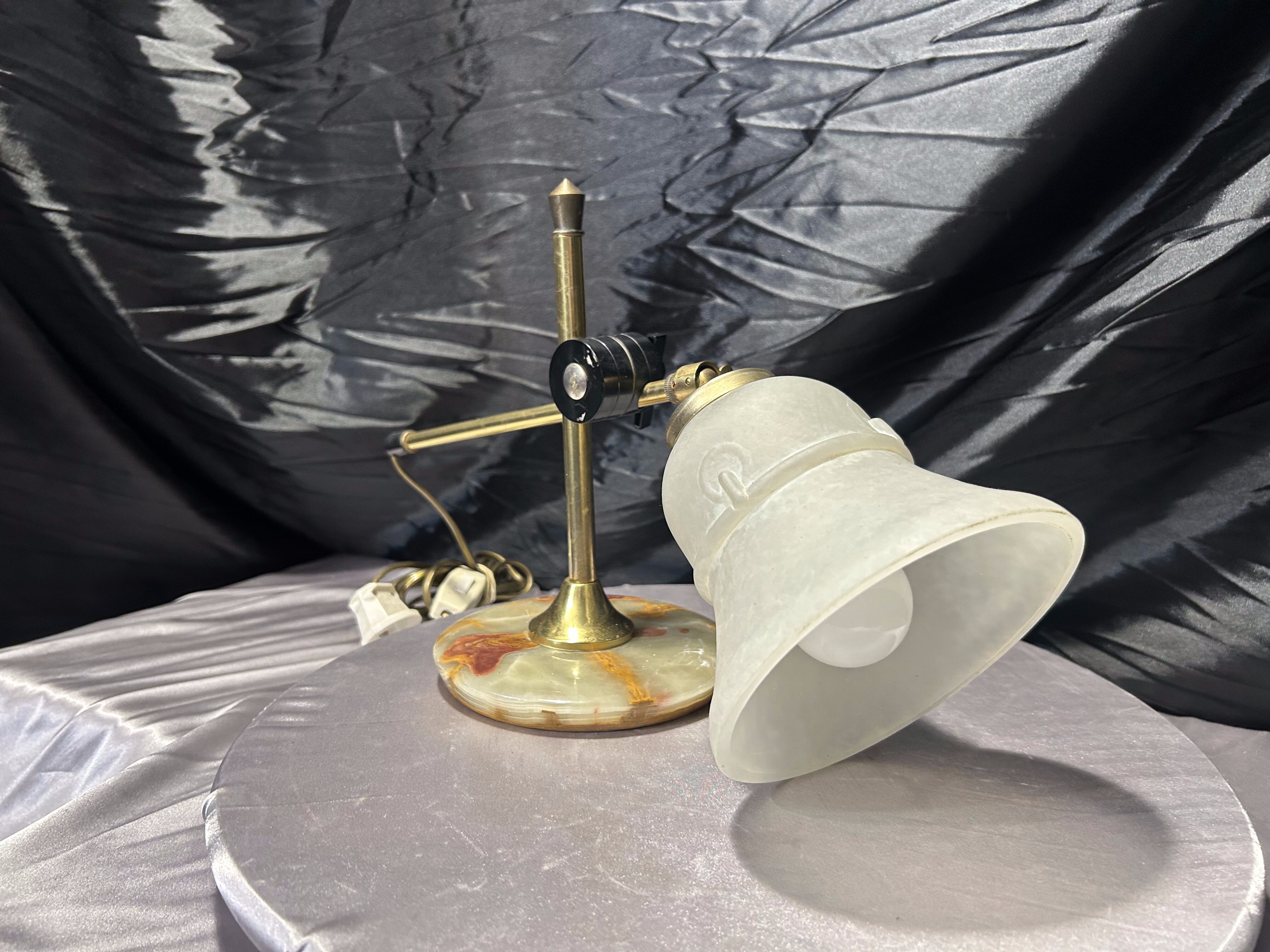 Stylowa lampa wykonana z połączenia naturalnego onyksu oraz mosiężnych elementów, wyposażona w matowy szklany klosz o miękkiej, rozproszonej linii. Konstrukcja pozwala na ustawienie klosza pod kątem, dzięki czemu lampa świetnie sprawdzi się zarówno jako kinkiet ścienny, jak i lampka stojąca na biurko czy stolik.