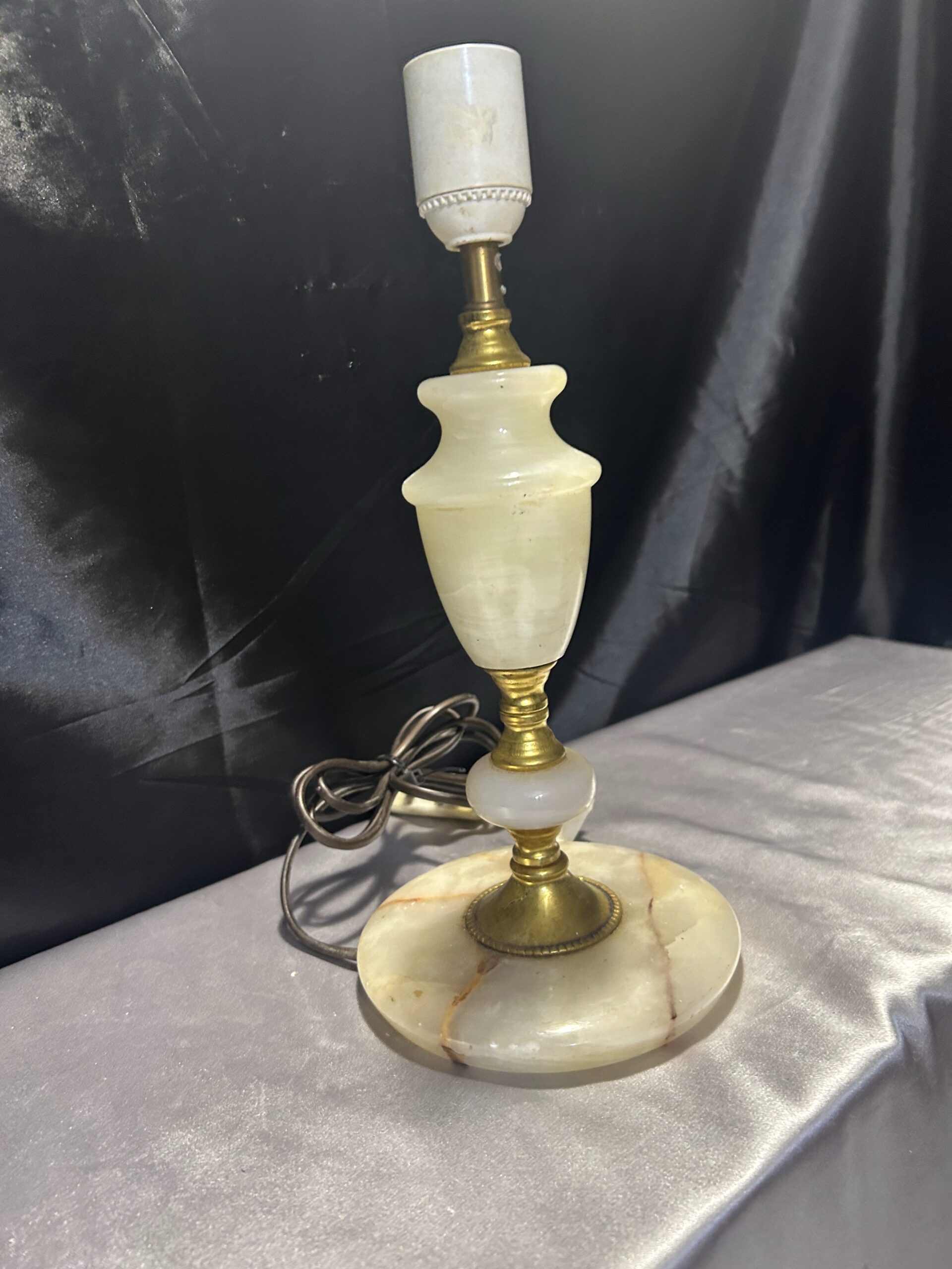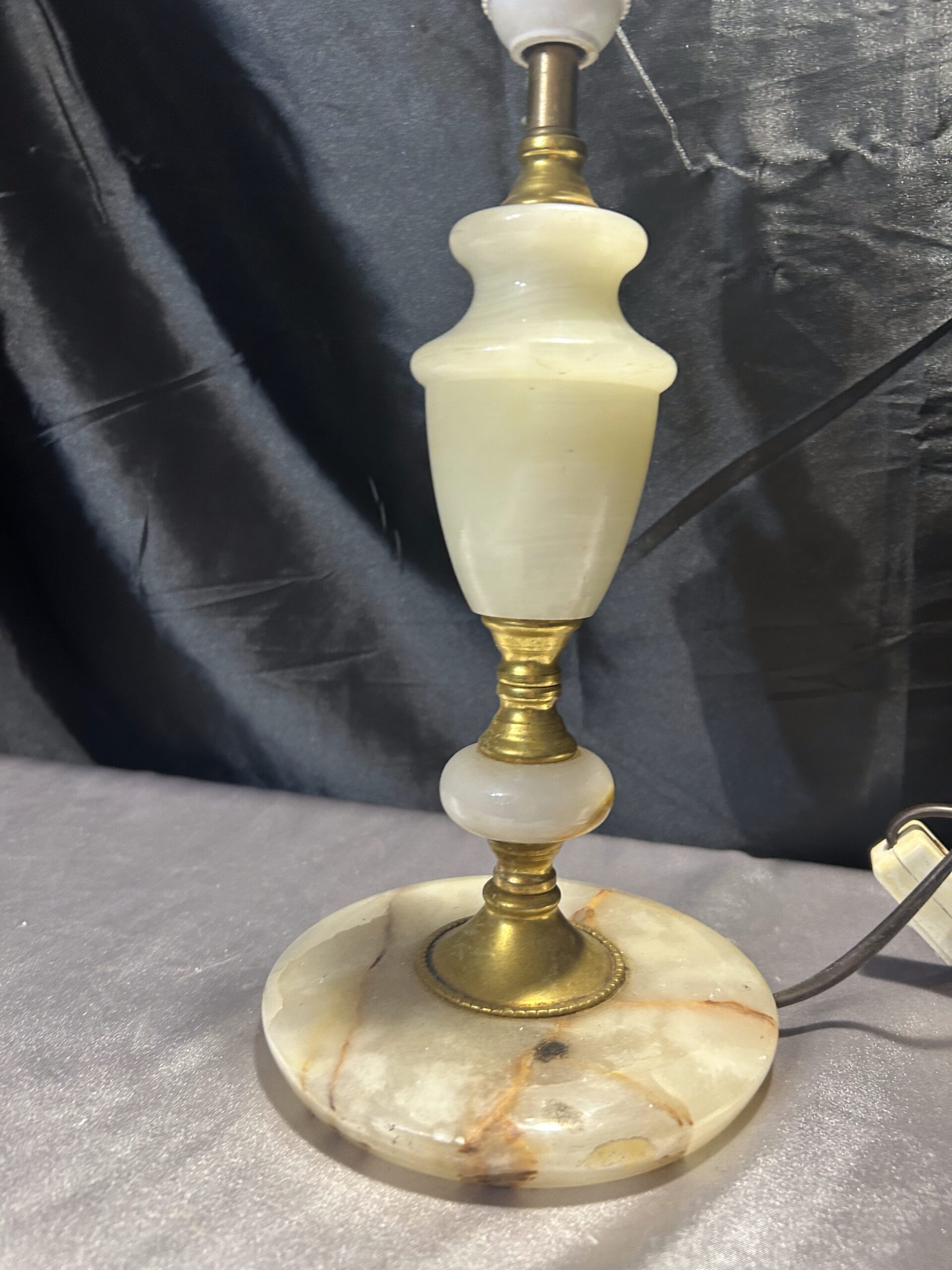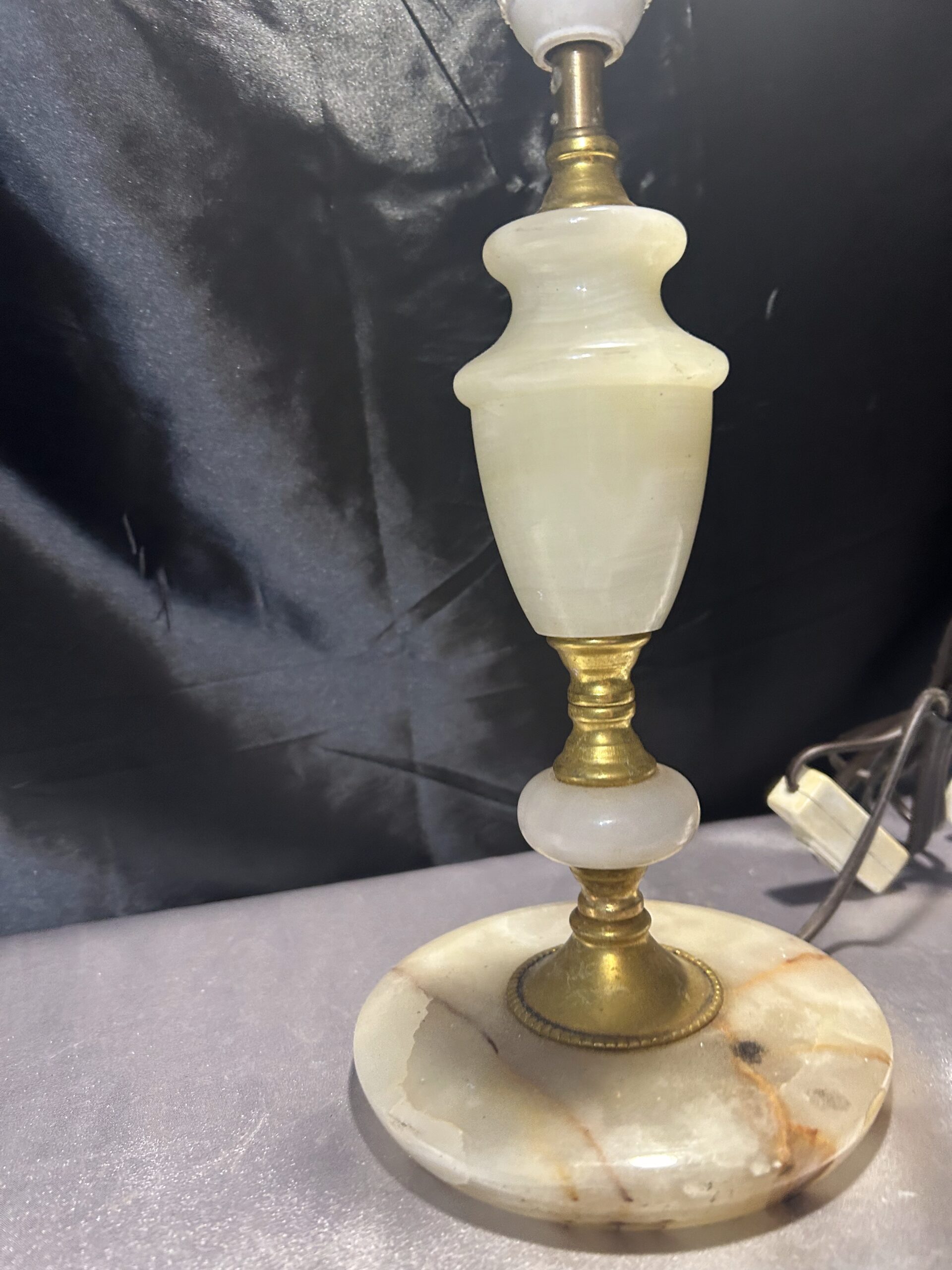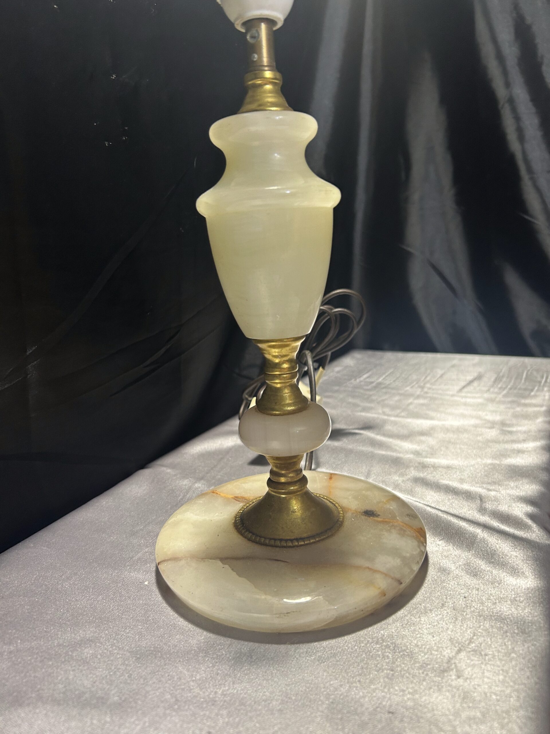 Elegancka lampa stojąca wykonana z onyksu i mosiądzu, z pięknie toczonym wykończeniem. Idealna na komodę, szafkę nocną lub parapet, stanowi stylowy i funkcjonalny element dekoracyjny. Wyposażona w włącznik na kablu, co zapewnia wygodę użytkowania.