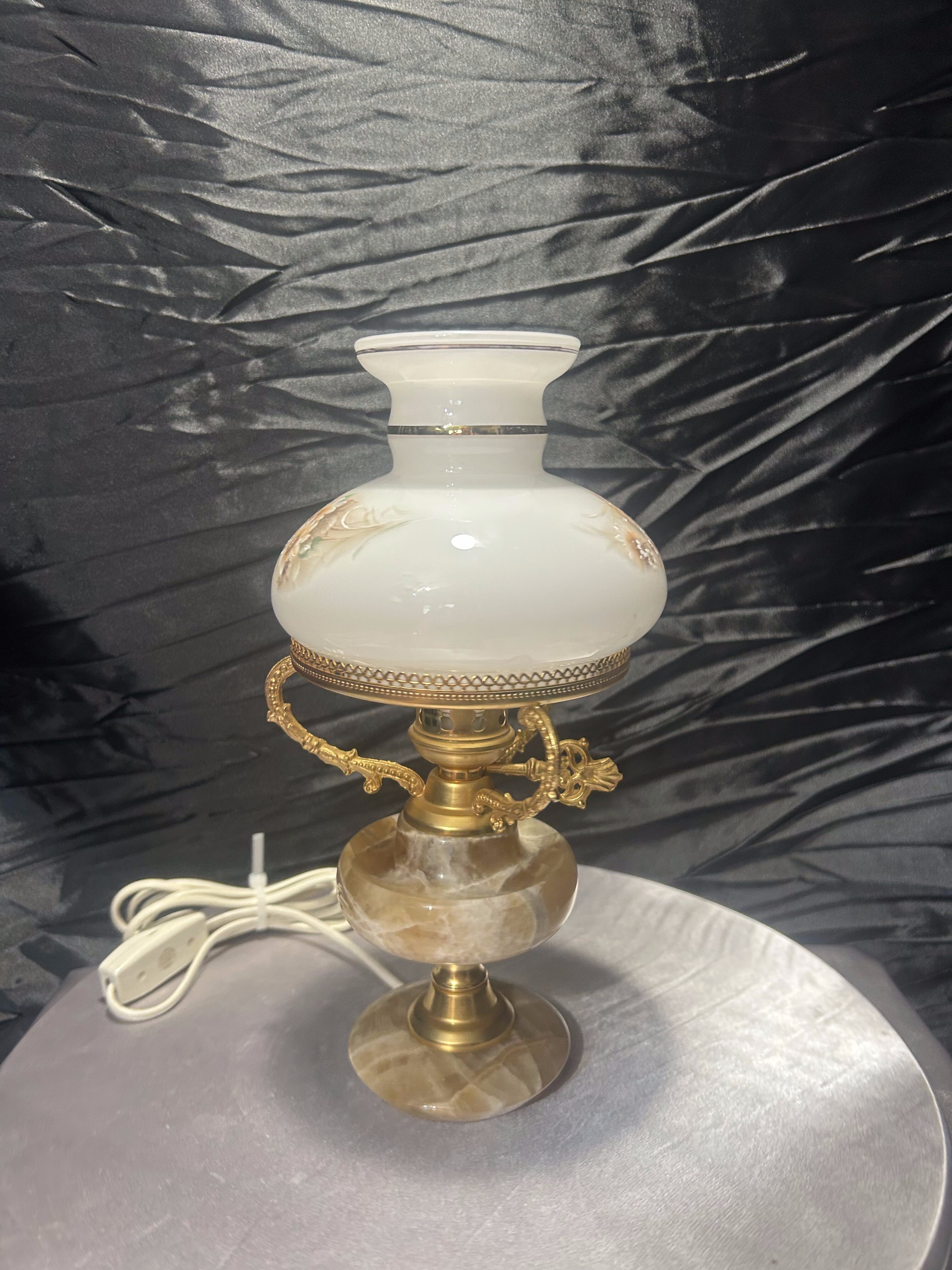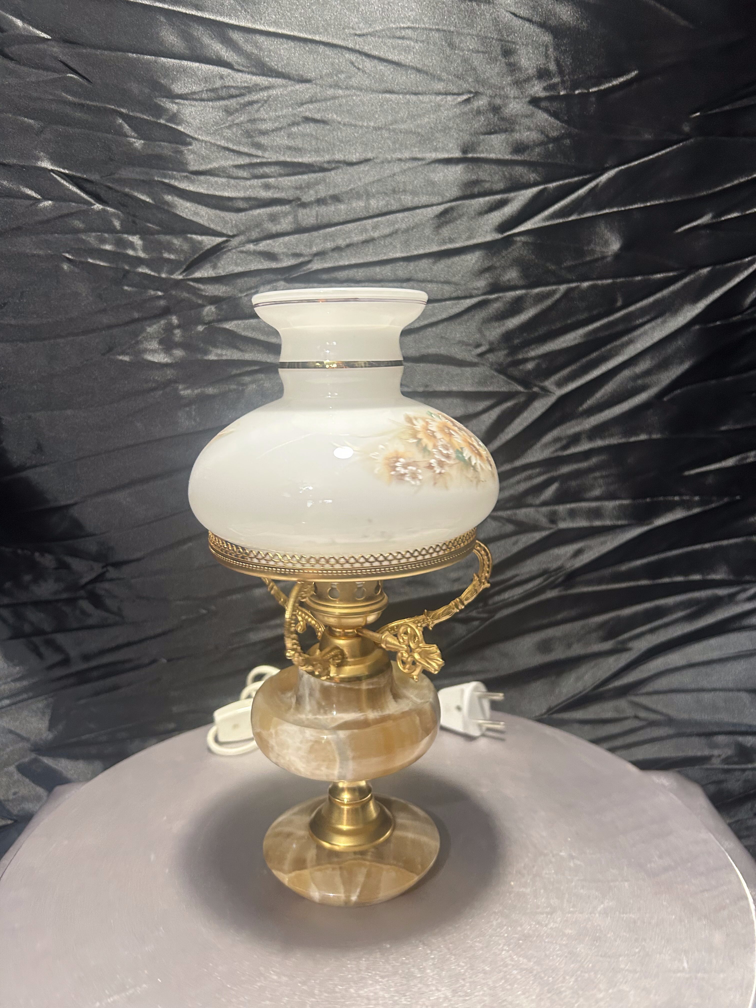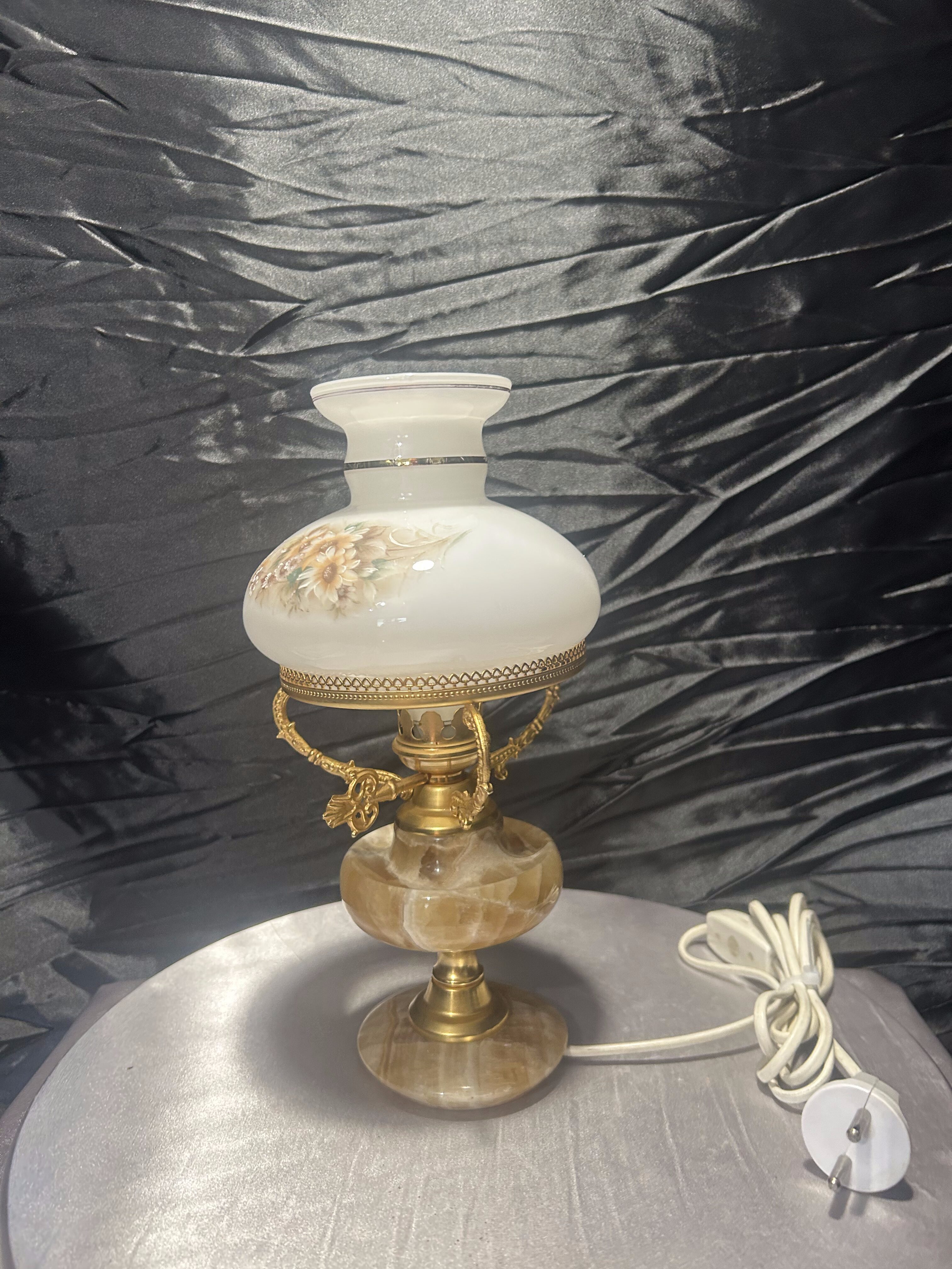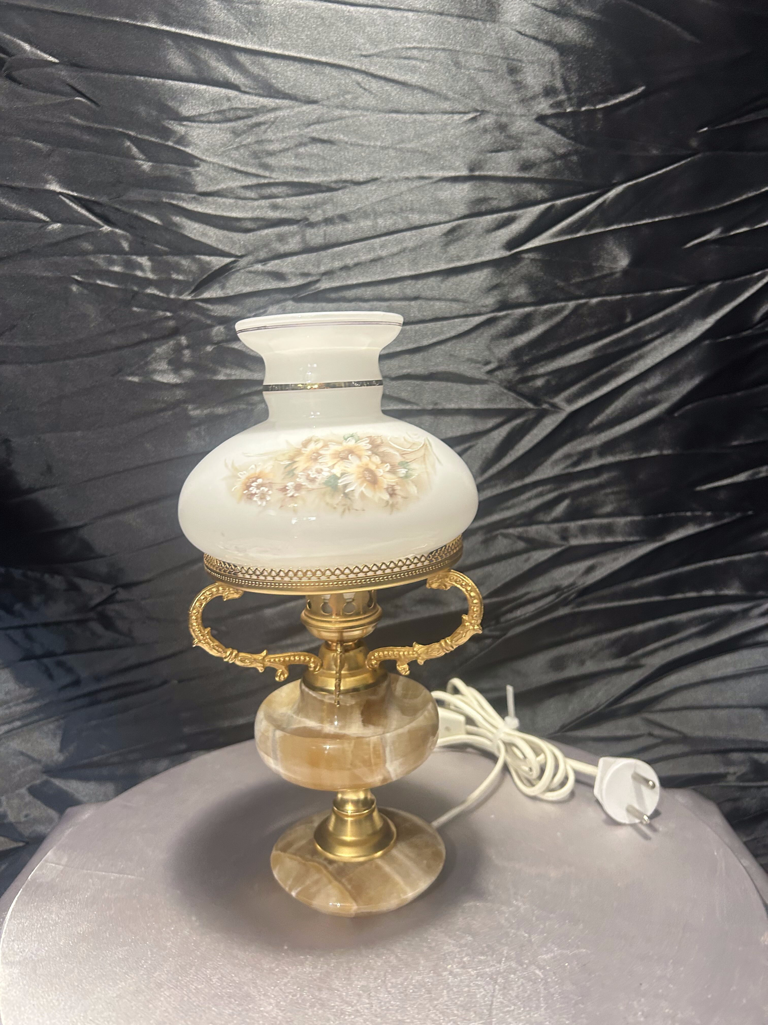 Lampa z onyksu i mosiądzu z malowanym kloszem – styl retro – 29,5 cm
