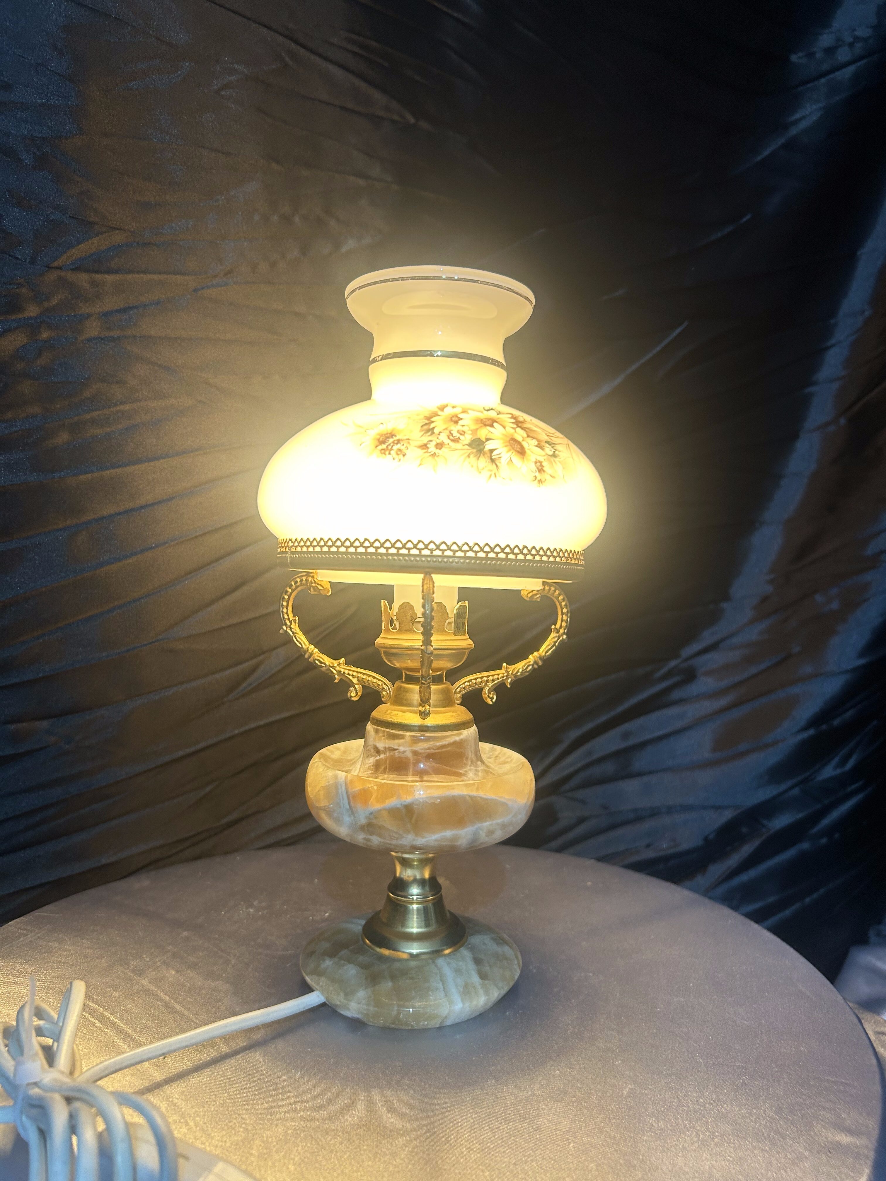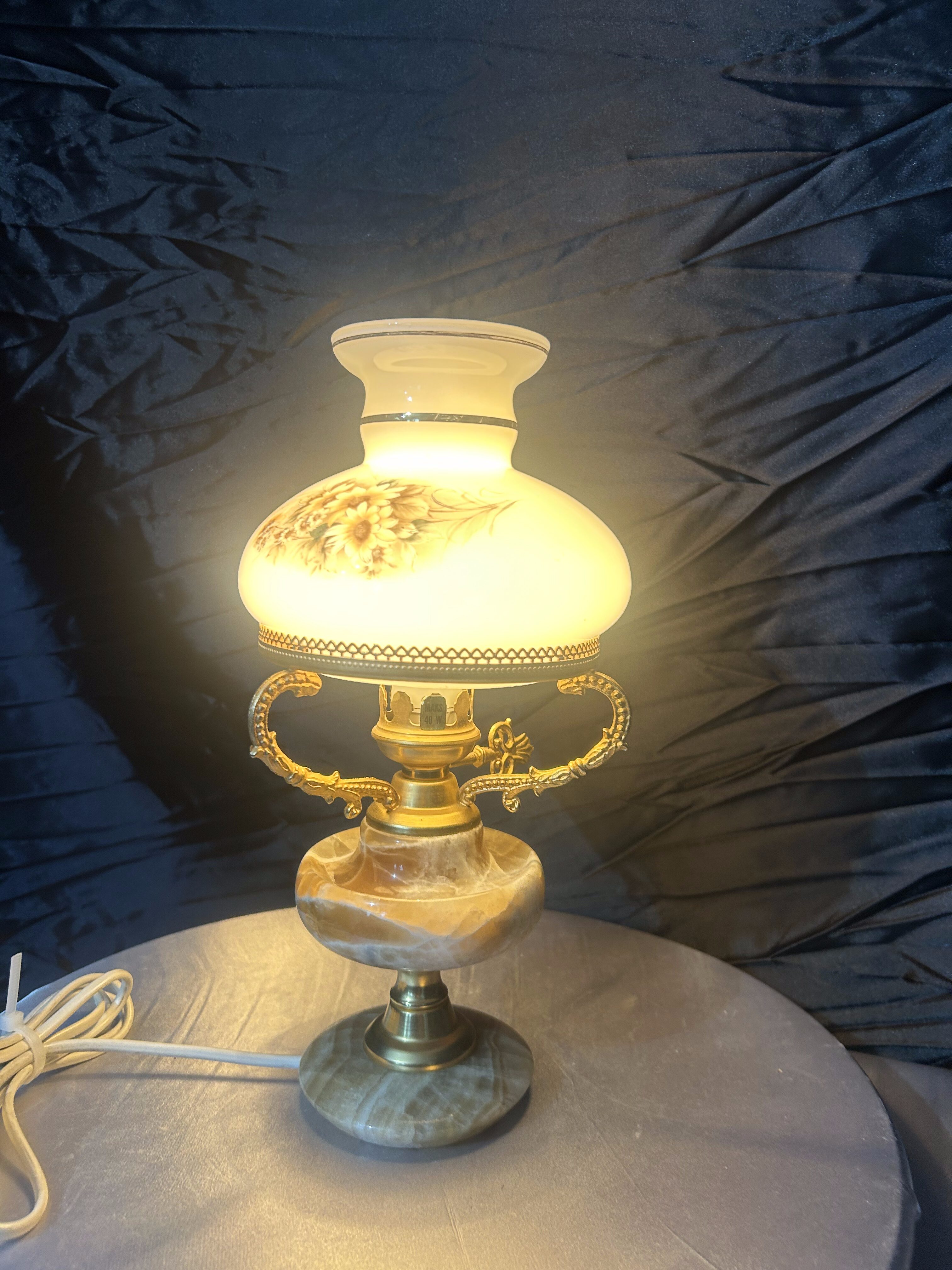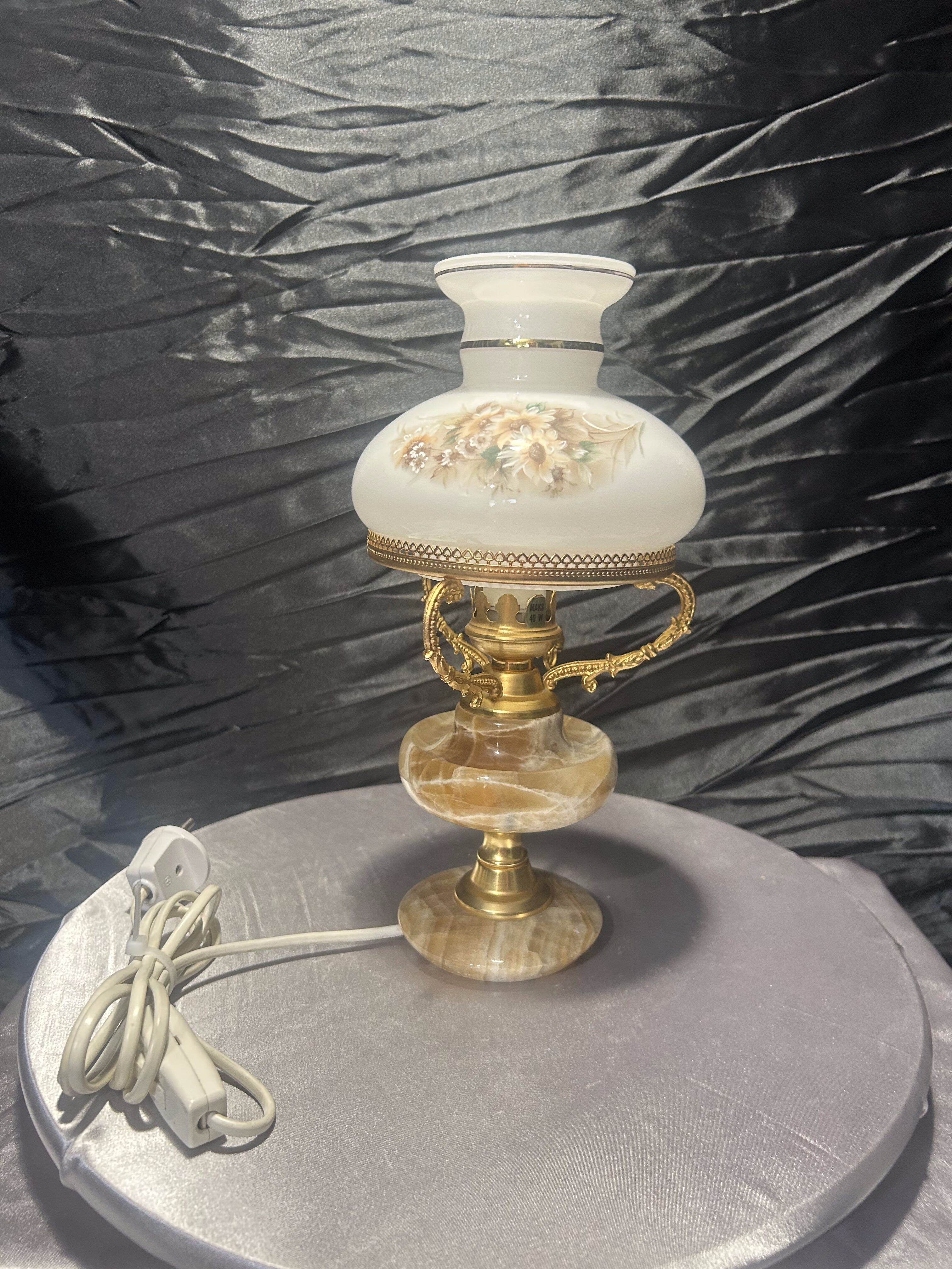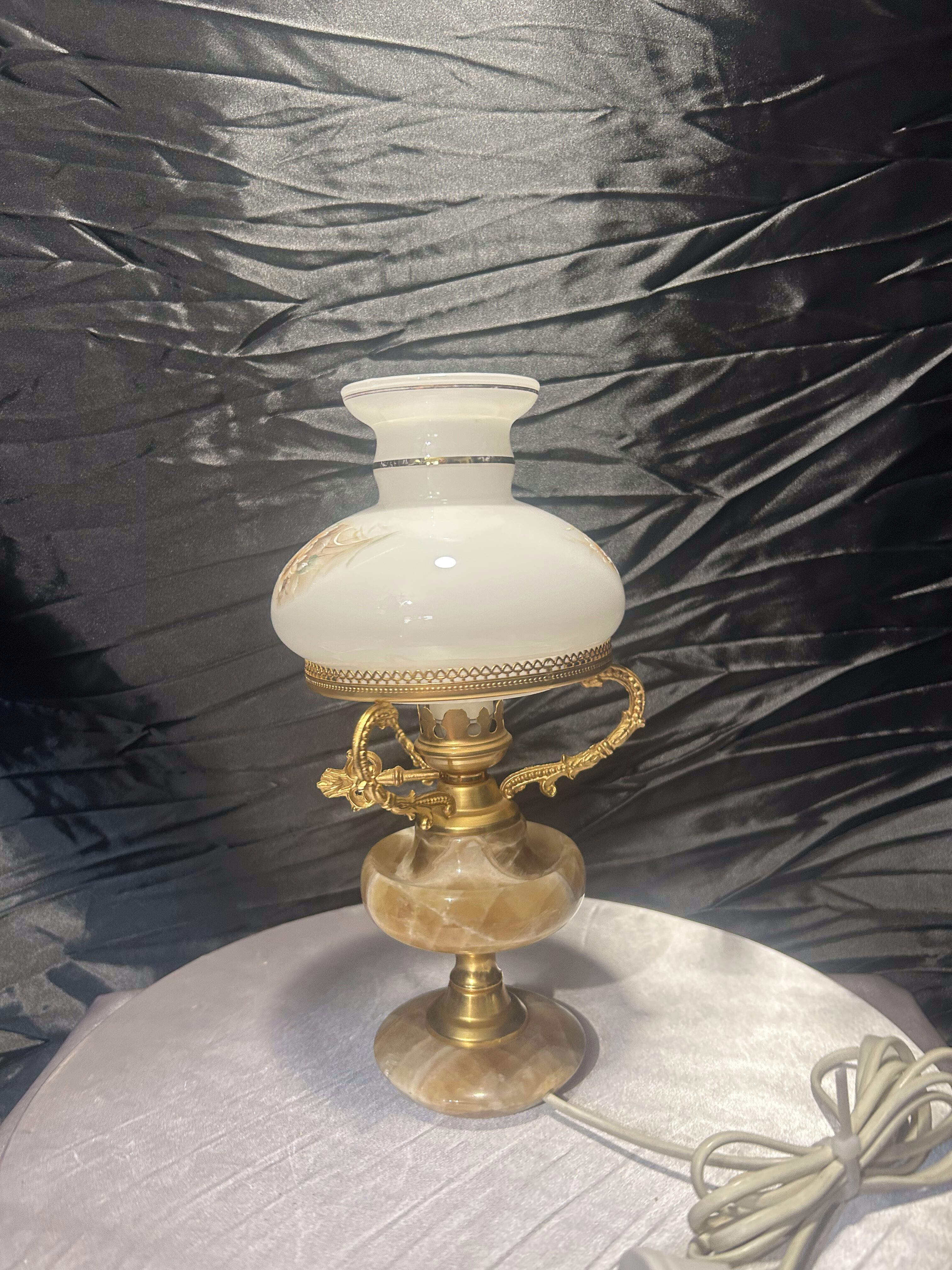 Lampa z onyksu i mosiądzu z malowanym kloszem – styl retro – 29,5 cm