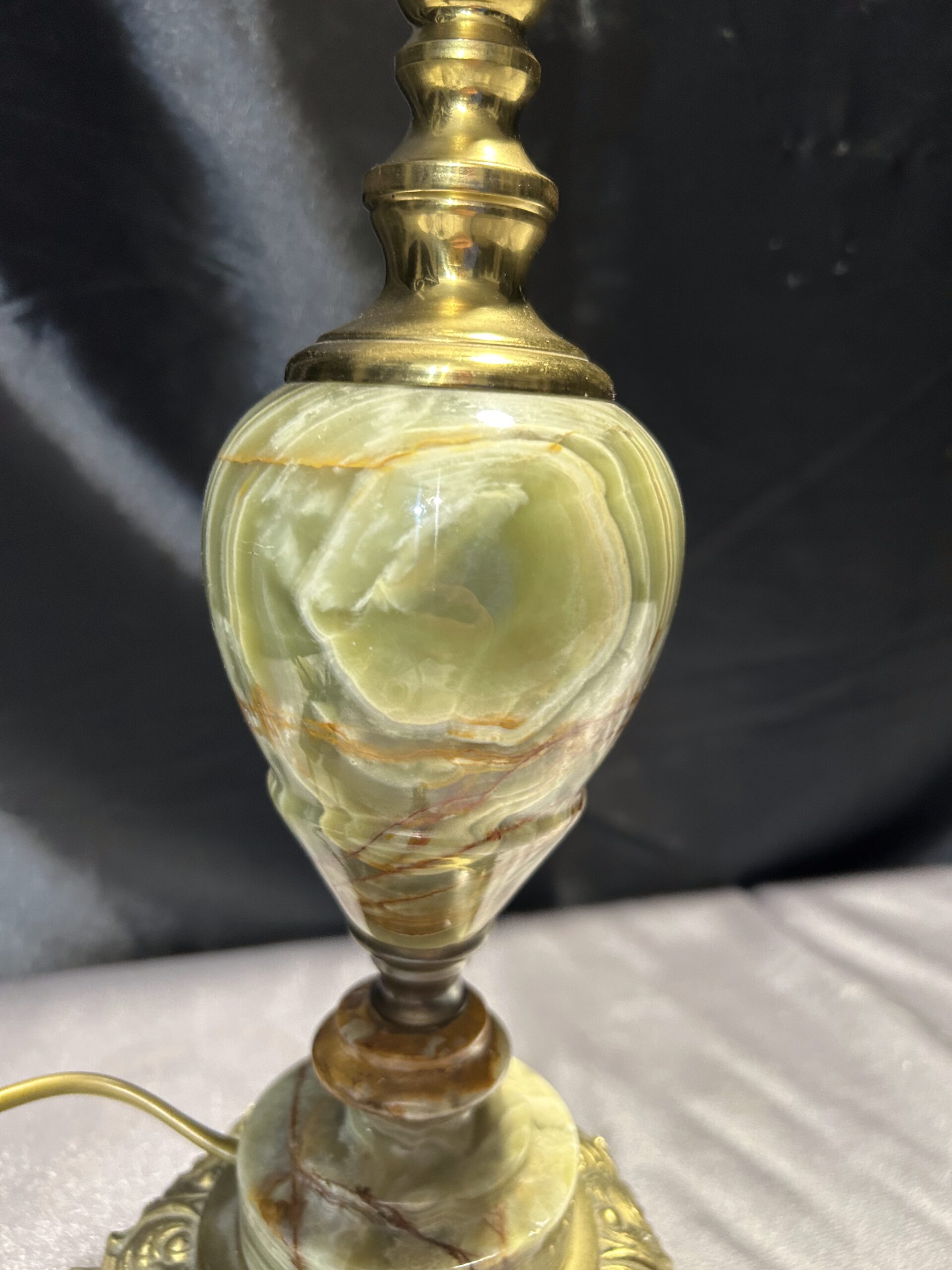 Piękna lampa wykonana z onyksu w wyjątkowych, zielonkawych odcieniach, w połączeniu z mosiądzem. Zdobiona detale, takie jak lwie nogi, oraz toczony wzór nadają jej wyjątkowego charakteru. Idealna na komodę, szafkę nocną lub parapet, wprowadzając elegancję i oryginalność do wnętrza.