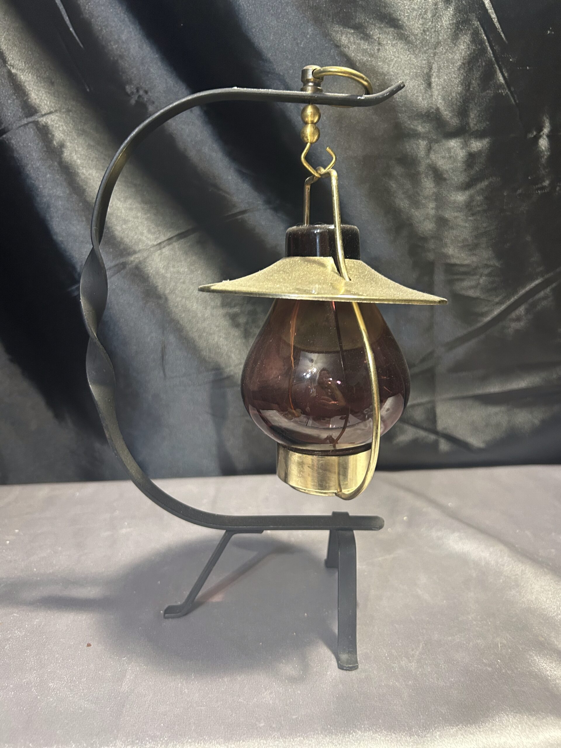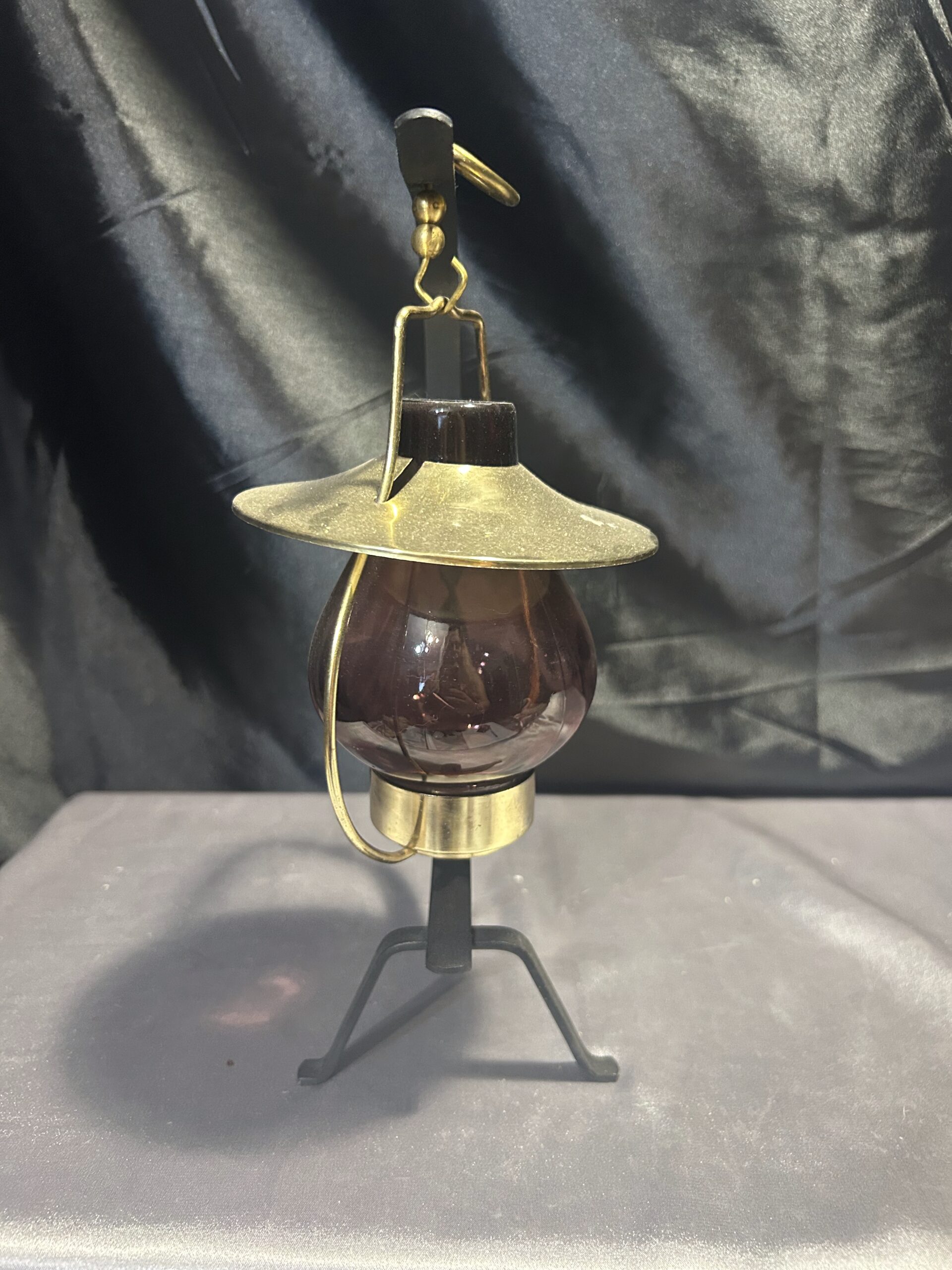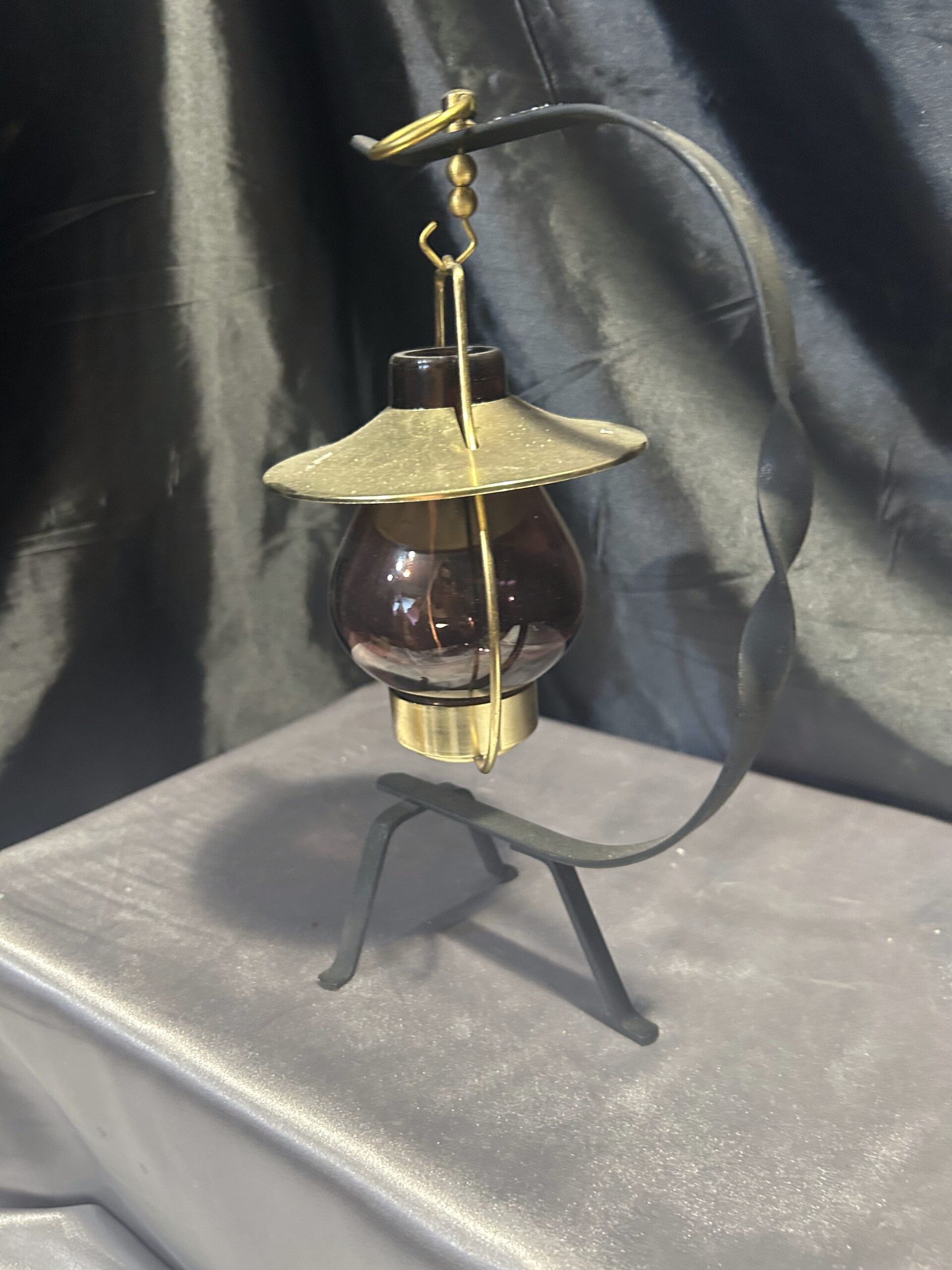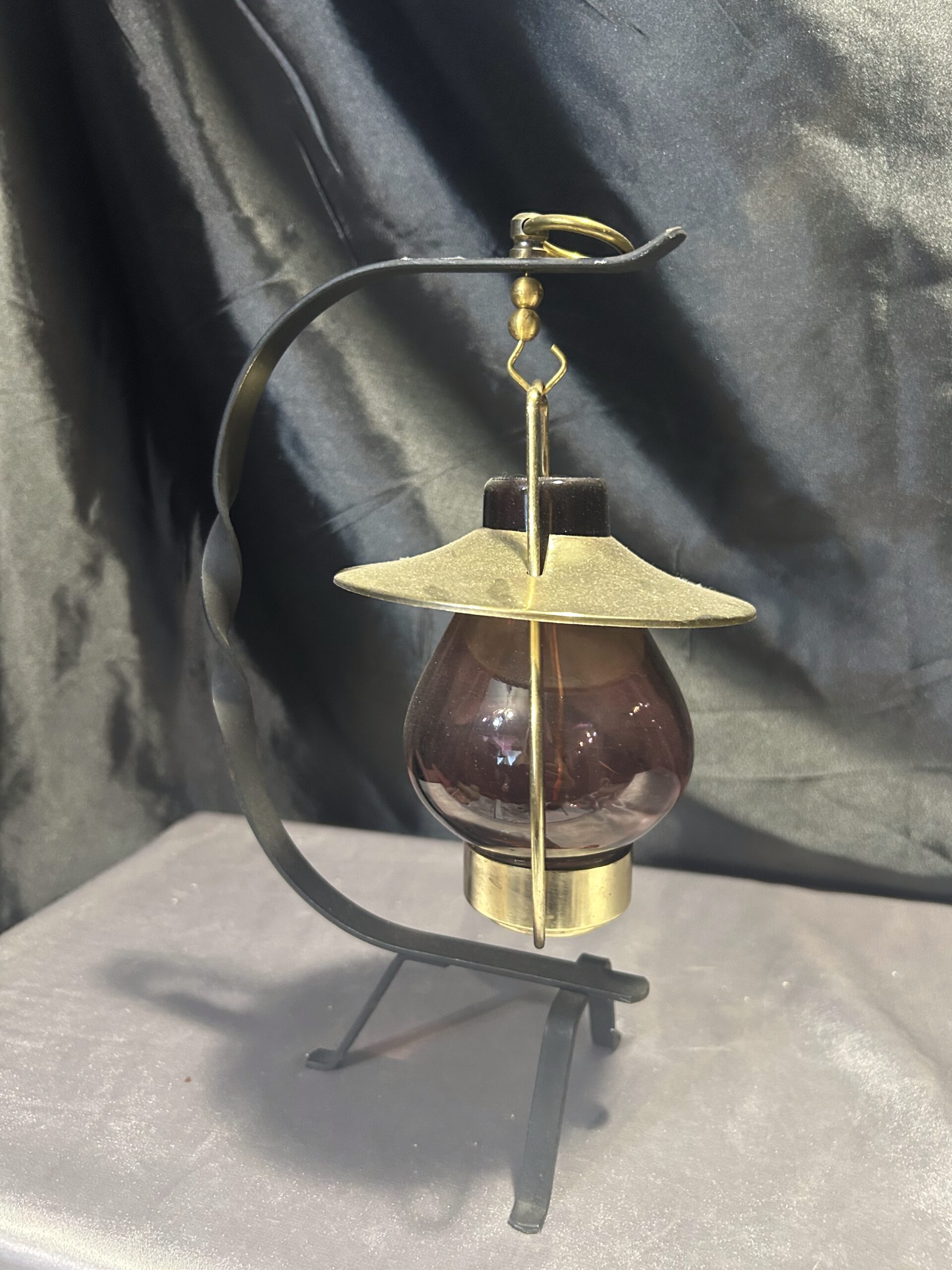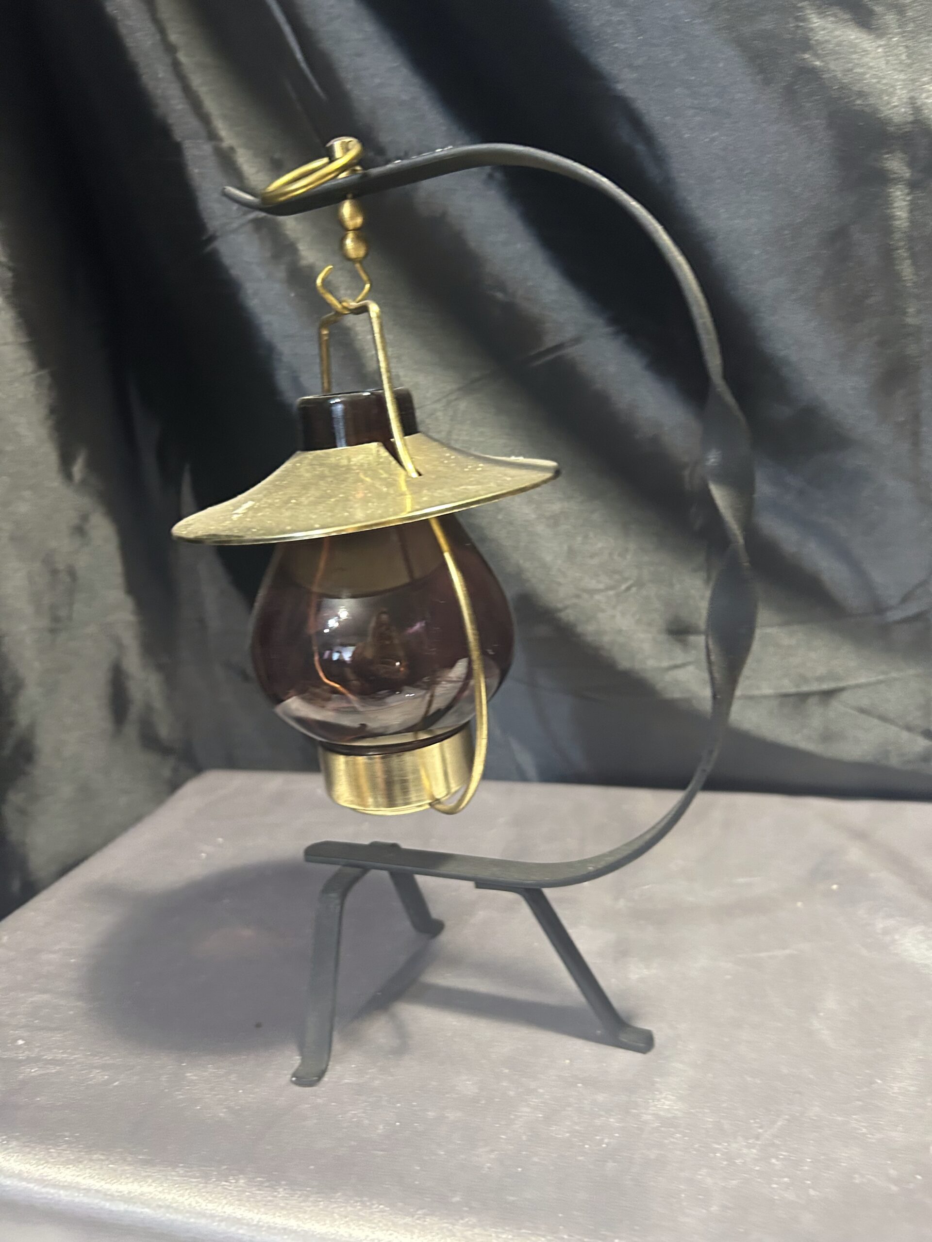 Stylowy lampion na tealight, idealny do stworzenia przytulnego nastroju w domu lub ogrodzie. Wisząca szklana bańka w ciemno-brązowo-fioletowym odcieniu osadzona na metalowym stojaku z dekoracyjnymi akcentami. Złota podstawa i kapelusz dodają mu elegancji, a kółeczko umożliwia wygodne powieszenie lampionu.