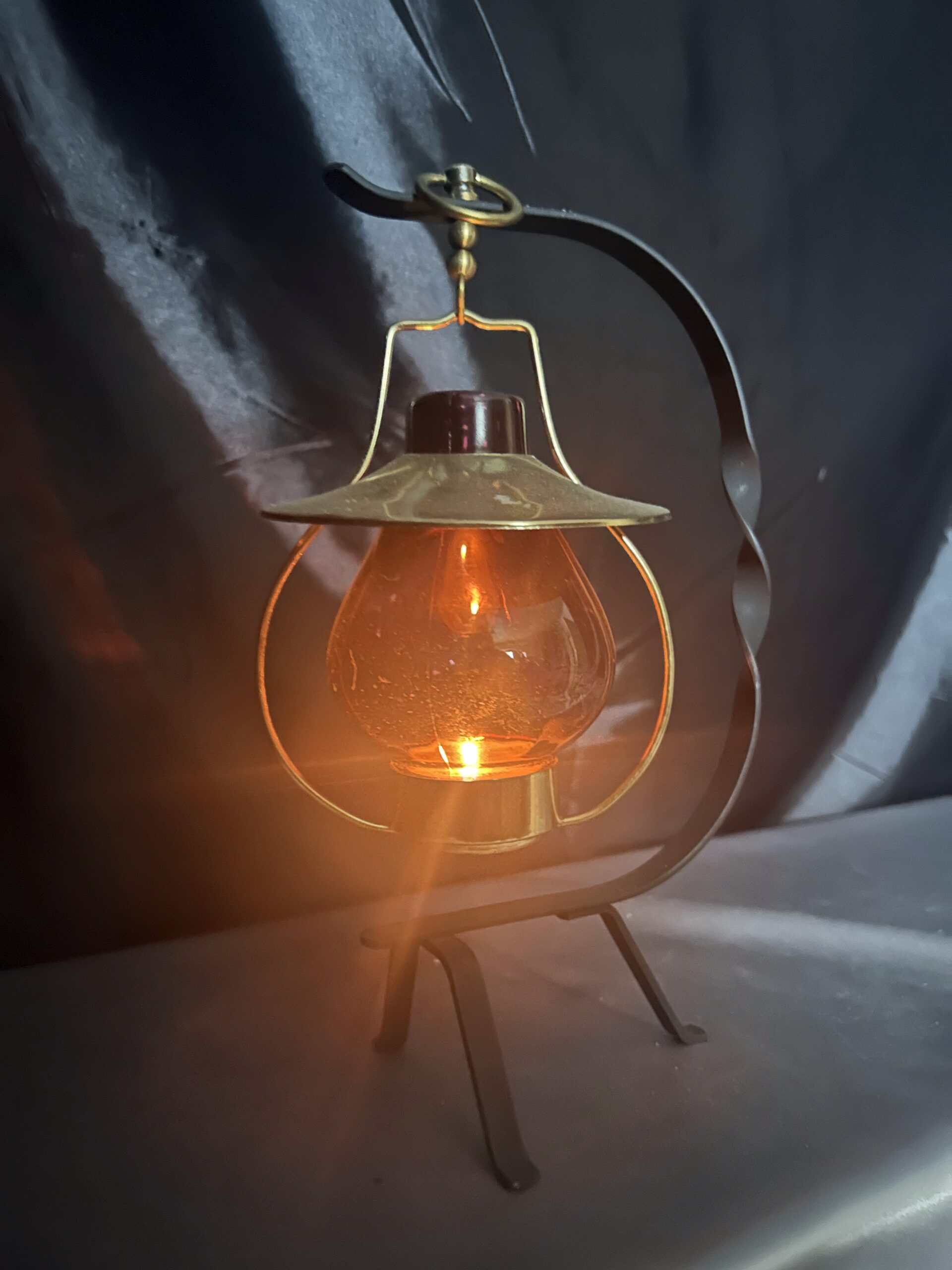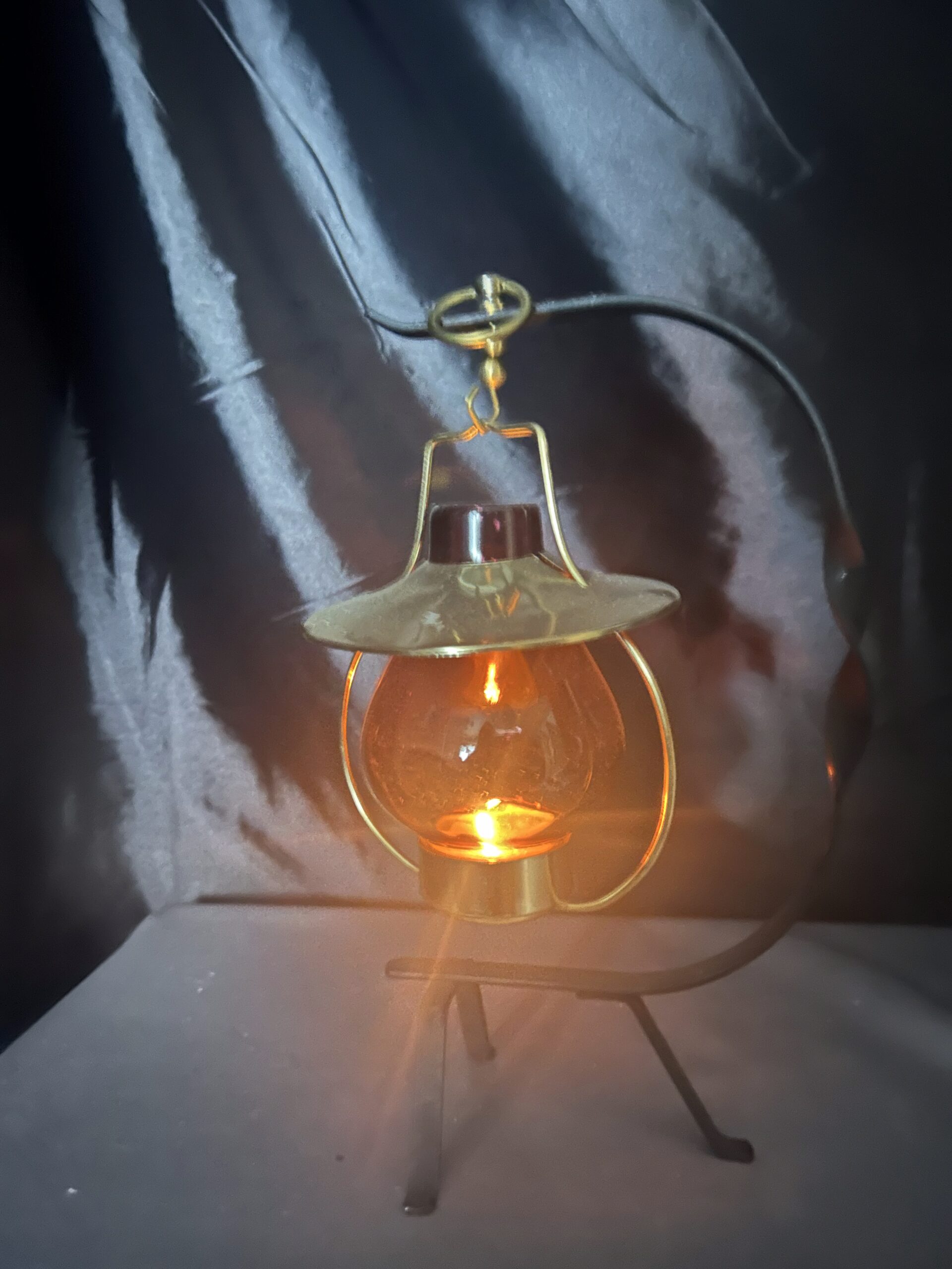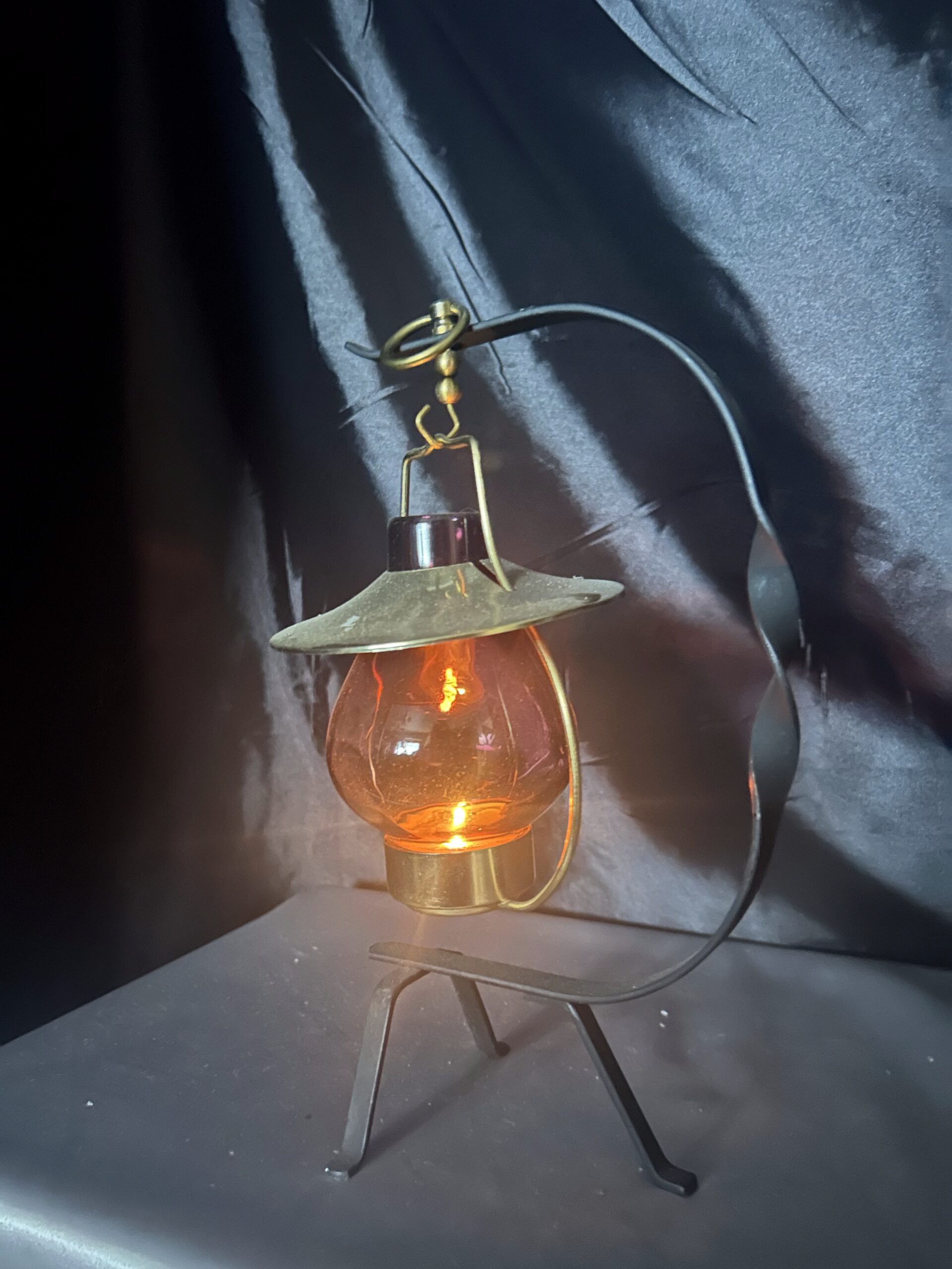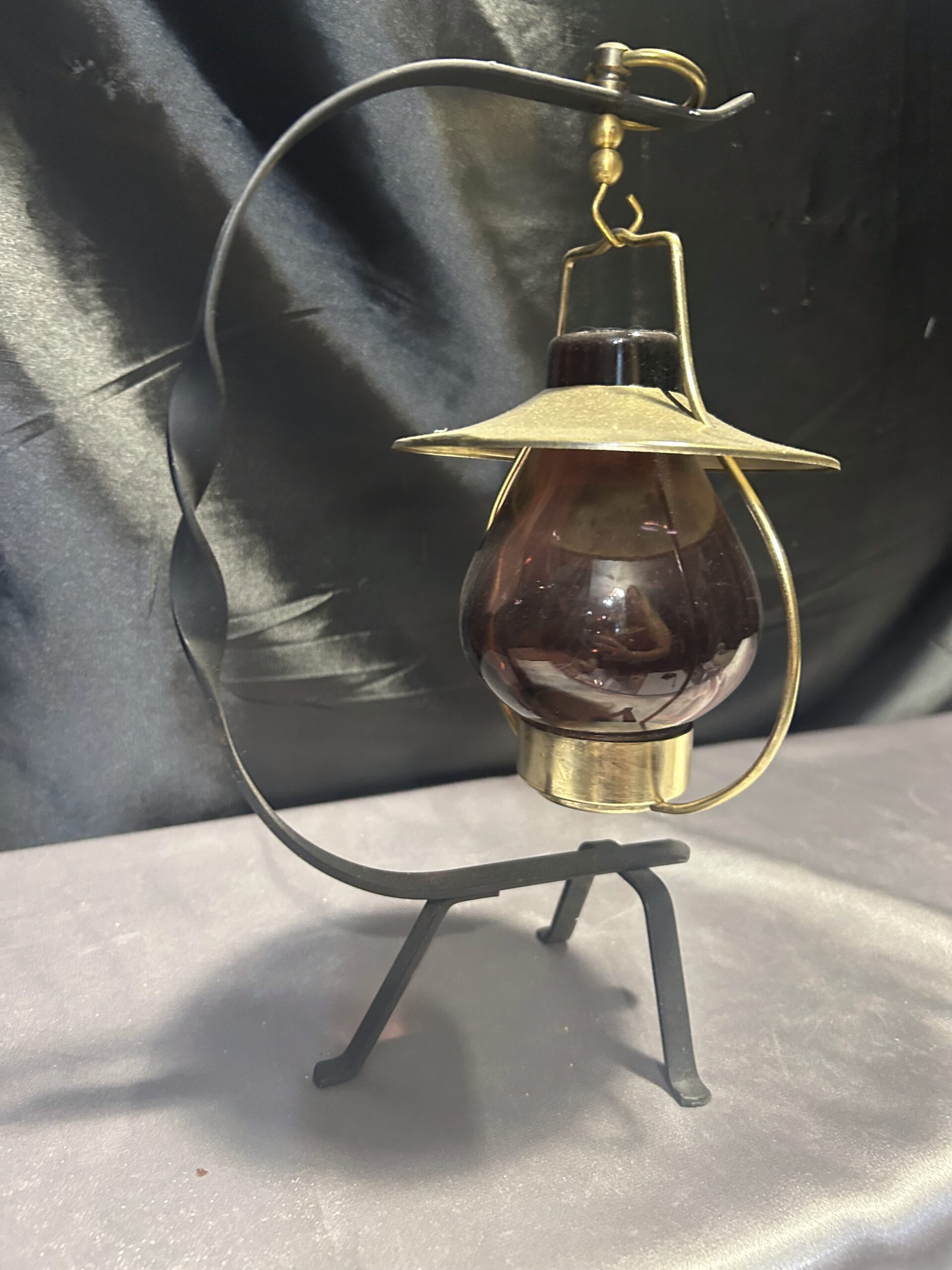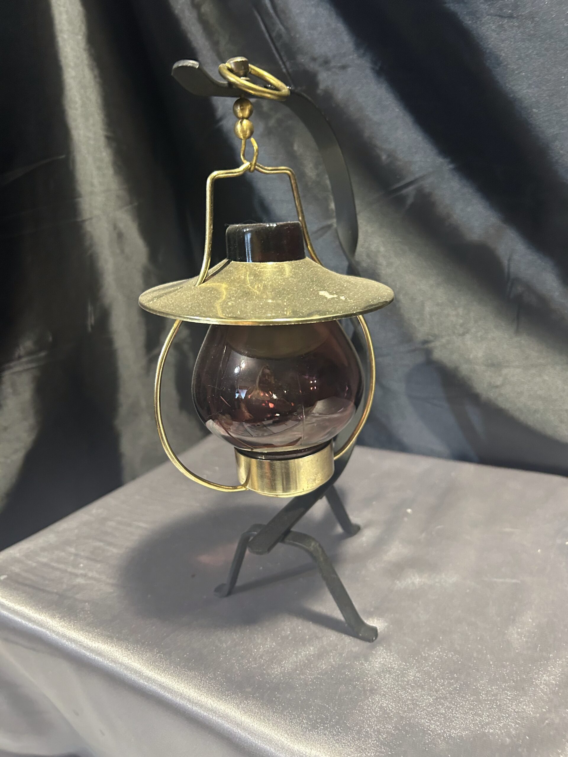Stylowy lampion na tealight, idealny do stworzenia przytulnego nastroju w domu lub ogrodzie. Wisząca szklana bańka w ciemno-brązowo-fioletowym odcieniu osadzona na metalowym stojaku z dekoracyjnymi akcentami. Złota podstawa i kapelusz dodają mu elegancji, a kółeczko umożliwia wygodne powieszenie lampionu.