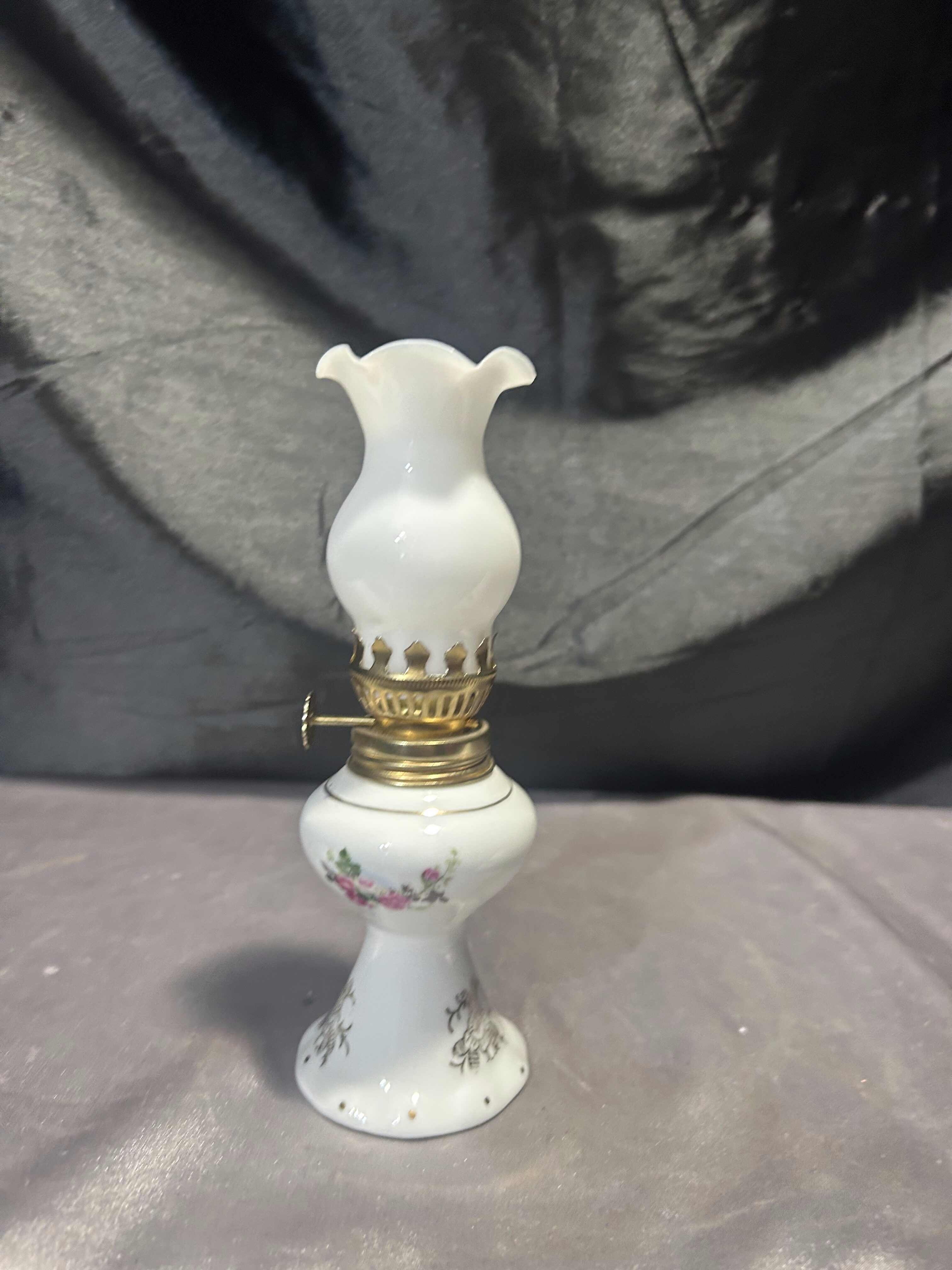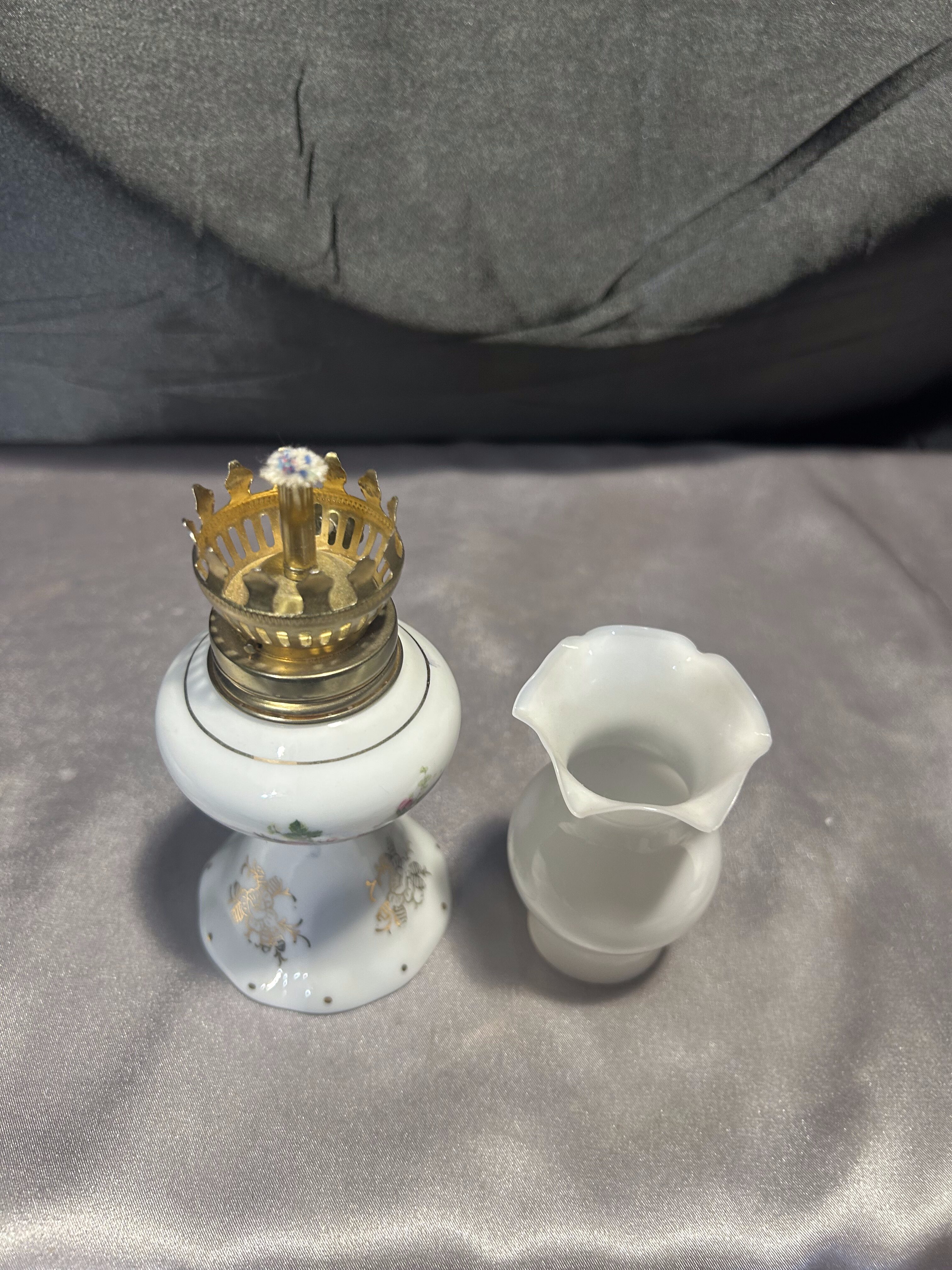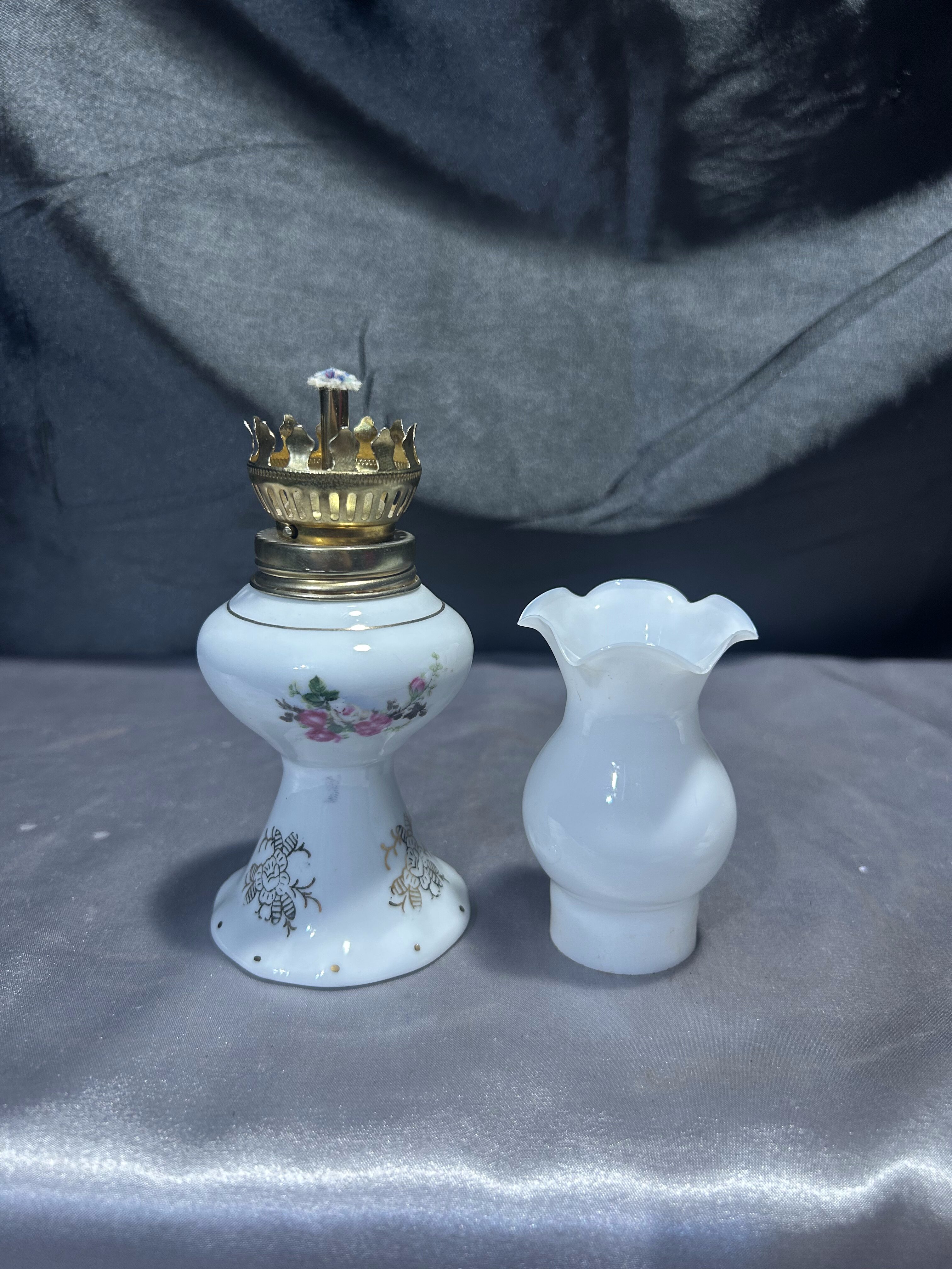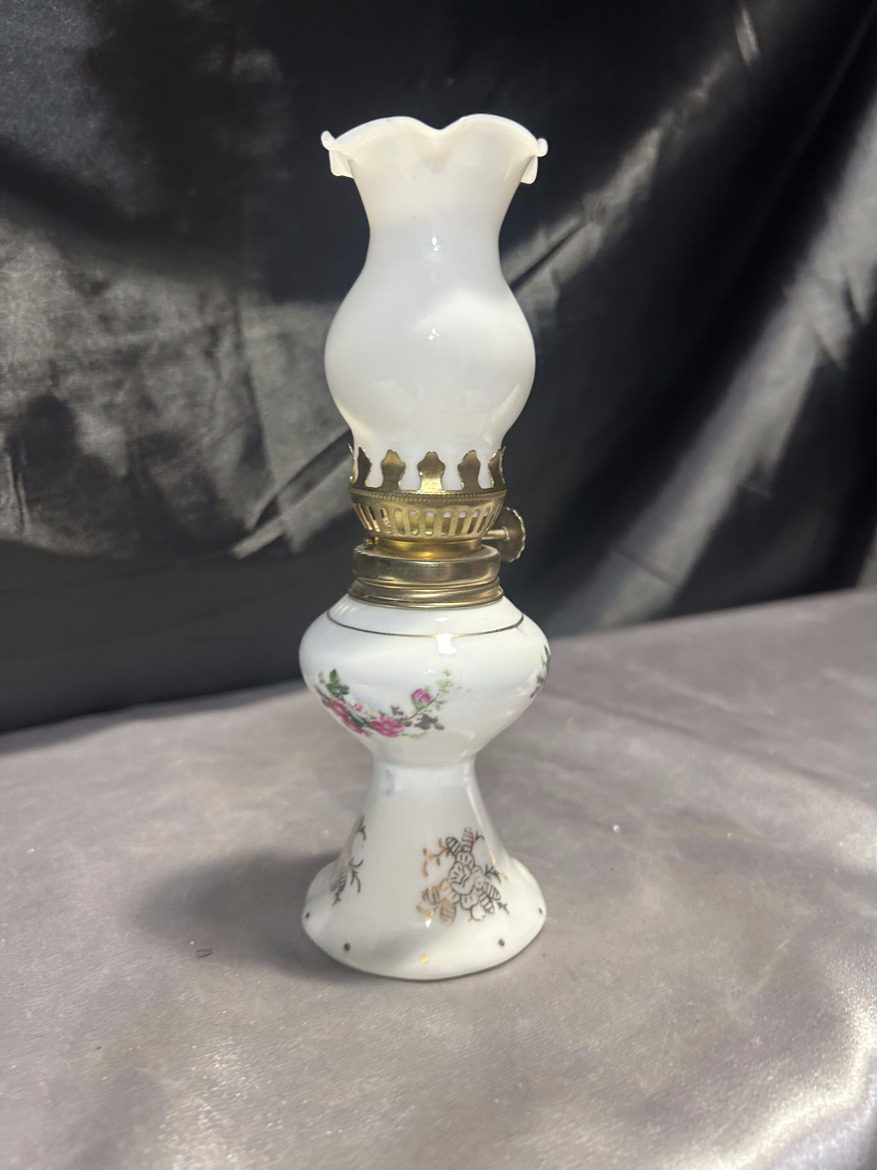 Lampka Naftowa – Biała z Różowymi Kwiatami i Złotymi Zdobieniami – Szklany Komin z Falbanką