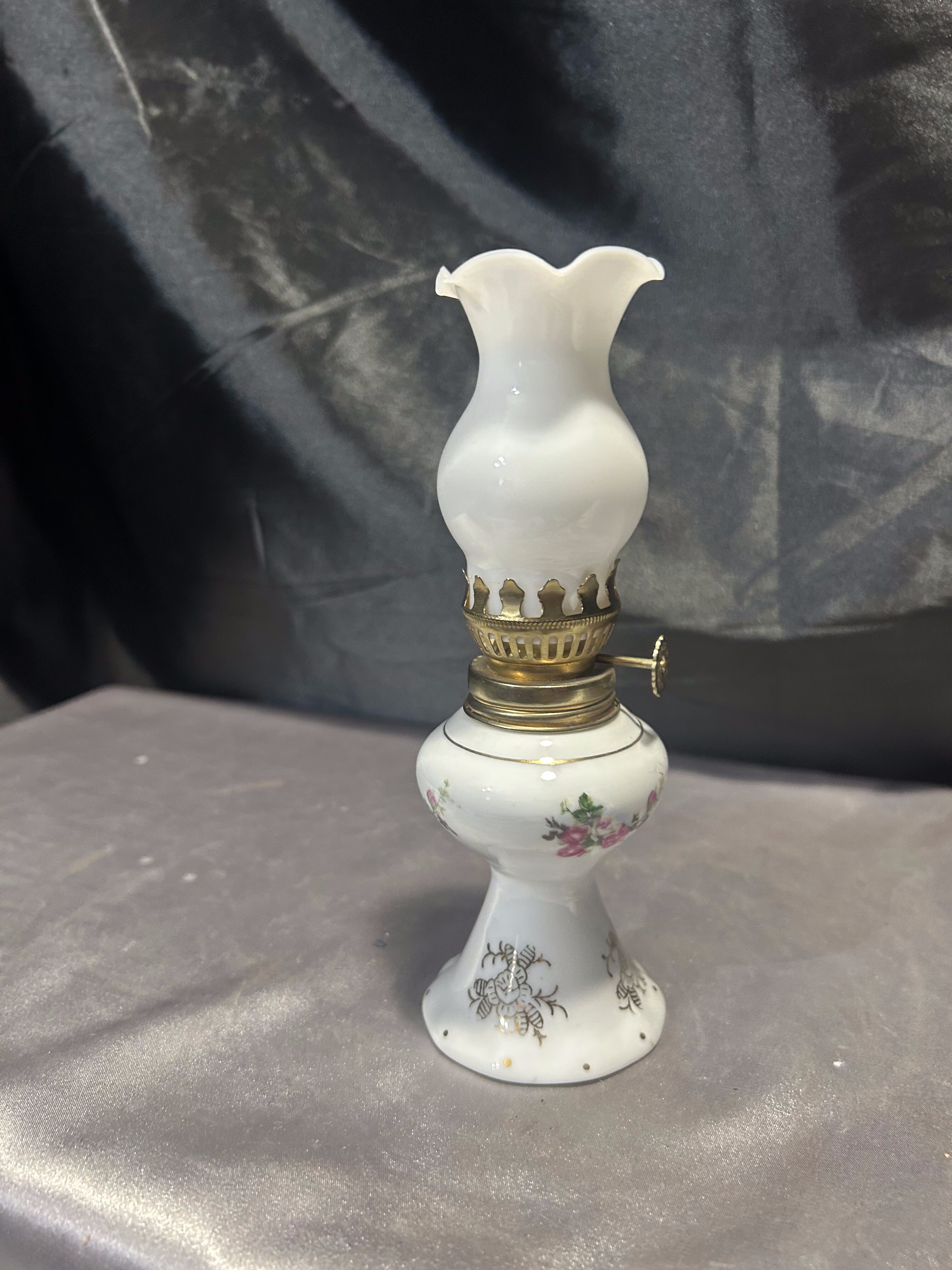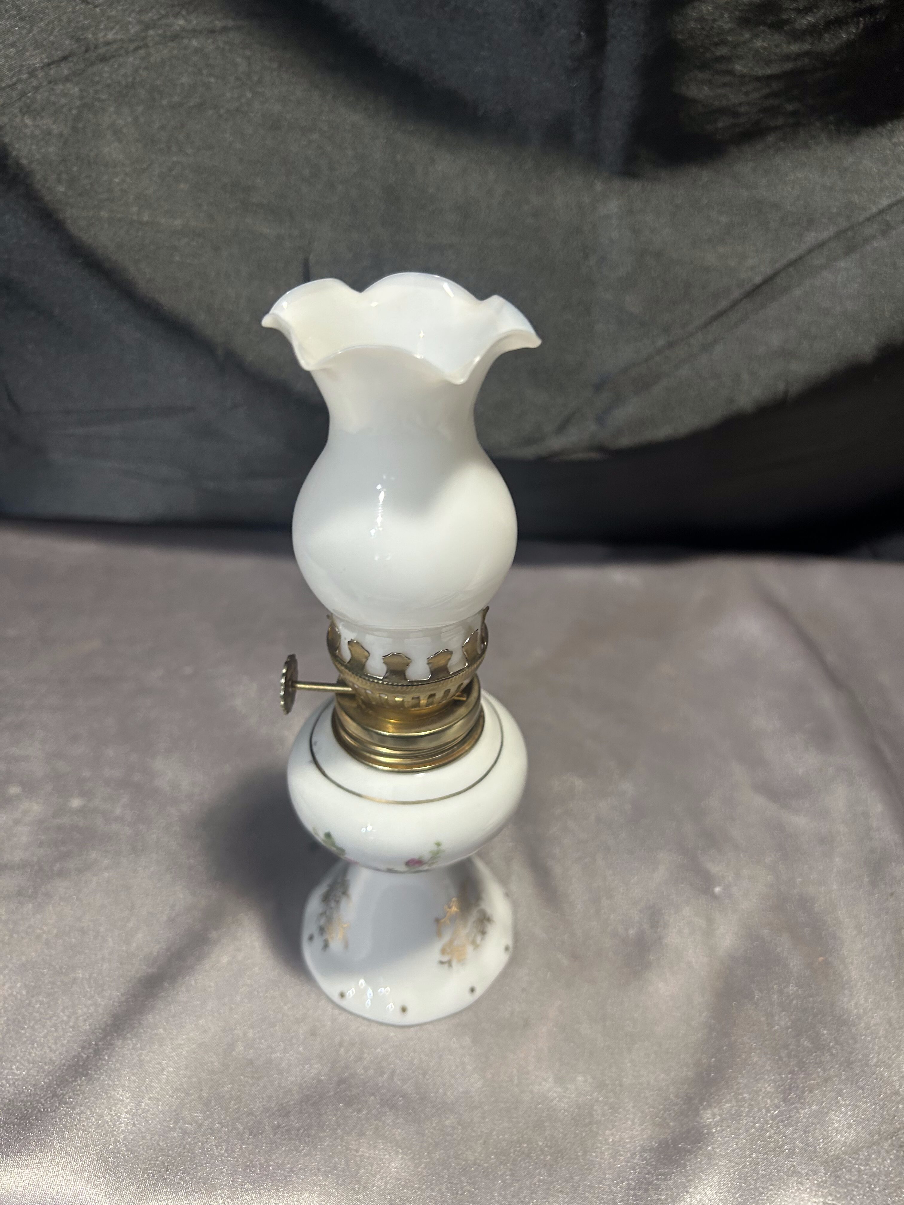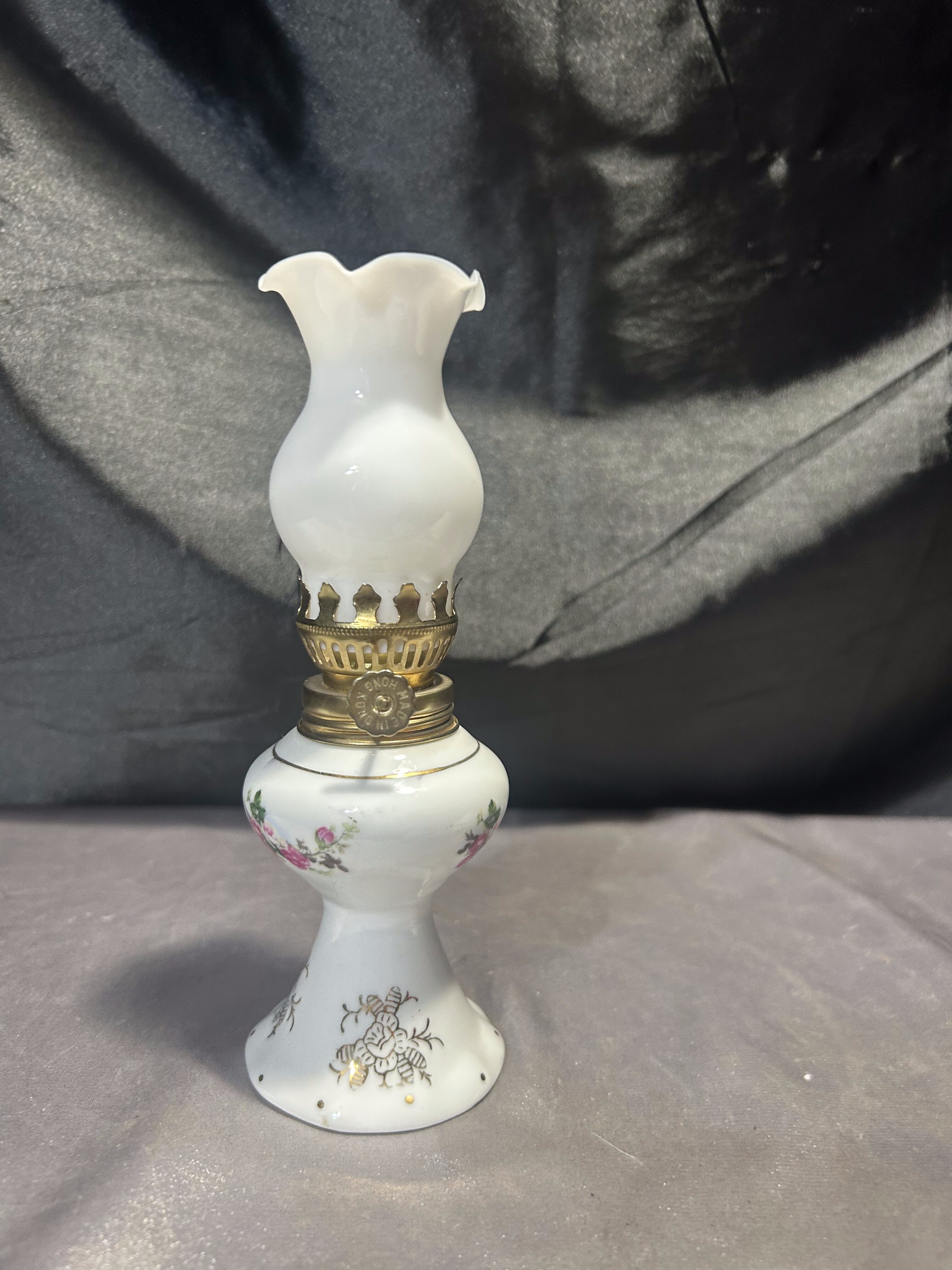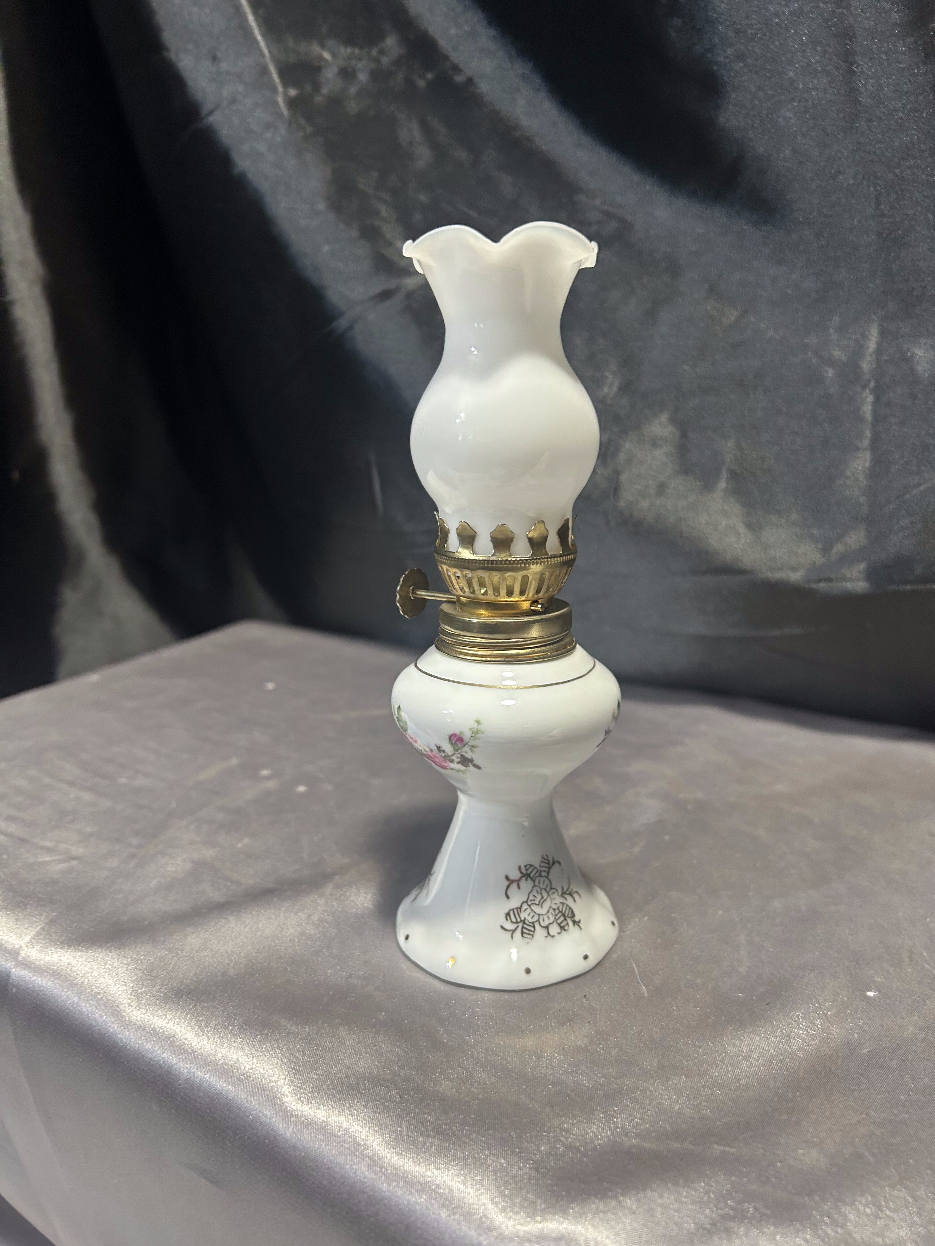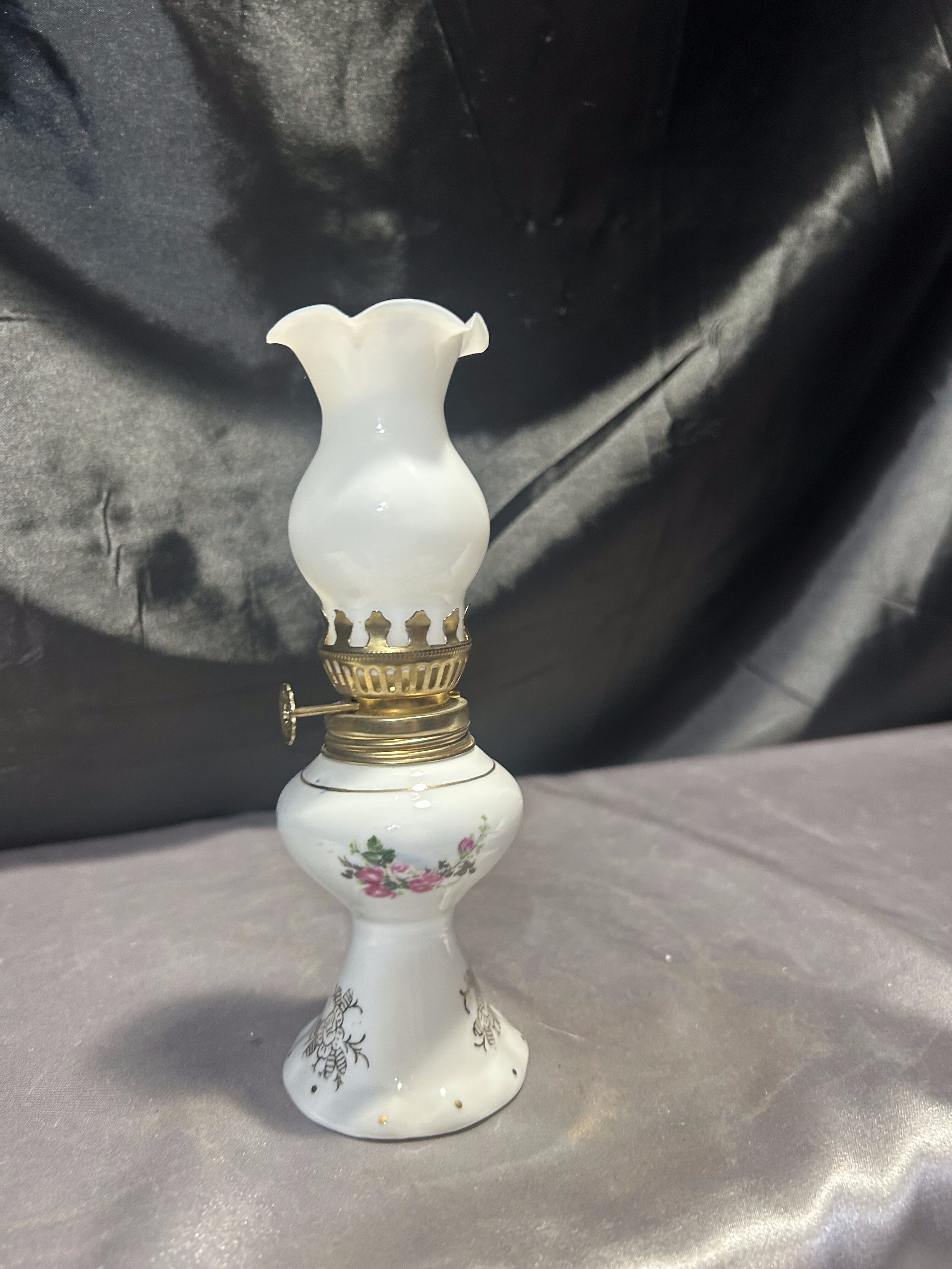 Lampka Naftowa – Biała z Różowymi Kwiatami i Złotymi Zdobieniami – Szklany Komin z Falbanką