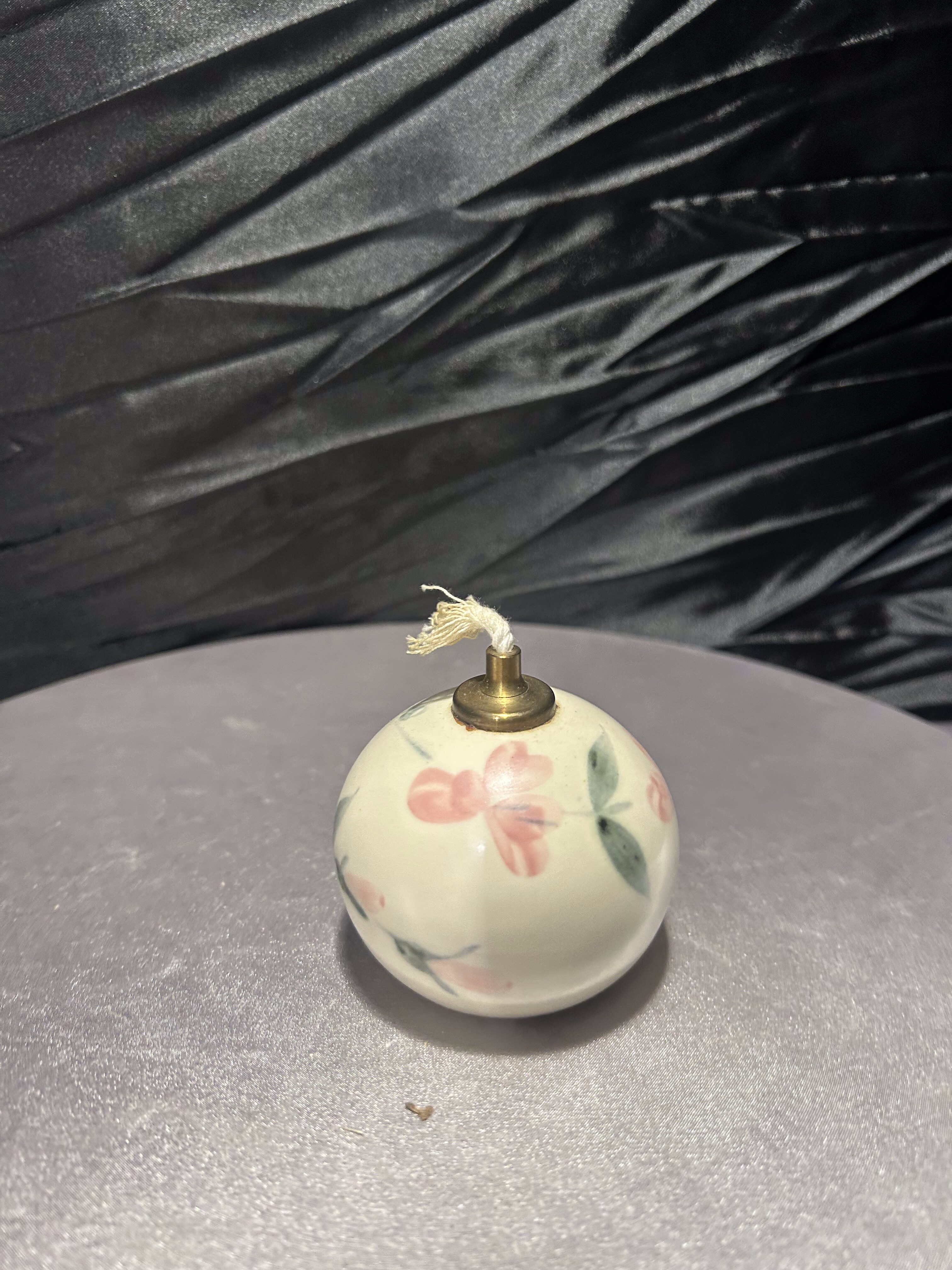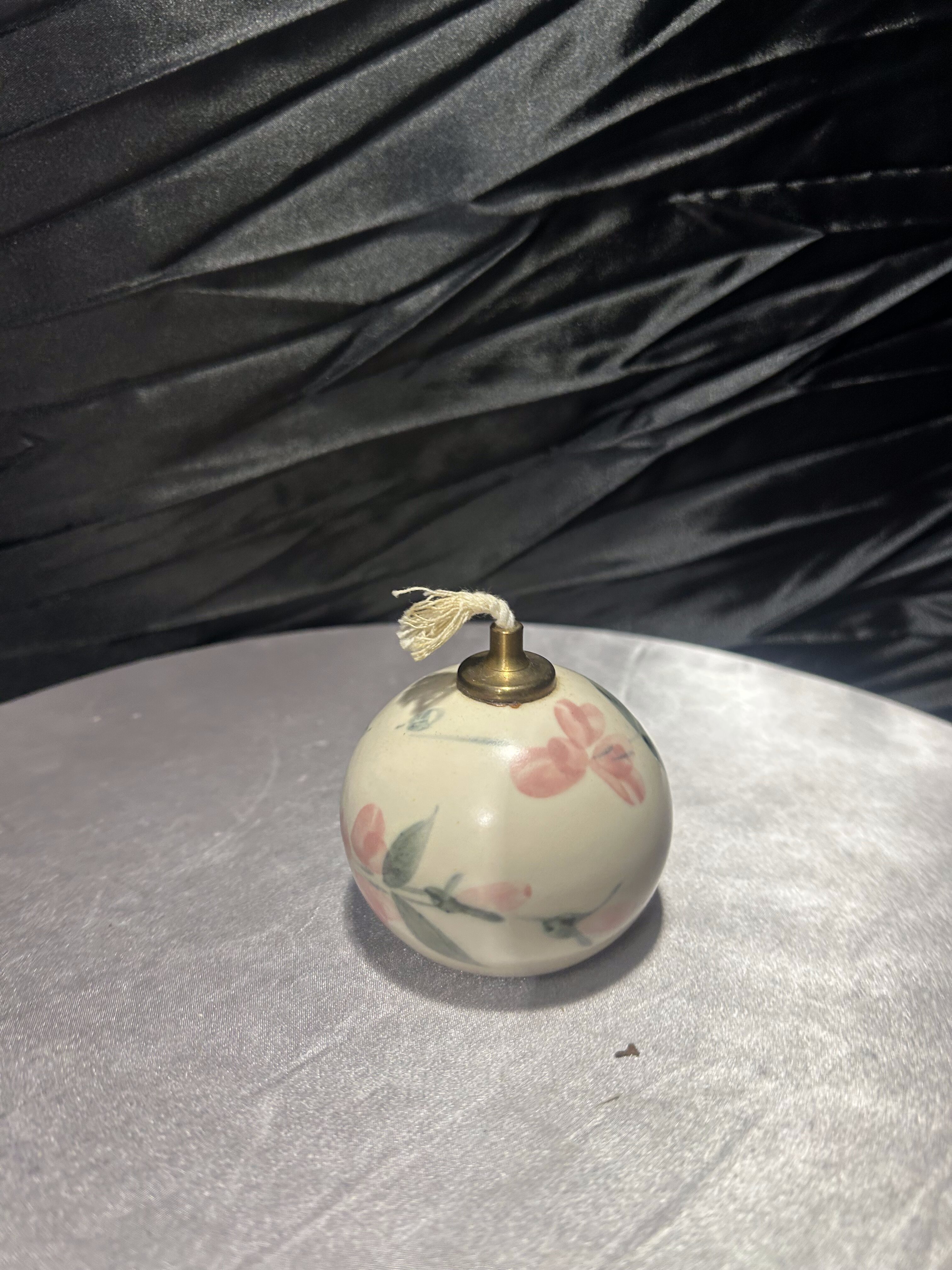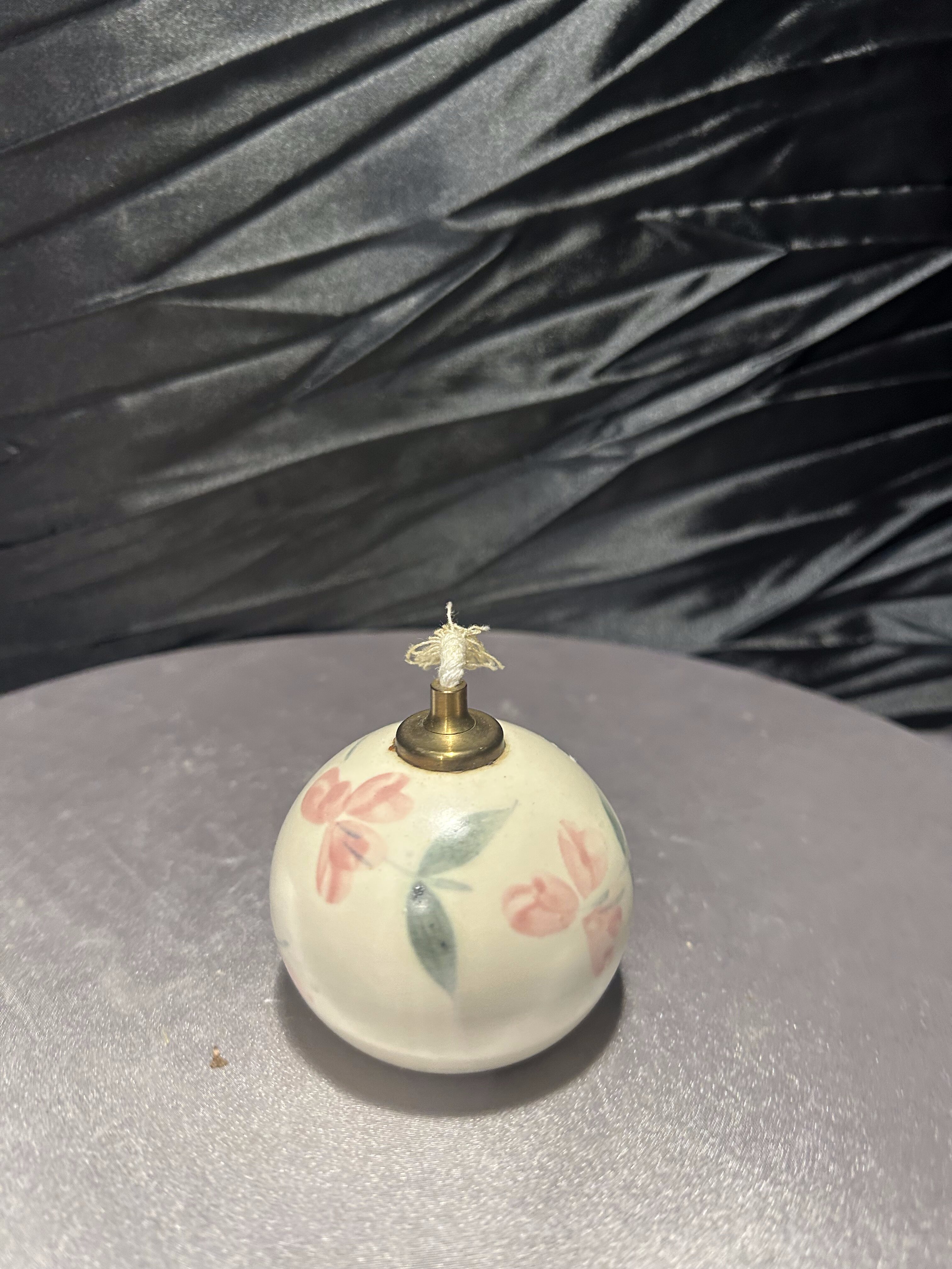 Unikalna lampka naftowa wykonana z ceramiki, ręcznie malowana w subtelne, kwiatowe wzory w stylu angielskim. Sygnowana od spodu naklejką: „English Country Pottery – Hand Painted by Liz Bodman – Made in England”, co świadczy o jej autentyczności i pochodzeniu. Kunsztowne wykonanie i pastelowa kolorystyka sprawiają, że lampka doskonale odnajdzie się jako element dekoracyjny w klasycznych oraz romantycznych wnętrzach.