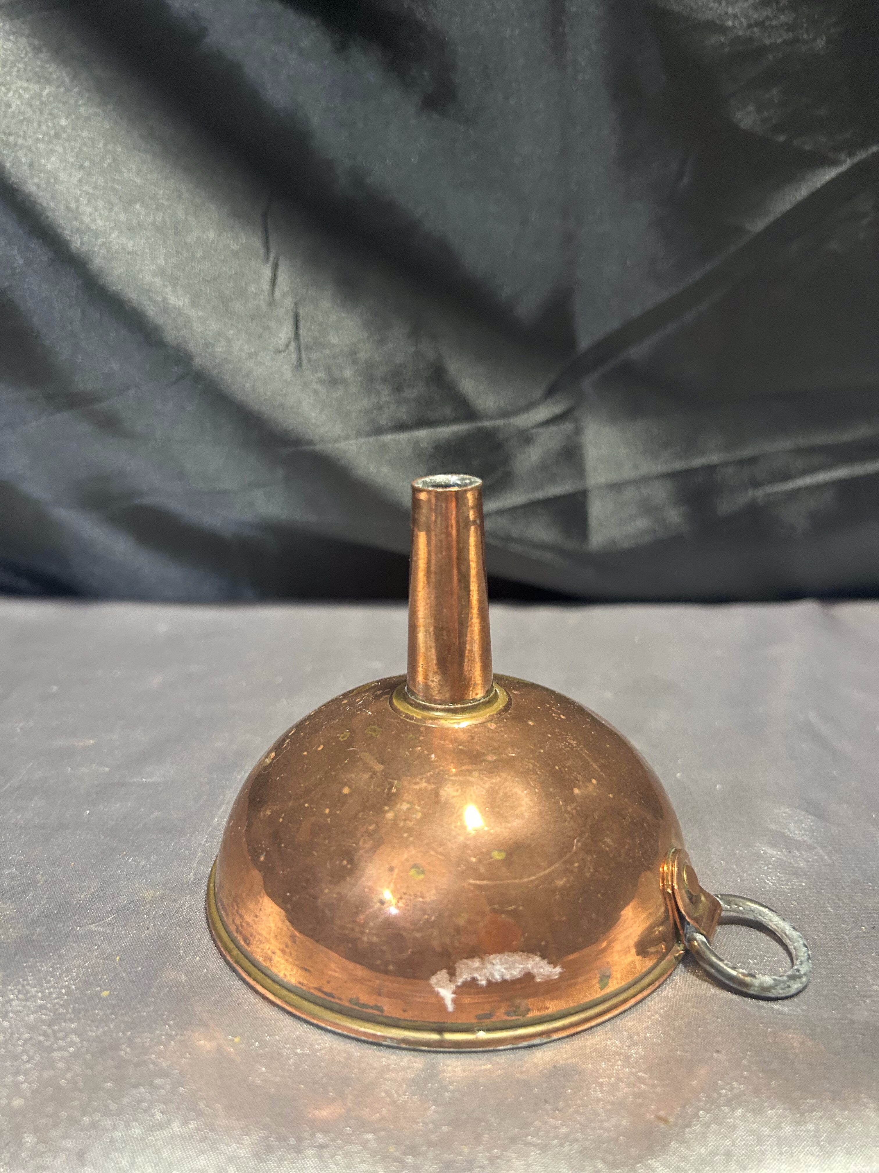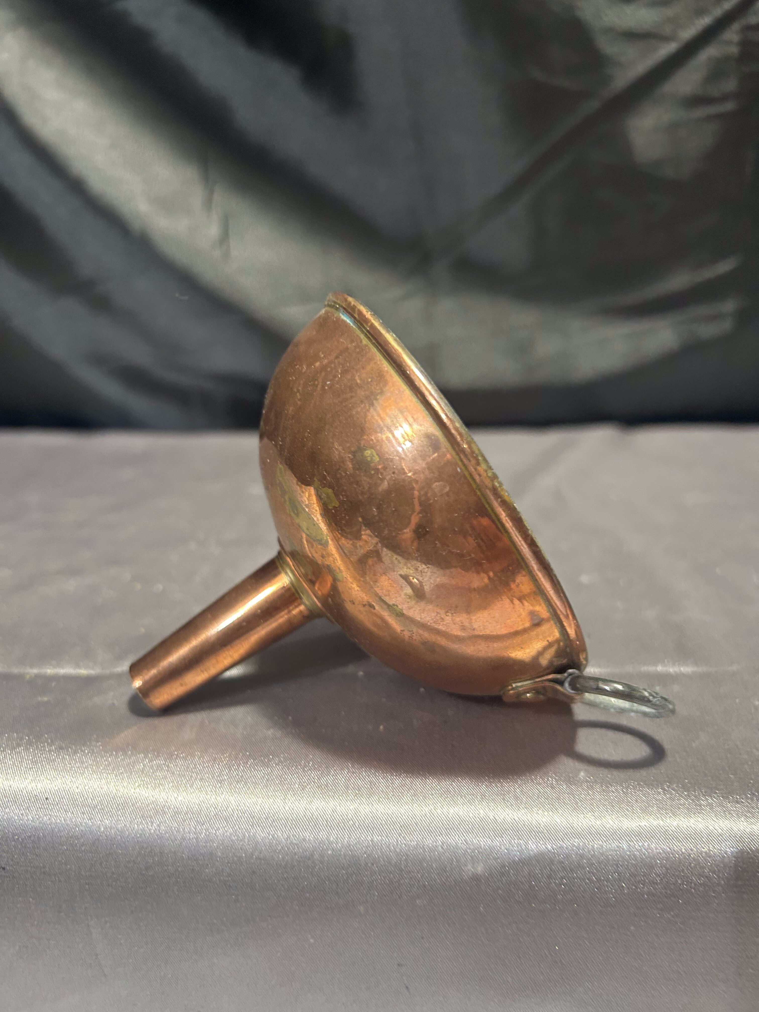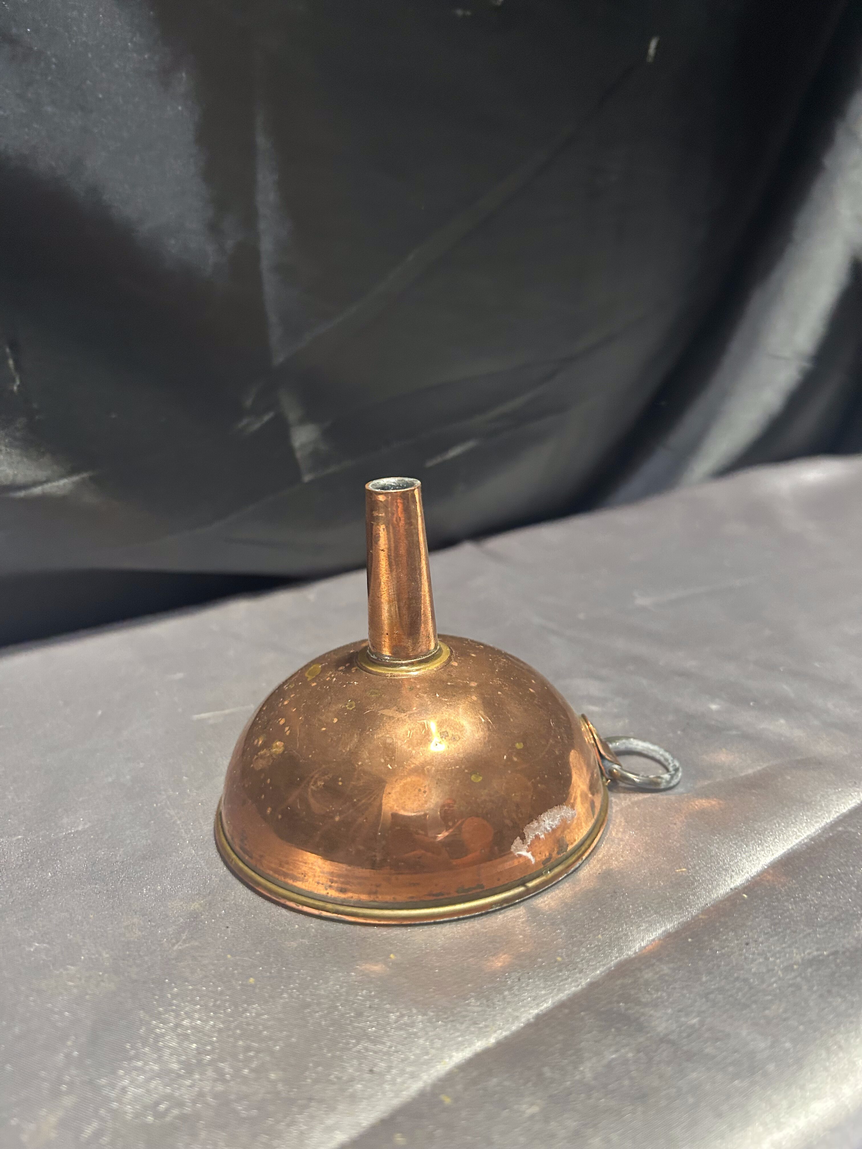 Niewielki lejek wykonany z miedzi, zachowany w klasycznej formie, z praktycznym oczkiem do zawieszenia. Idealny do kuchni w stylu rustykalnym, vintage lub jako urokliwy dodatek dekoracyjny. Miedź z delikatną patyną podkreśla jego wiek i charakter.