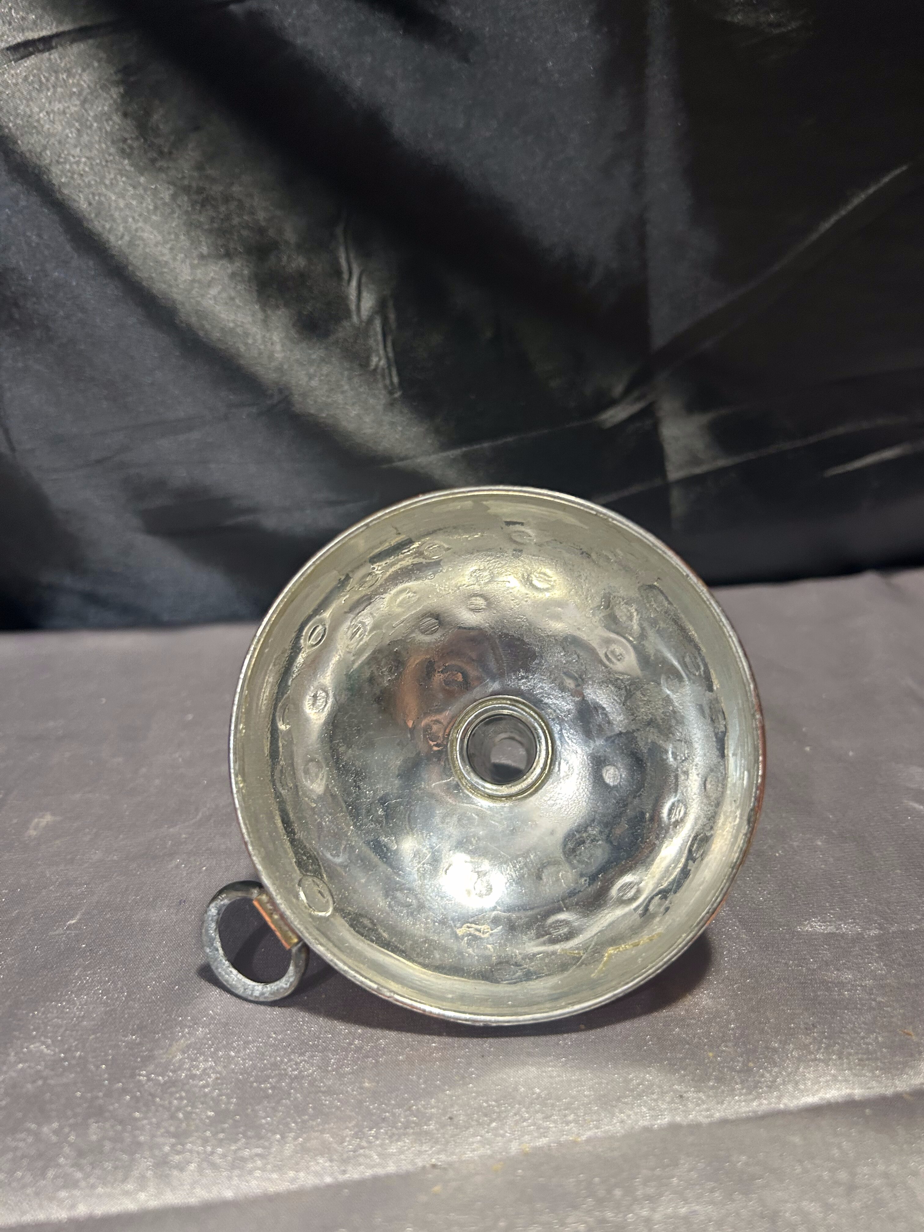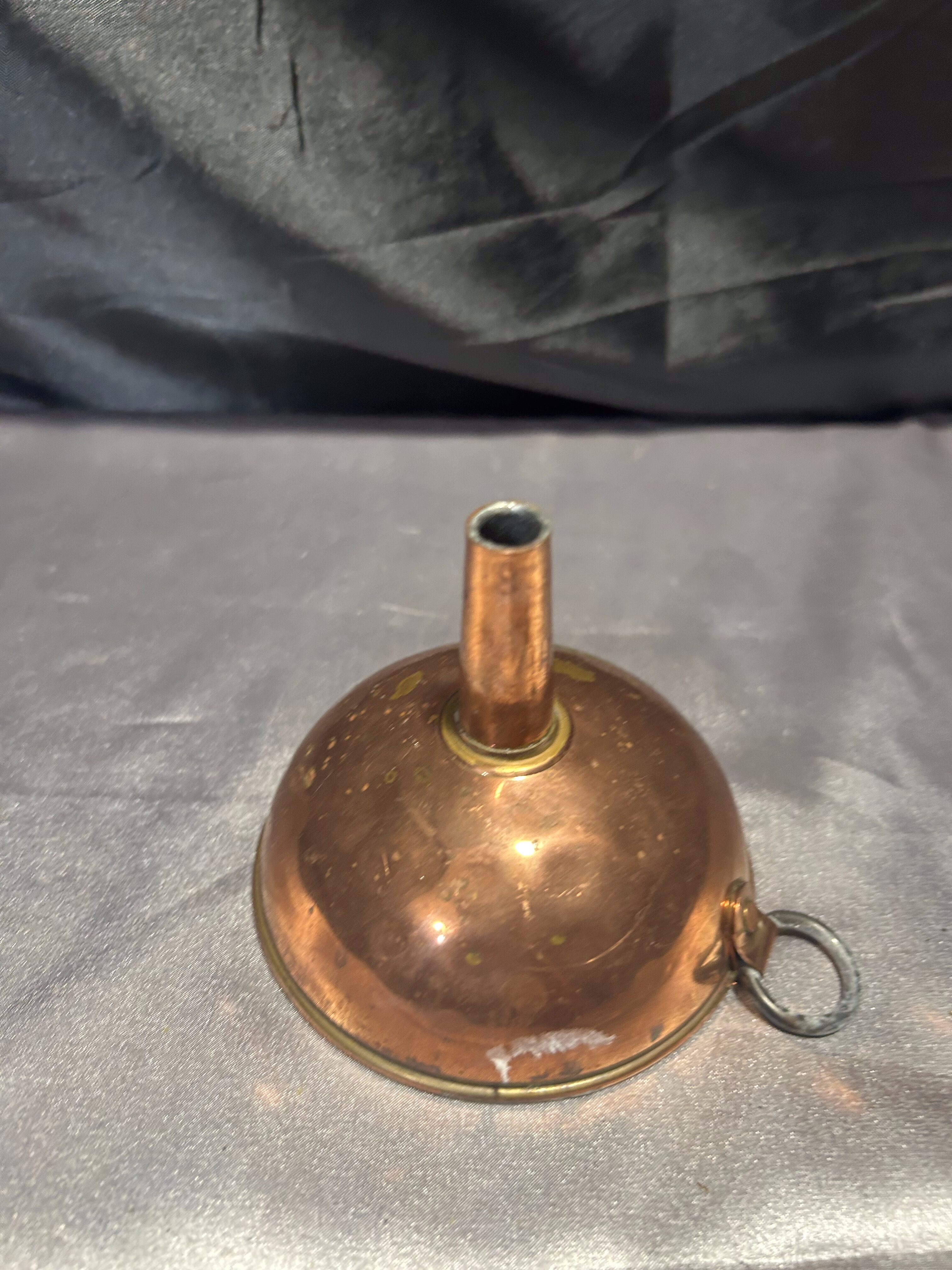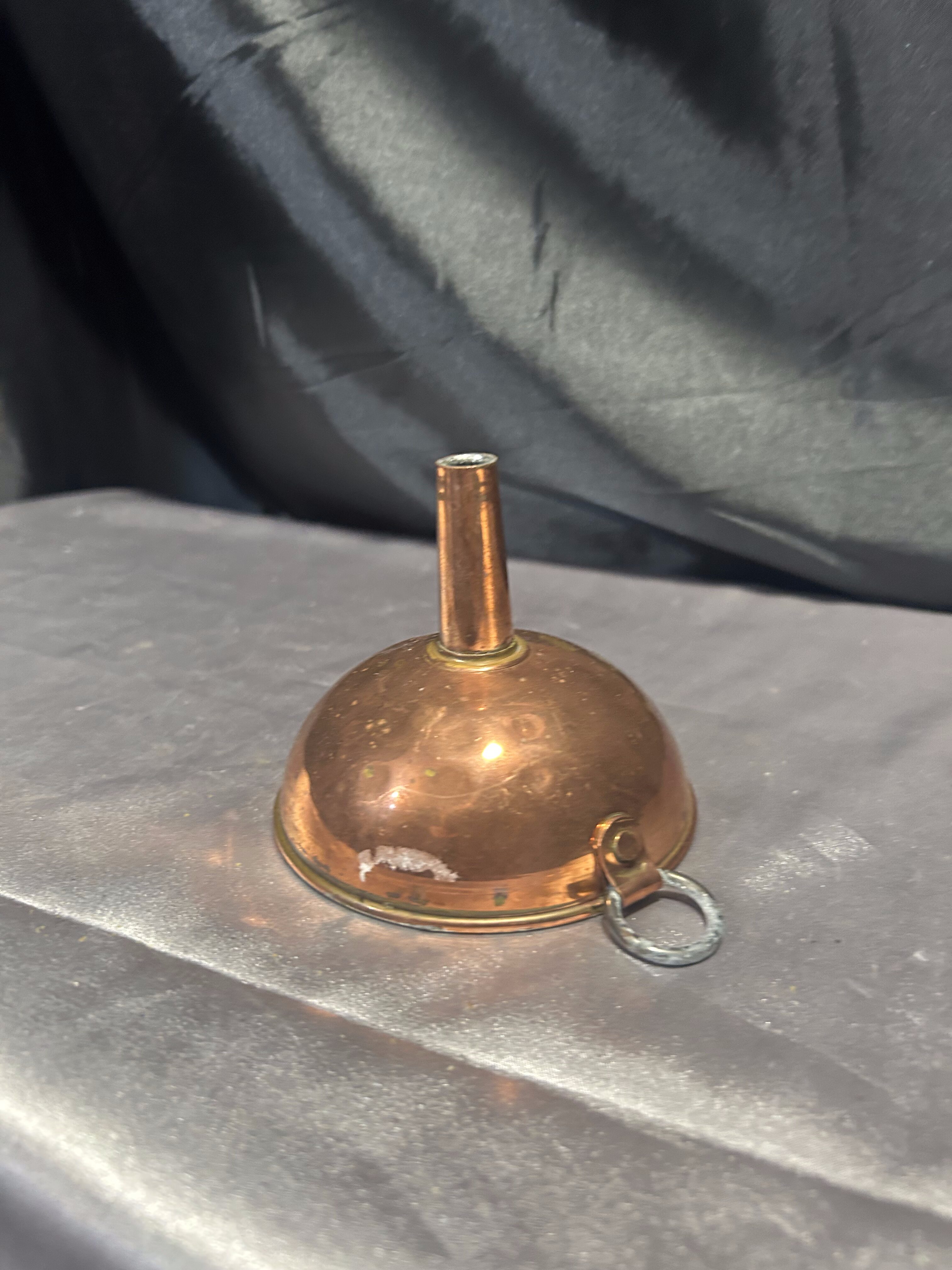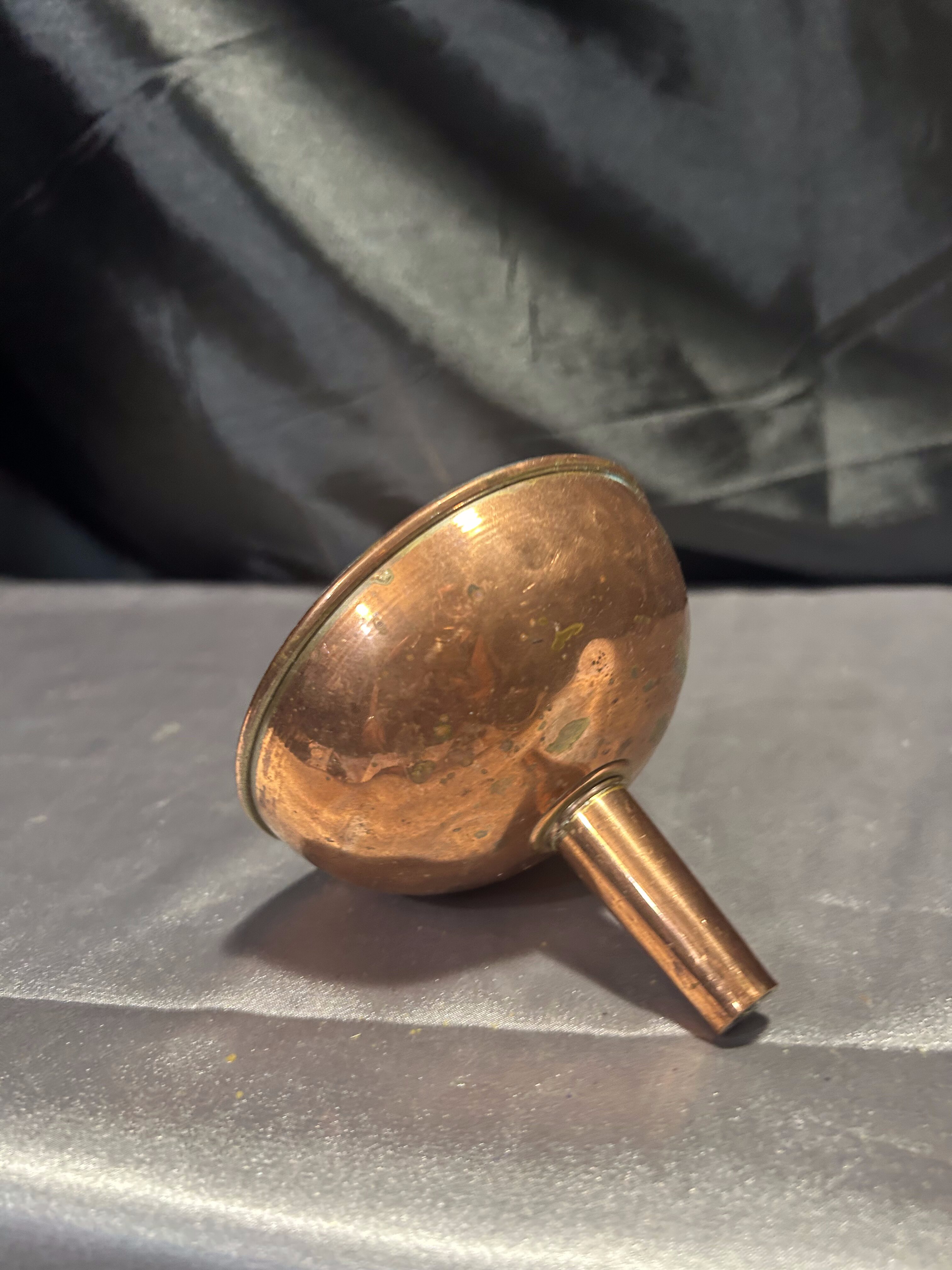 Niewielki lejek wykonany z miedzi, zachowany w klasycznej formie, z praktycznym oczkiem do zawieszenia. Idealny do kuchni w stylu rustykalnym, vintage lub jako urokliwy dodatek dekoracyjny. Miedź z delikatną patyną podkreśla jego wiek i charakter.