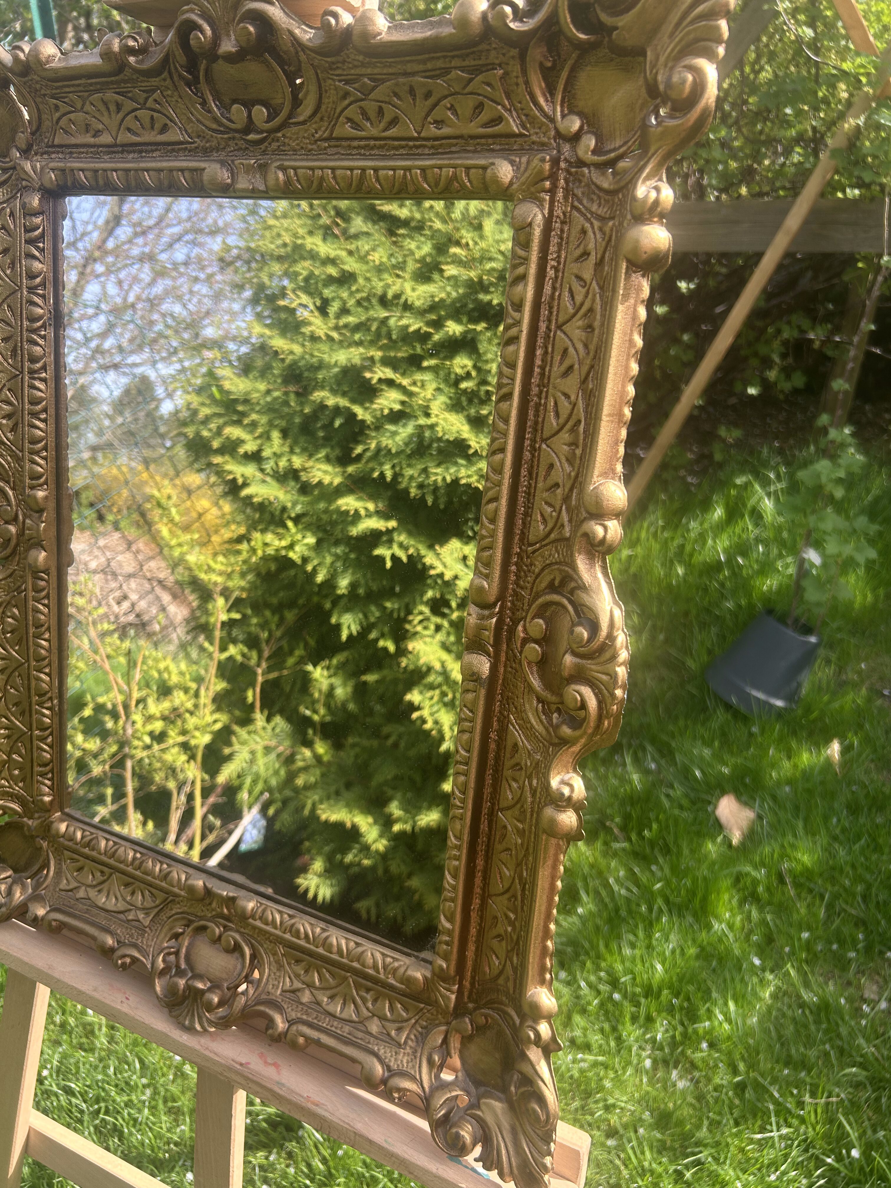 Eleganckie lustro oprawione w bogato rzeźbioną, drewnianą ramę w kolorze złotym. Klasyczne ornamenty i dekoracyjne wykończenia nawiązują do stylu barokowego lub pałacowego, czyniąc ten egzemplarz nie tylko praktycznym dodatkiem, ale również efektownym elementem dekoracyjnym.