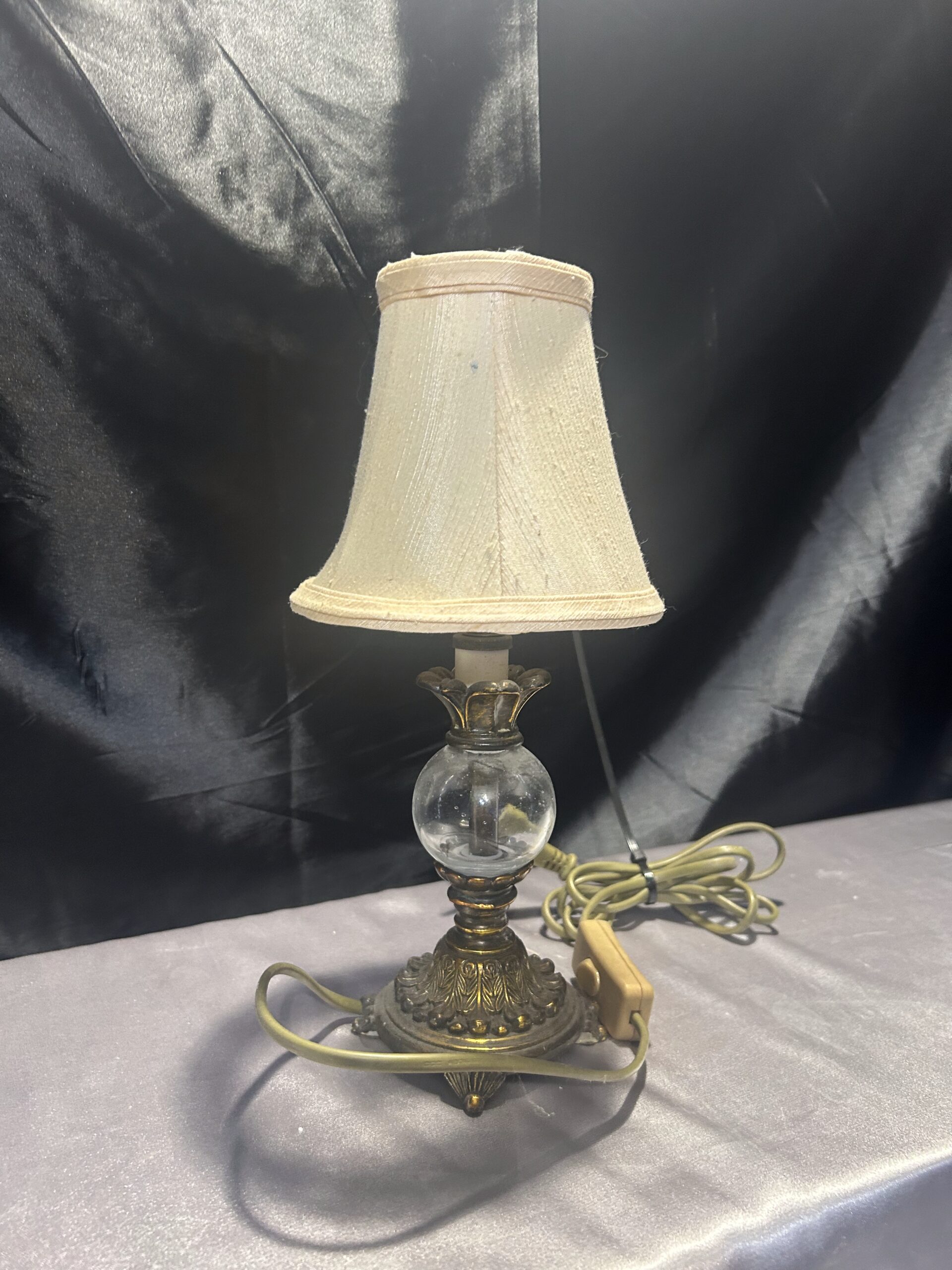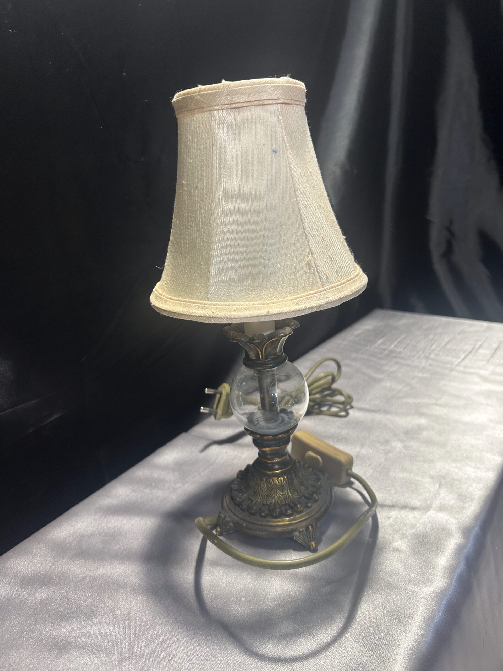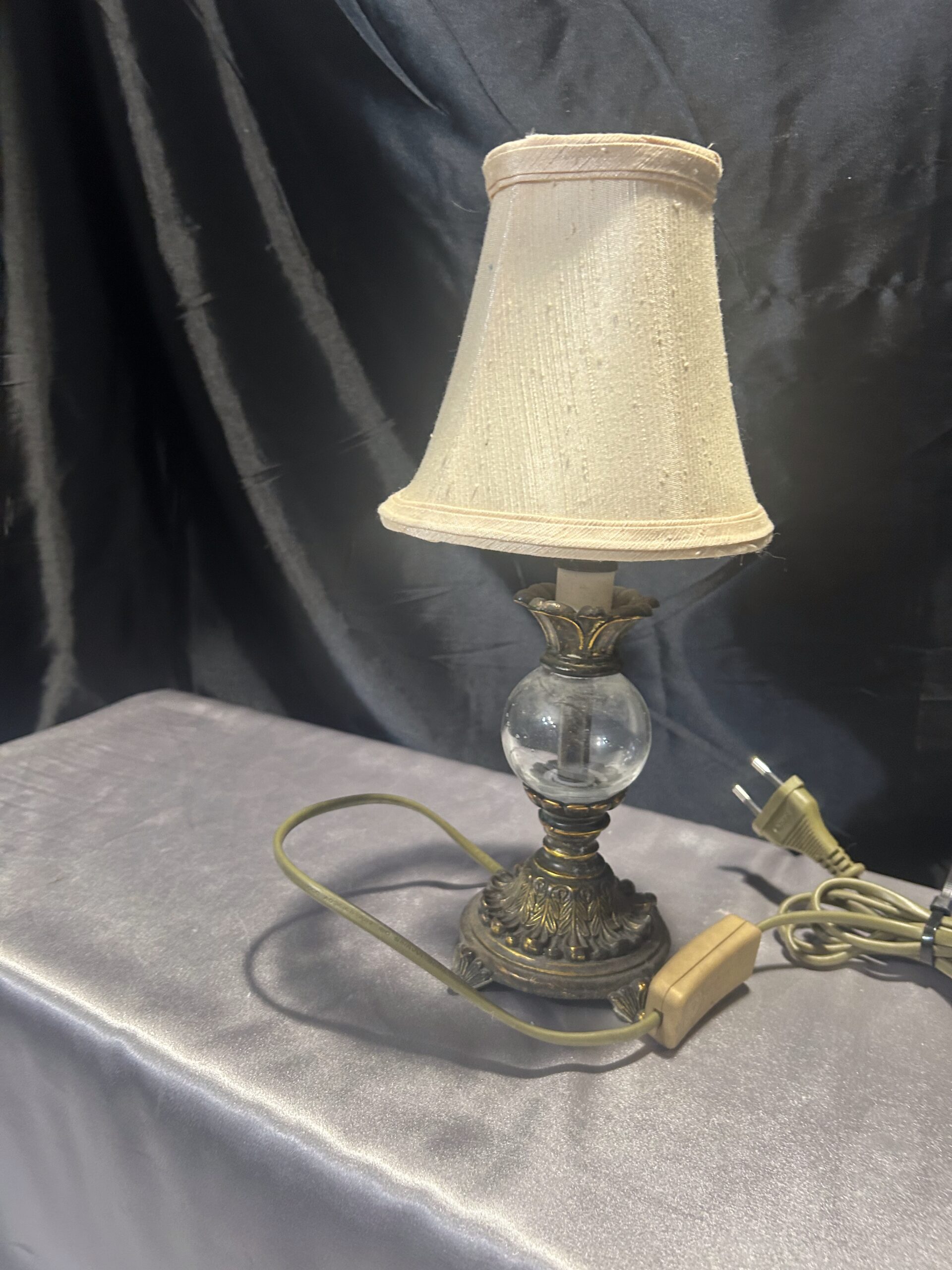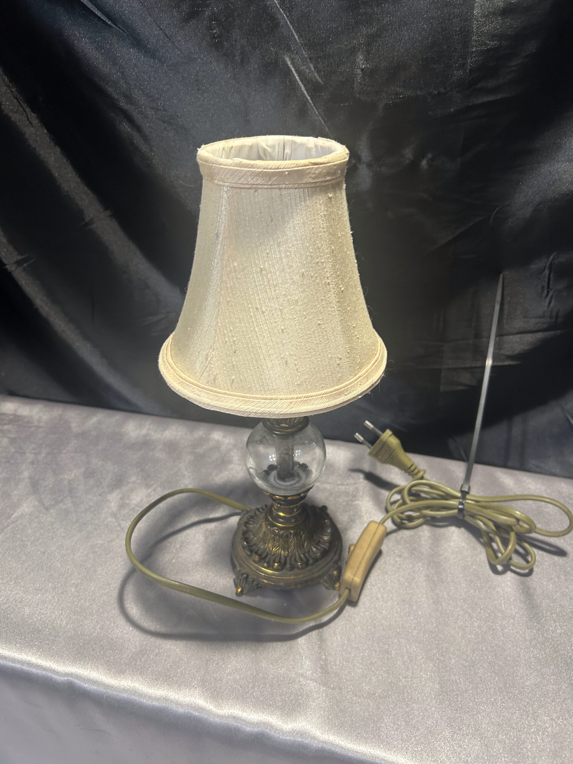 Elegancka mała lampka nocna, idealna na komodę, szafkę nocną lub parapet. Wykonana z mosiądzu, z ozdobną szklaną bańką umieszczoną w nodze. Uzupełnia ją materiałowy abażur oraz kabel z włącznikiem, co czyni ją praktycznym i stylowym dodatkiem do wnętrza.