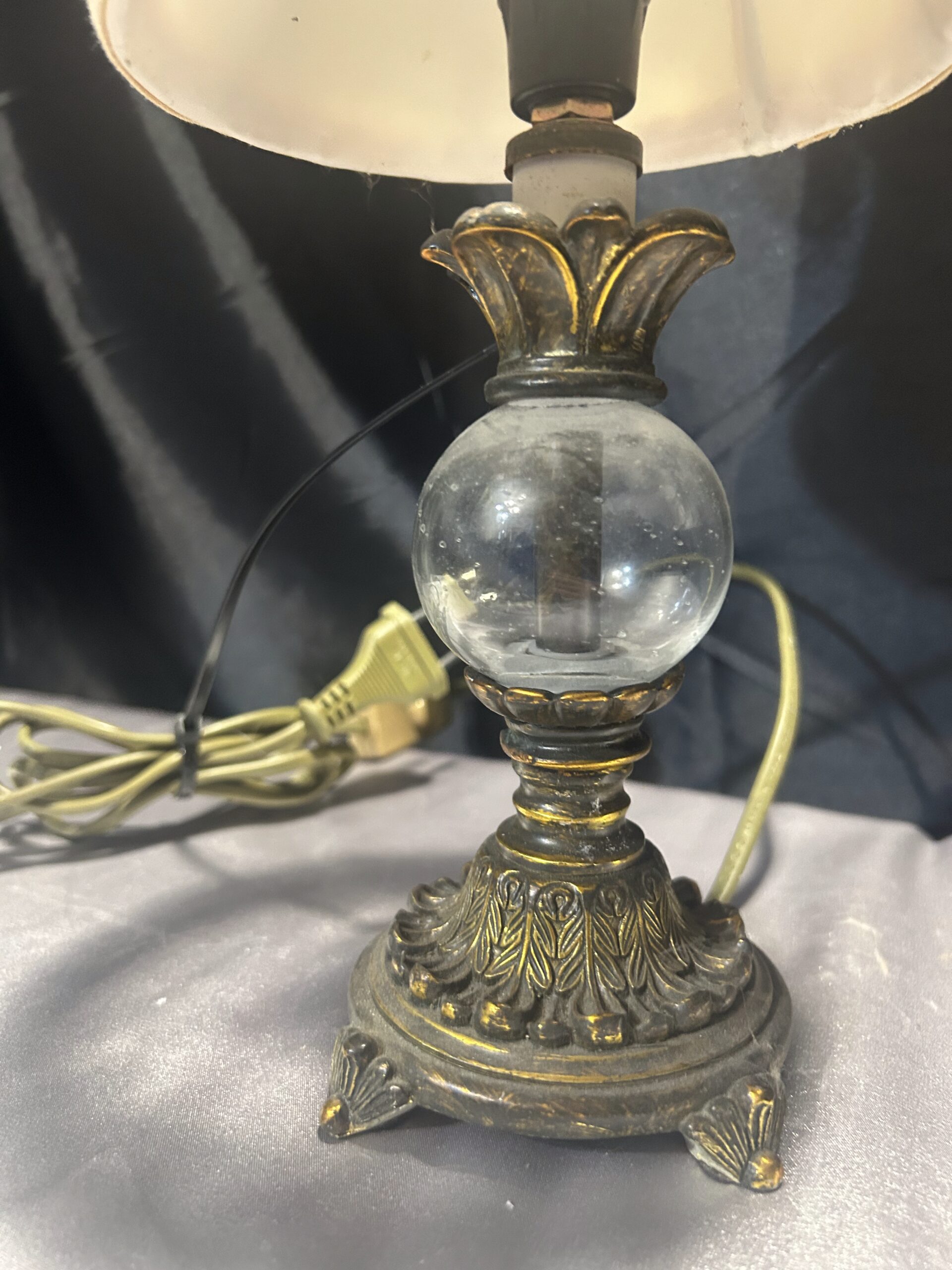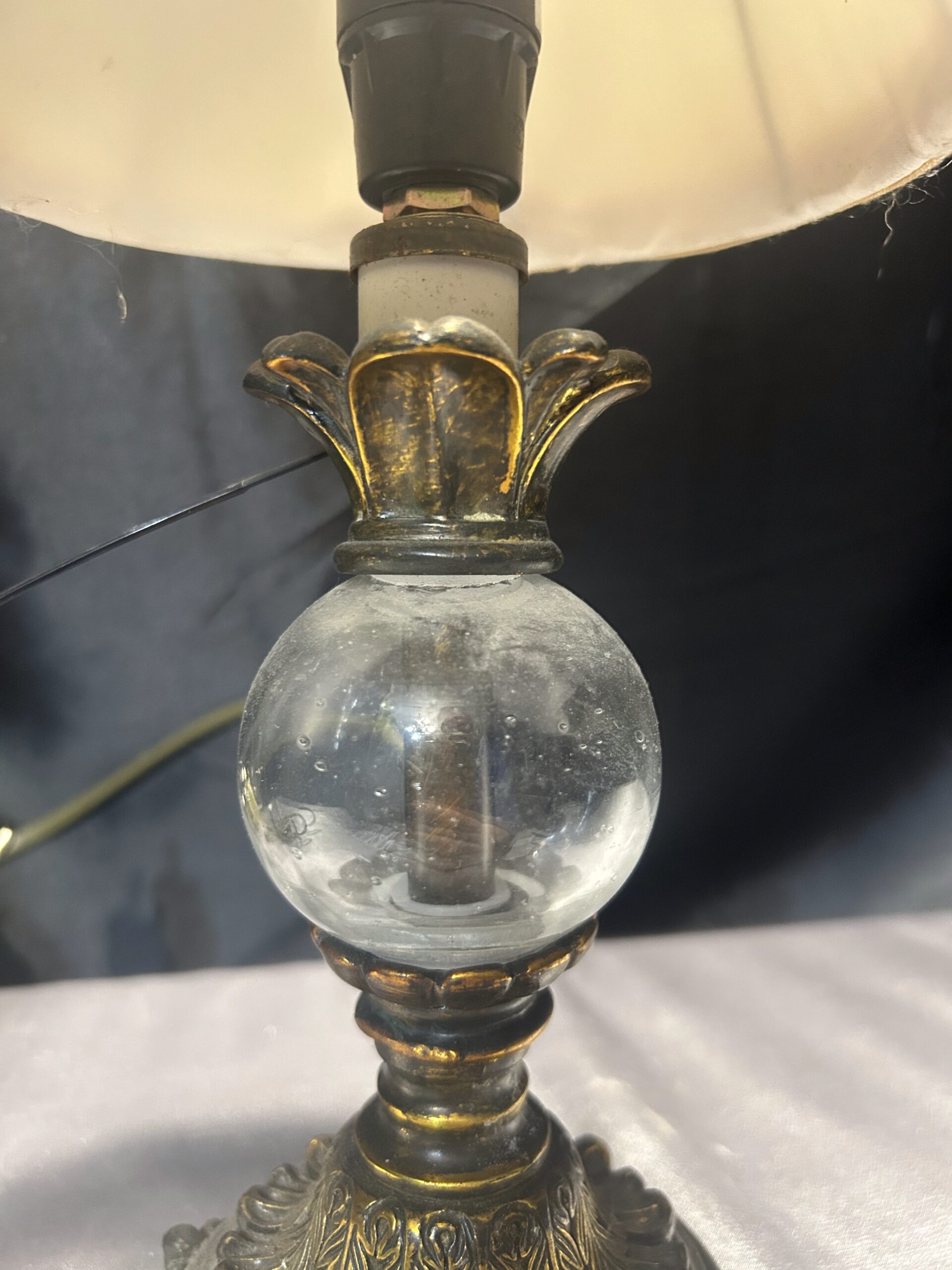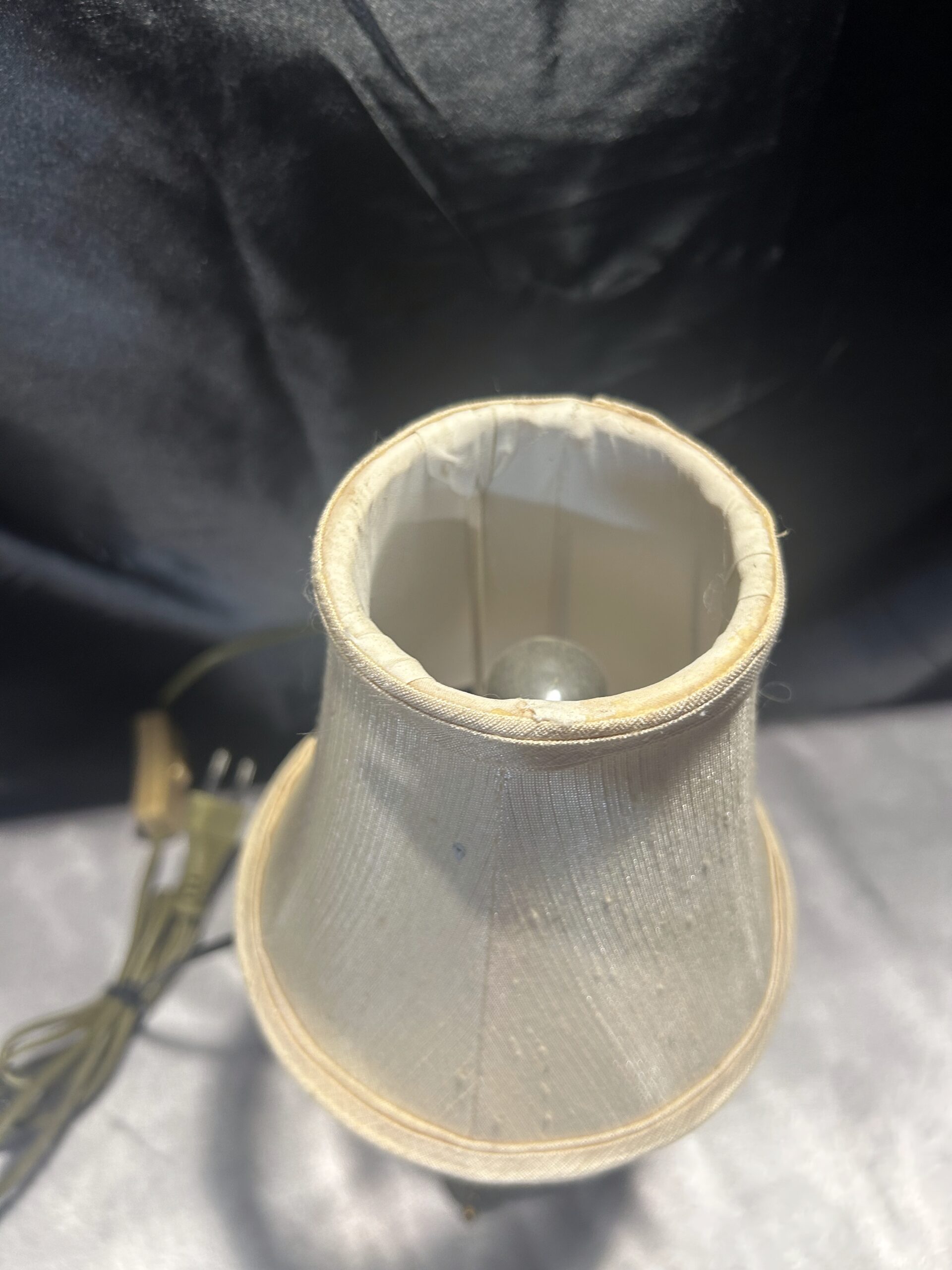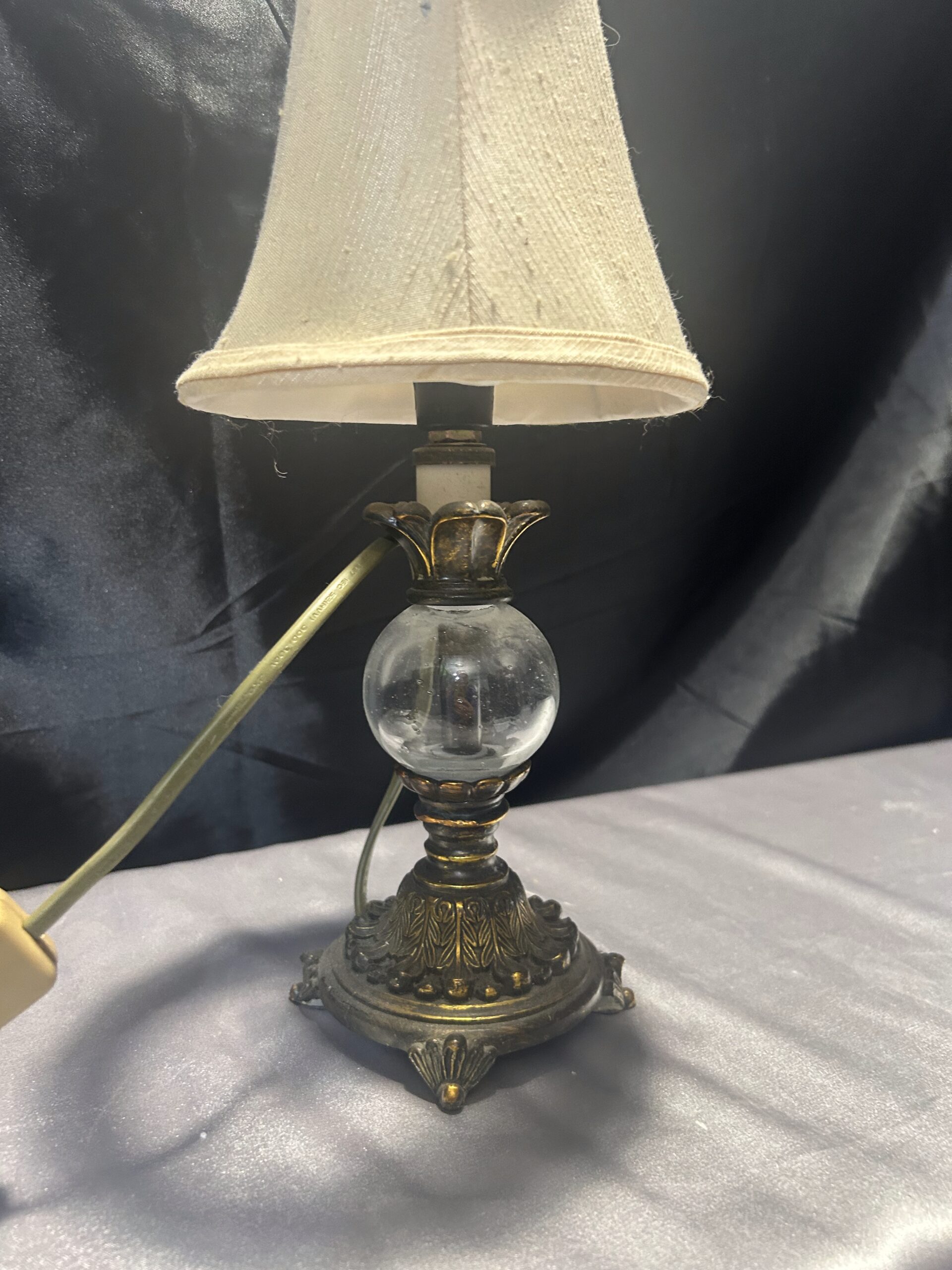 Elegancka mała lampka nocna, idealna na komodę, szafkę nocną lub parapet. Wykonana z mosiądzu, z ozdobną szklaną bańką umieszczoną w nodze. Uzupełnia ją materiałowy abażur oraz kabel z włącznikiem, co czyni ją praktycznym i stylowym dodatkiem do wnętrza.