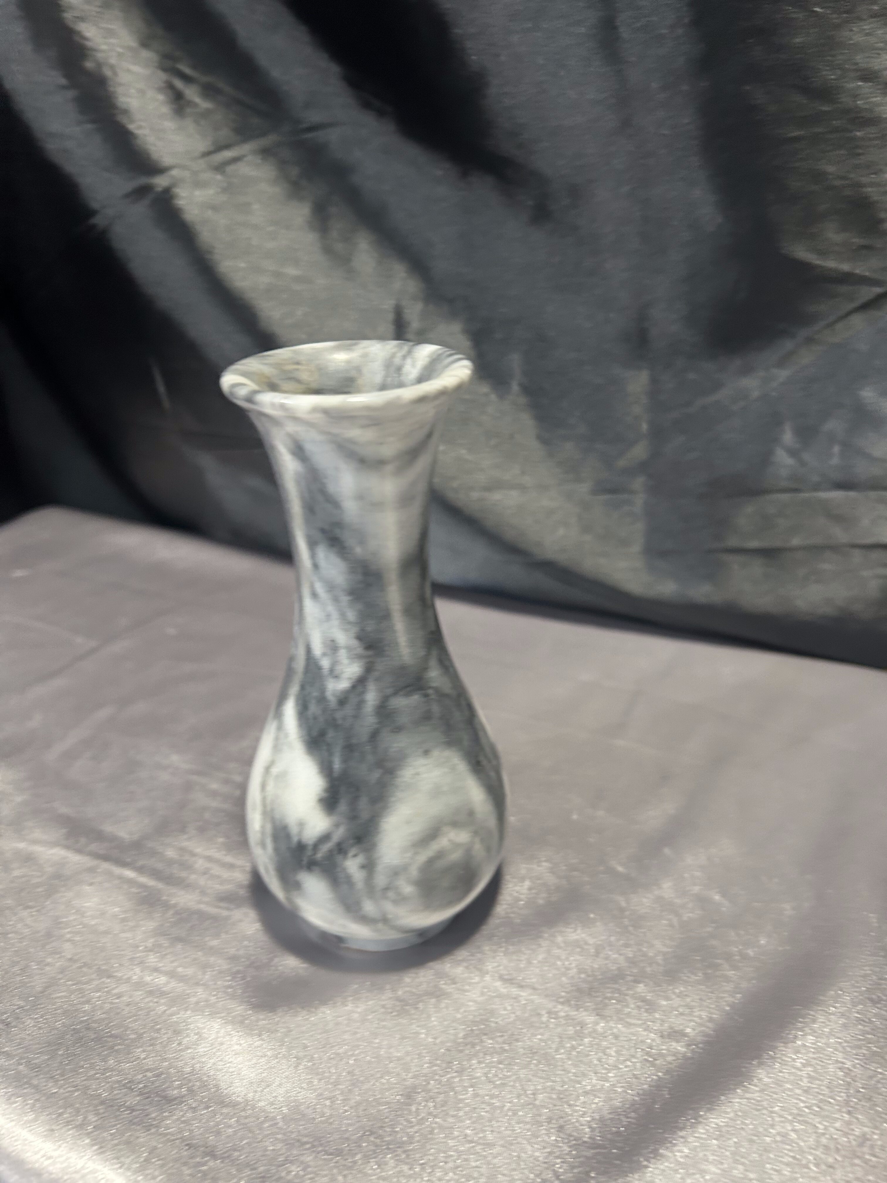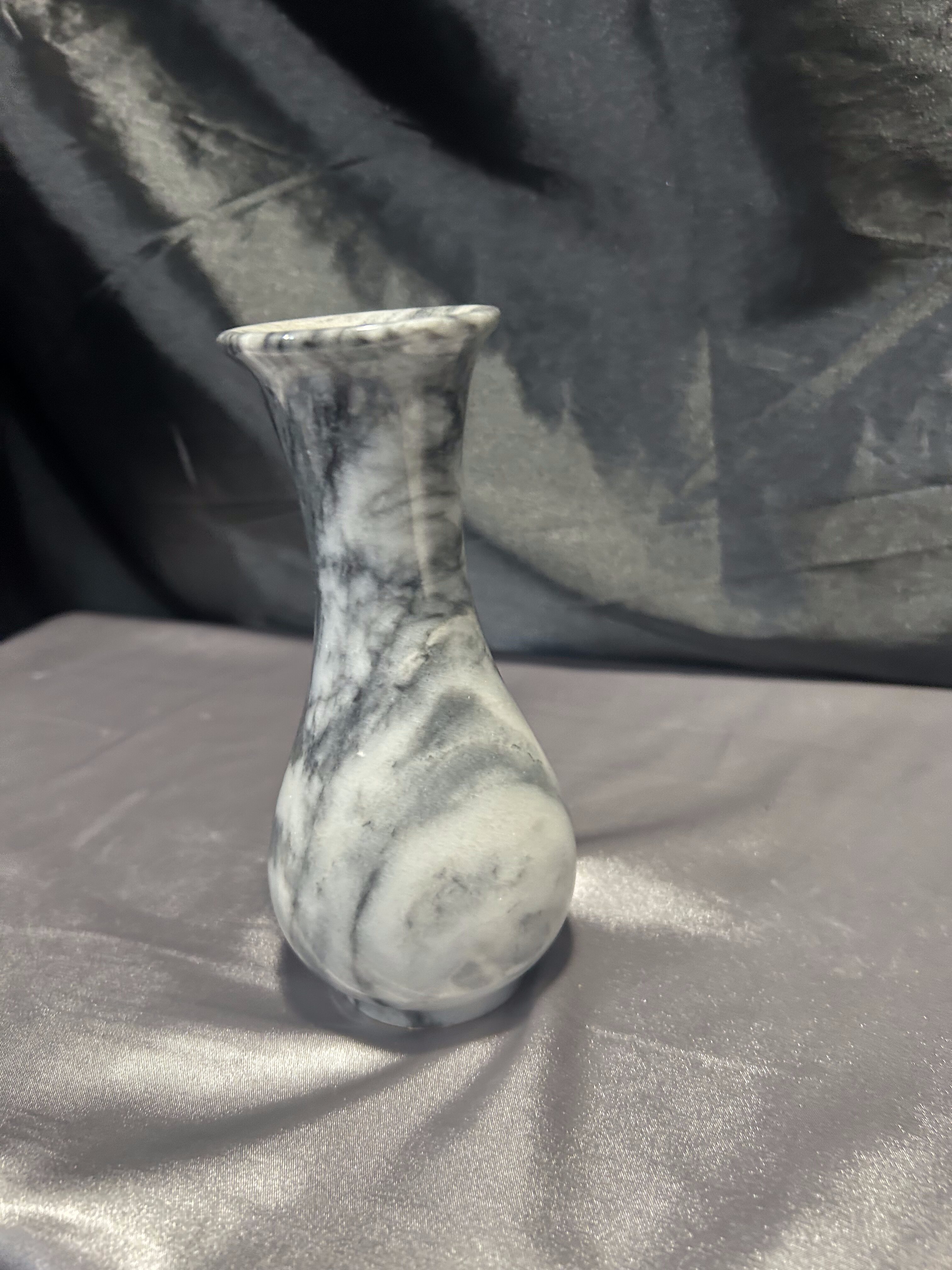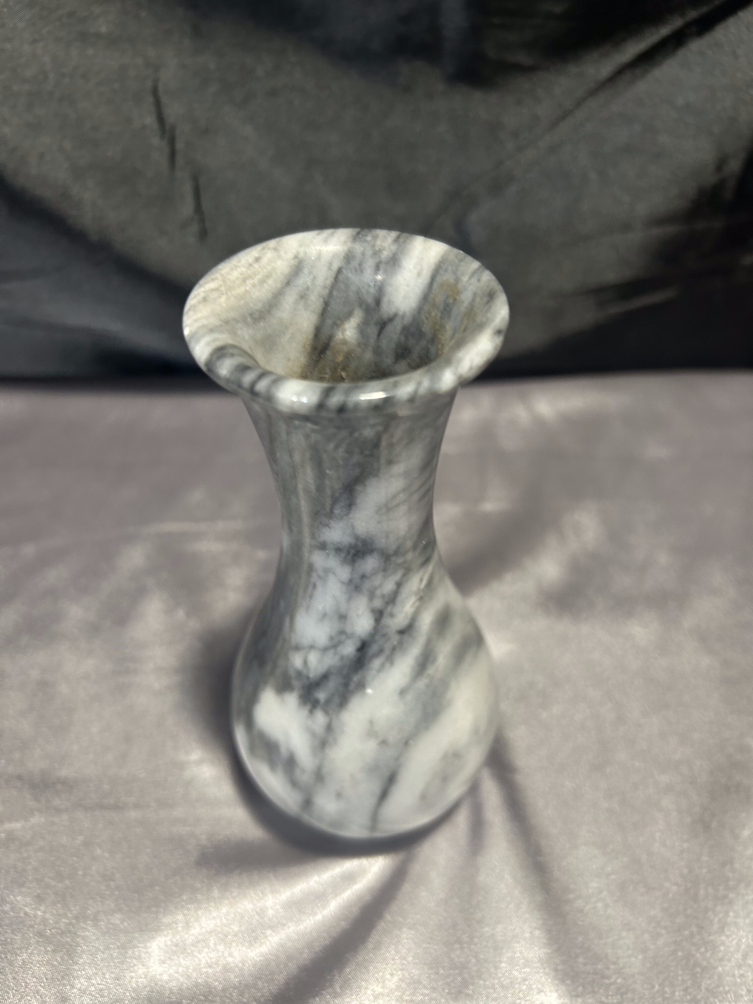 Unikalny flakon wykonany z marmuru o pięknych, naturalnych żyłkach, który zachwyca subtelną formą i elegancją surowca. Toczenie podkreśla jego szlachetny kształt i pozwala docenić rysunek kamienia. Doskonały jako dekoracja półki, komody czy parapetu – świetnie komponuje się z wnętrzami klasycznymi, minimalistycznymi i naturalnymi. Można używać go jako flakonik na pojedynczy kwiat lub po prostu jako elegancki akcent dekoracyjny.