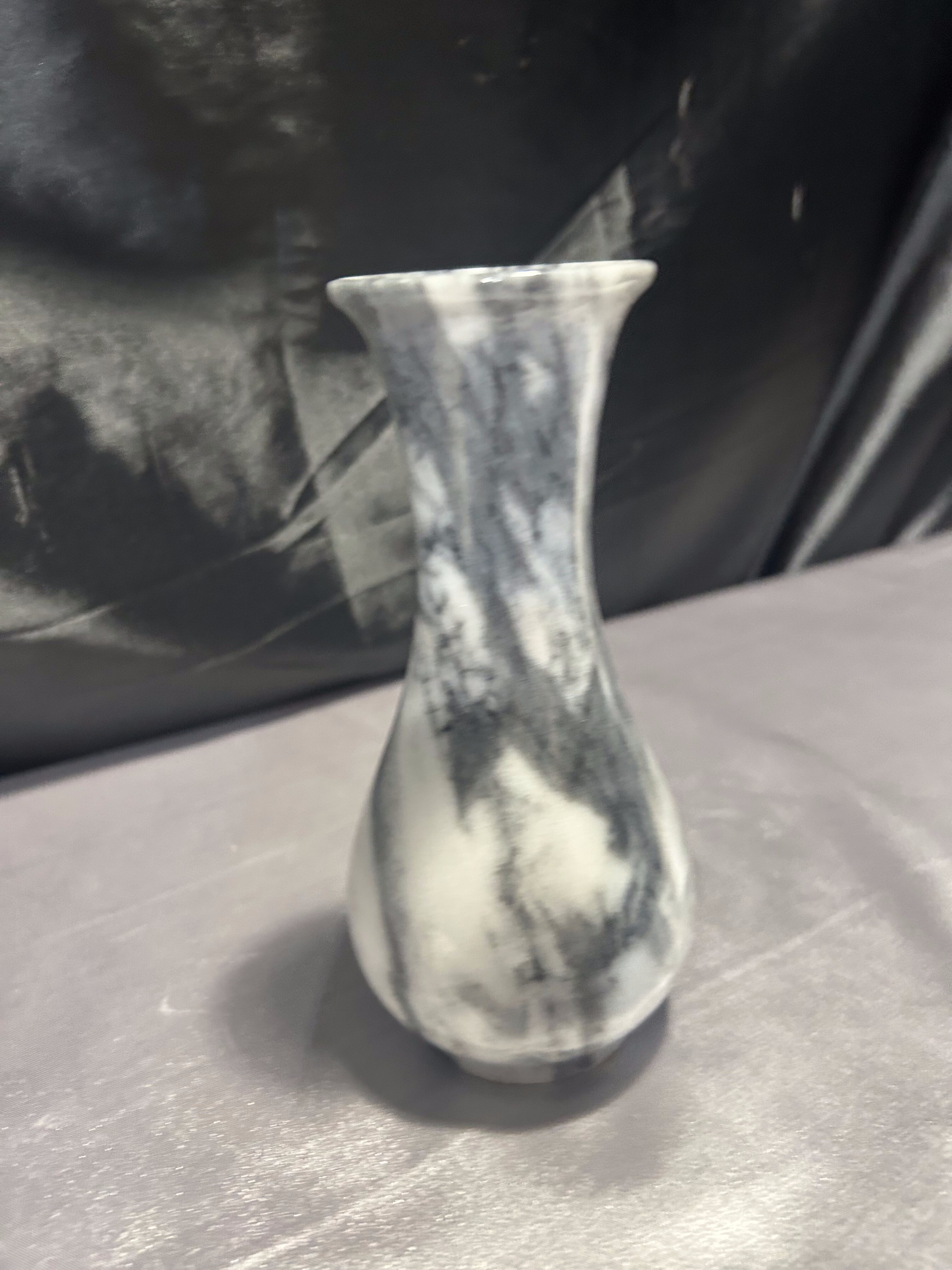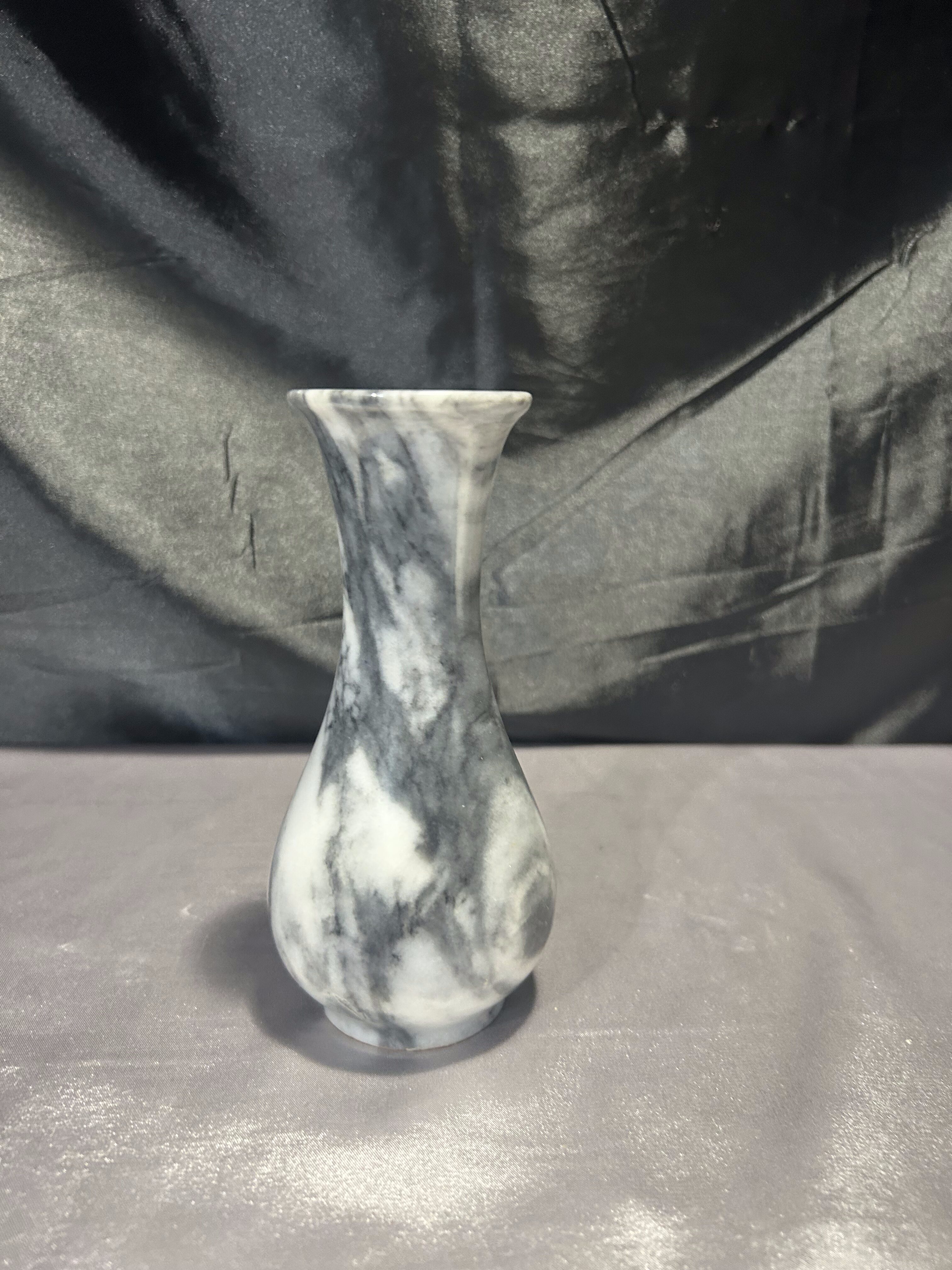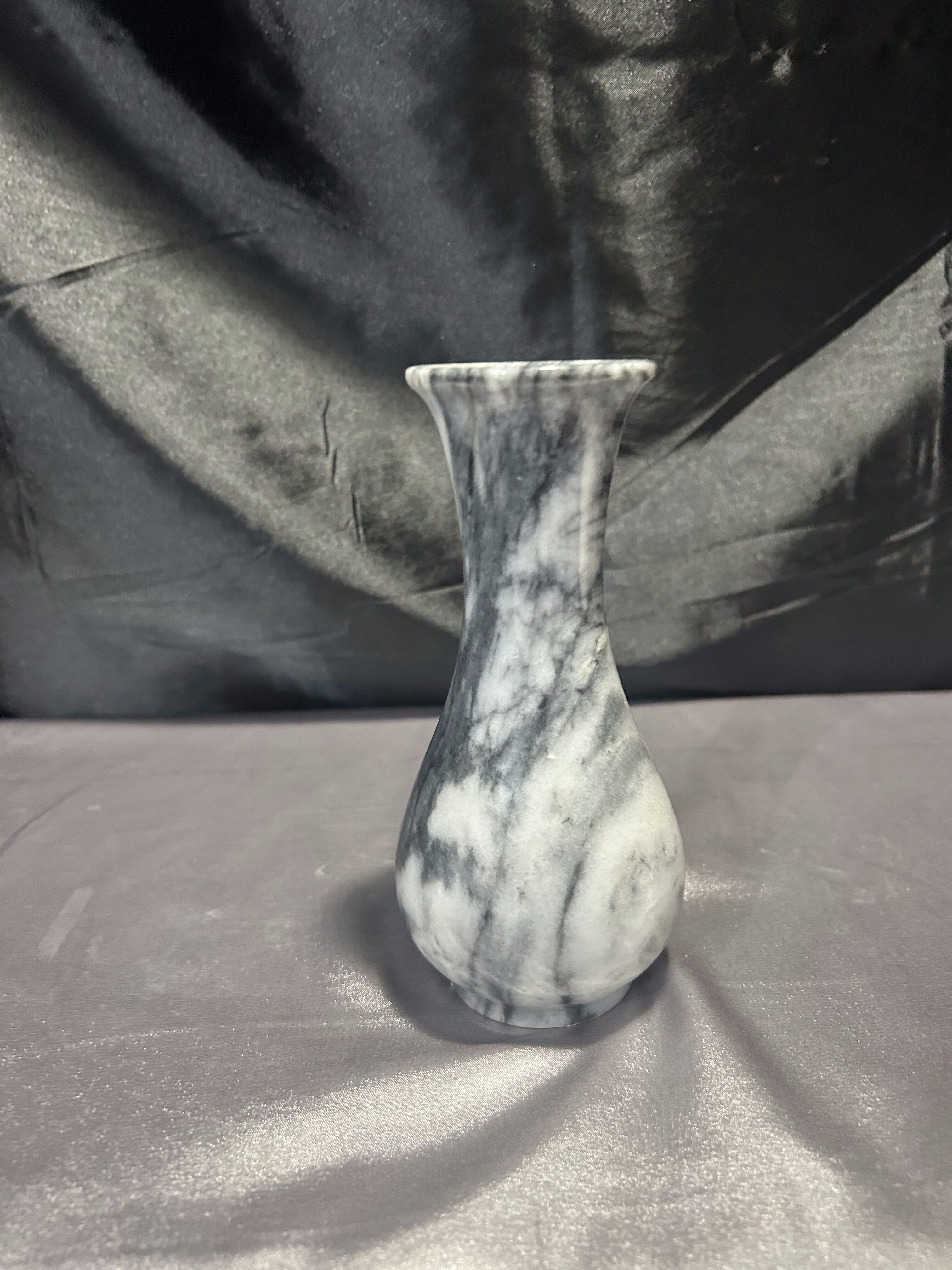Unikalny flakon wykonany z marmuru o pięknych, naturalnych żyłkach, który zachwyca subtelną formą i elegancją surowca. Toczenie podkreśla jego szlachetny kształt i pozwala docenić rysunek kamienia. Doskonały jako dekoracja półki, komody czy parapetu – świetnie komponuje się z wnętrzami klasycznymi, minimalistycznymi i naturalnymi. Można używać go jako flakonik na pojedynczy kwiat lub po prostu jako elegancki akcent dekoracyjny.
