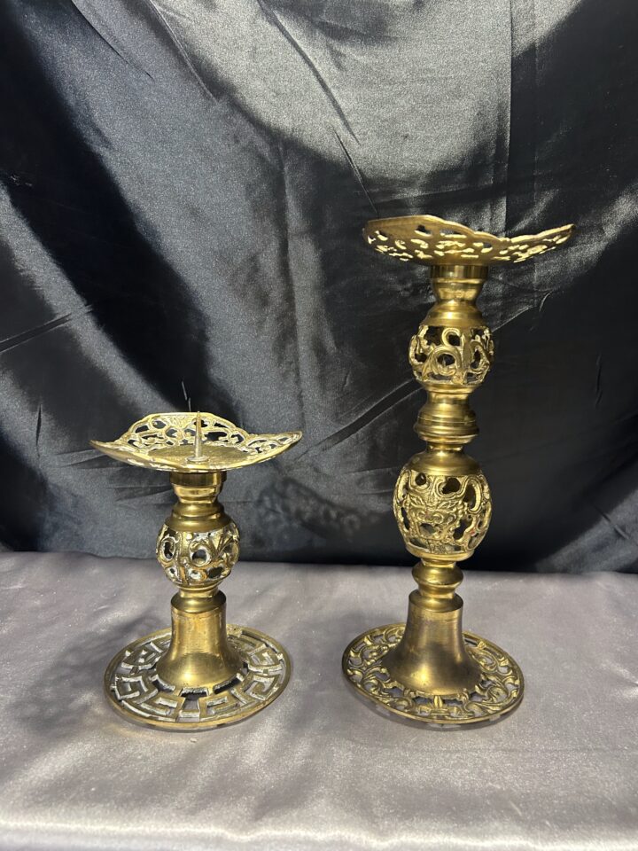 Zestaw Dwóch Mosiężnych Świeczników – Ażurowe Lichtarze na Gromnice