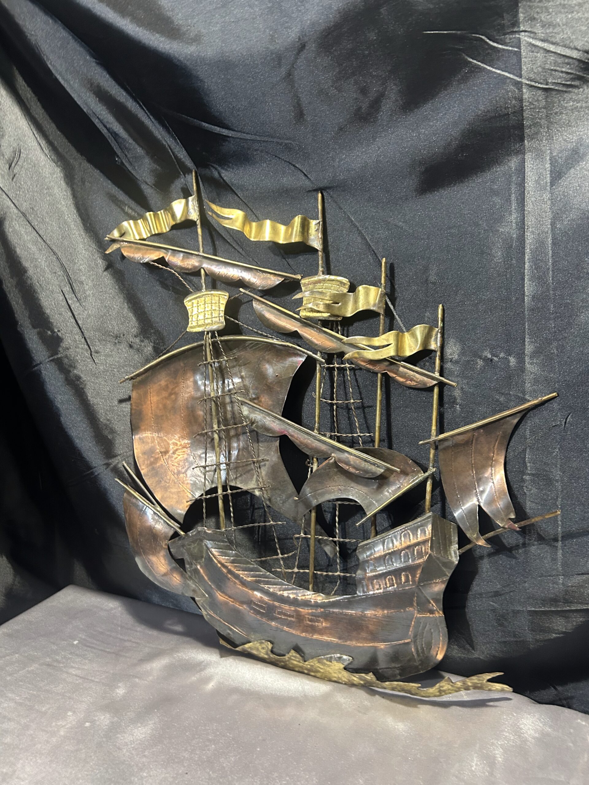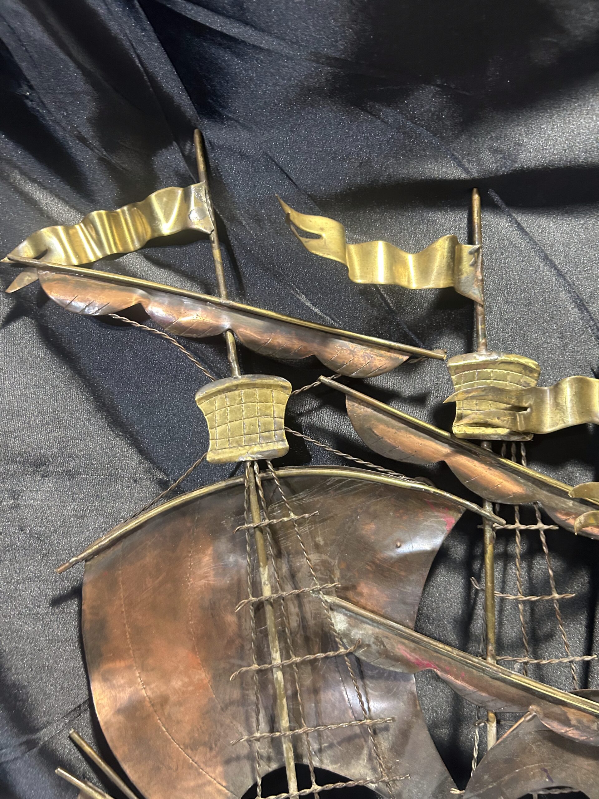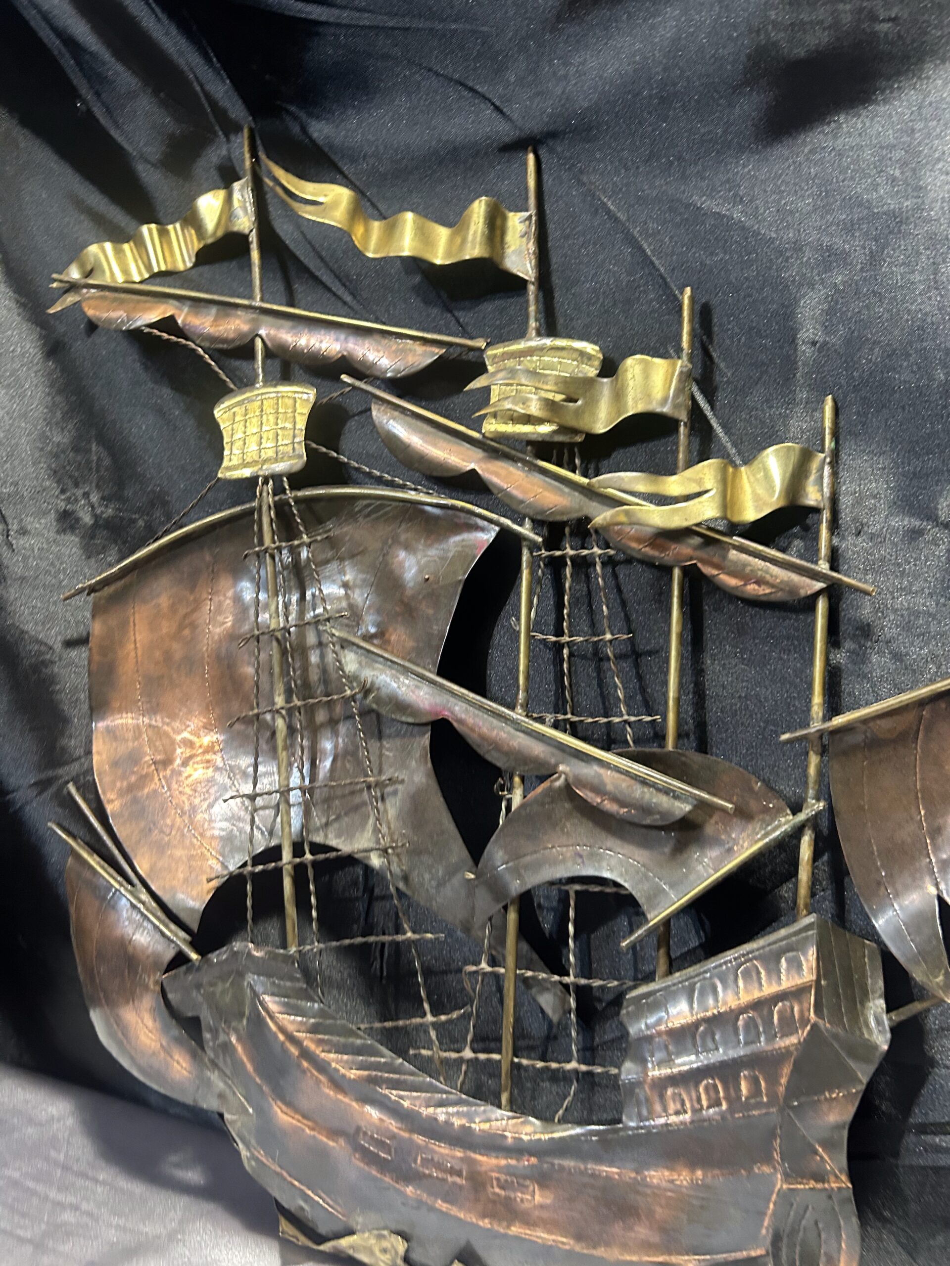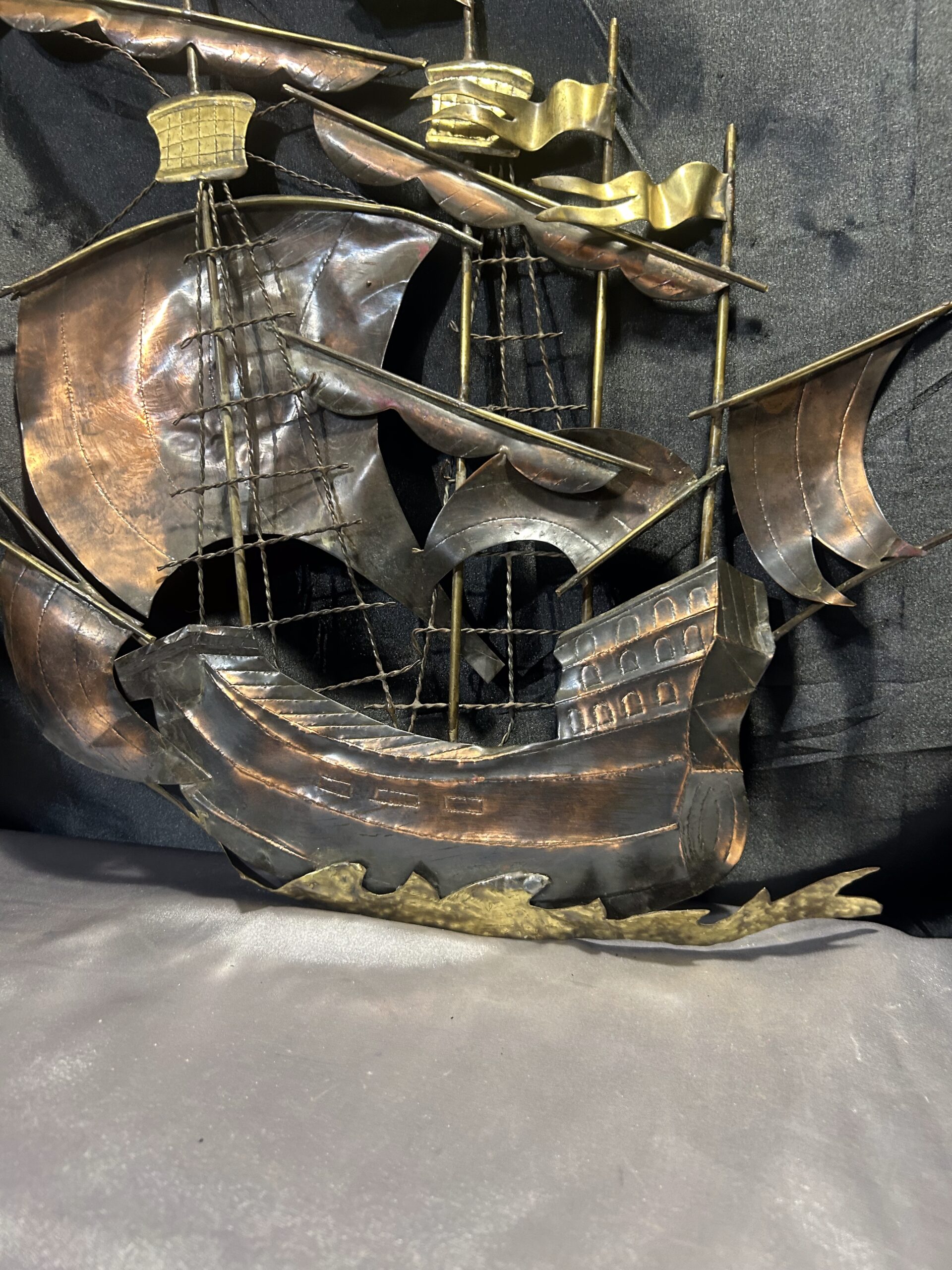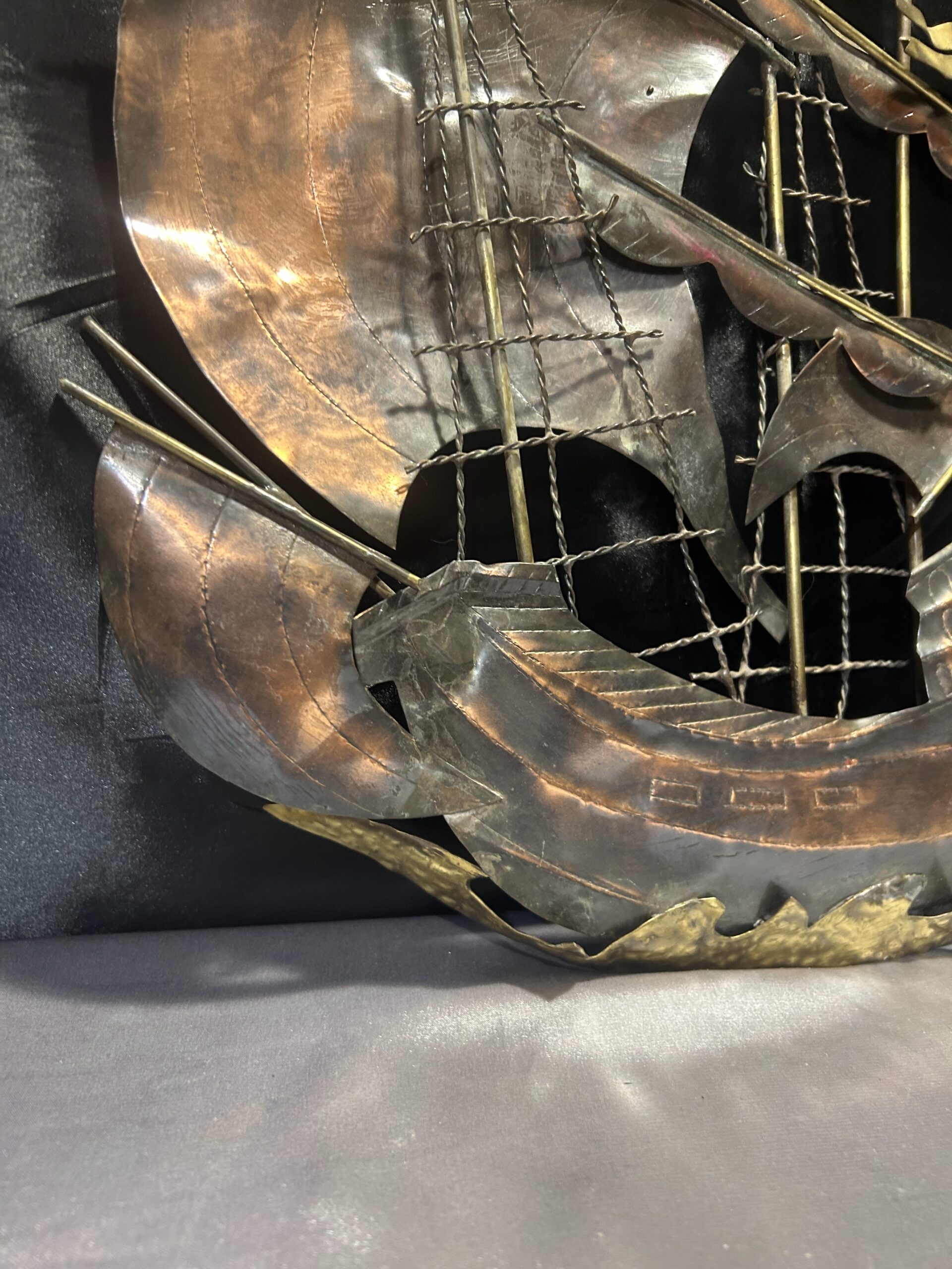 Metalowa płaskorzeźba statku – miedź i mosiądz, unikatowa dekoracja ścienna