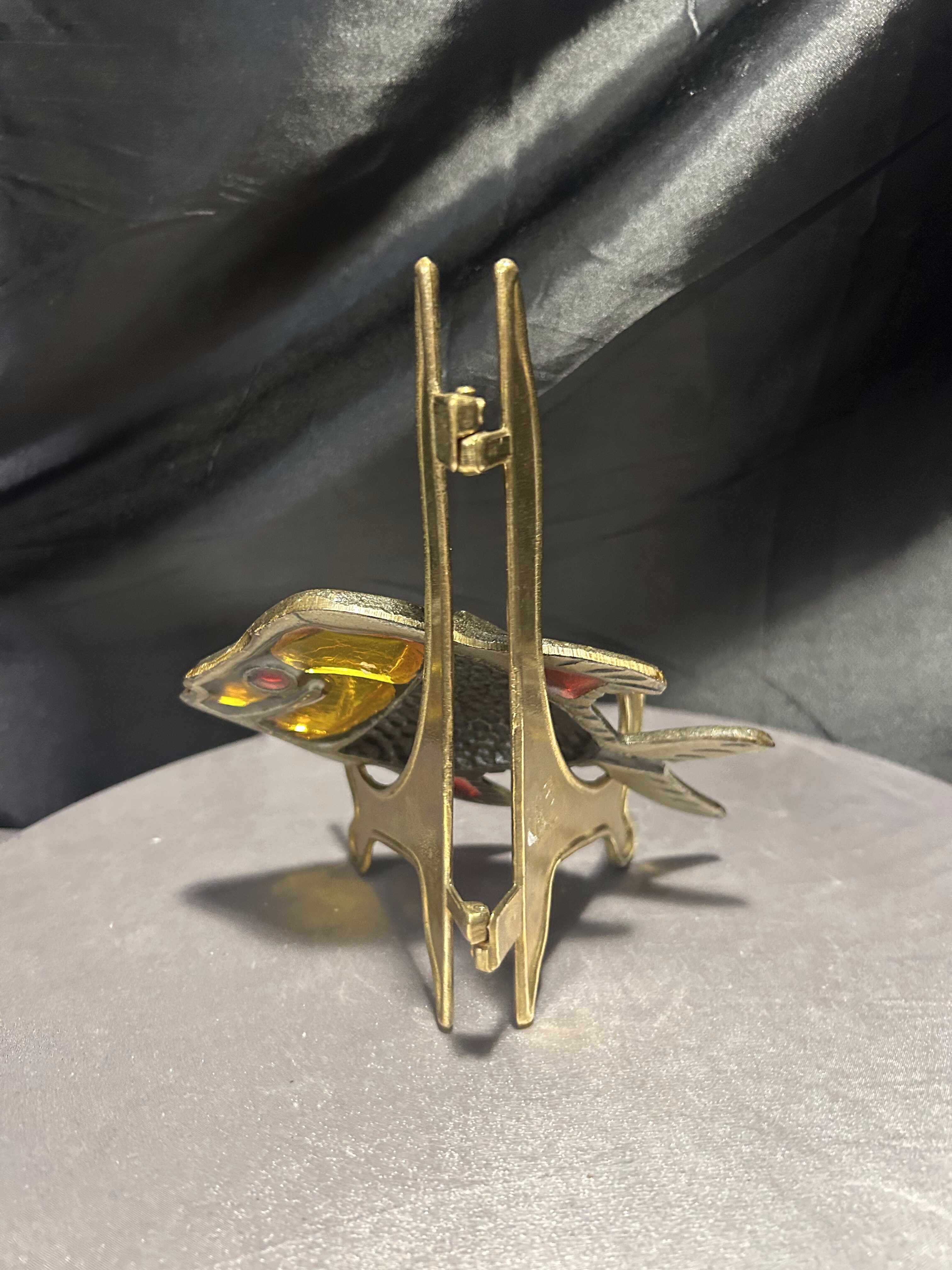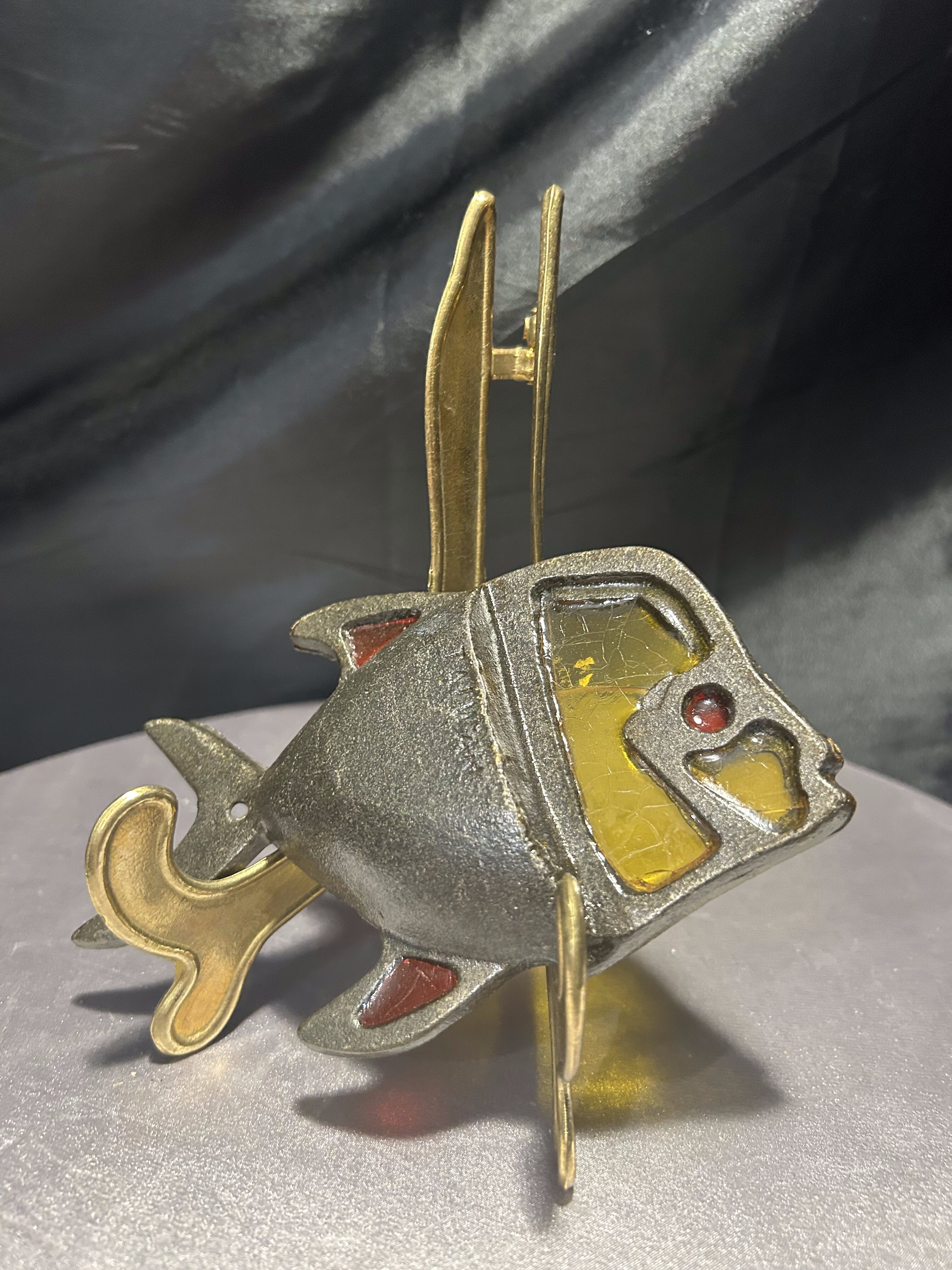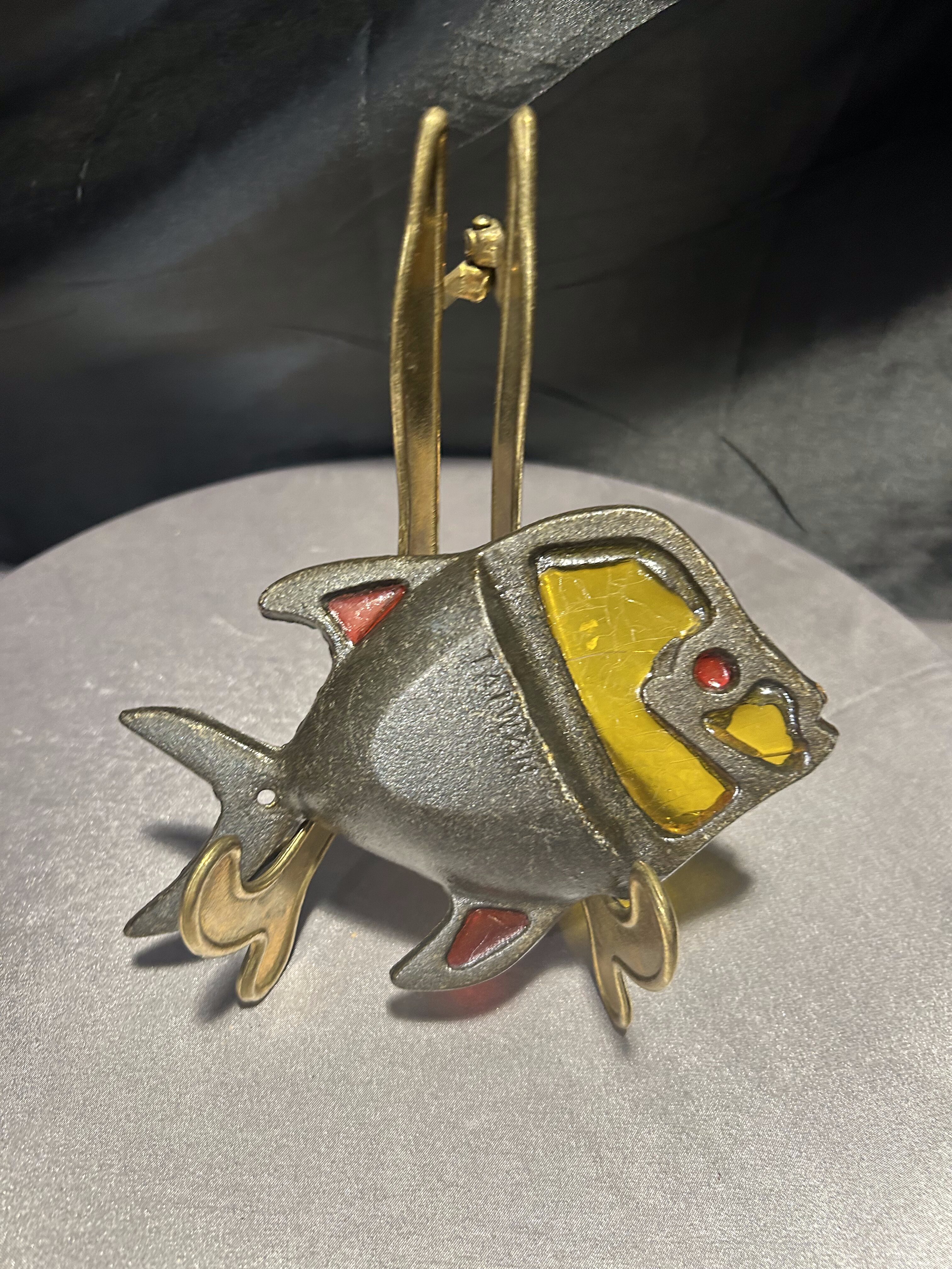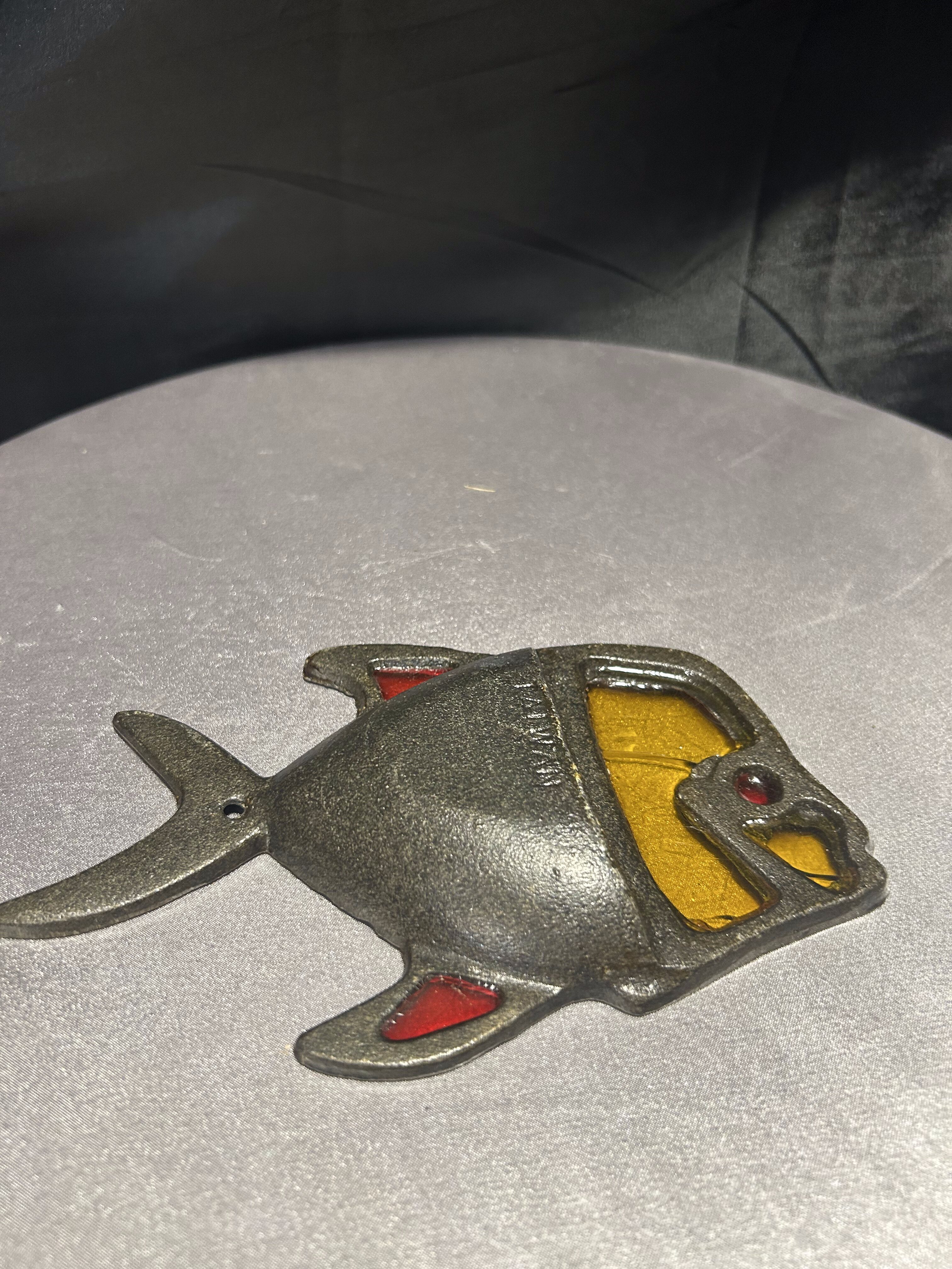 Metalowa podkładka pod garnek – ryba z witrażowym akcentem – sygnowana TAIWAN