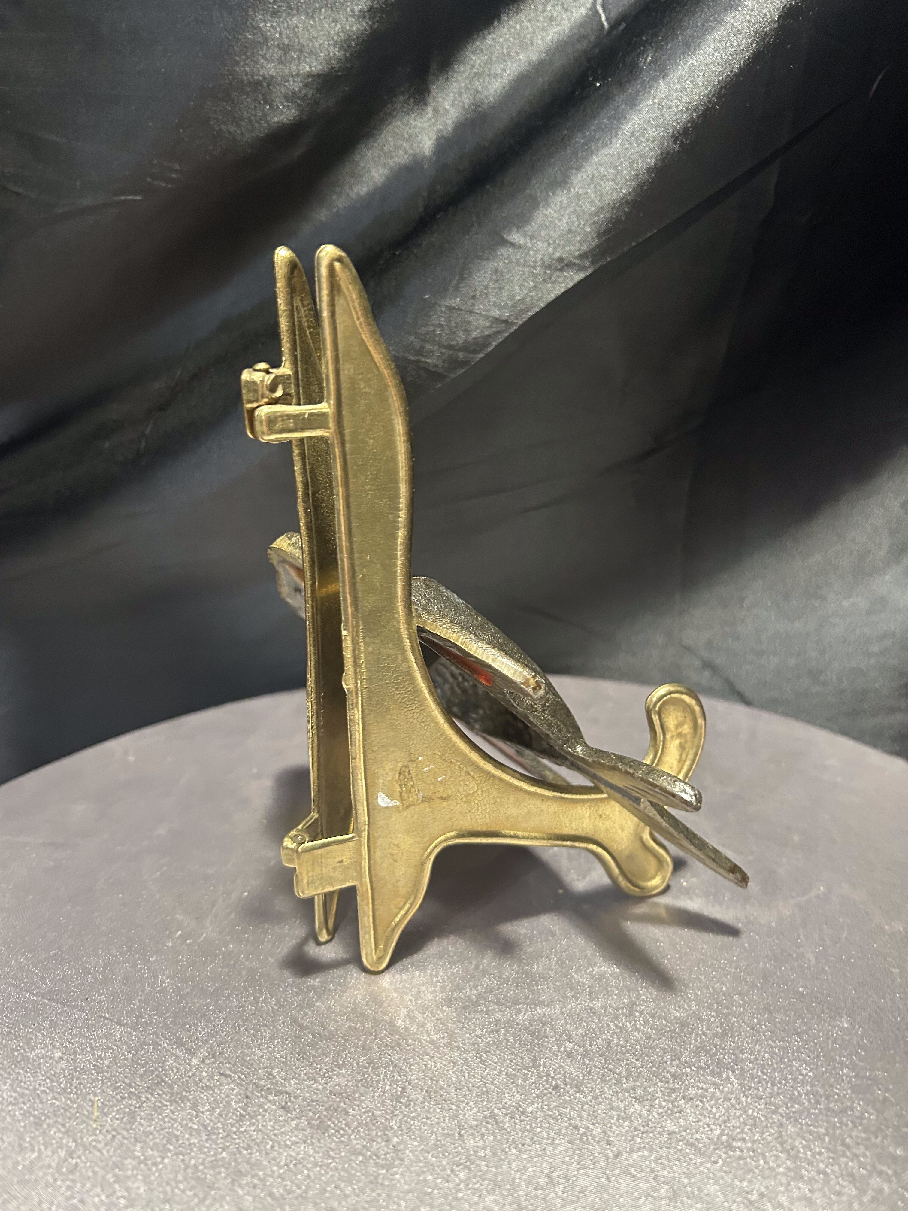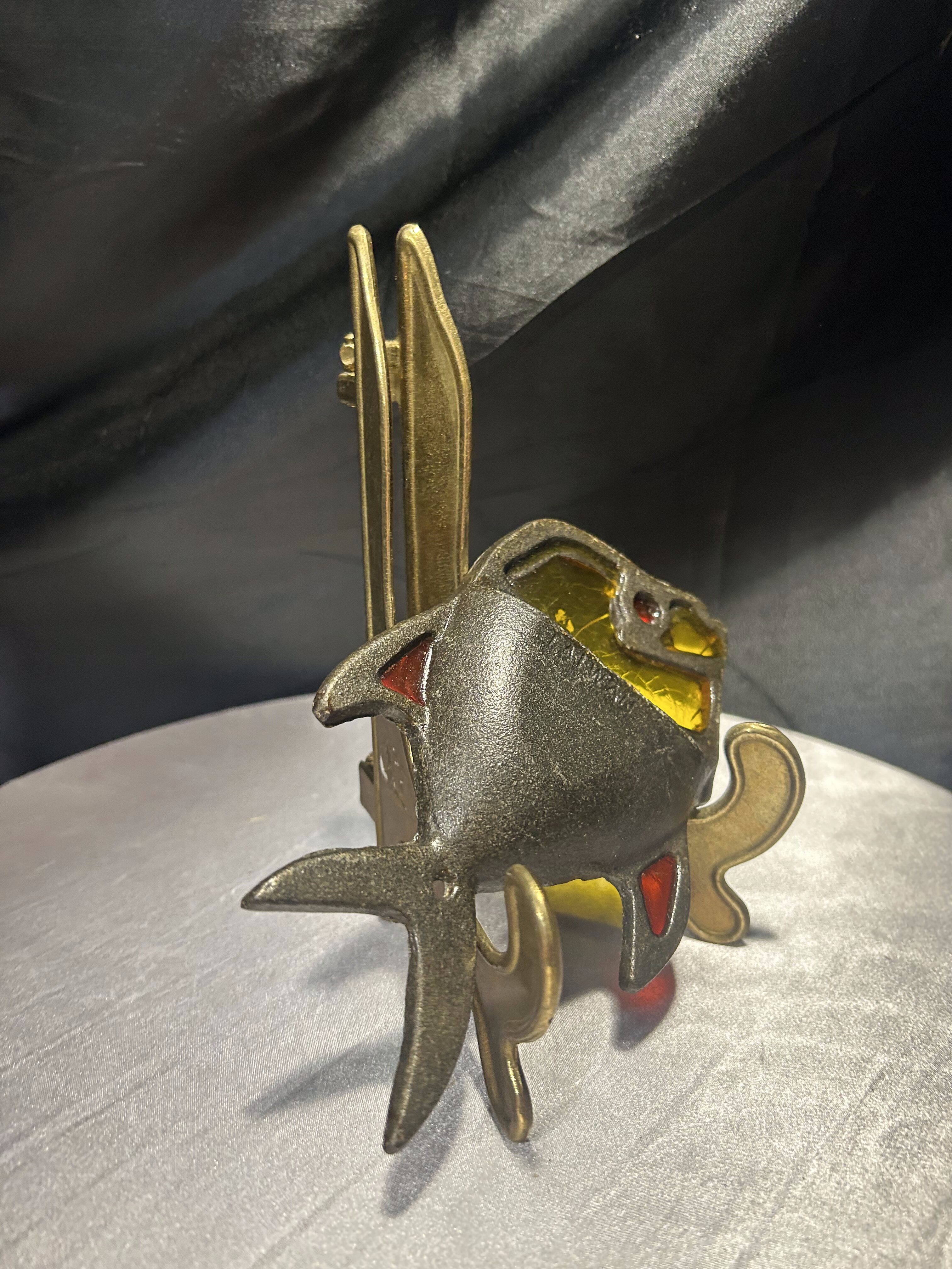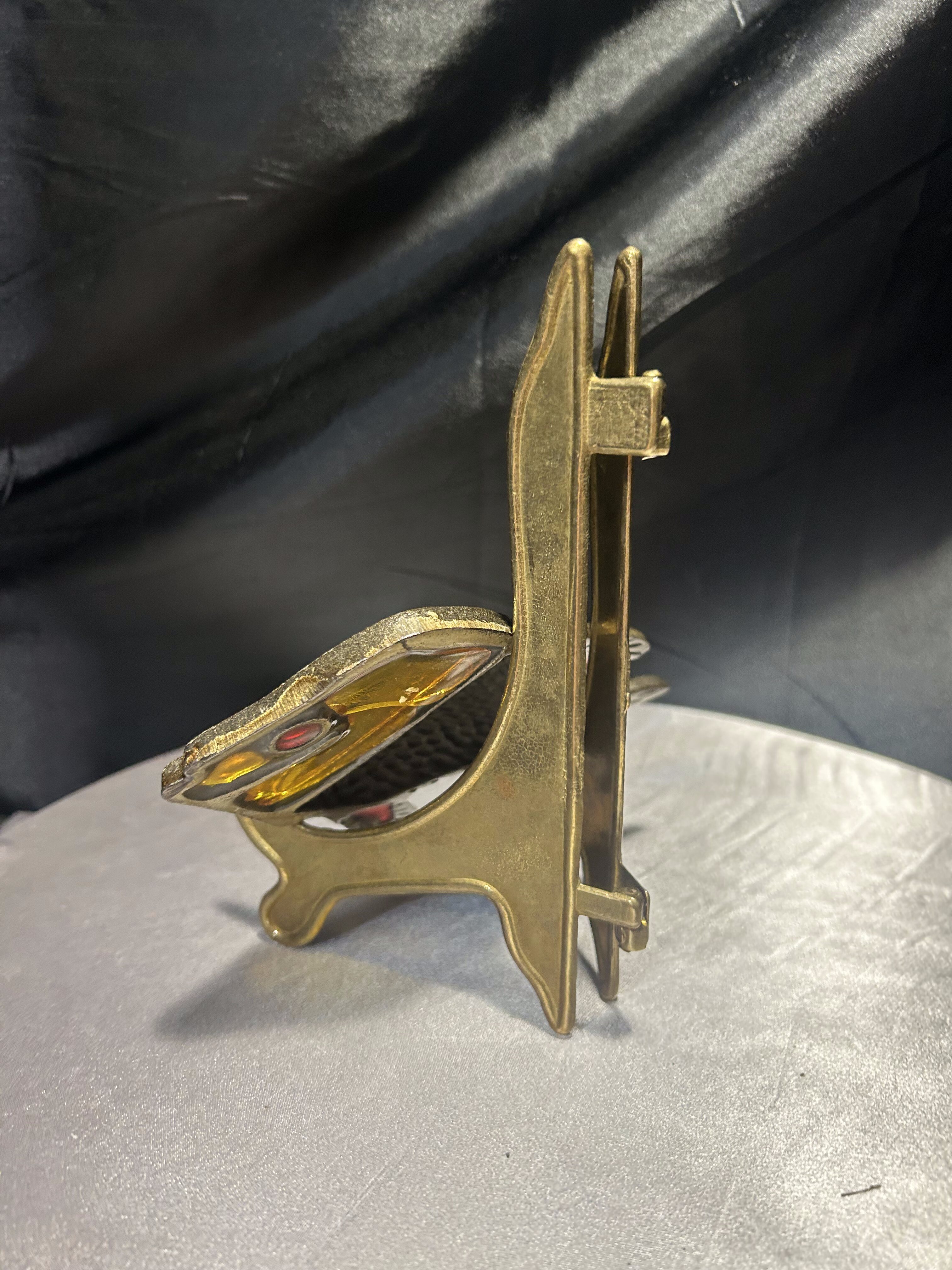 Oryginalna metalowa podkładka pod gorący garnek w kształcie ryby z kolorowymi elementami witrażowymi. Wykonana z solidnego metalu, zdobiona intensywnymi akcentami czerwieni oraz żółtym „szkłem” imitującym witraż. Jeden z żółtych elementów jest pęknięty – zostało to uwzględnione w obniżonej cenie. Podkładka sygnowana tłoczonym napisem TAIWAN, co świadczy o jej pochodzeniu i kolekcjonerskim charakterze. Sprawdzi się zarówno jako praktyczny dodatek do kuchni, jak i dekoracyjna podstawka o niecodziennym wyglądzie.
