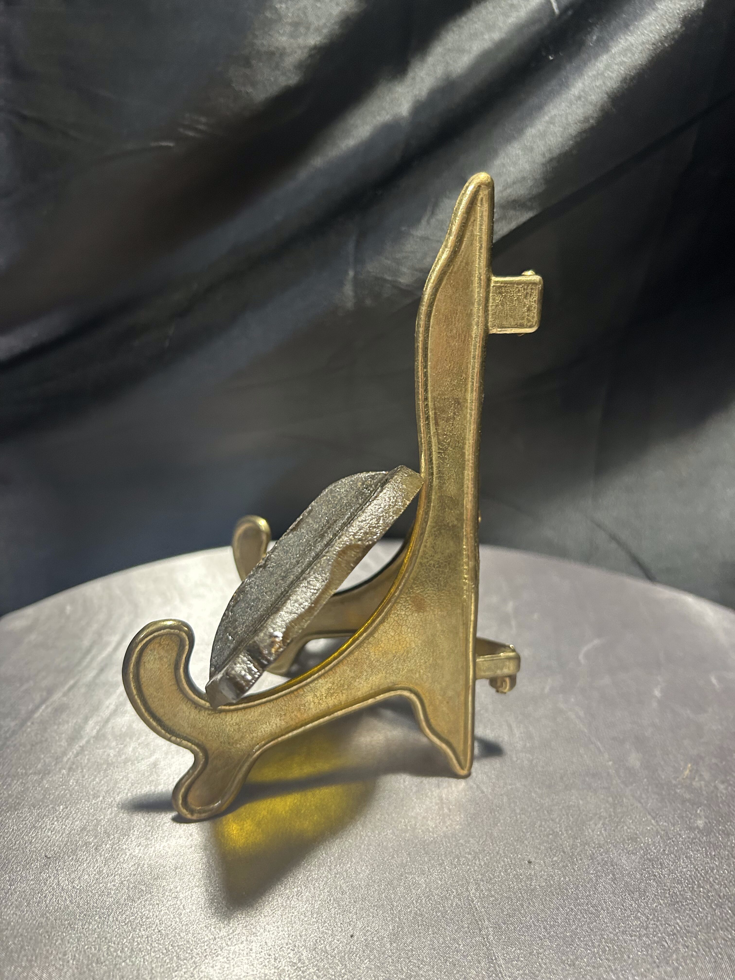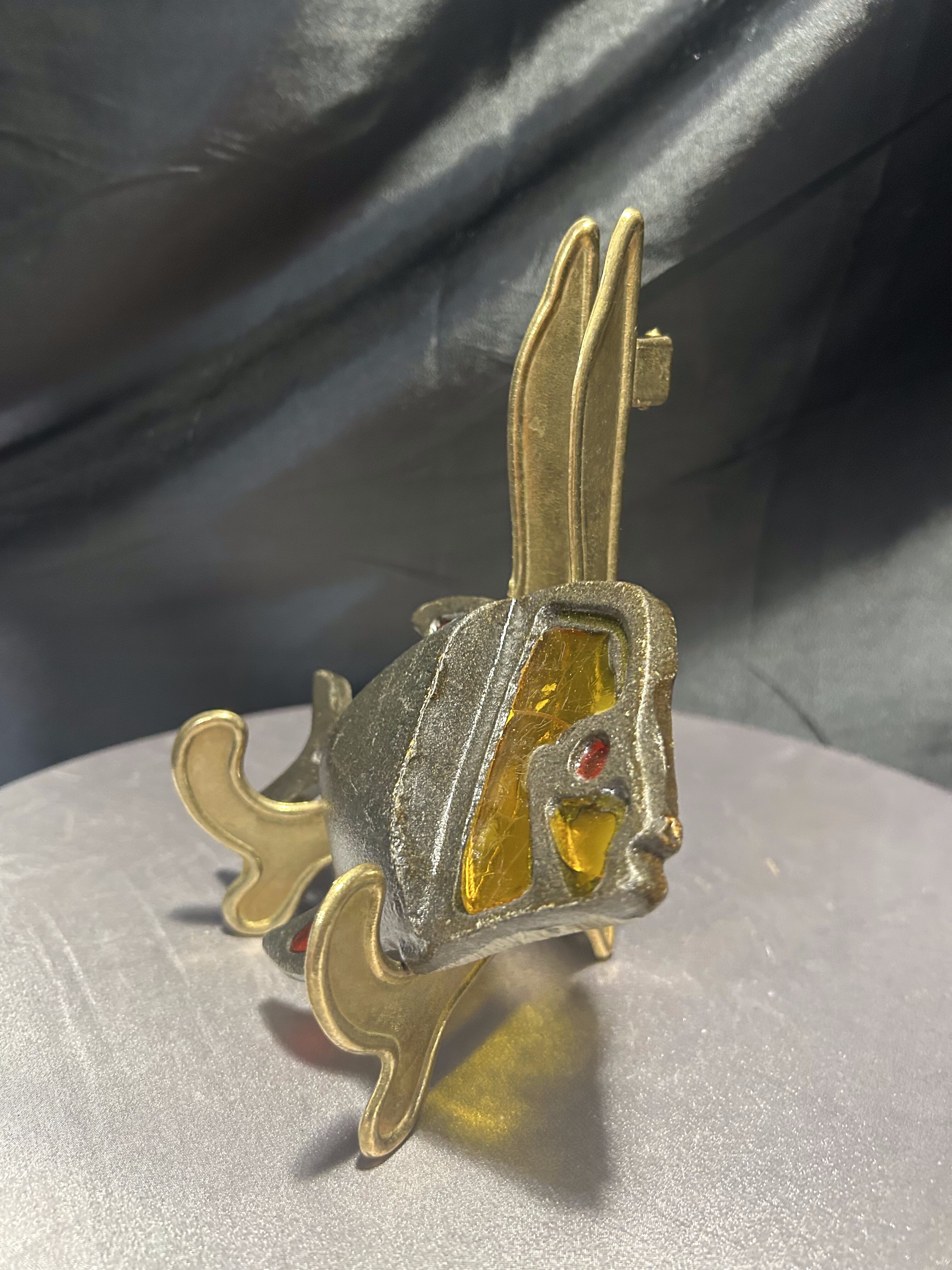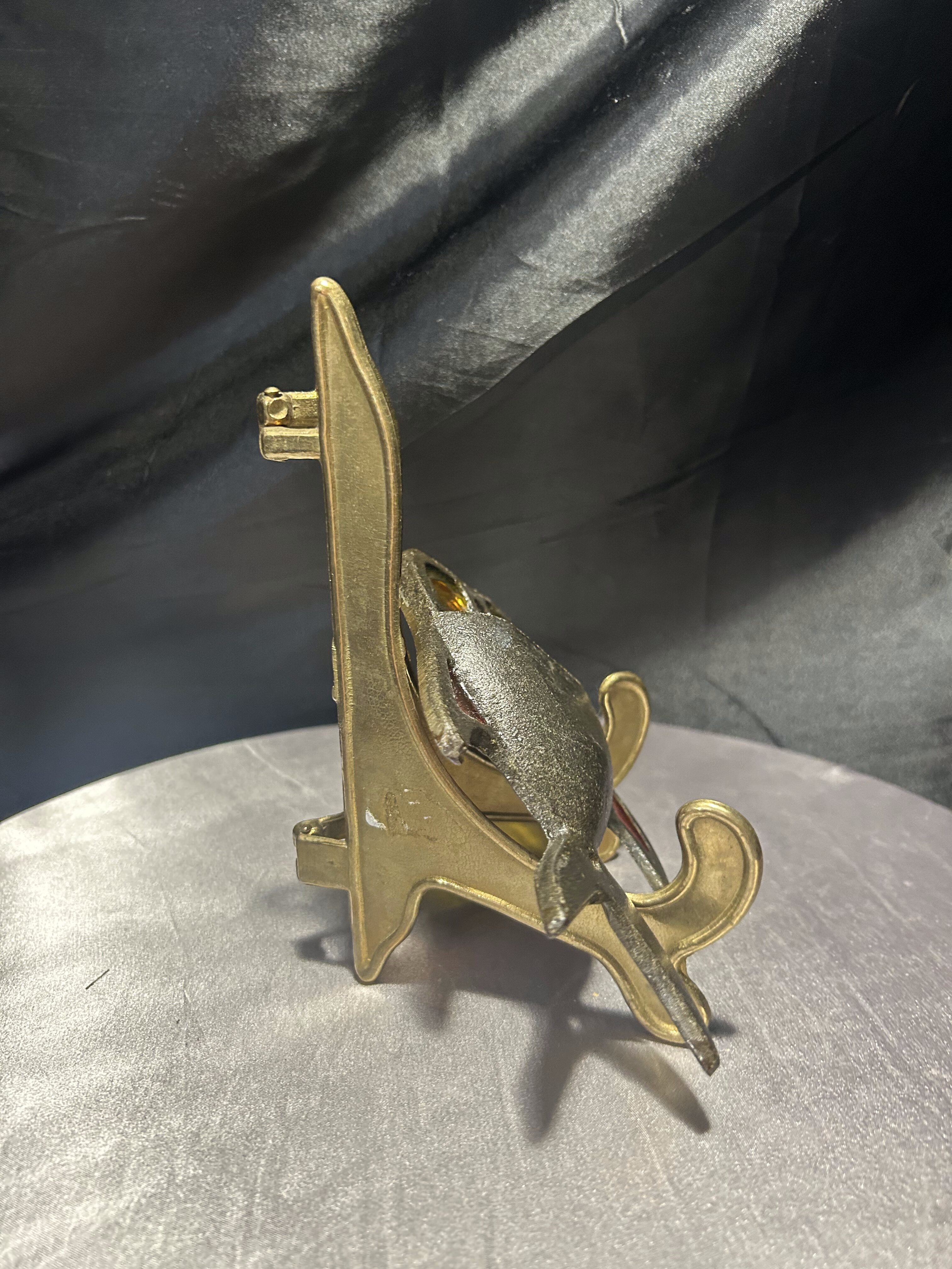 Oryginalna metalowa podkładka pod gorący garnek w kształcie ryby z kolorowymi elementami witrażowymi. Wykonana z solidnego metalu, zdobiona intensywnymi akcentami czerwieni oraz żółtym „szkłem” imitującym witraż. Jeden z żółtych elementów jest pęknięty – zostało to uwzględnione w obniżonej cenie. Podkładka sygnowana tłoczonym napisem TAIWAN, co świadczy o jej pochodzeniu i kolekcjonerskim charakterze. Sprawdzi się zarówno jako praktyczny dodatek do kuchni, jak i dekoracyjna podstawka o niecodziennym wyglądzie.