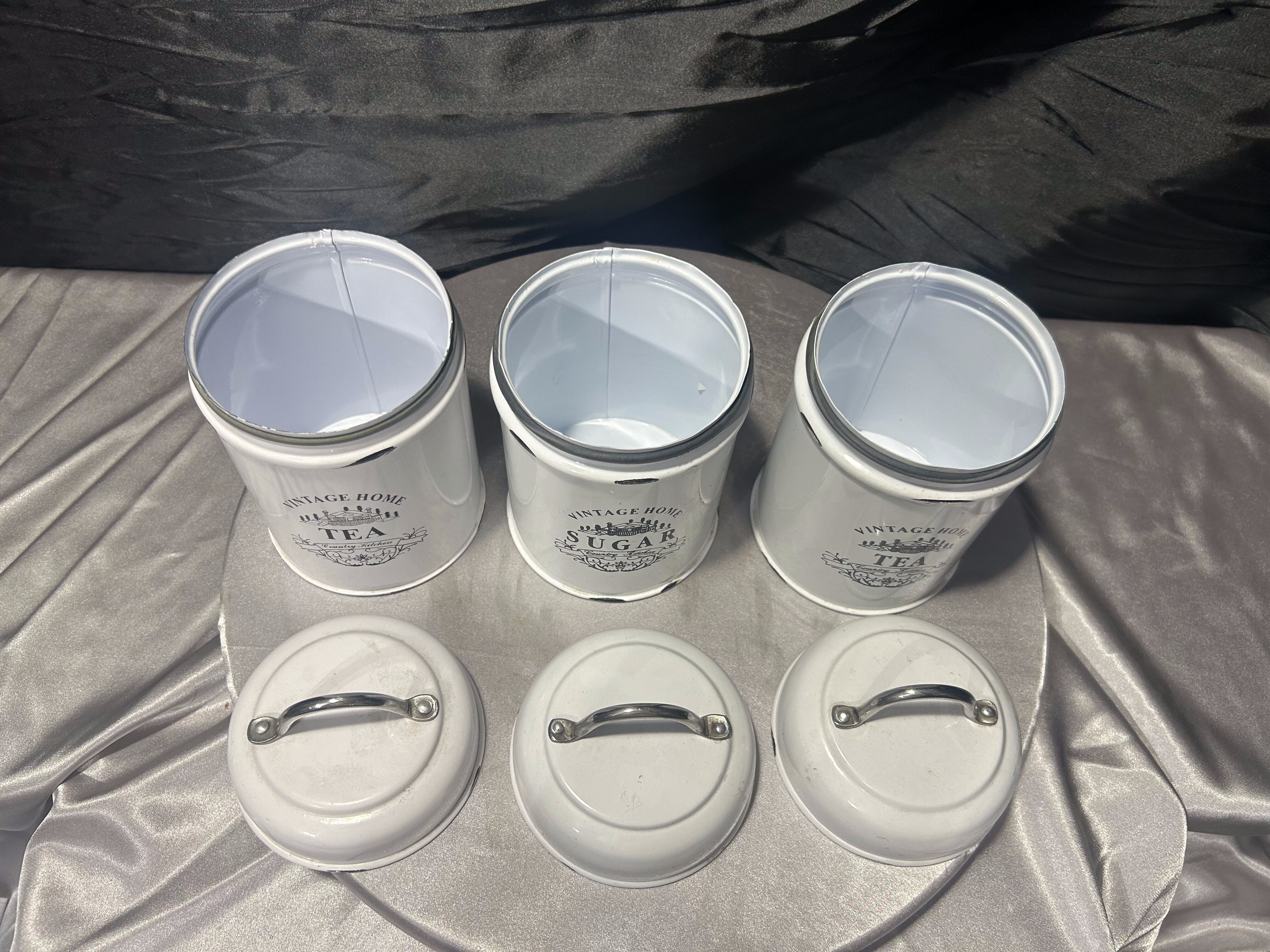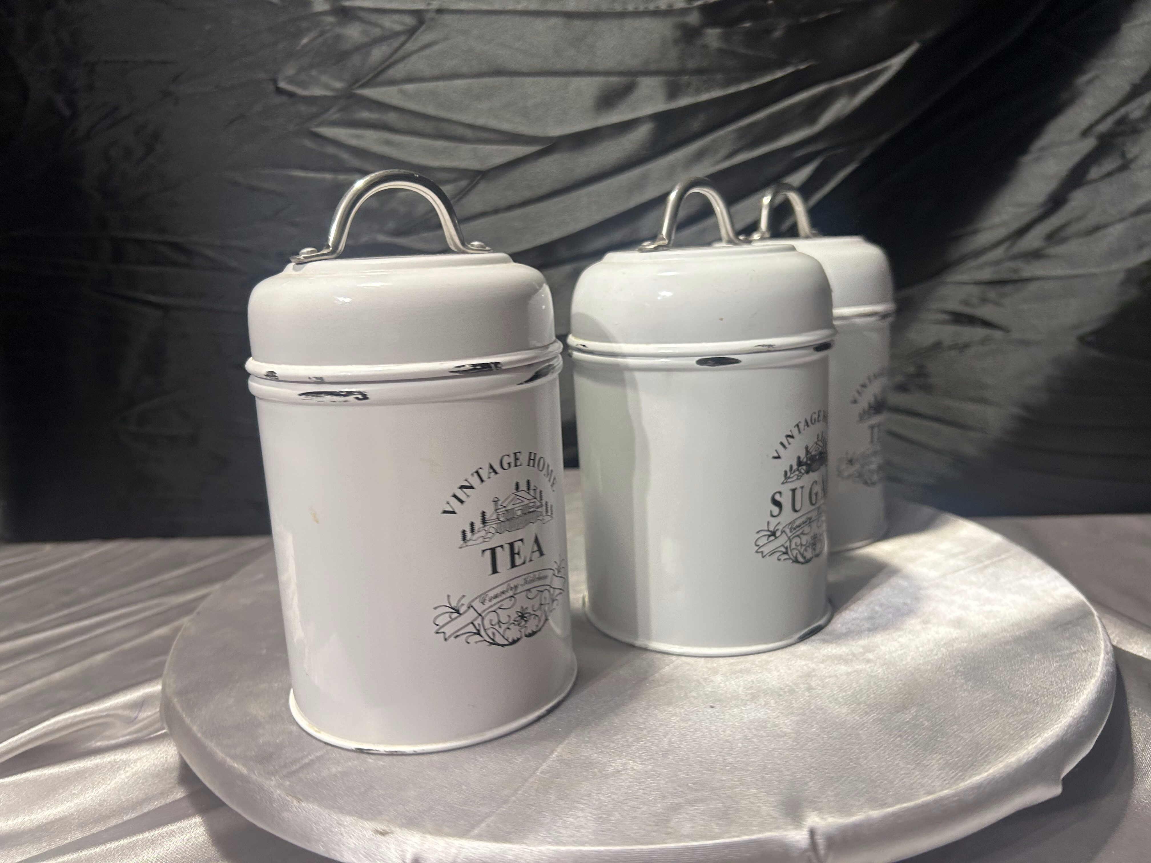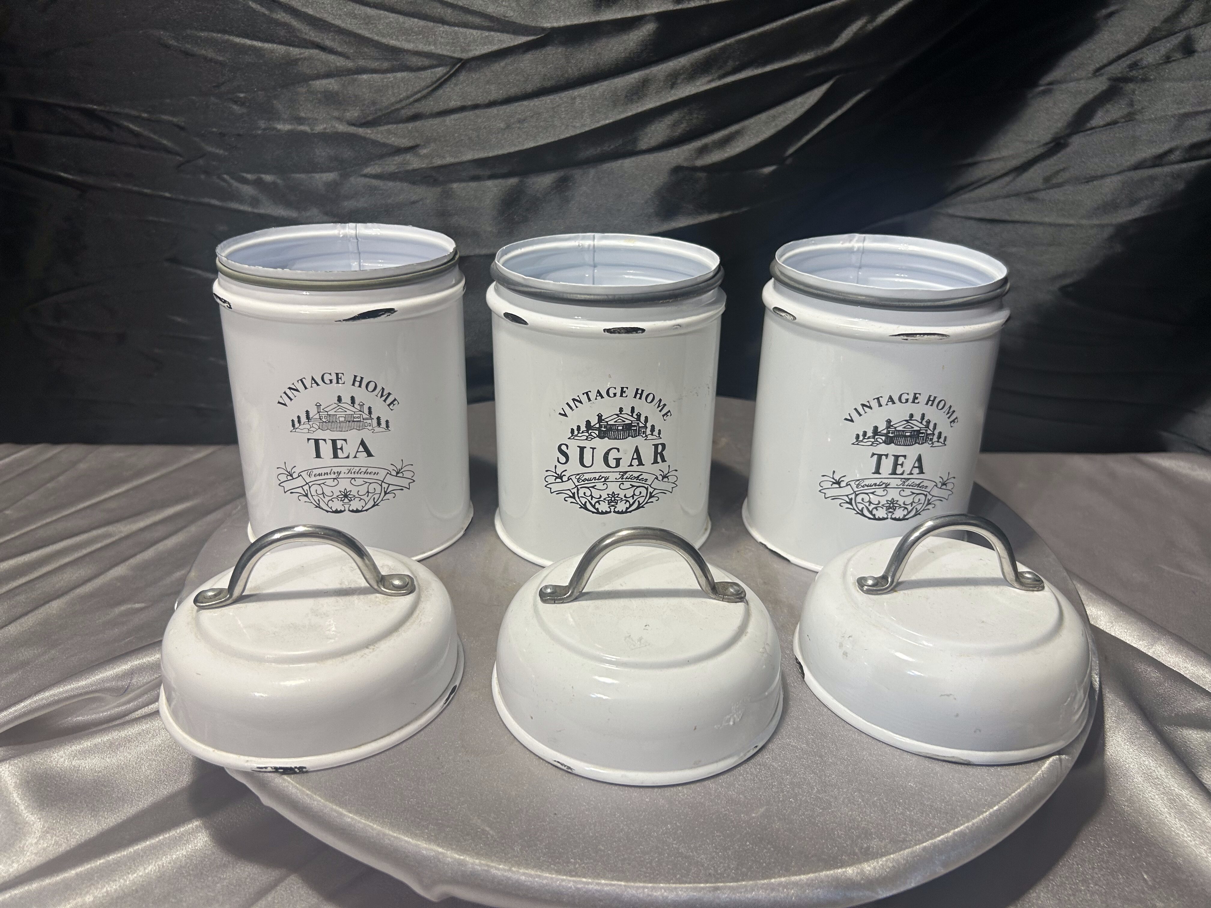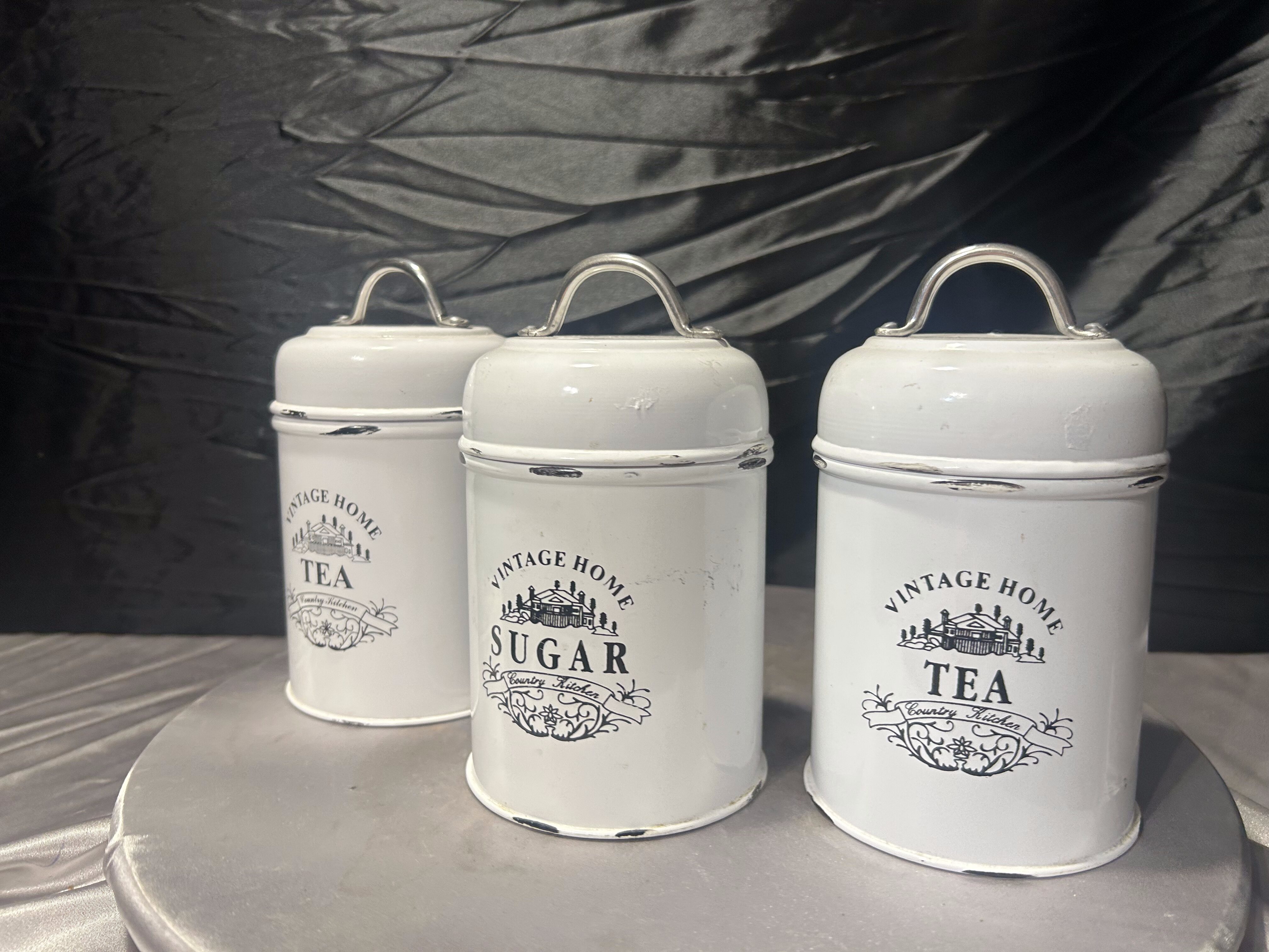 Metalowe pojemniki kuchenne Tea i Sugar komplet 3 sztuki styl vintage biały