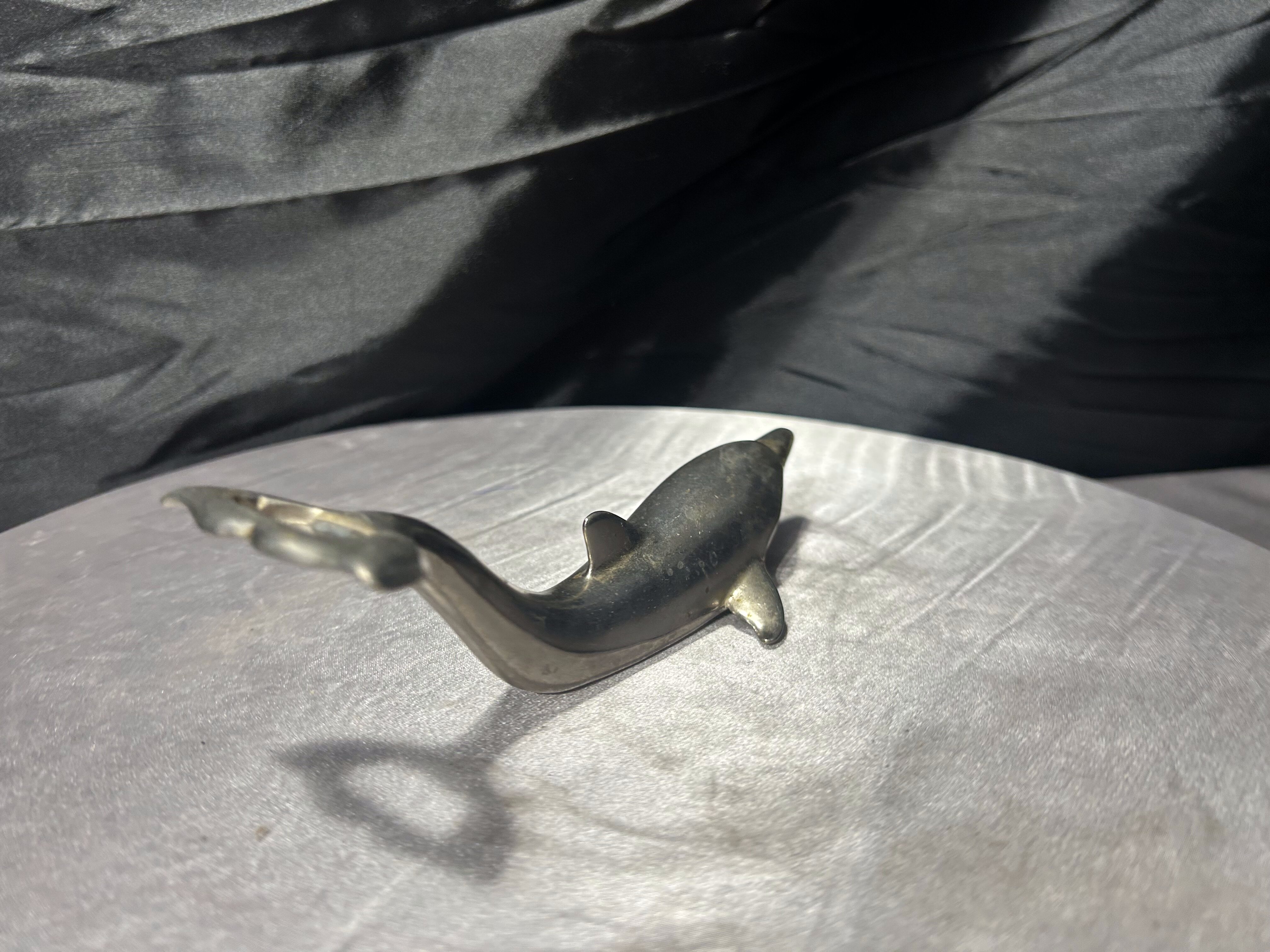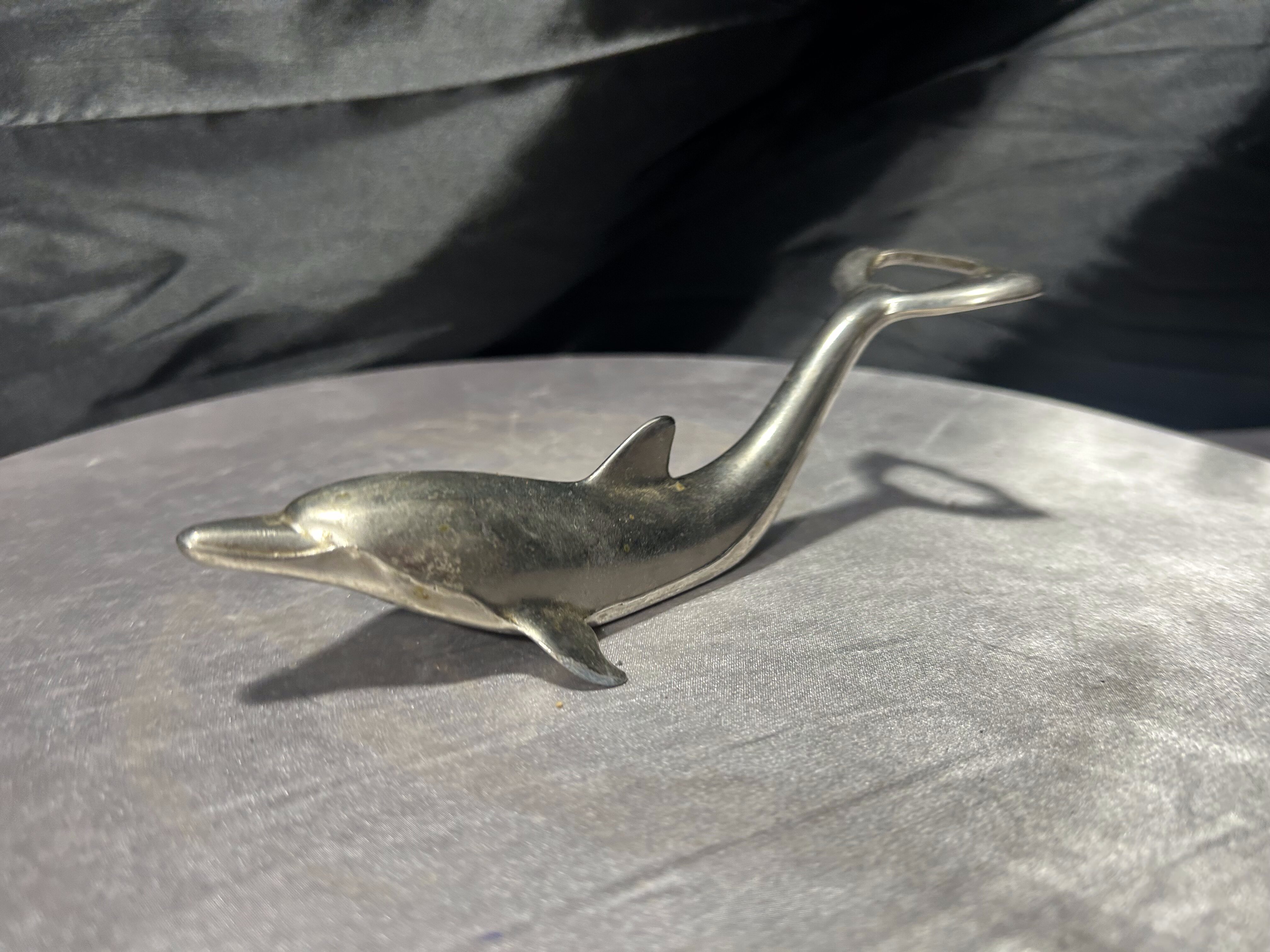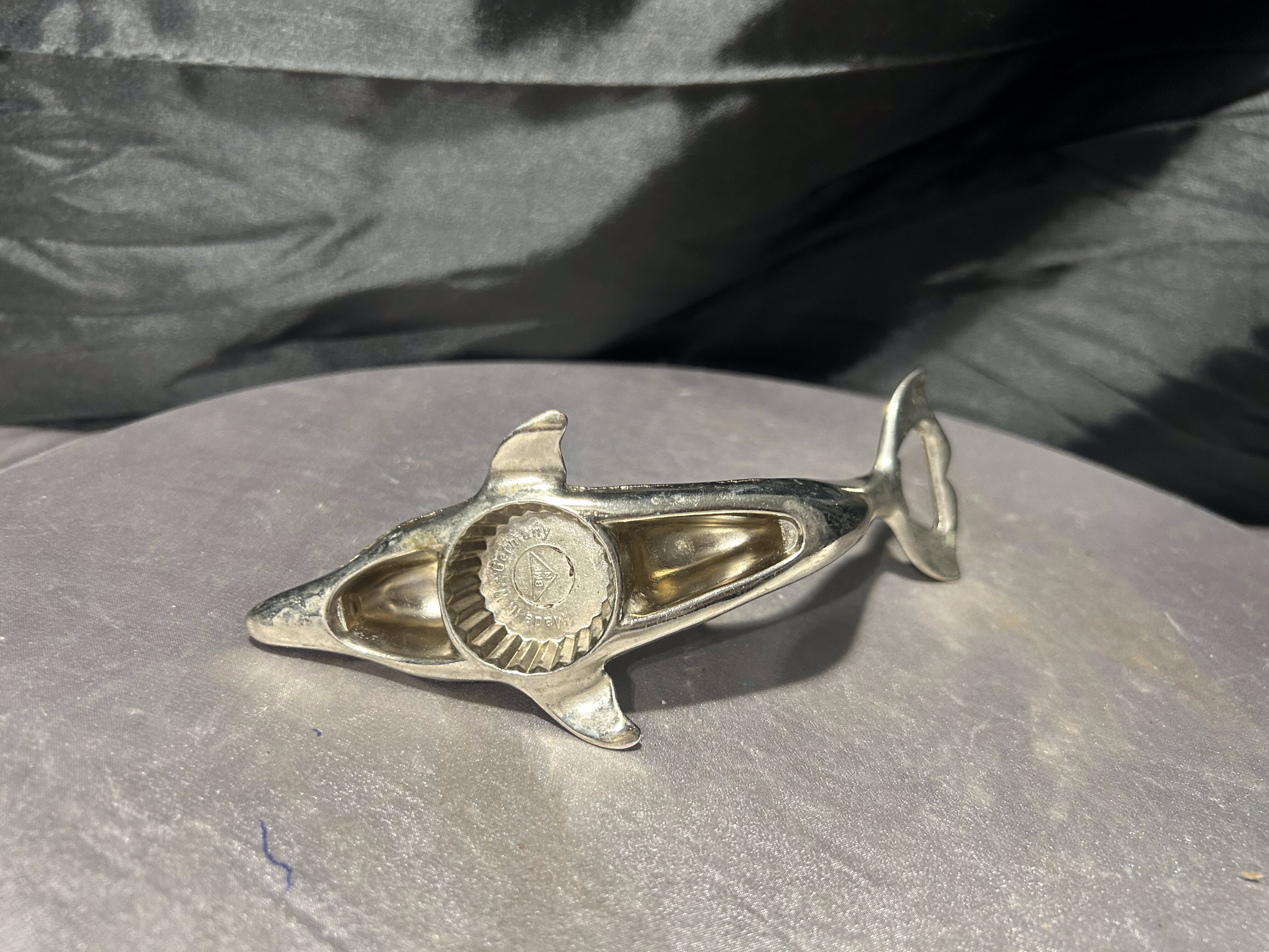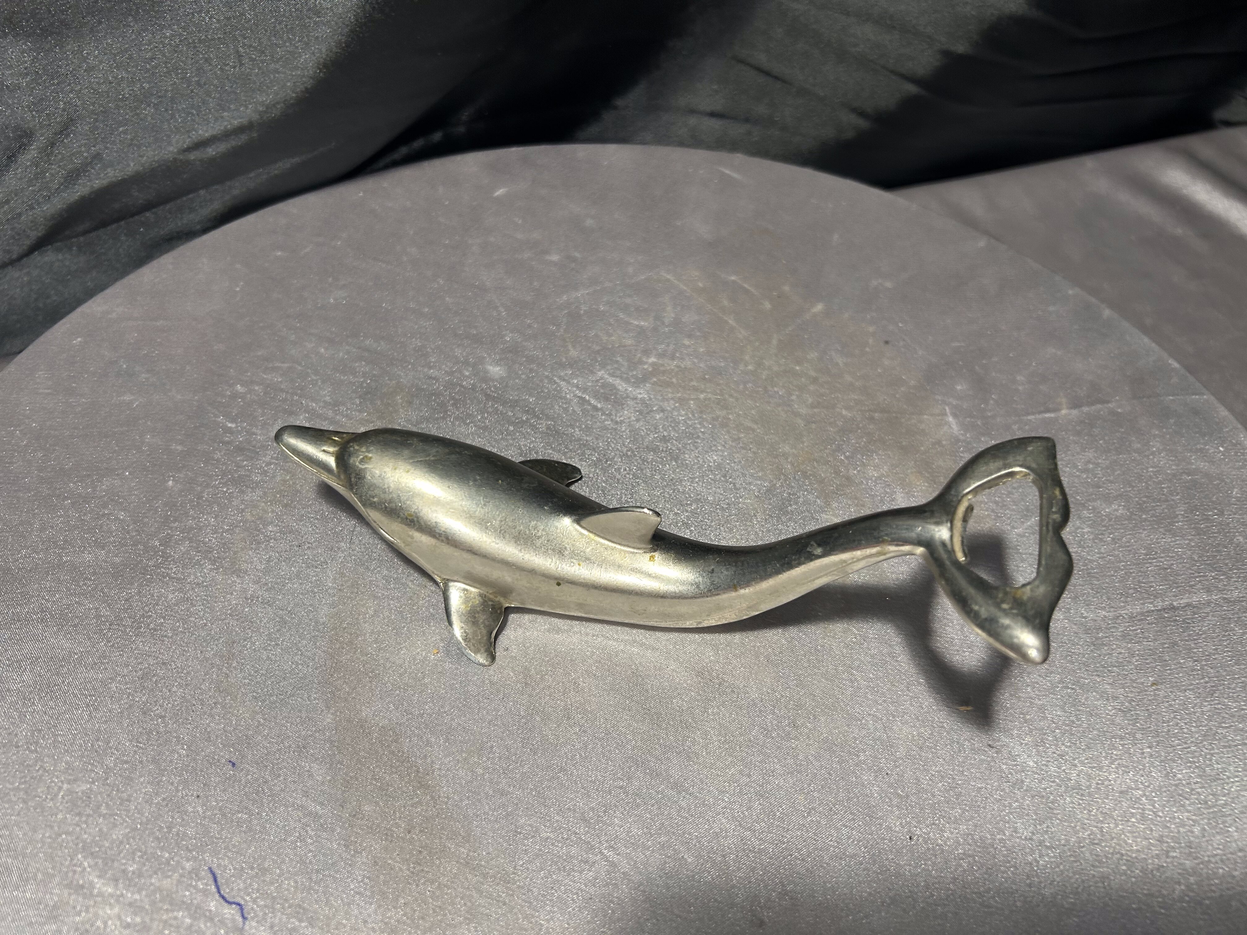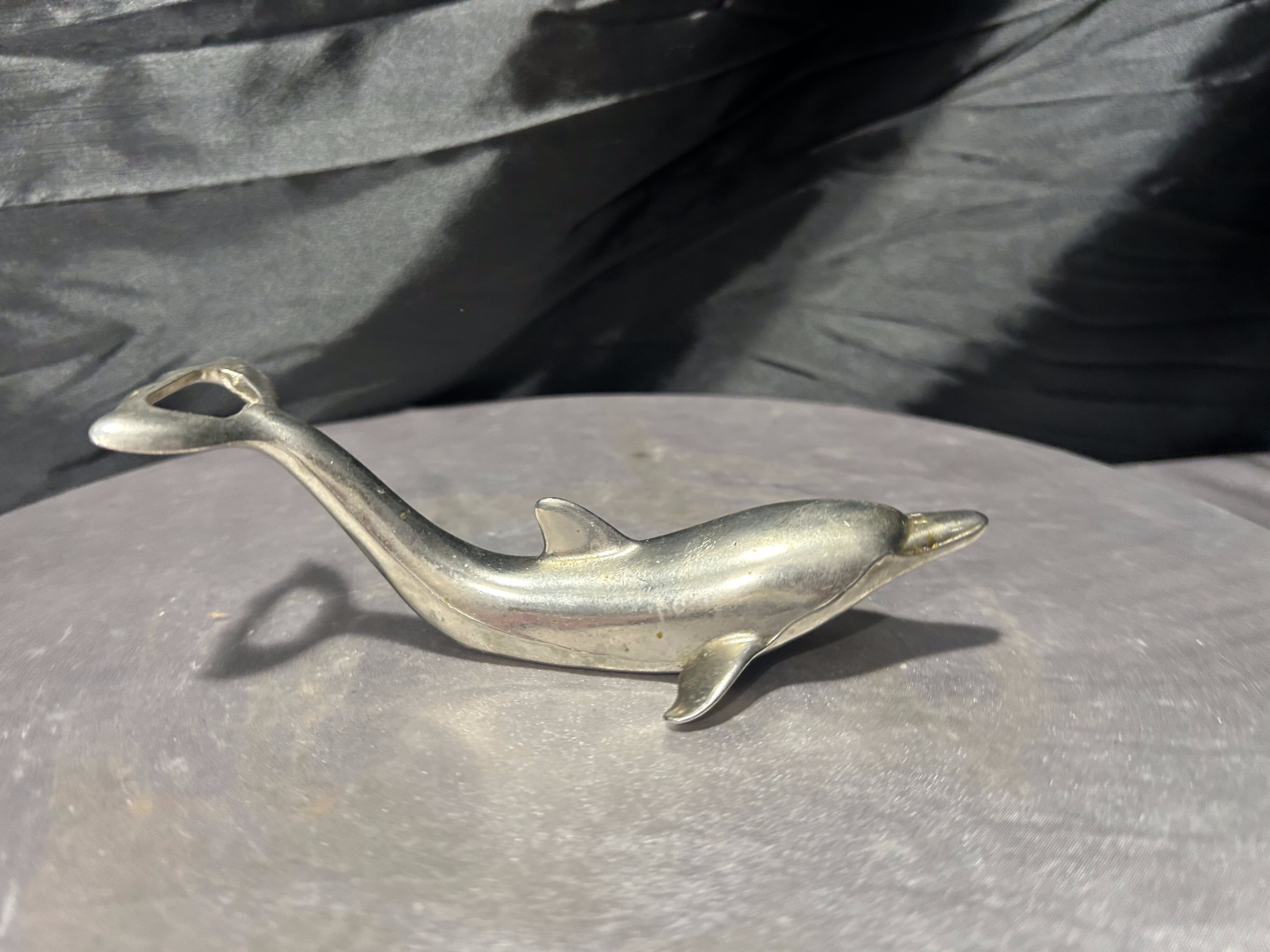 Dekoracyjny metalowy delfin, który pełni jednocześnie funkcję podwójnego otwieracza do butelek. Smukła, dynamiczna sylwetka zwierzęcia została starannie uformowana, a całość łączy walory estetyczne z praktycznym zastosowaniem. Otwieracze zostały dyskretnie wkomponowane w formę, dzięki czemu przedmiot zachowuje dekoracyjny charakter.