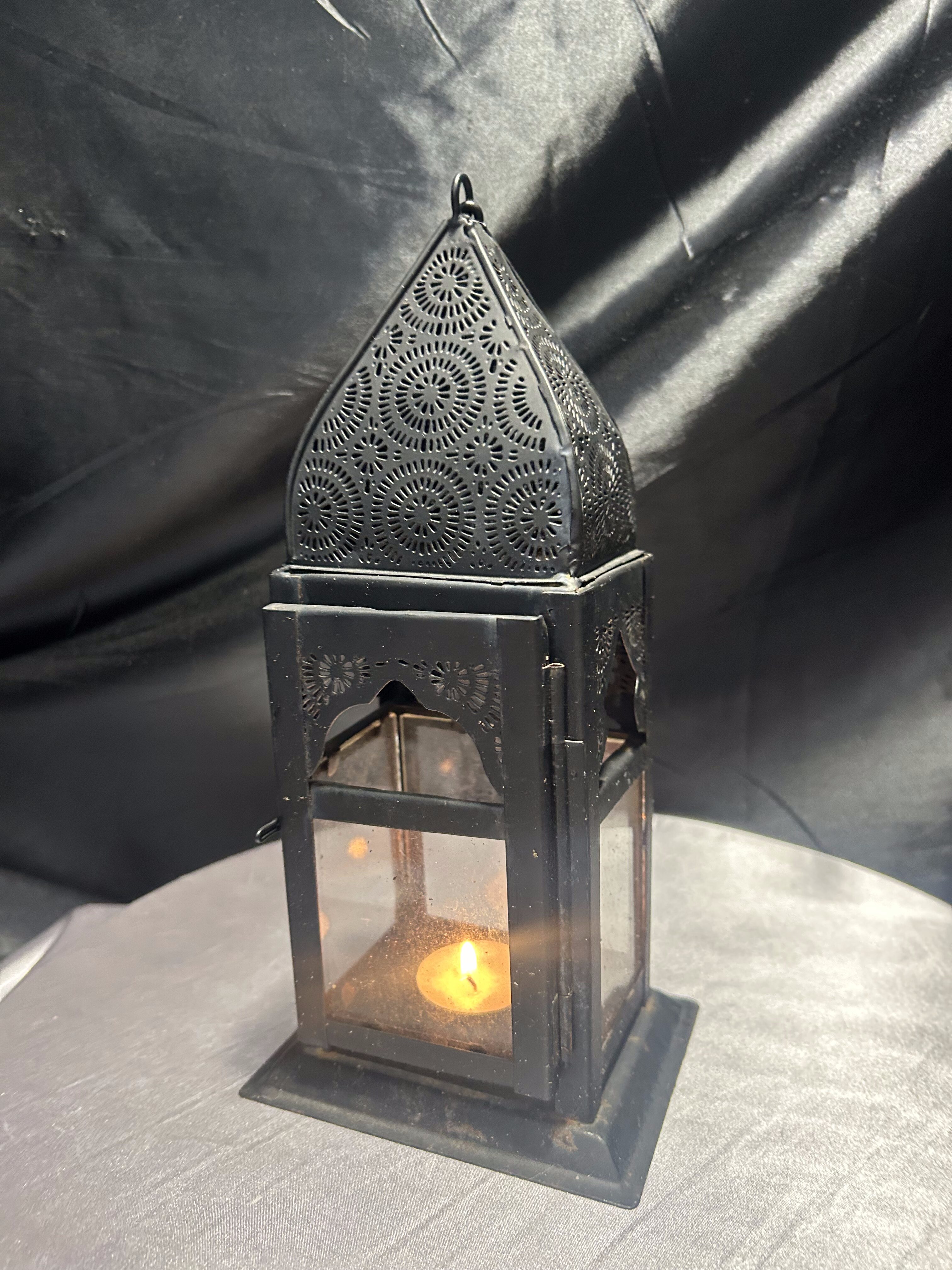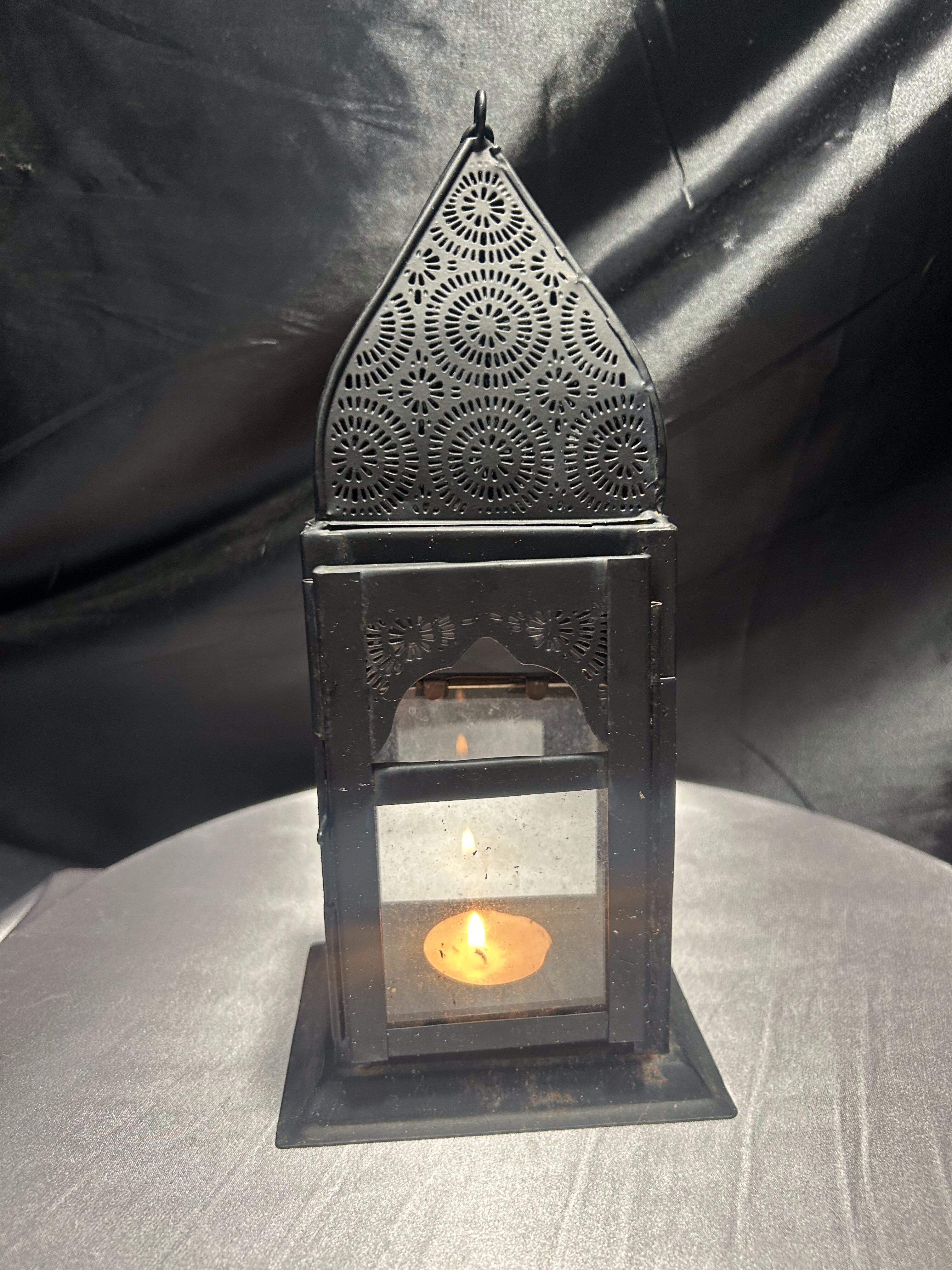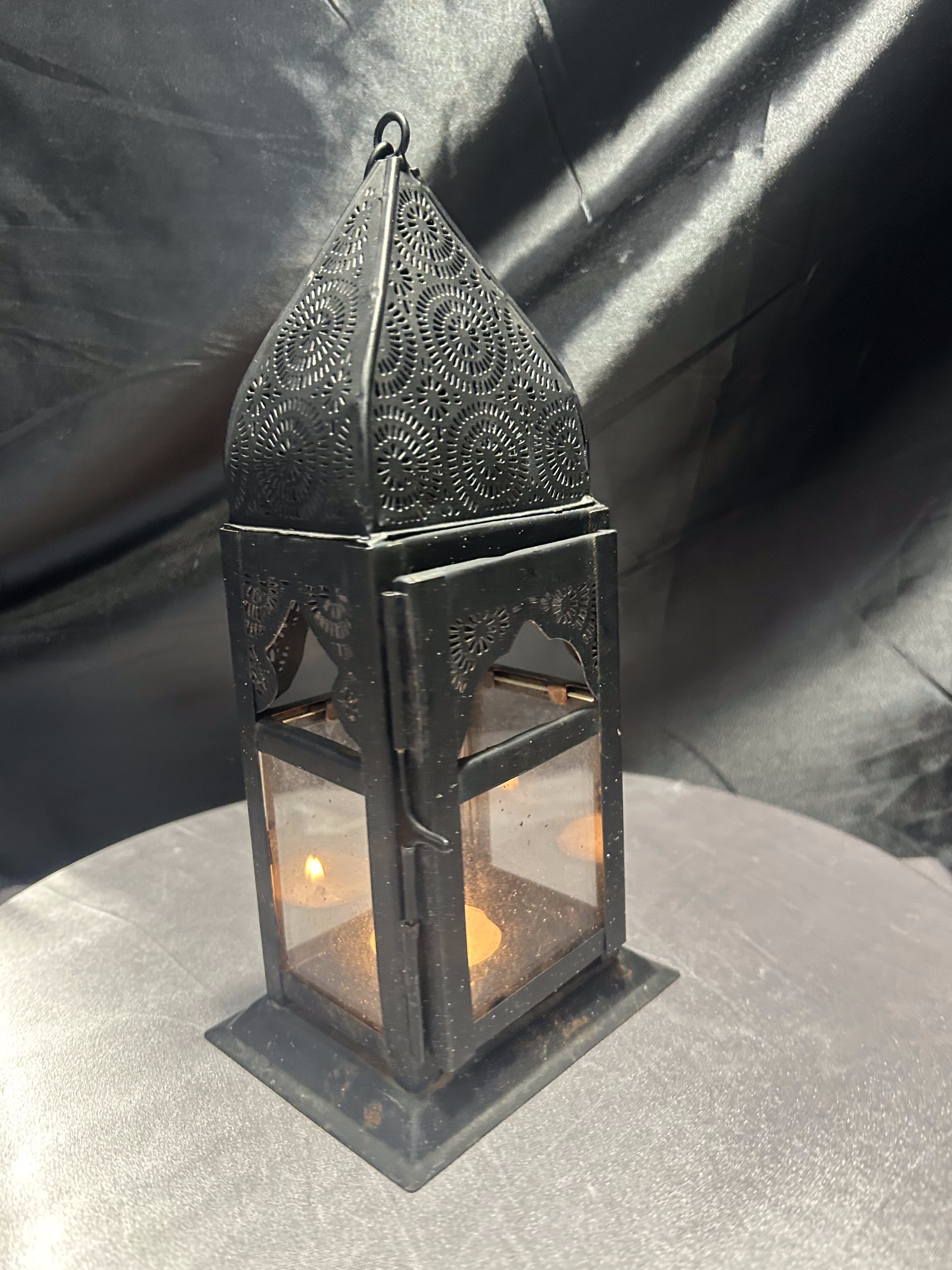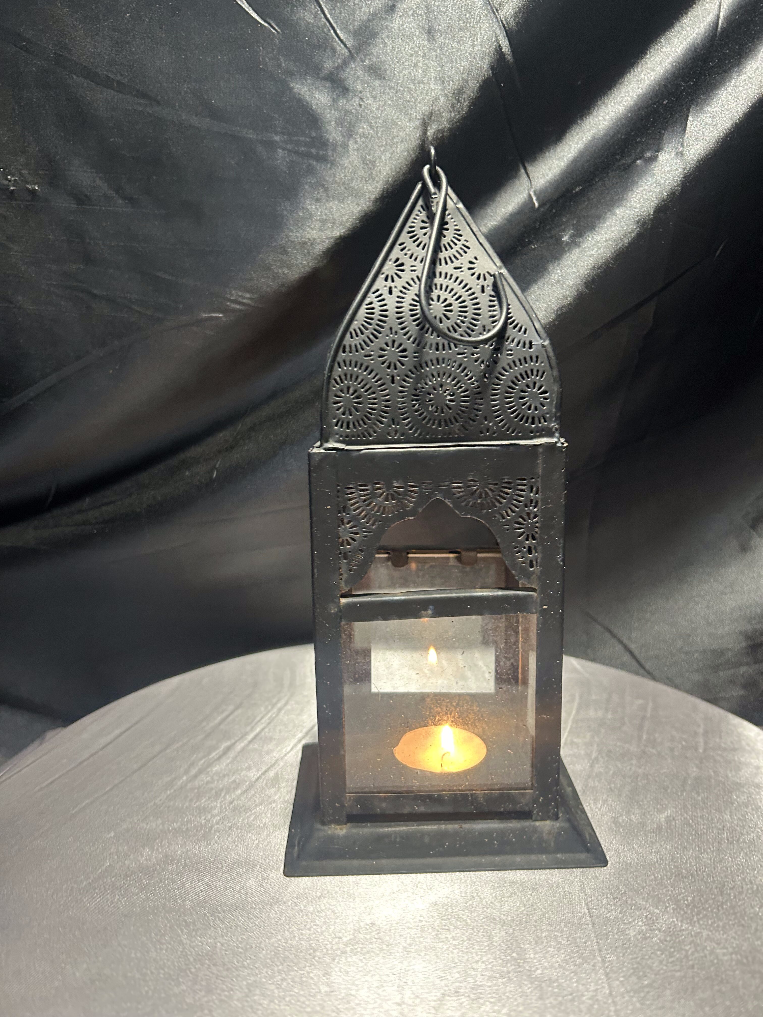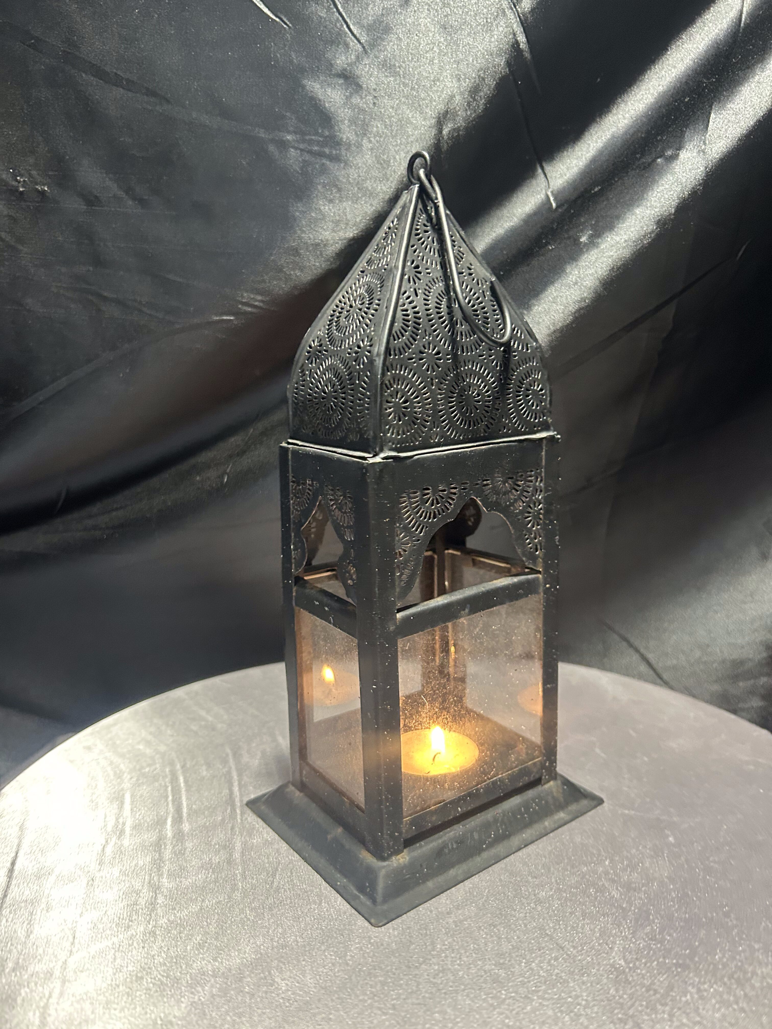 Elegancki metalowy lampion utrzymany w orientalnym stylu, wykonany z czarnego metalu z delikatnie ażurowanym daszkiem. Starannie perforowane wzory przypominające rozety wprowadzają niepowtarzalny klimat rodem z Maroka lub Indii. Lampion posiada szklane szybki, dzięki czemu płomień tealighta tworzy subtelne, nastrojowe światło, idealne do wnętrz inspirowanych stylem boho, etno czy rustykalnym. Wyposażony w praktyczny uchwyt umożliwiający zawieszenie — doskonale sprawdzi się zarówno w domu, na tarasie, jak i w ogrodzie.