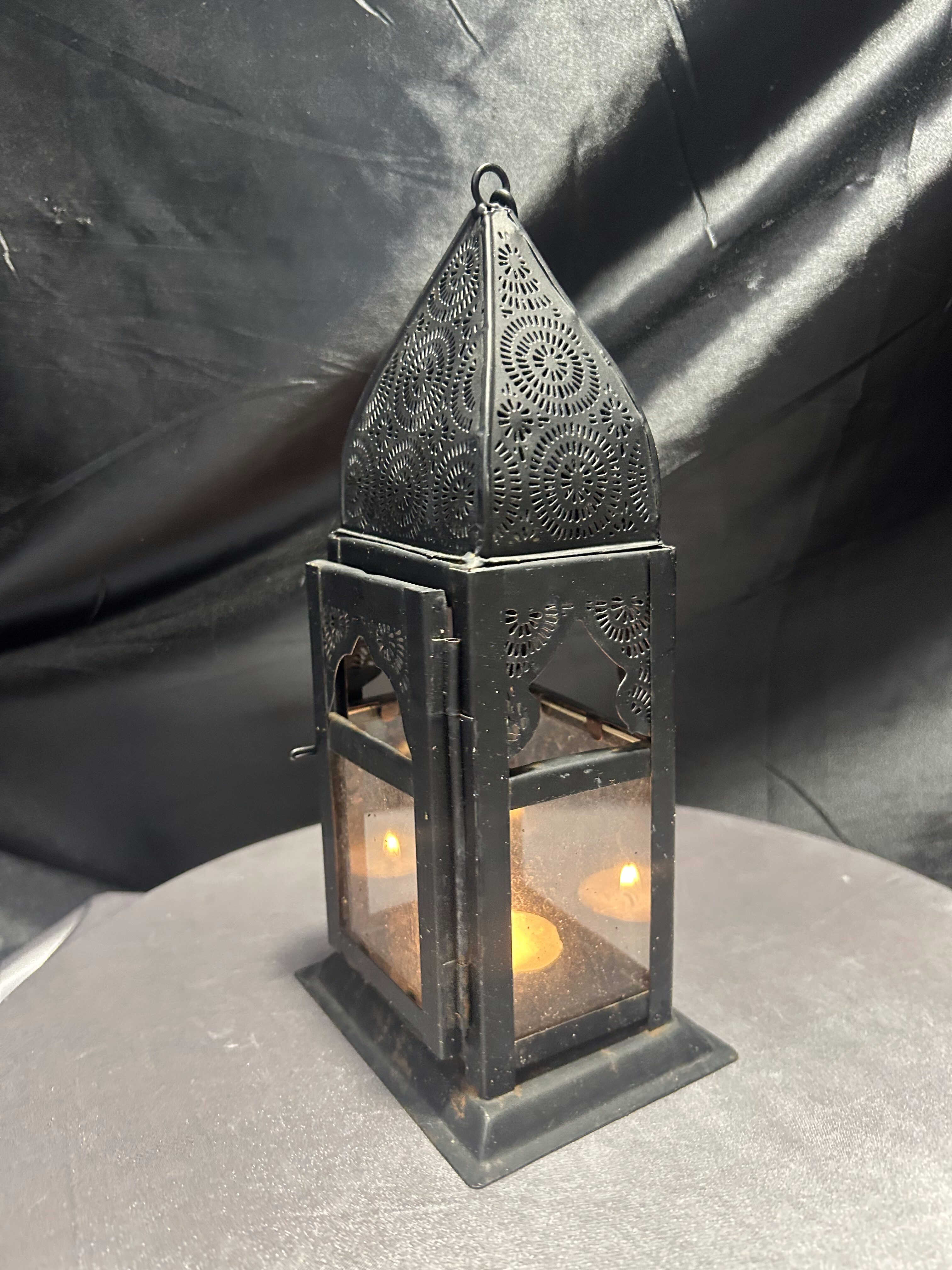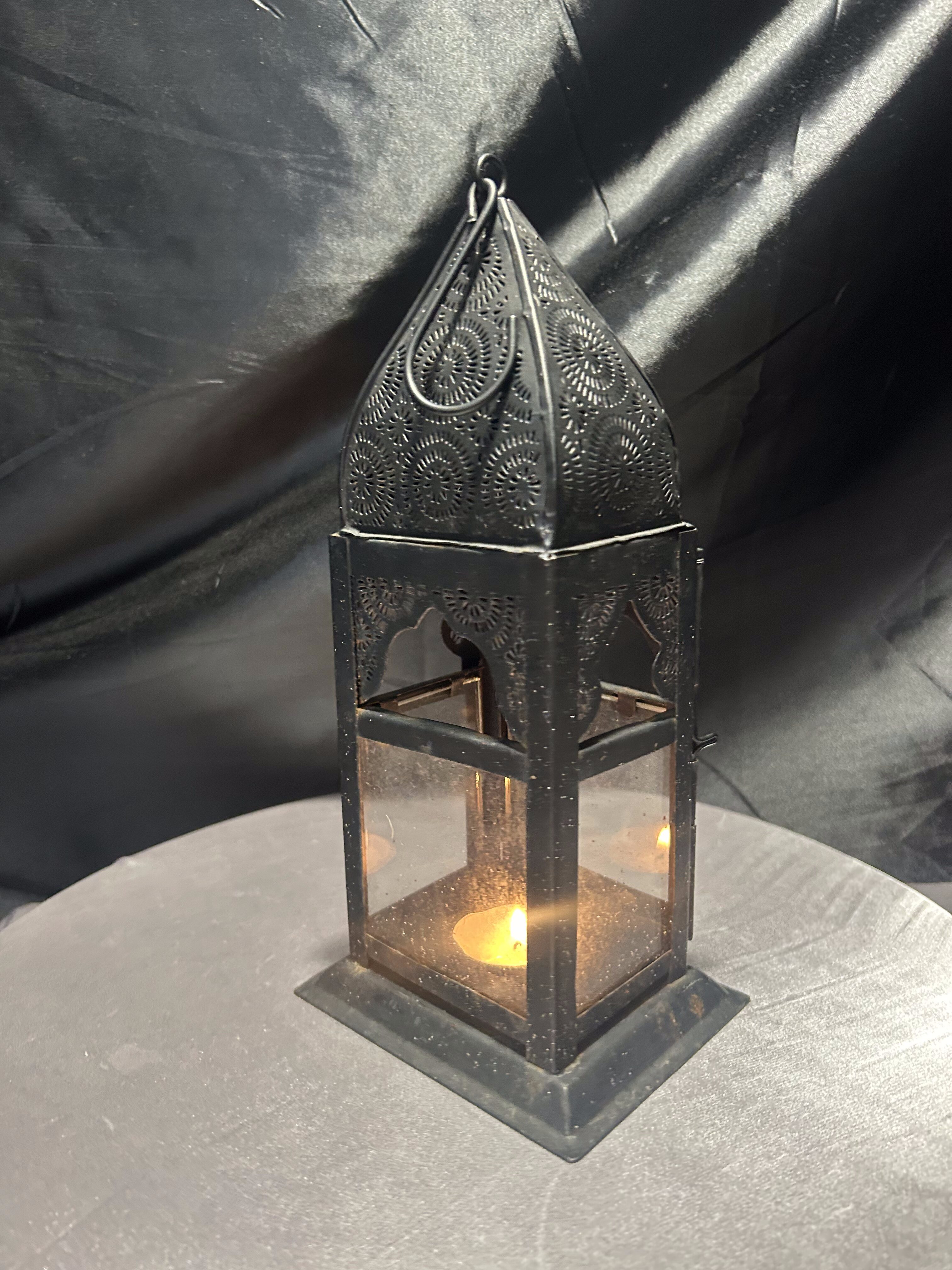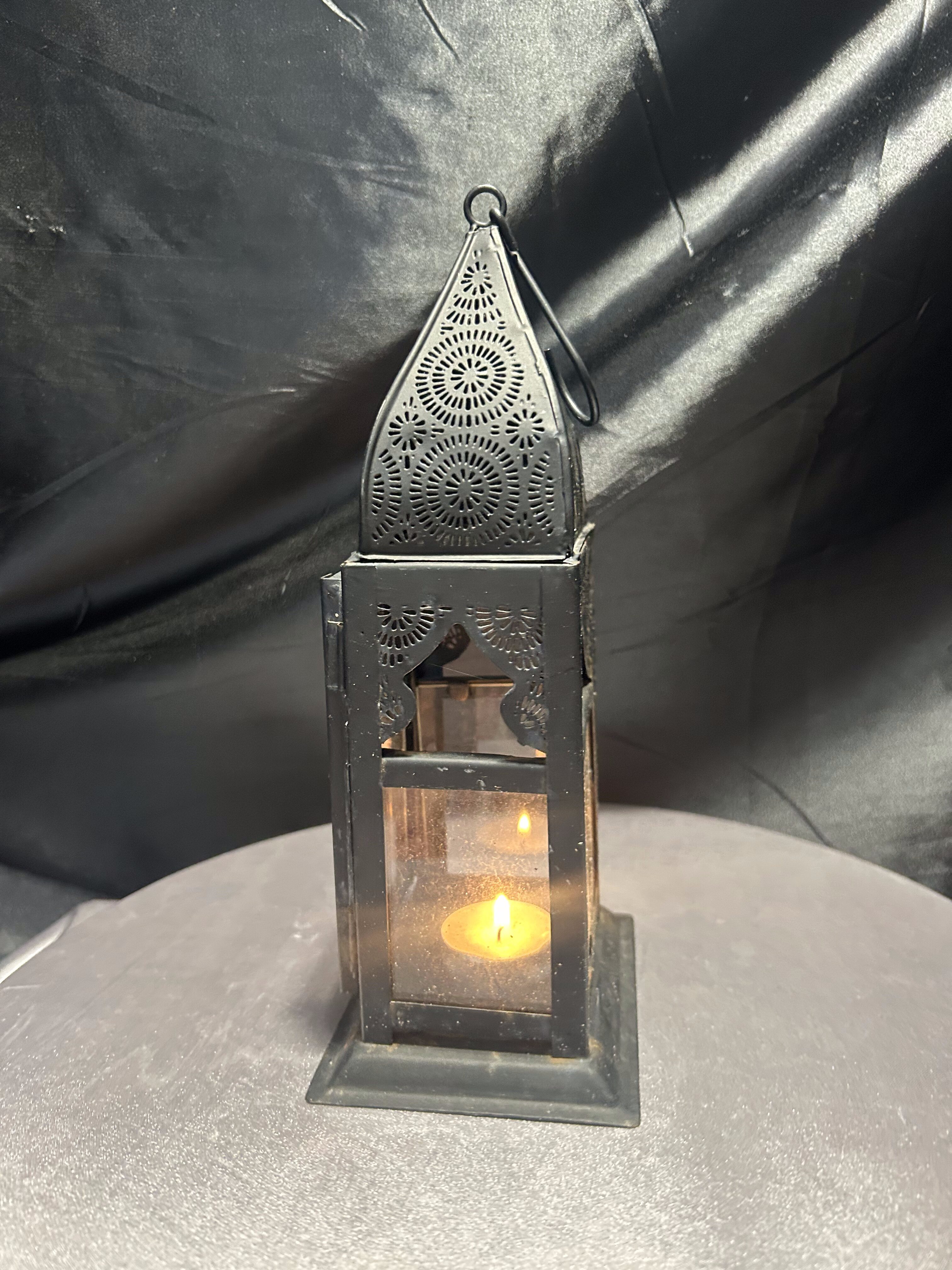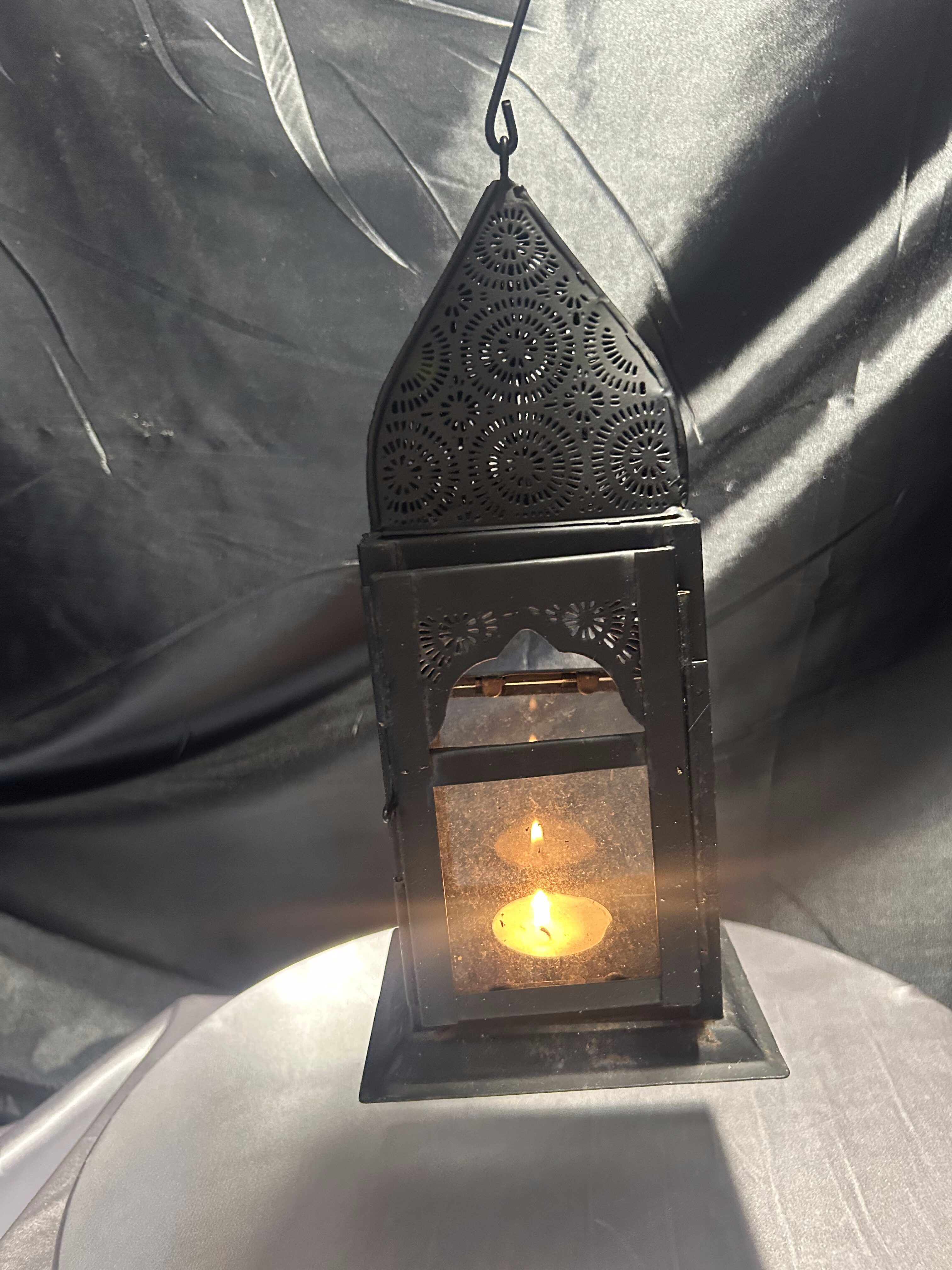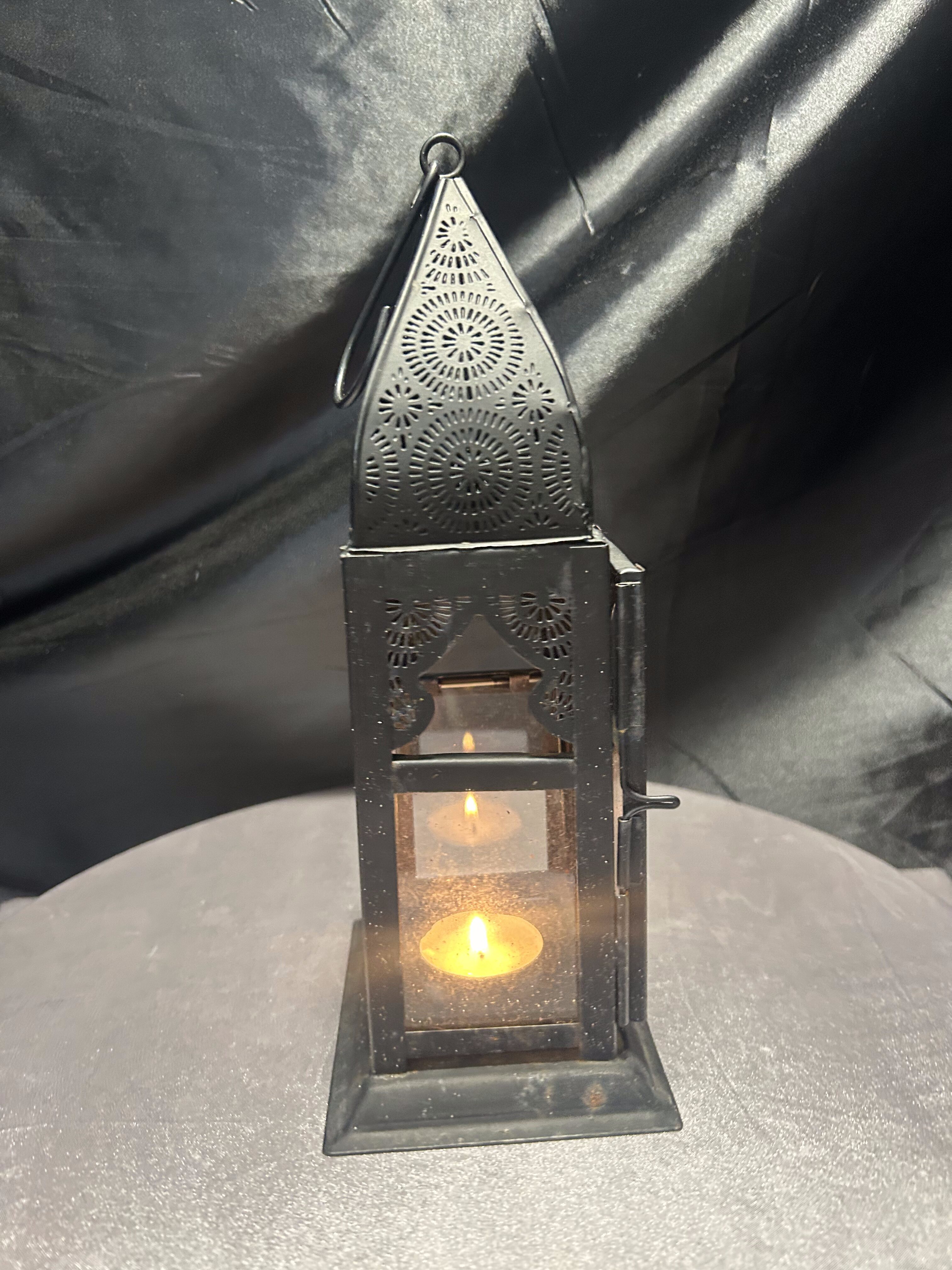Elegancki metalowy lampion utrzymany w orientalnym stylu, wykonany z czarnego metalu z delikatnie ażurowanym daszkiem. Starannie perforowane wzory przypominające rozety wprowadzają niepowtarzalny klimat rodem z Maroka lub Indii. Lampion posiada szklane szybki, dzięki czemu płomień tealighta tworzy subtelne, nastrojowe światło, idealne do wnętrz inspirowanych stylem boho, etno czy rustykalnym. Wyposażony w praktyczny uchwyt umożliwiający zawieszenie — doskonale sprawdzi się zarówno w domu, na tarasie, jak i w ogrodzie.