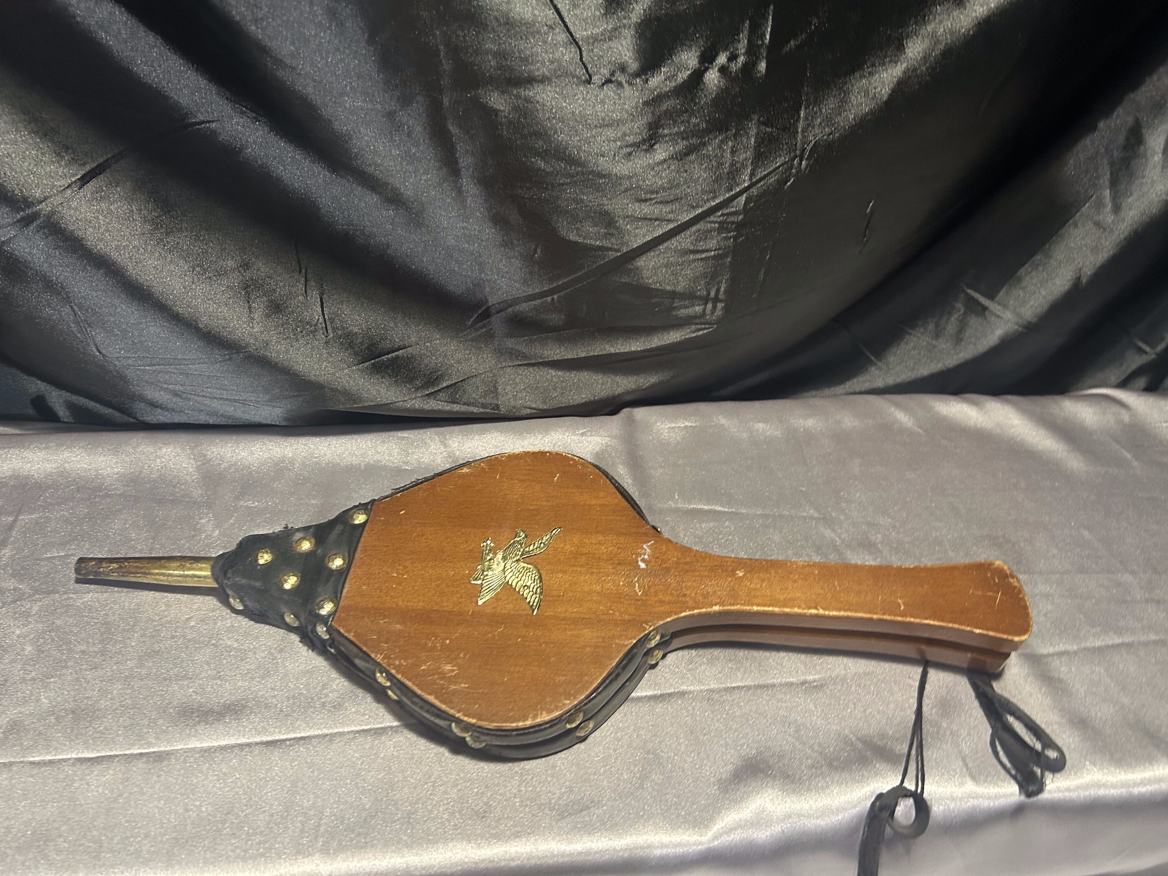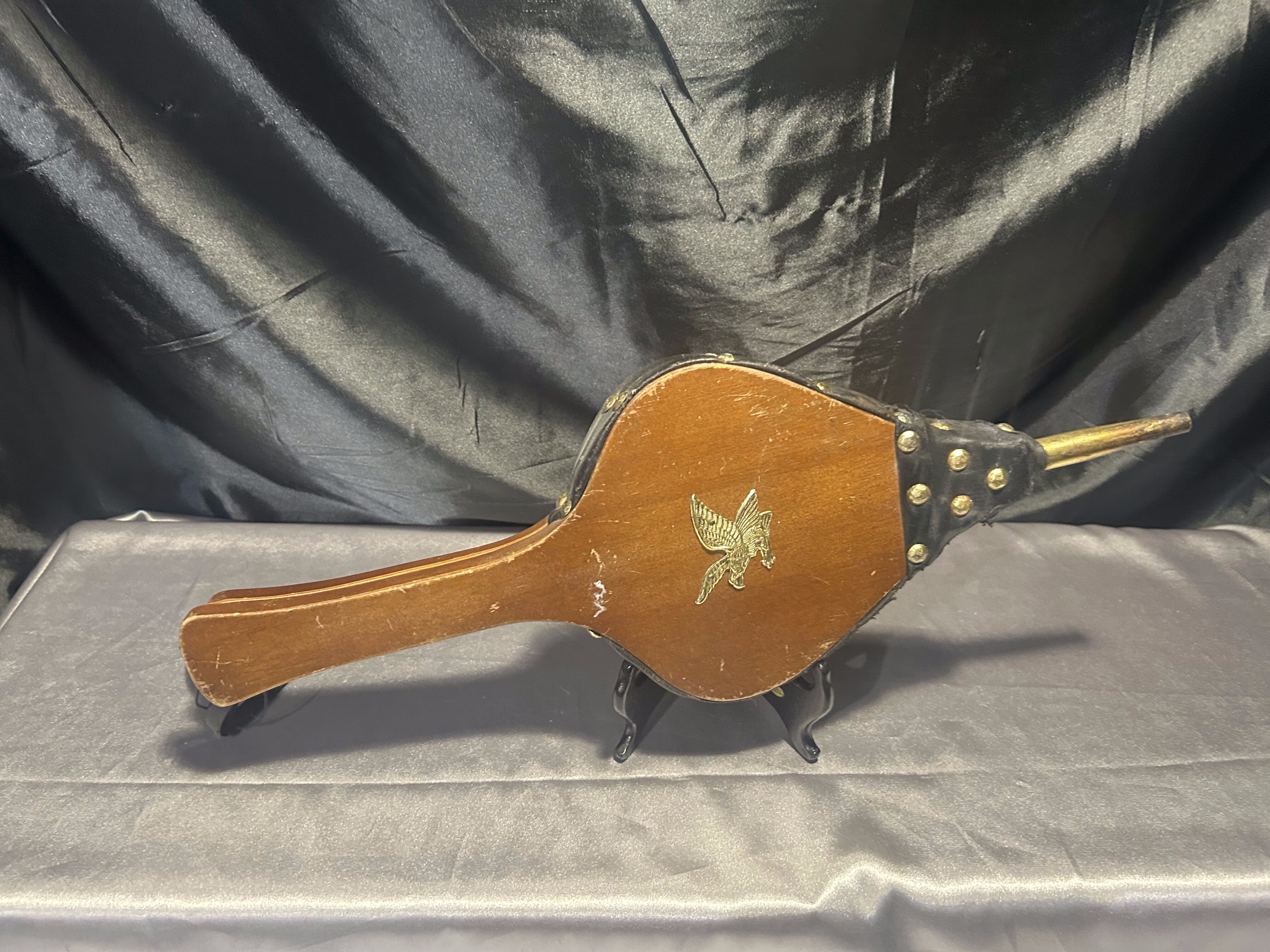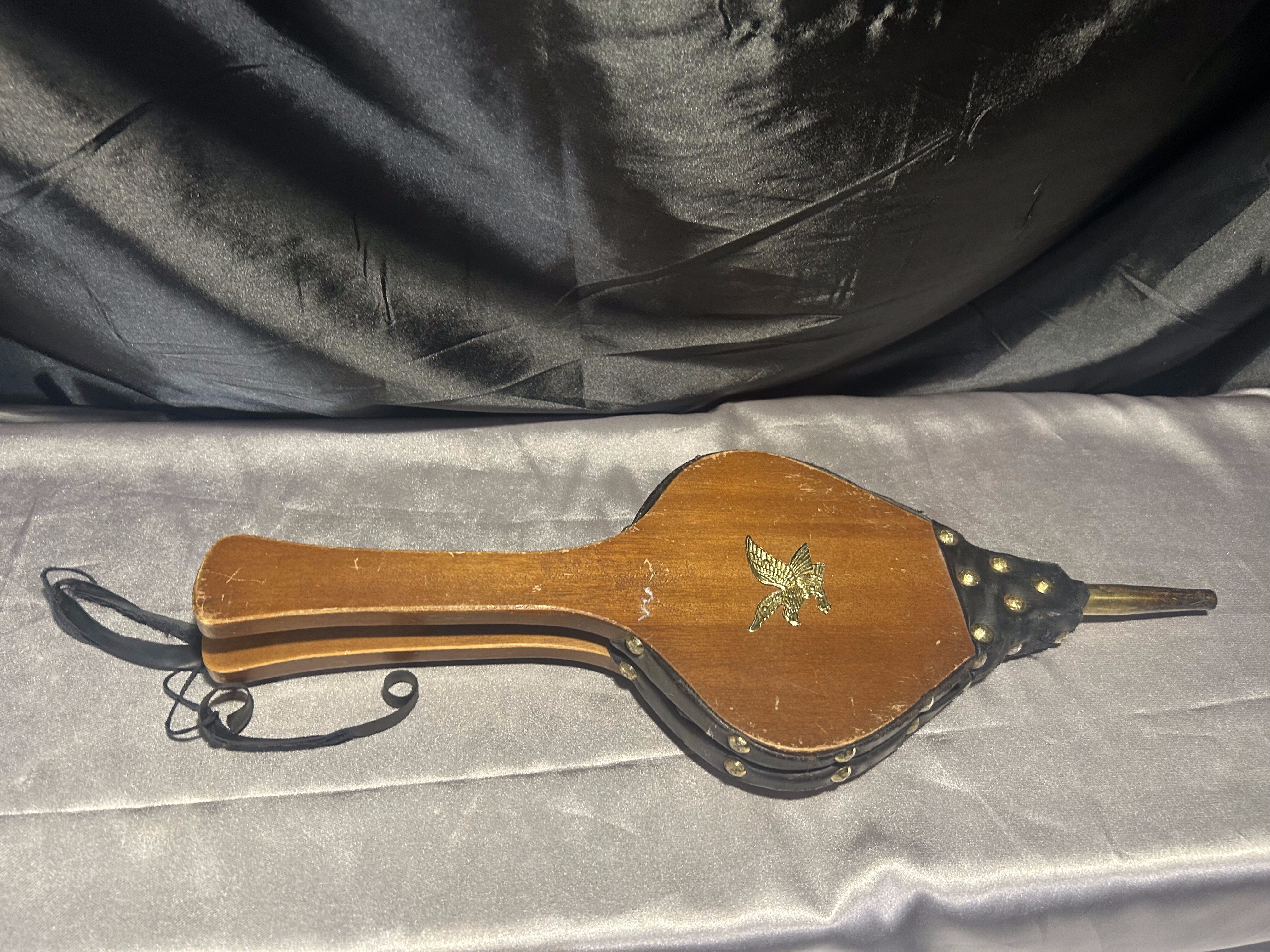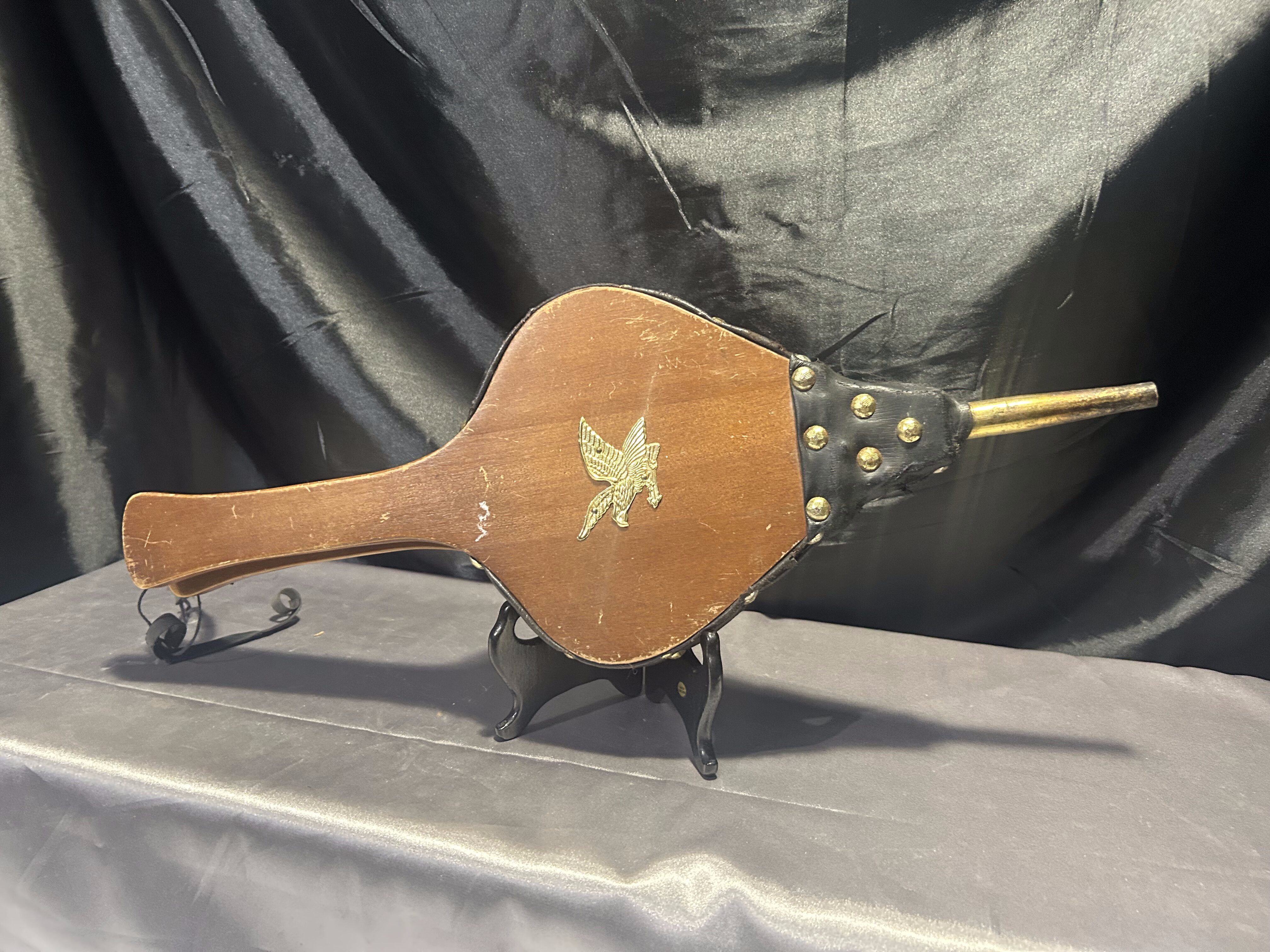 Stylowy miech do rozniecania ognia, wykonany z naturalnego drewna połączonego z czarną eco-skórą. Całość ozdobiona złotymi ćwiekami oraz metalową plakietką przedstawiającą orła w złotym kolorze – dekoracyjny detal, który nadaje całości wyjątkowego charakteru. Praktyczny i dekoracyjny przedmiot, idealny do kominka, pieca lub jako element wystroju wnętrz w stylu rustykalnym czy myśliwskim.