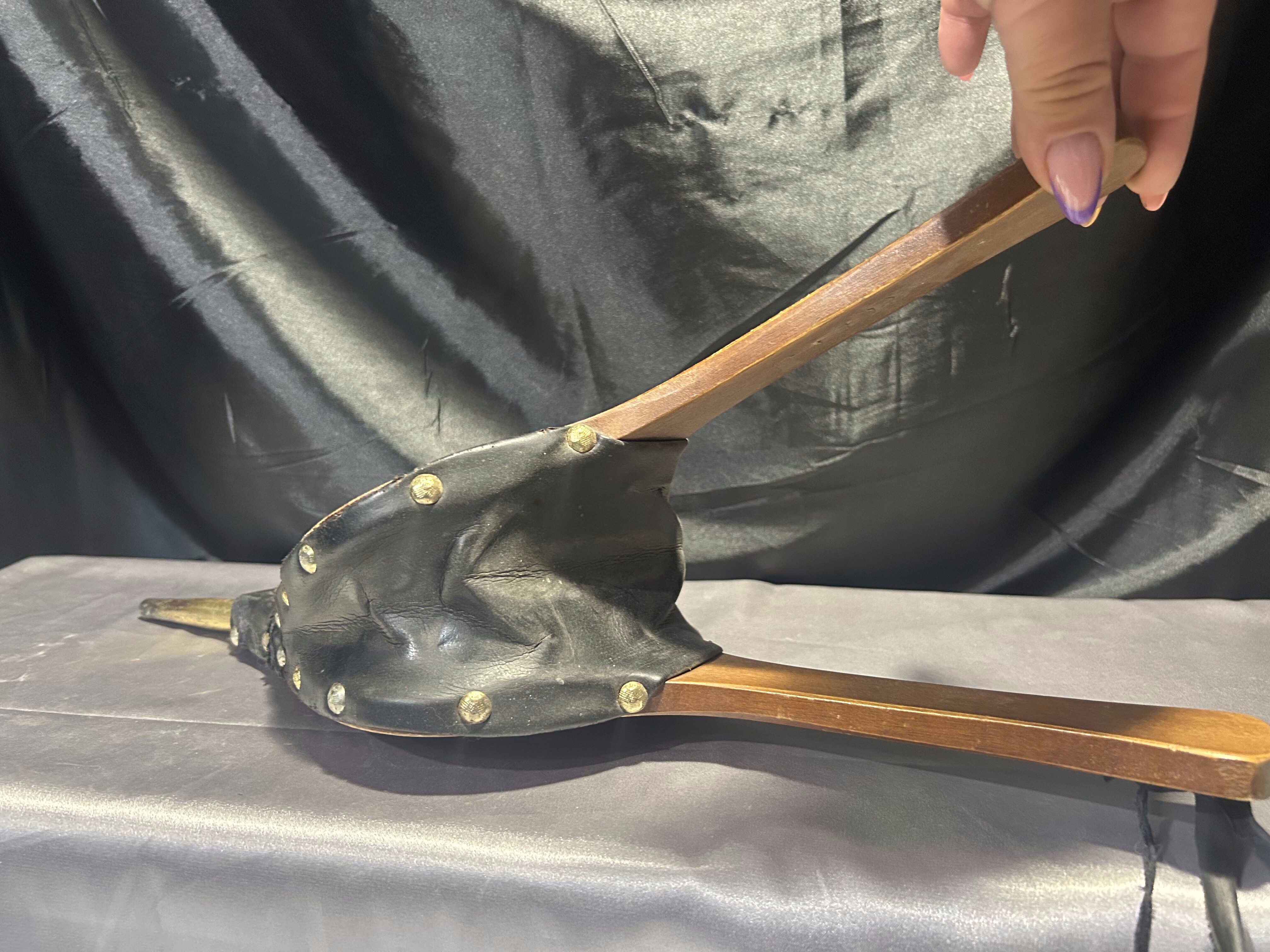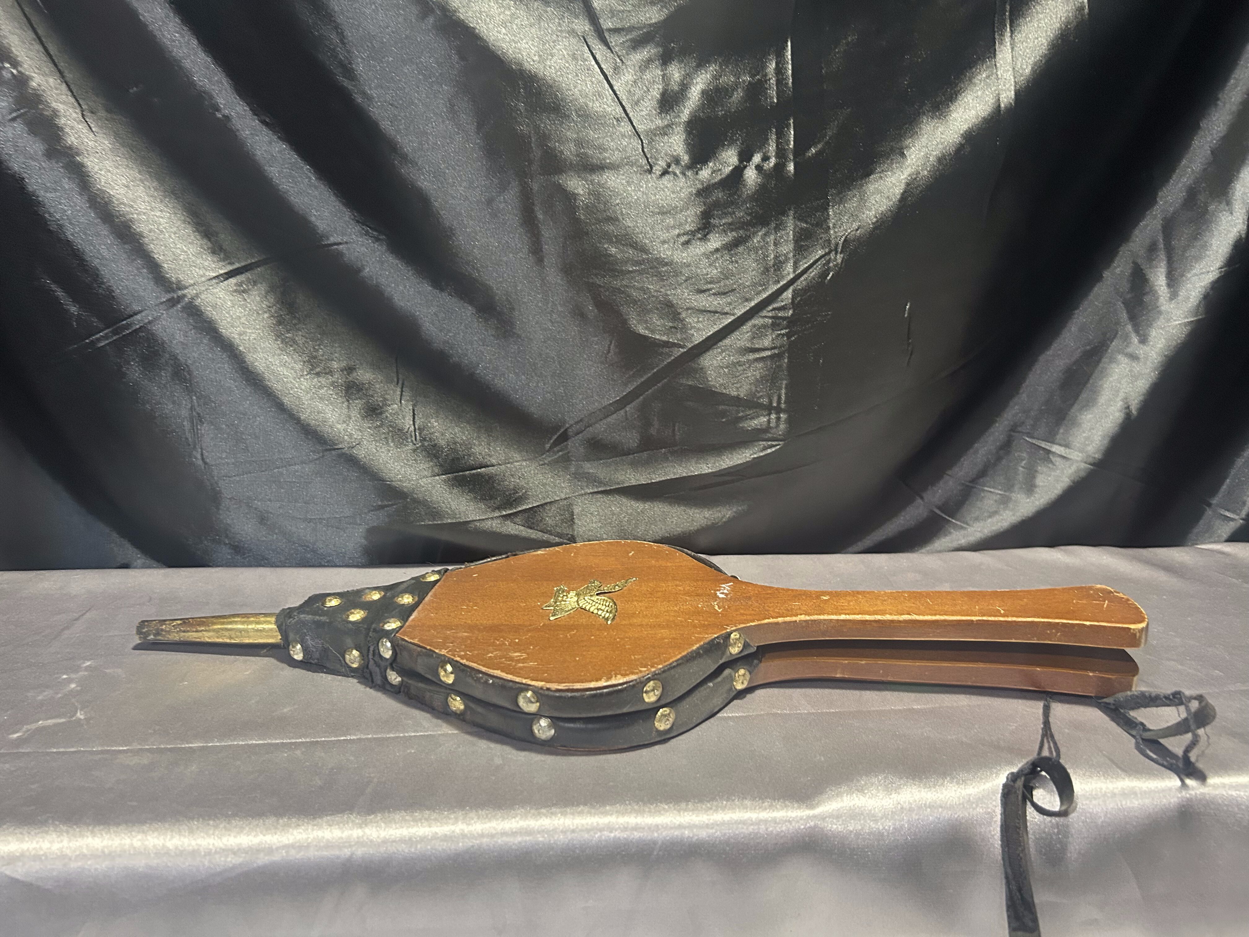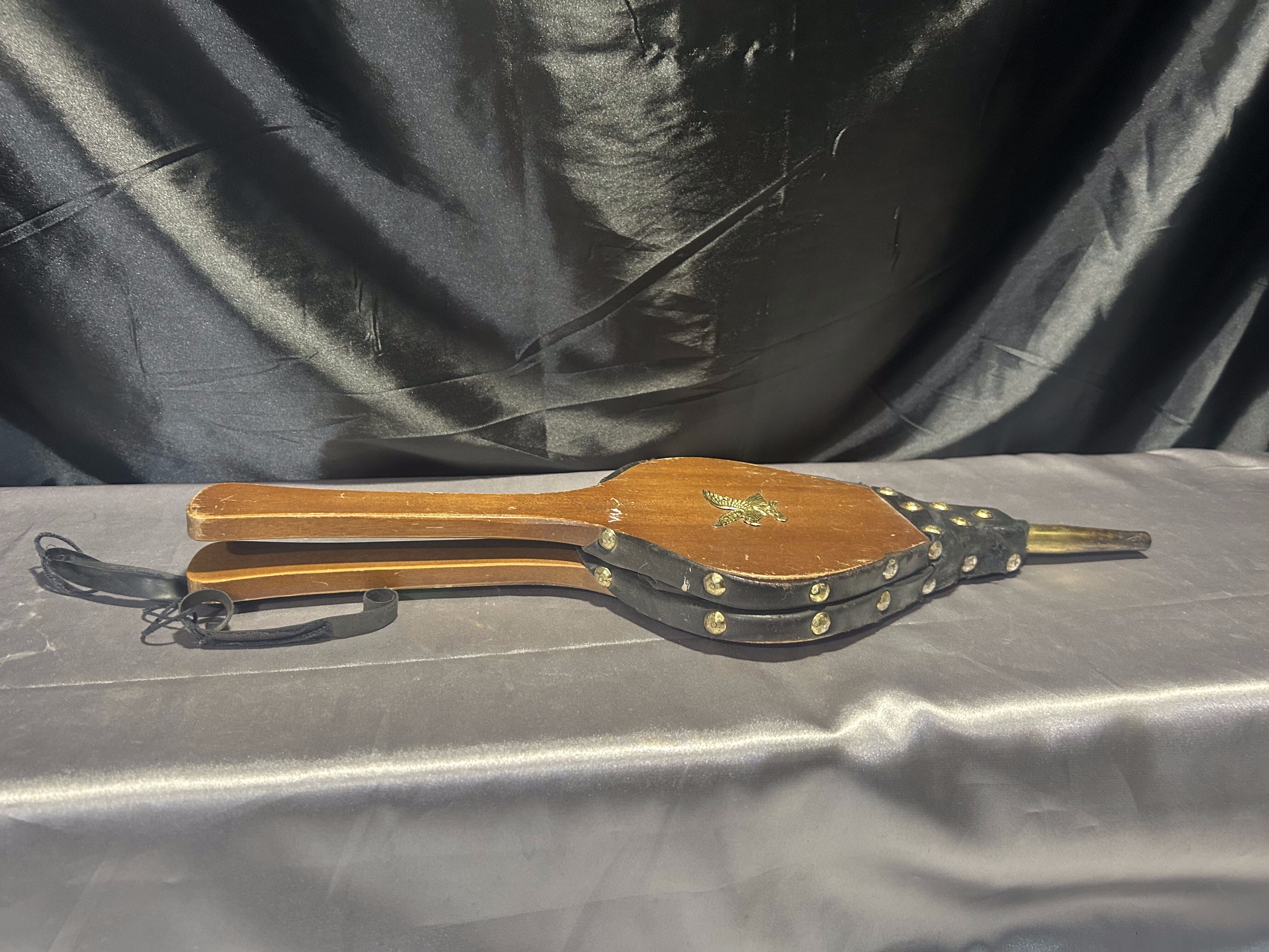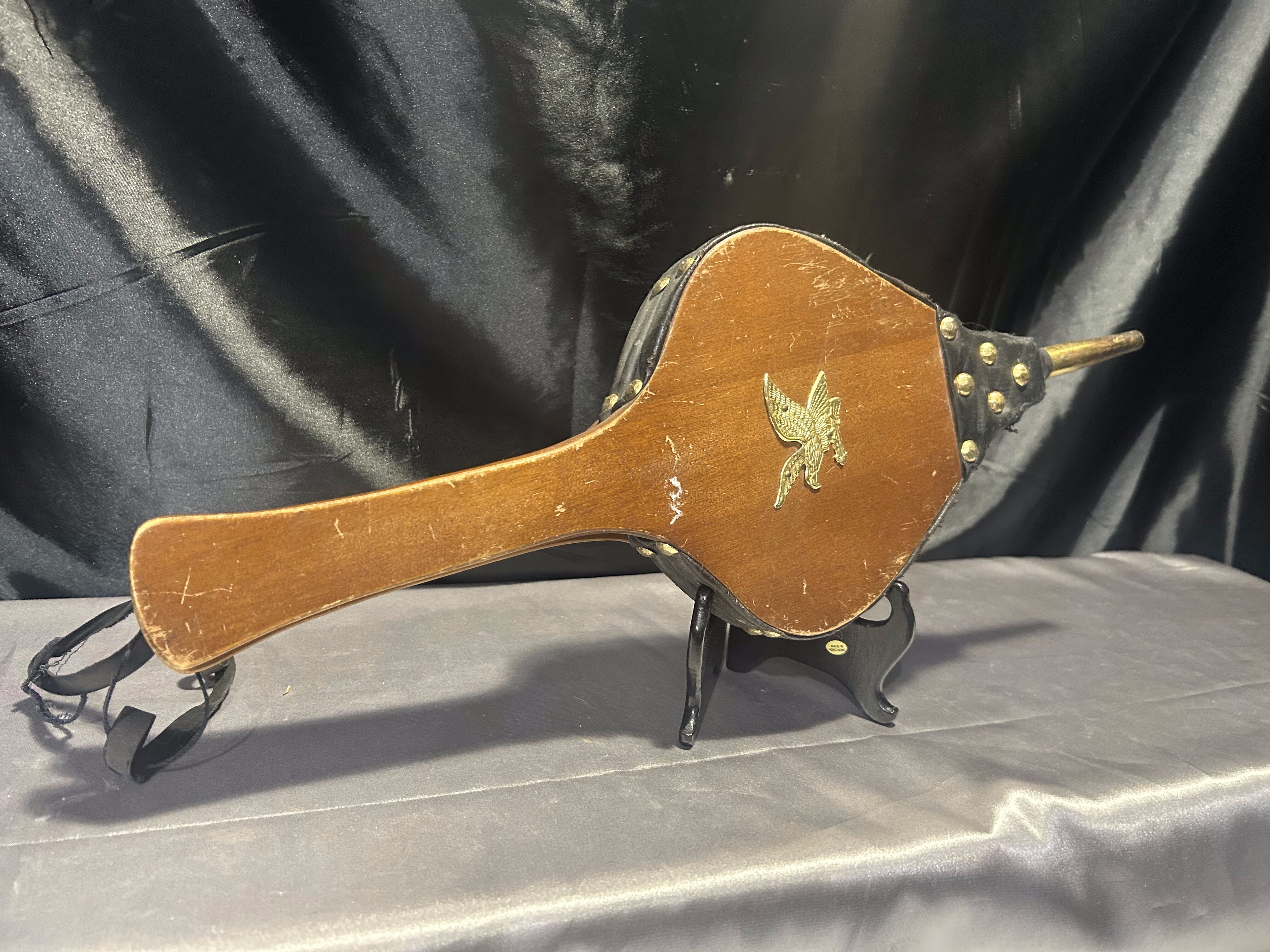 Stylowy miech do rozniecania ognia, wykonany z naturalnego drewna połączonego z czarną eco-skórą. Całość ozdobiona złotymi ćwiekami oraz metalową plakietką przedstawiającą orła w złotym kolorze – dekoracyjny detal, który nadaje całości wyjątkowego charakteru. Praktyczny i dekoracyjny przedmiot, idealny do kominka, pieca lub jako element wystroju wnętrz w stylu rustykalnym czy myśliwskim.