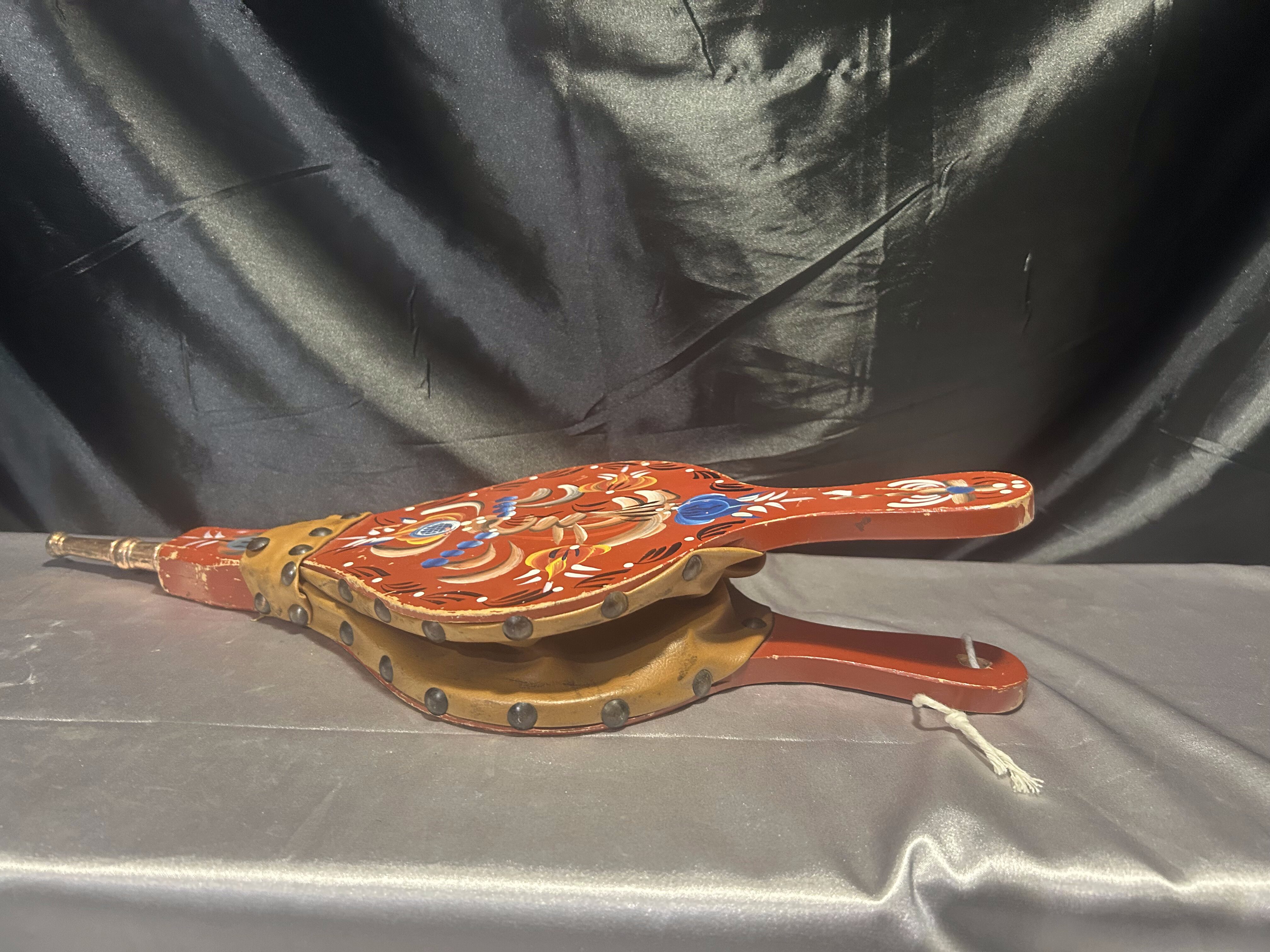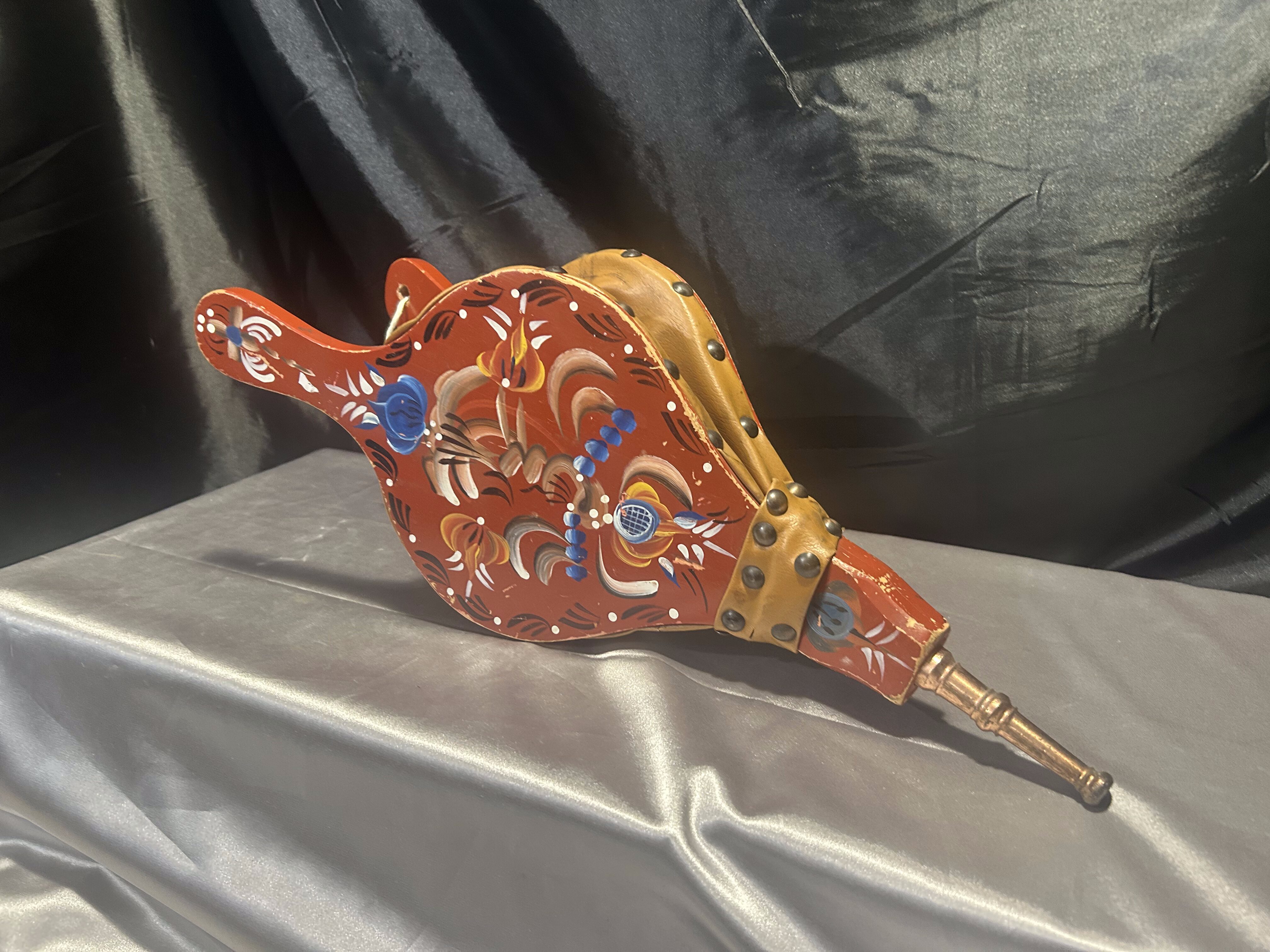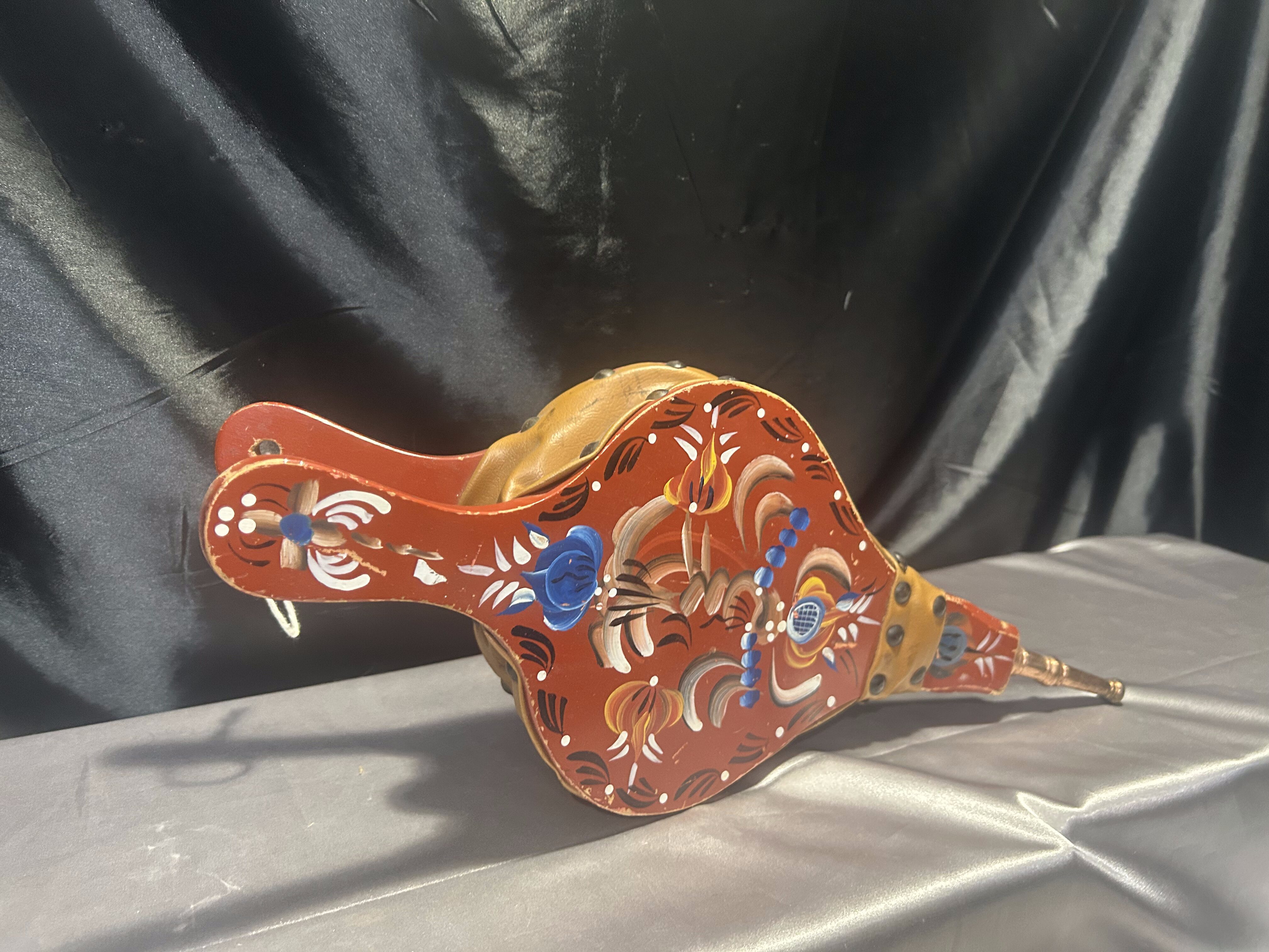 Dekoracyjny miech do rozniecania ognia, wykonany z drewna i skóry, ozdobiony malowanym, regionalnym wzorem w bordowo-kolorowej tonacji. Wyrazista ornamentyka, nawiązująca do ludowego stylu, sprawia, że miech ten może pełnić nie tylko funkcję praktyczną, ale również dekoracyjną – idealny do wnętrz rustykalnych, folkowych czy góralskich.