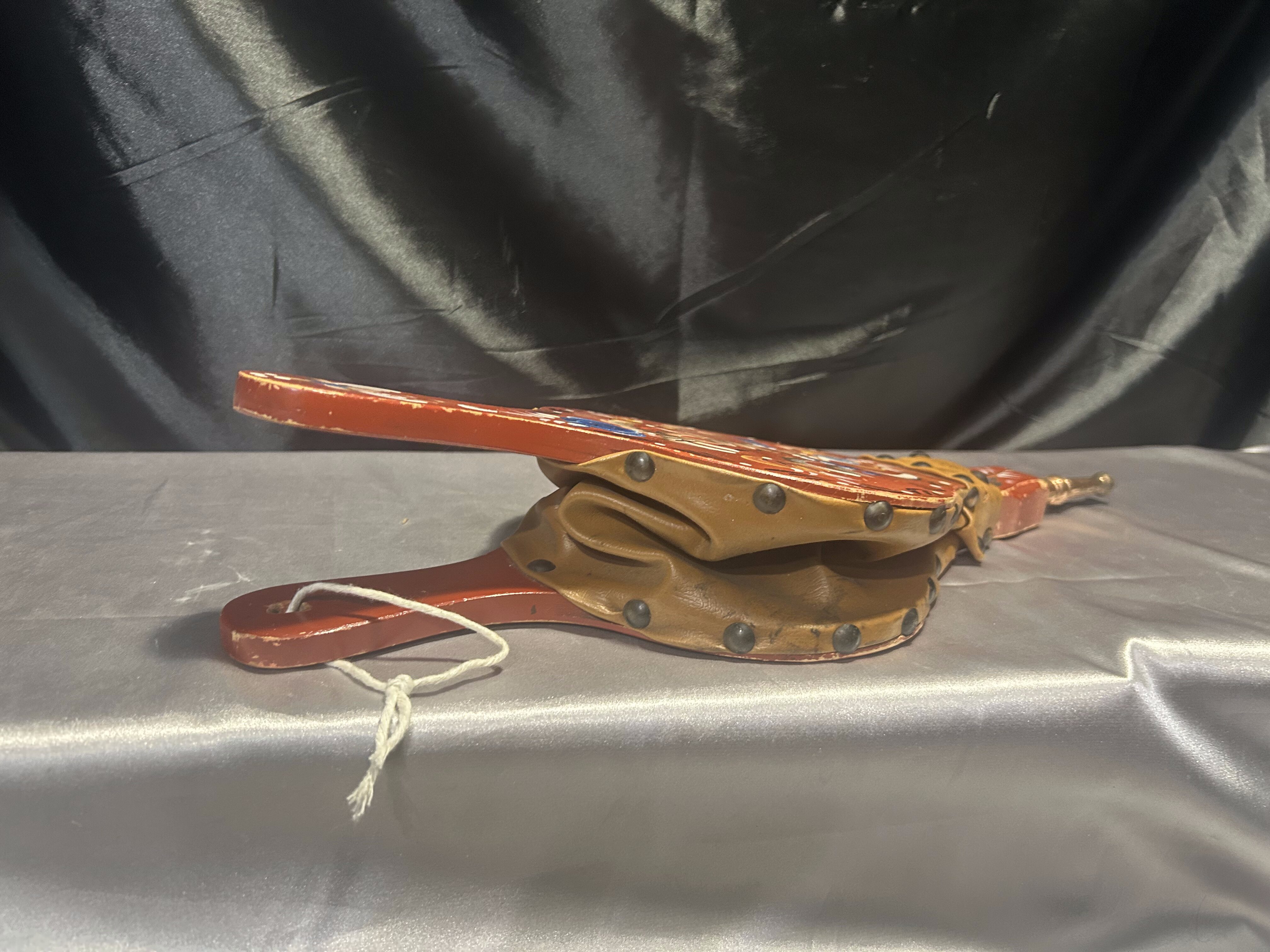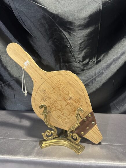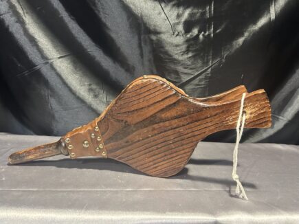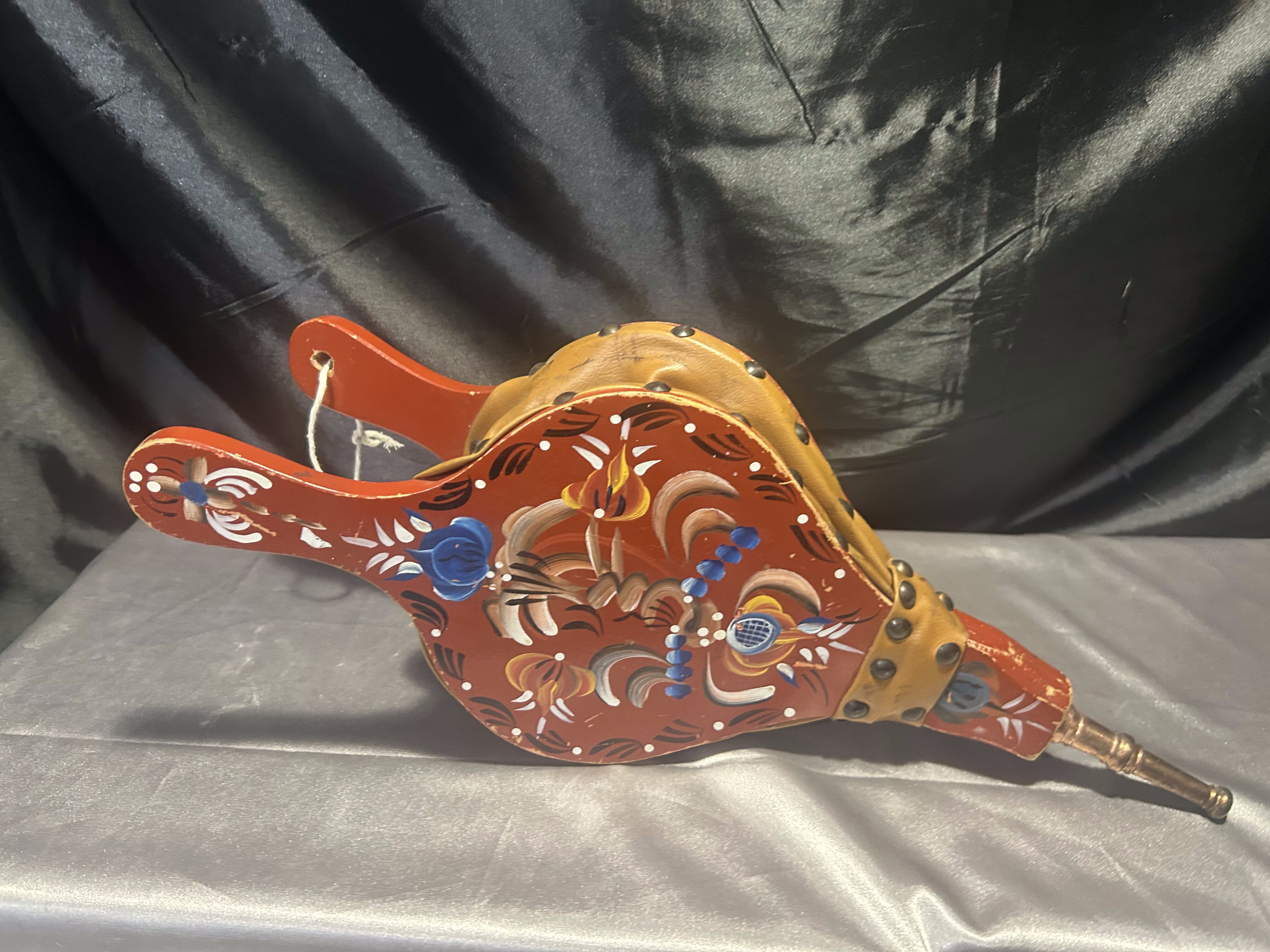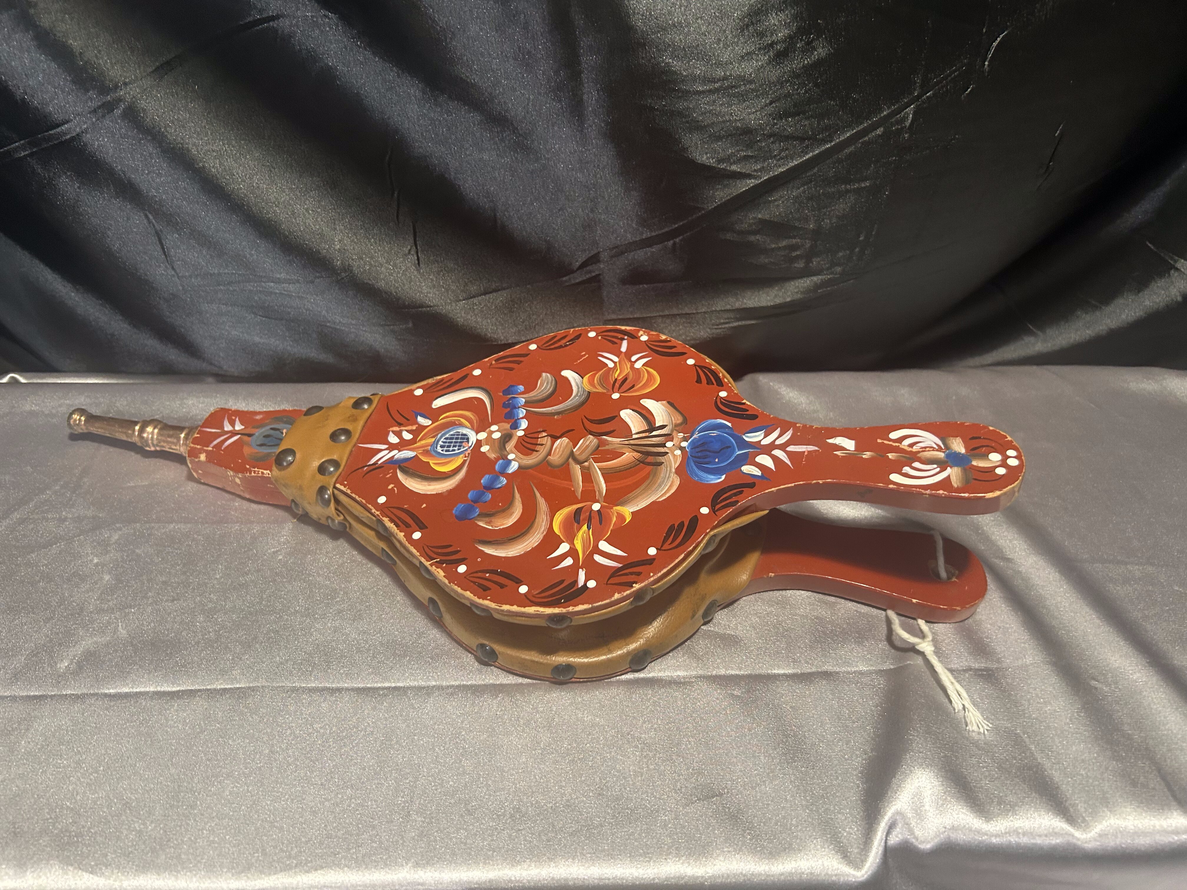 Dekoracyjny miech do rozniecania ognia, wykonany z drewna i skóry, ozdobiony malowanym, regionalnym wzorem w bordowo-kolorowej tonacji. Wyrazista ornamentyka, nawiązująca do ludowego stylu, sprawia, że miech ten może pełnić nie tylko funkcję praktyczną, ale również dekoracyjną – idealny do wnętrz rustykalnych, folkowych czy góralskich.