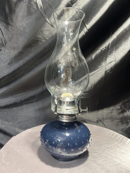 Lampa naftowa vintage – granatowa kula z knotem – sprawna