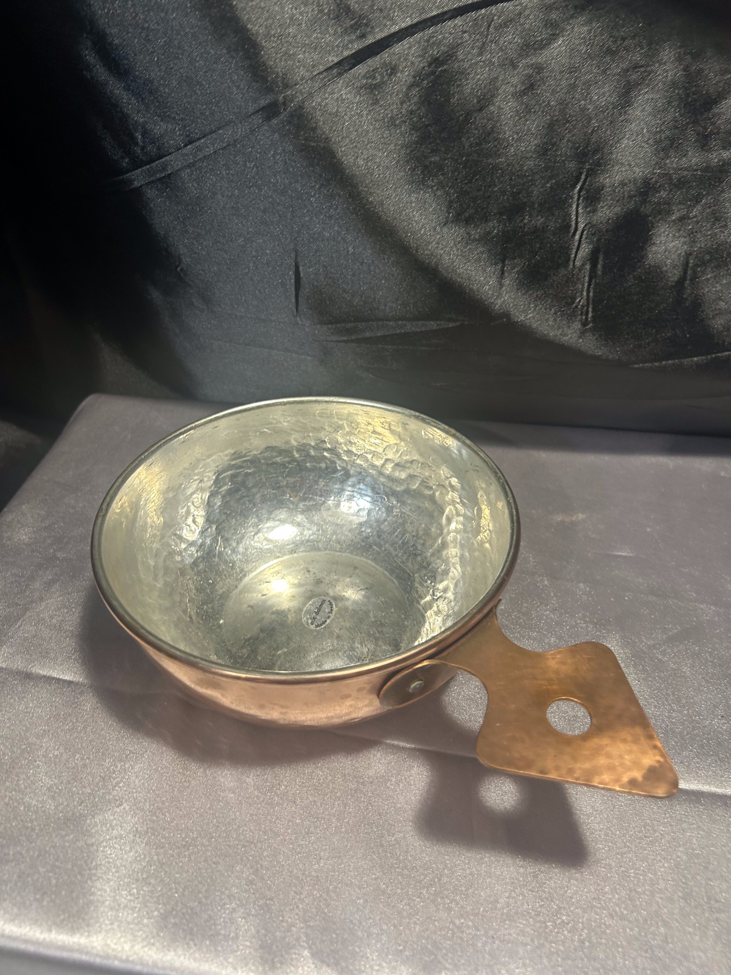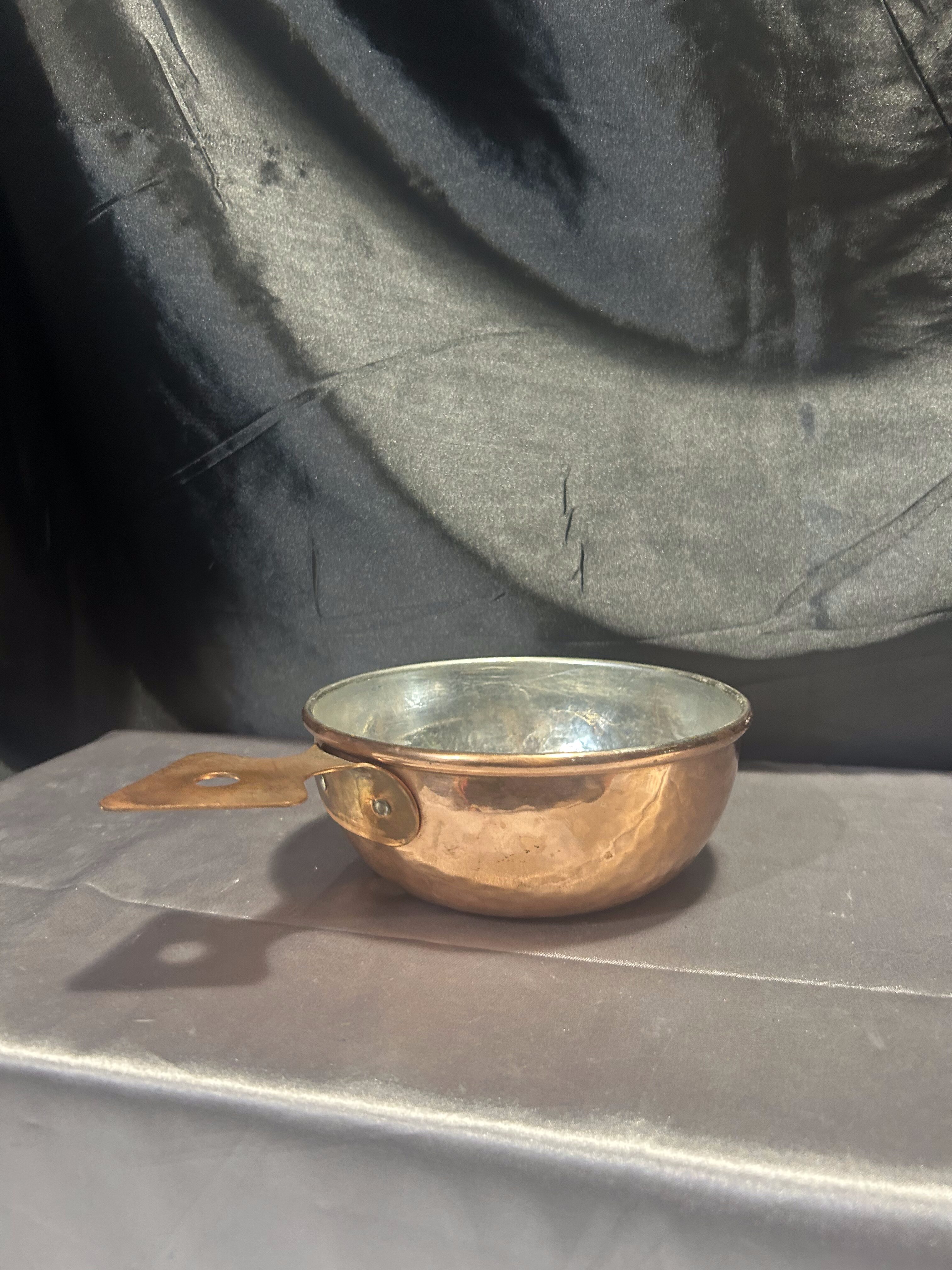 Na sprzedaż wyjątkowa miedziana chochla przypominająca niewielki rondel, wyposażona w kutą rączkę w kształcie strzałki. To oryginalne rozwiązanie nadaje całości niepowtarzalnego charakteru i przyciąga uwagę swoim kunsztem. Idealna zarówno jako funkcjonalne naczynie, jak i efektowny element dekoracyjny w kuchni vintage lub rustykalnej.